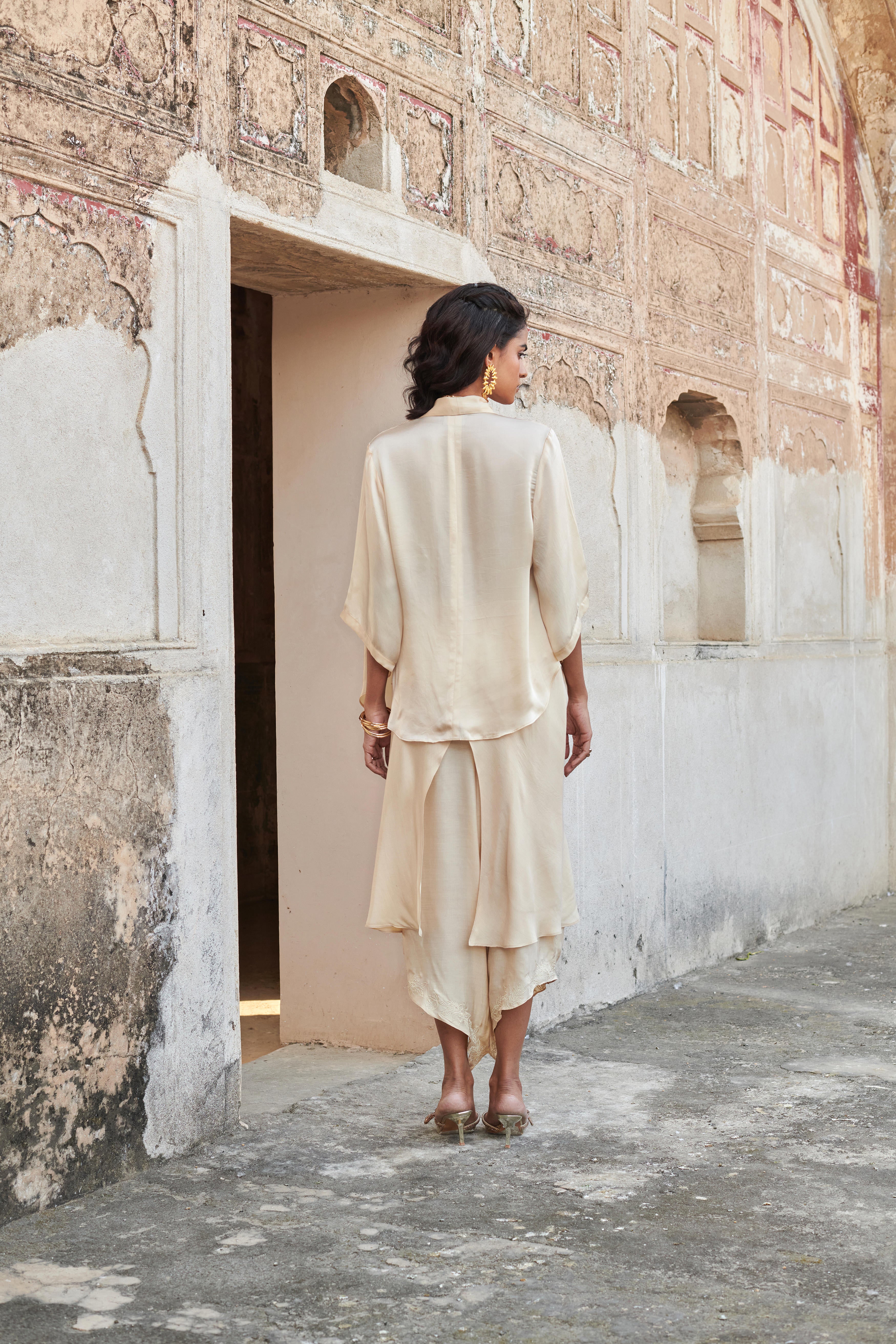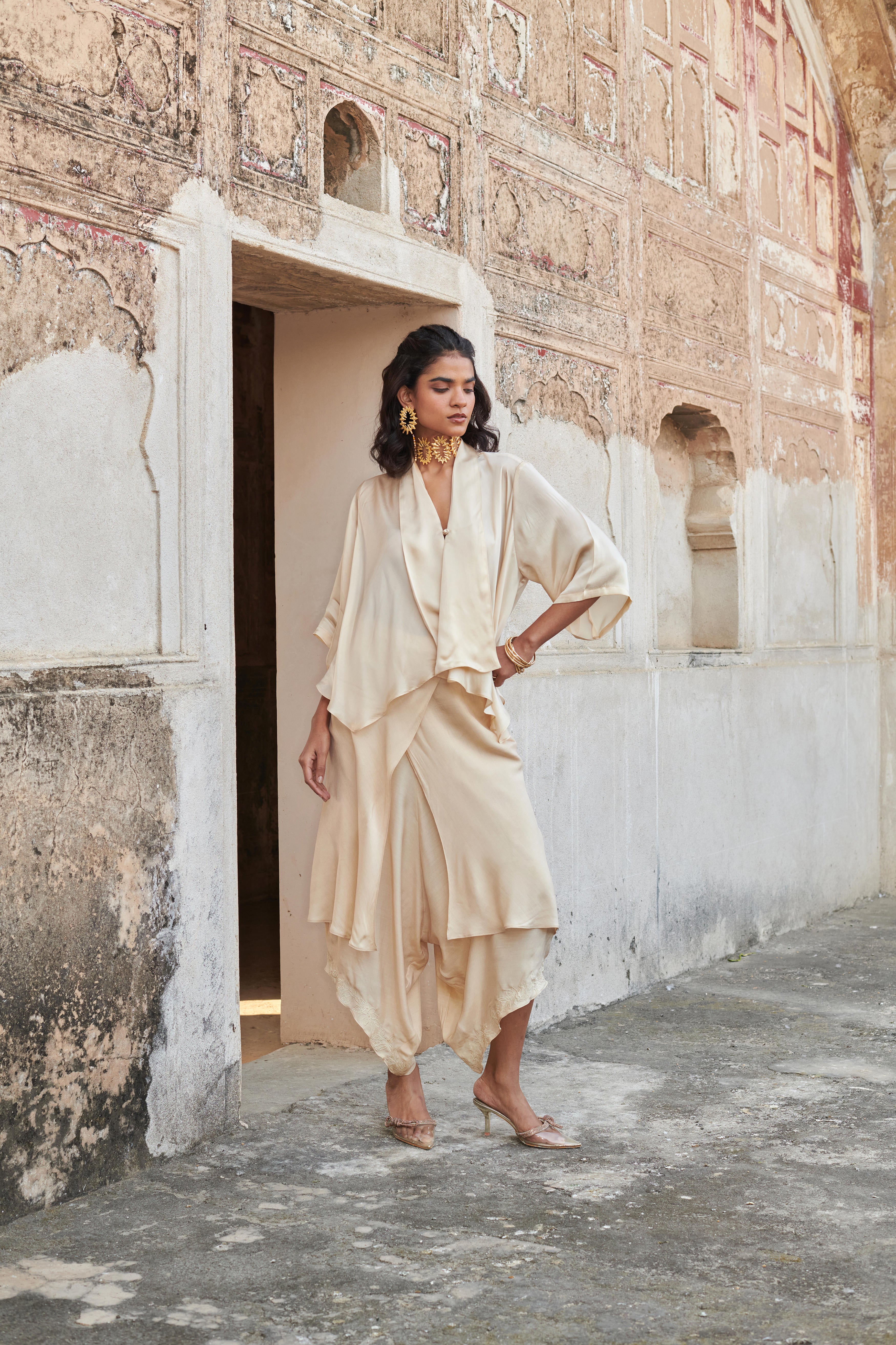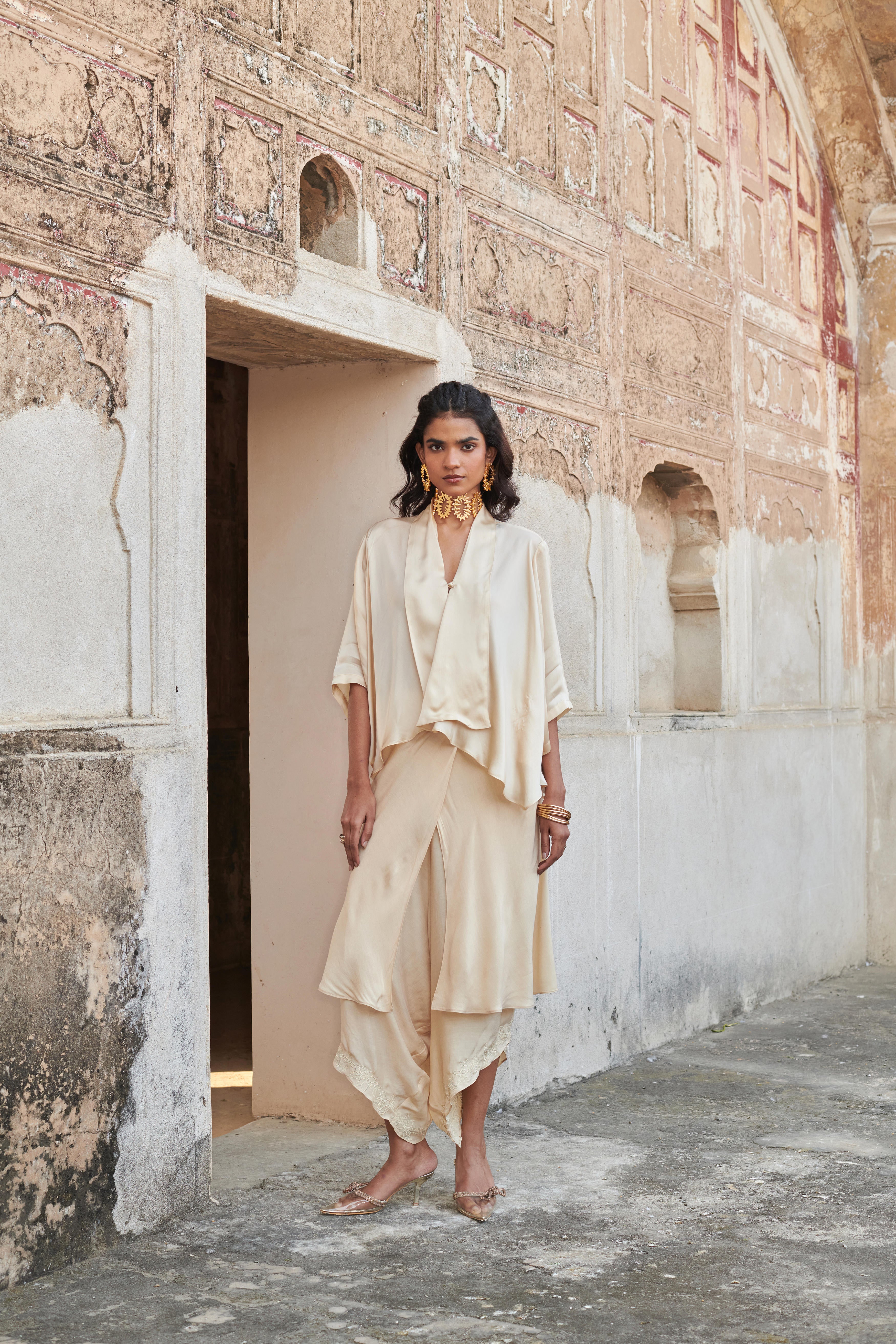 The co-ord set features a top with an overlapped pannel in the front and dropped shoulder sleeves and an asymmetric cut. Top length: 26" Paired with asymmetric flap pants highlighted with thread work at the bottom. Pant length: 40"