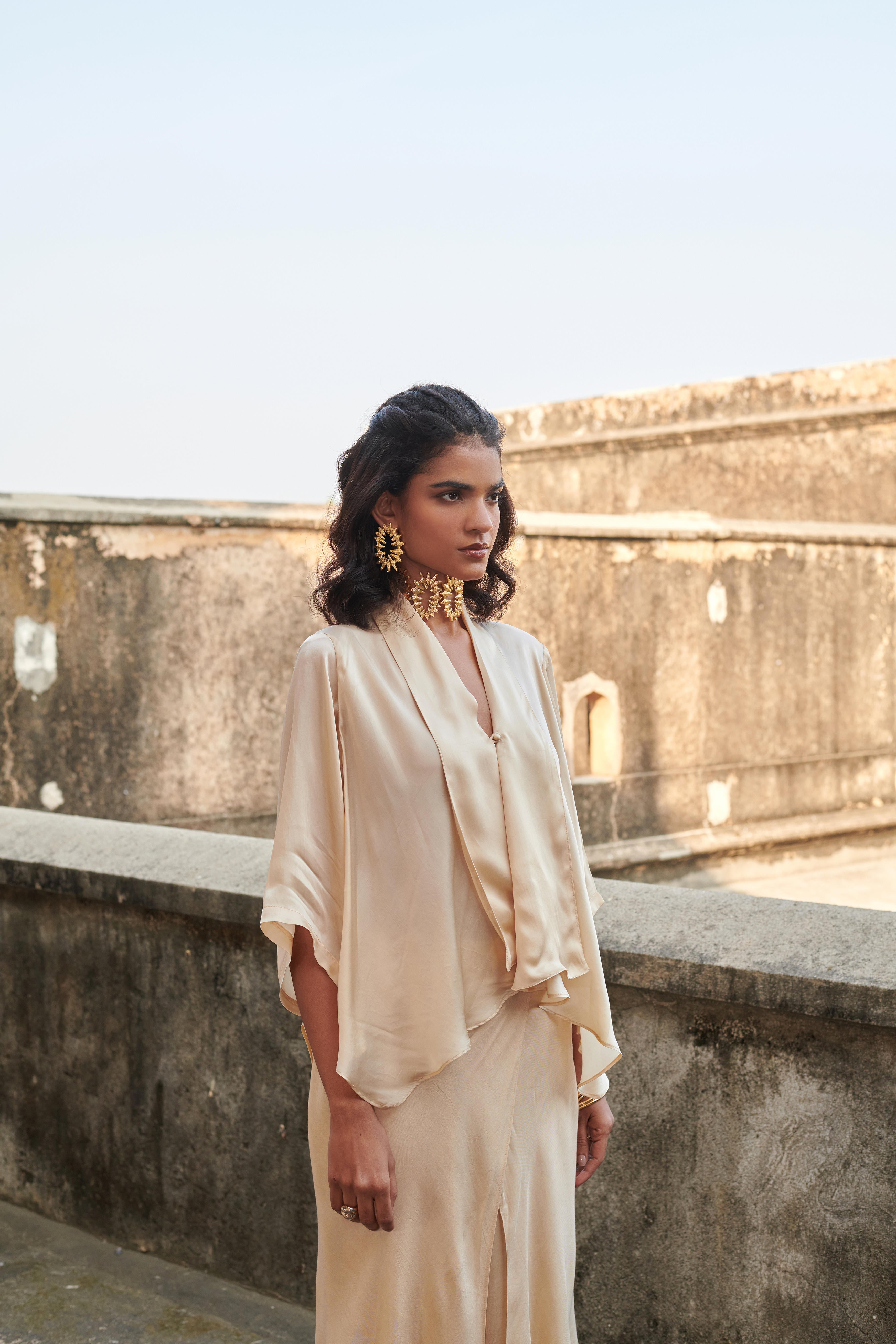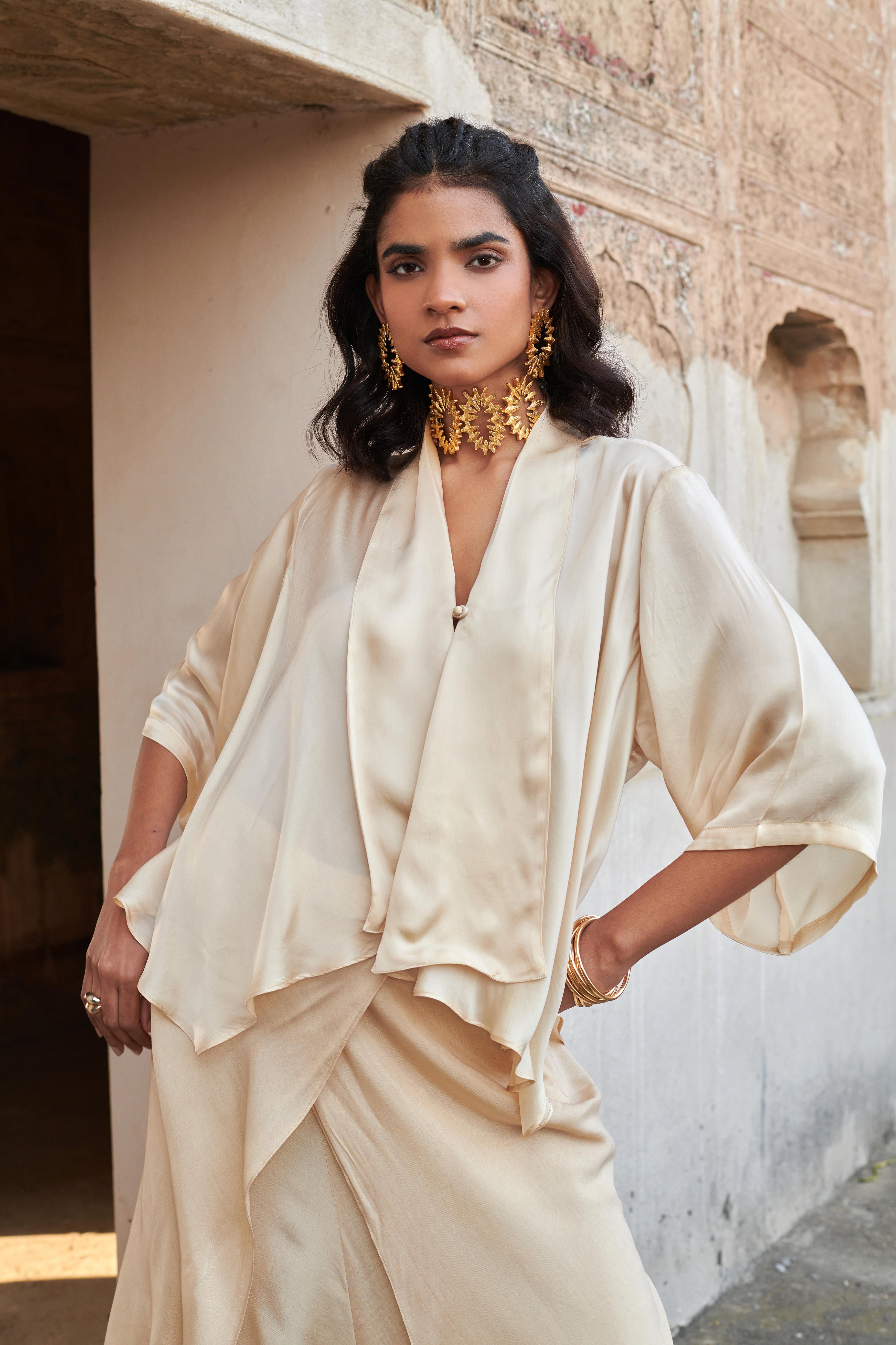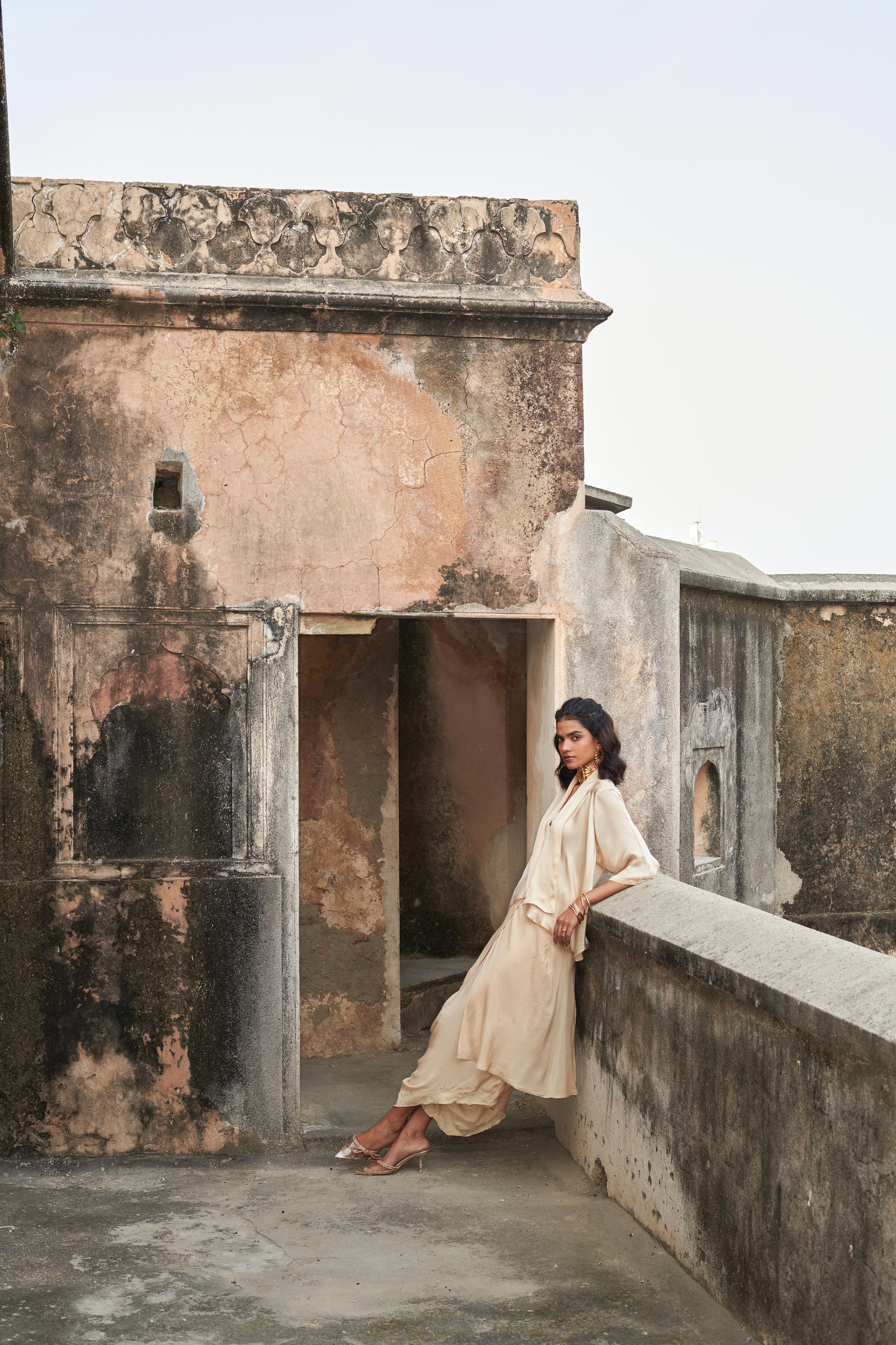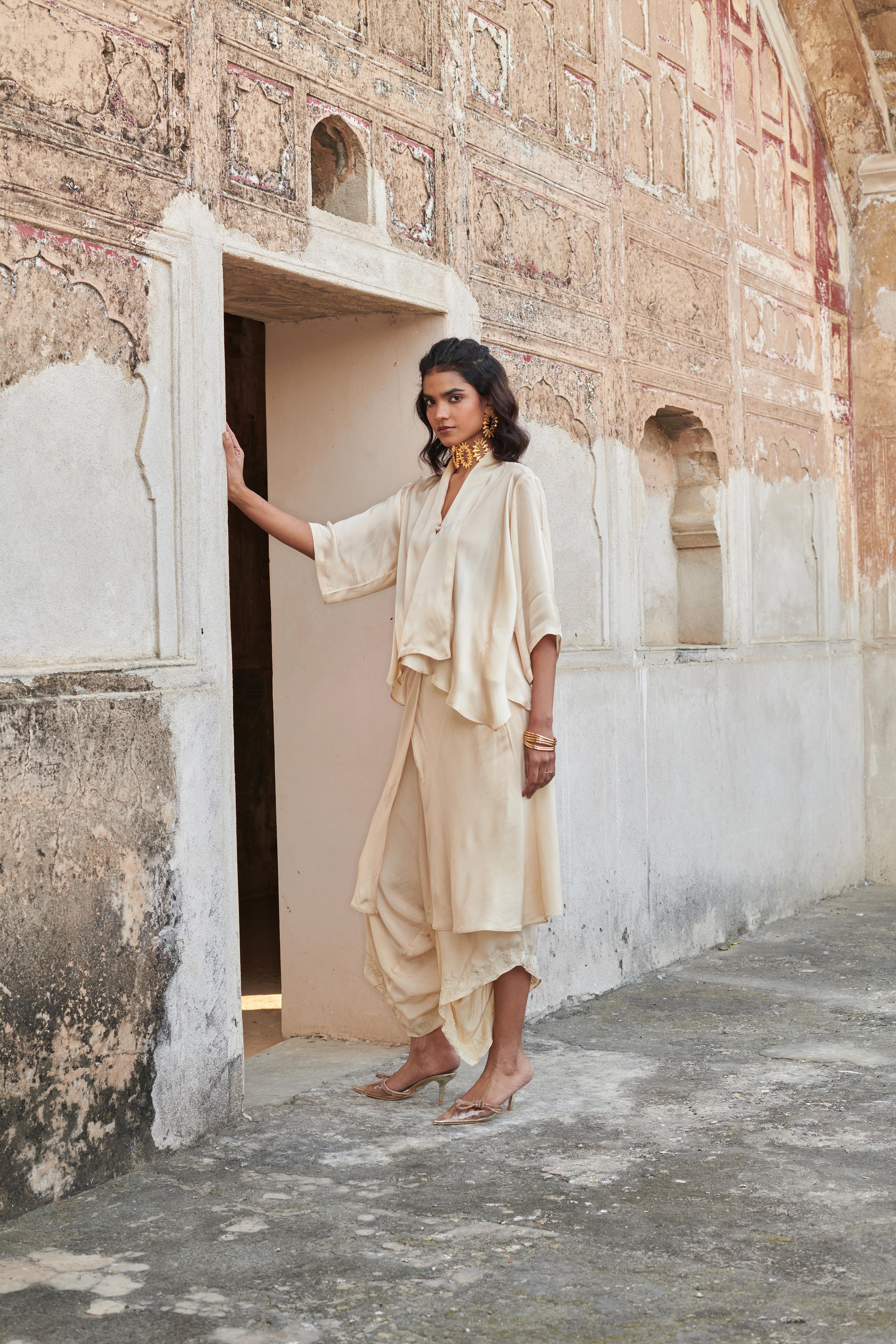 The co-ord set features a top with an overlapped pannel in the front and dropped shoulder sleeves and an asymmetric cut. Top length: 26" Paired with asymmetric flap pants highlighted with thread work at the bottom. Pant length: 40"