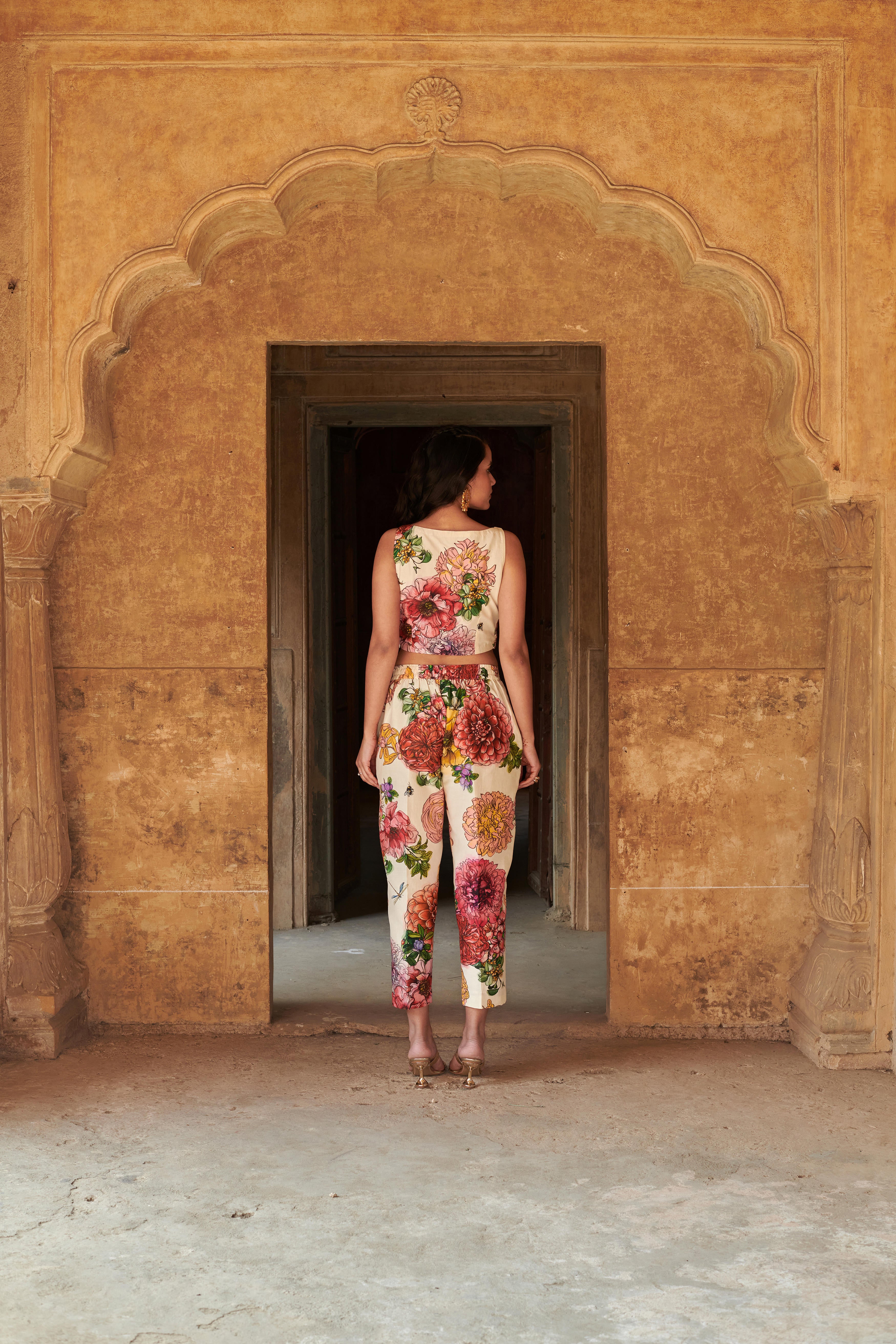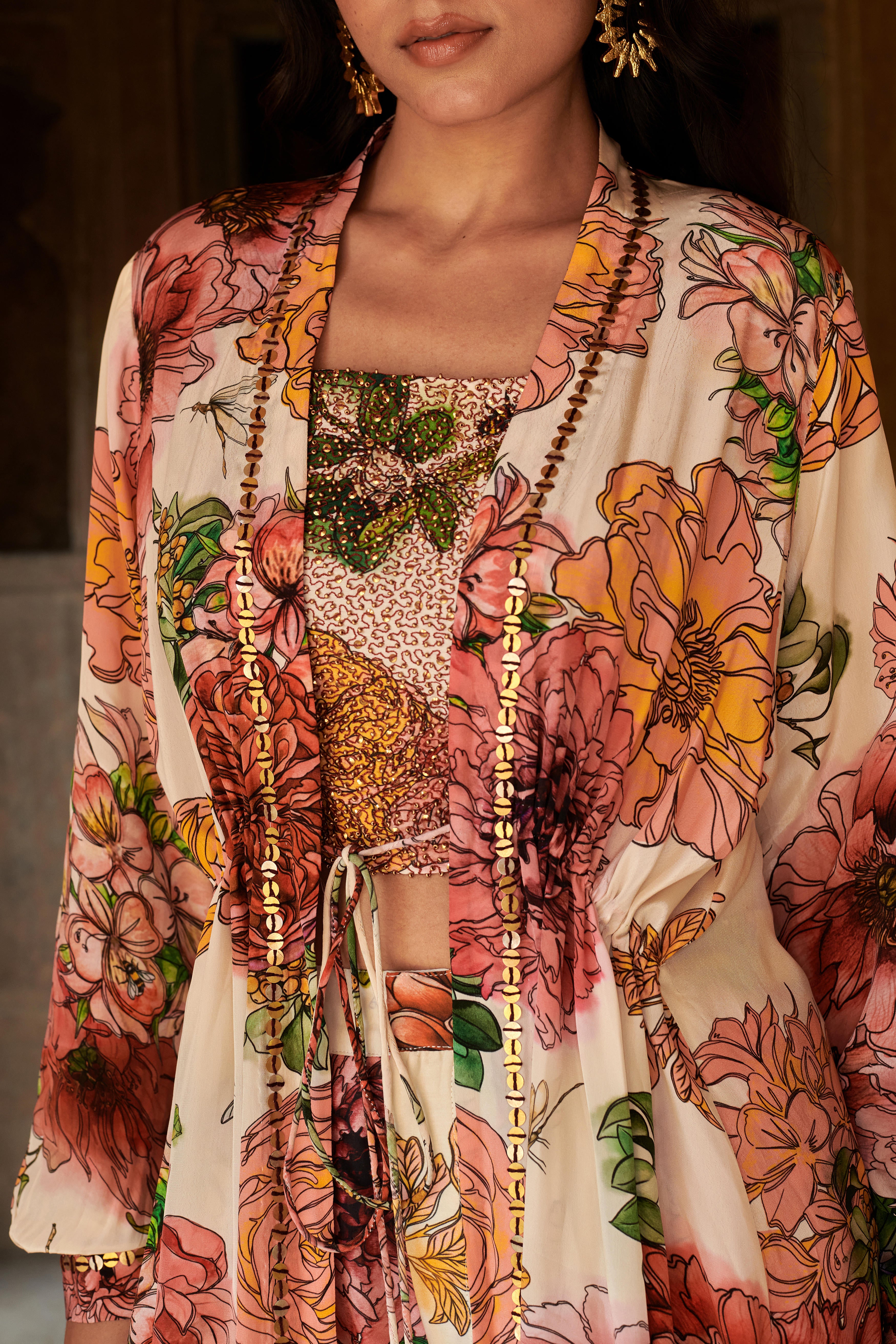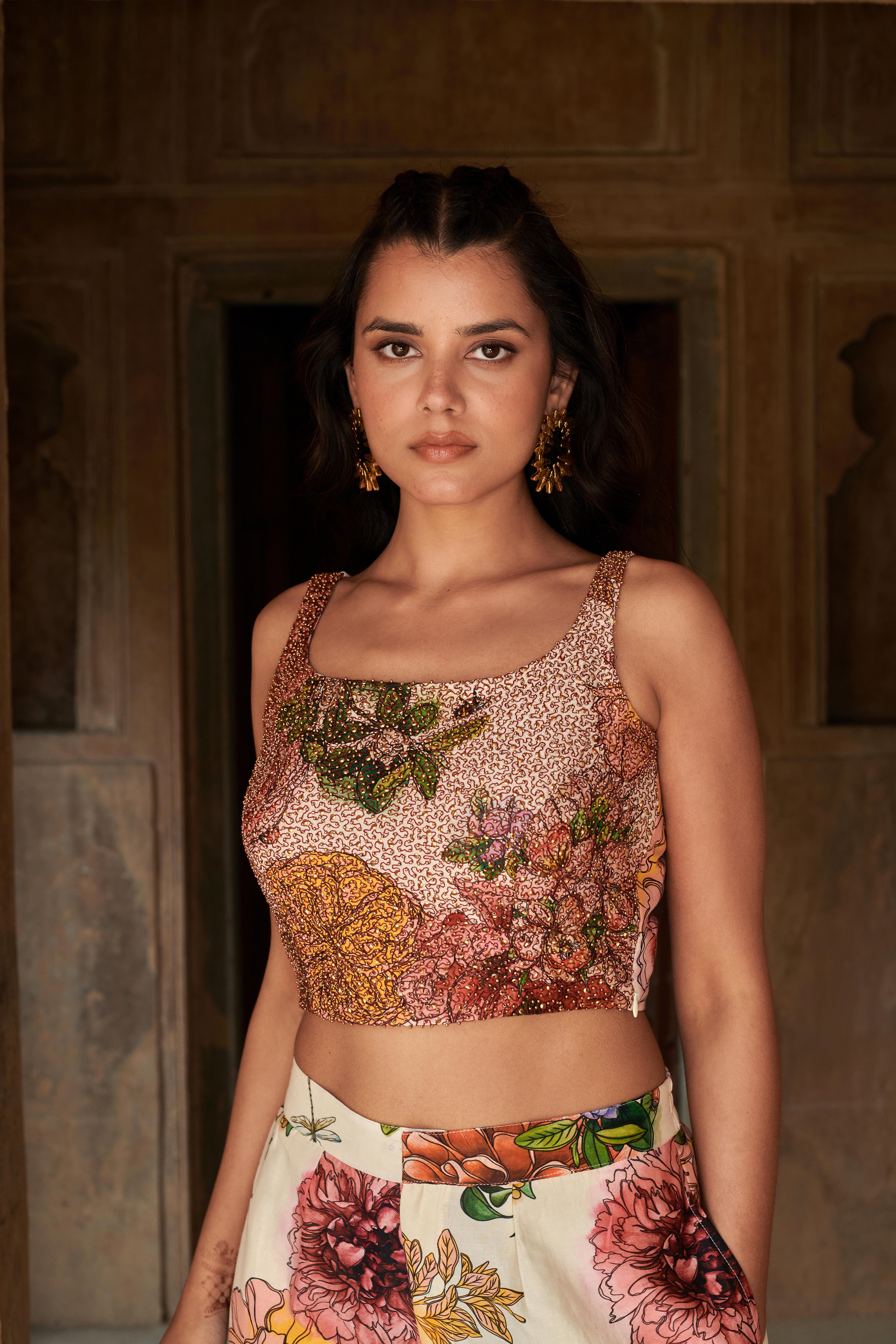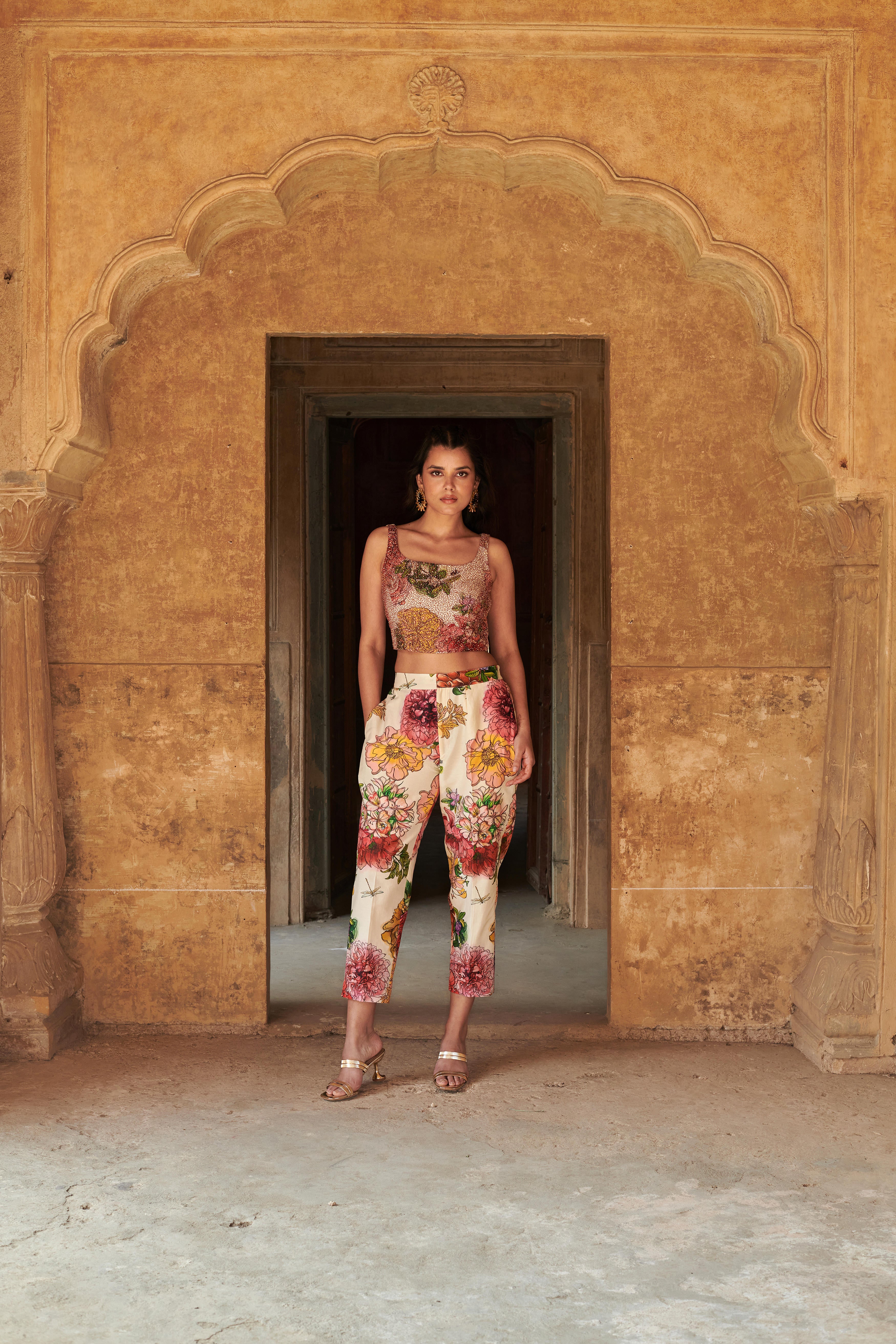 A three piece set pairing a crop top, pants and overlay. The crop top features fully intricate hand embroidery with front round neck and side zip closer. Top length:15" A pair of straight fit pants featuring half elasticated belt and side inseam pockets. Pant length:36" Hi-low overlay designed with a drawstring at the waist for adjustable comfort and style, has exquisite hand embroidery on it and tassels accents. Overlay front length:43" Back length: 46"