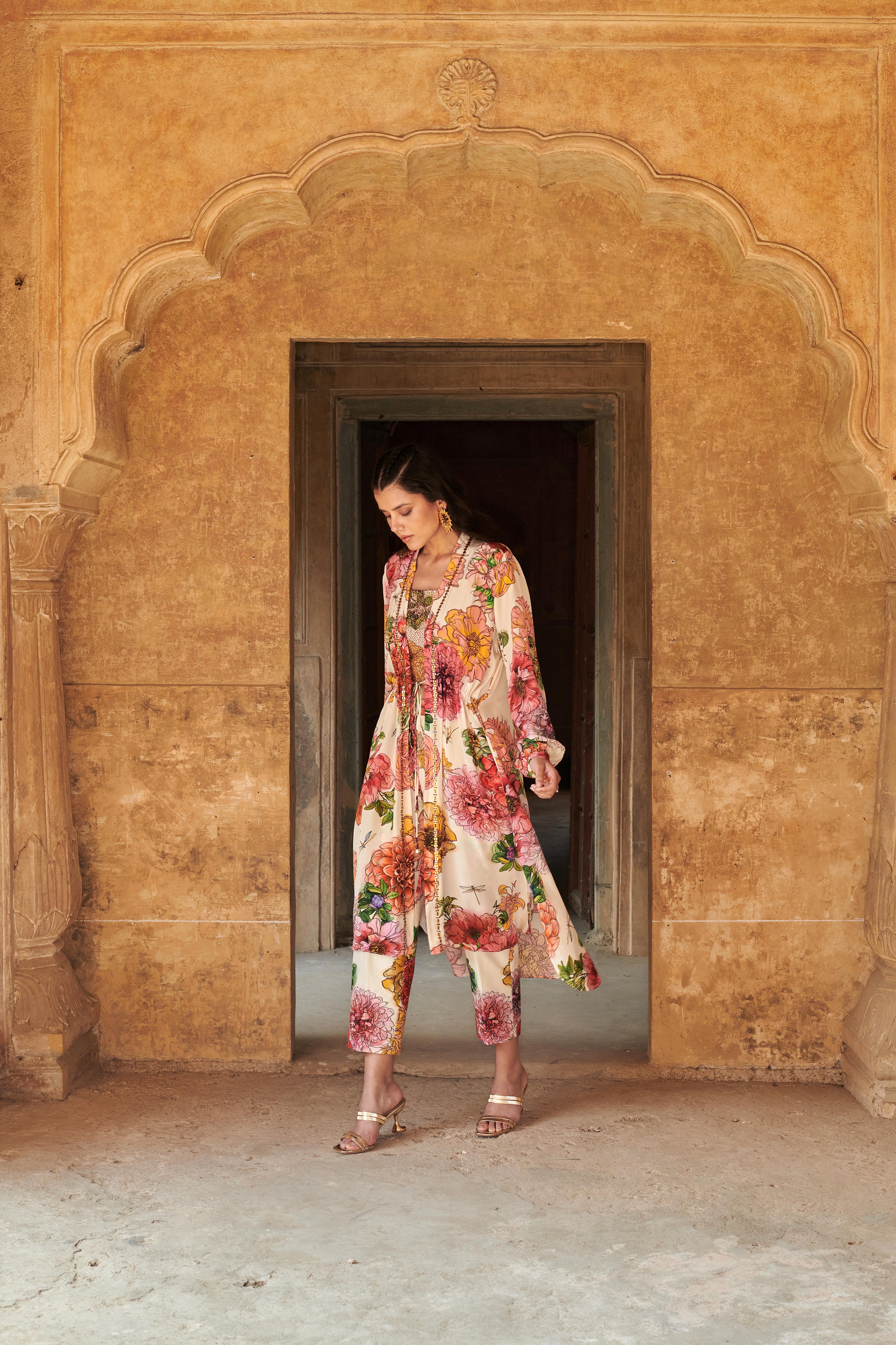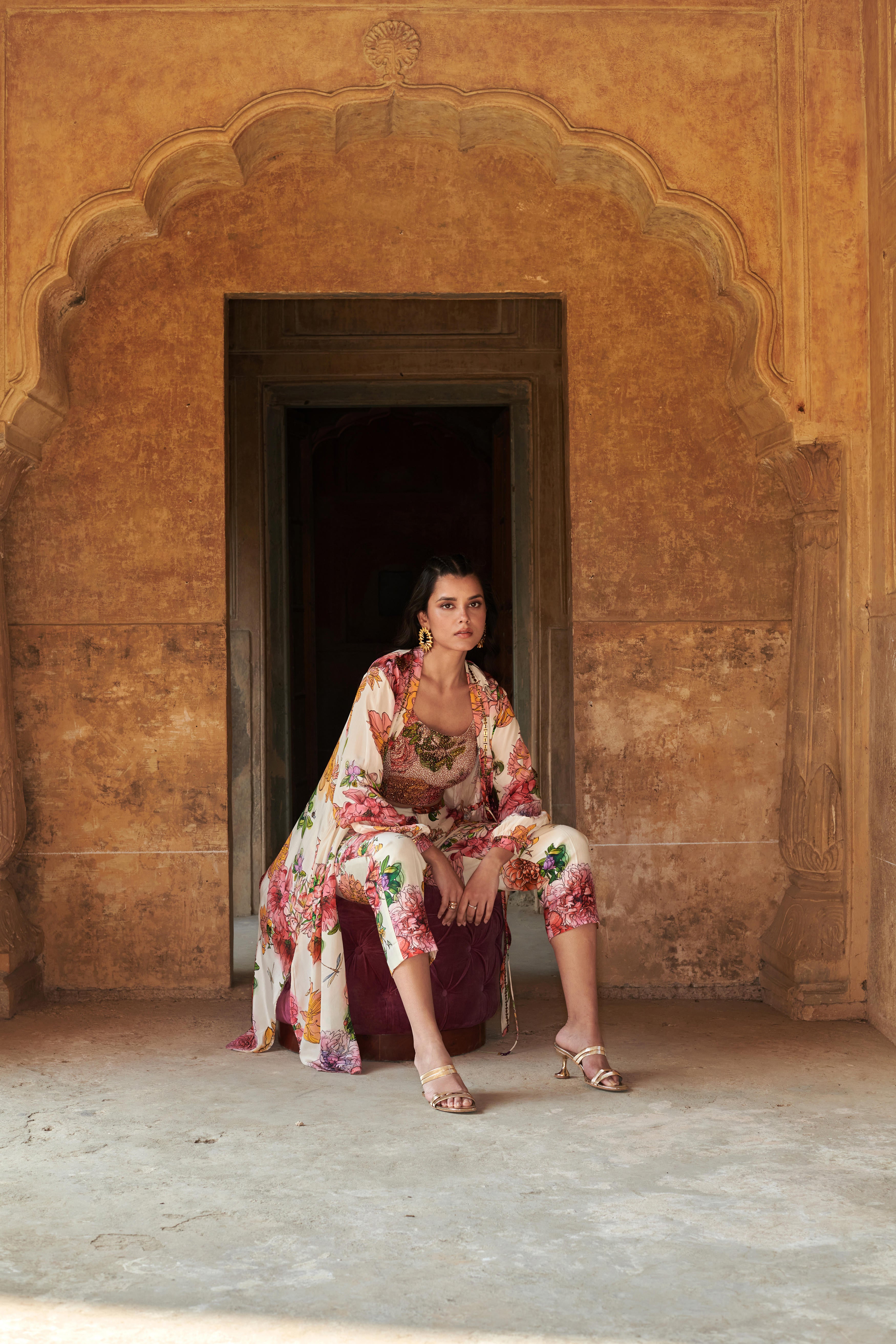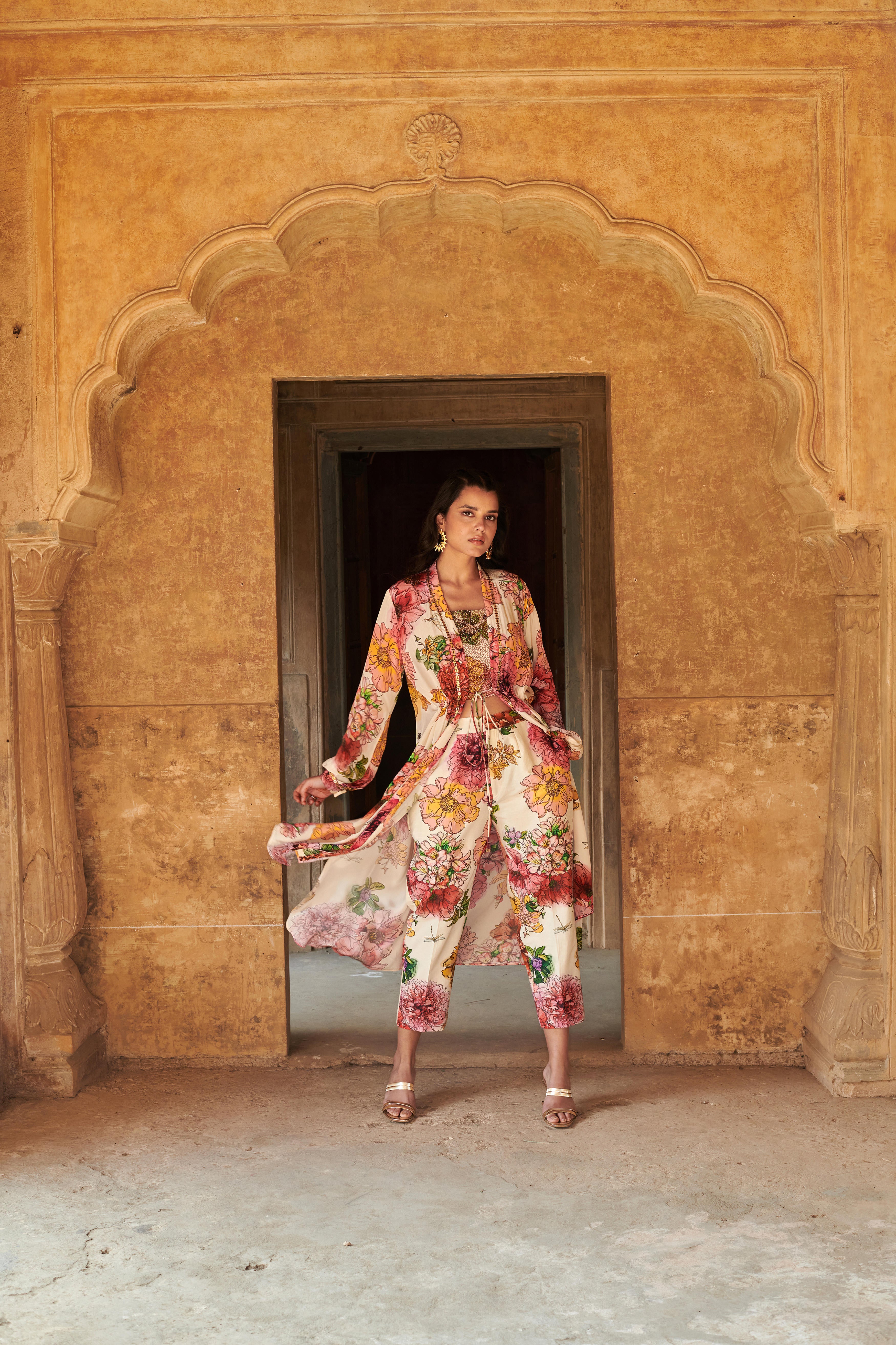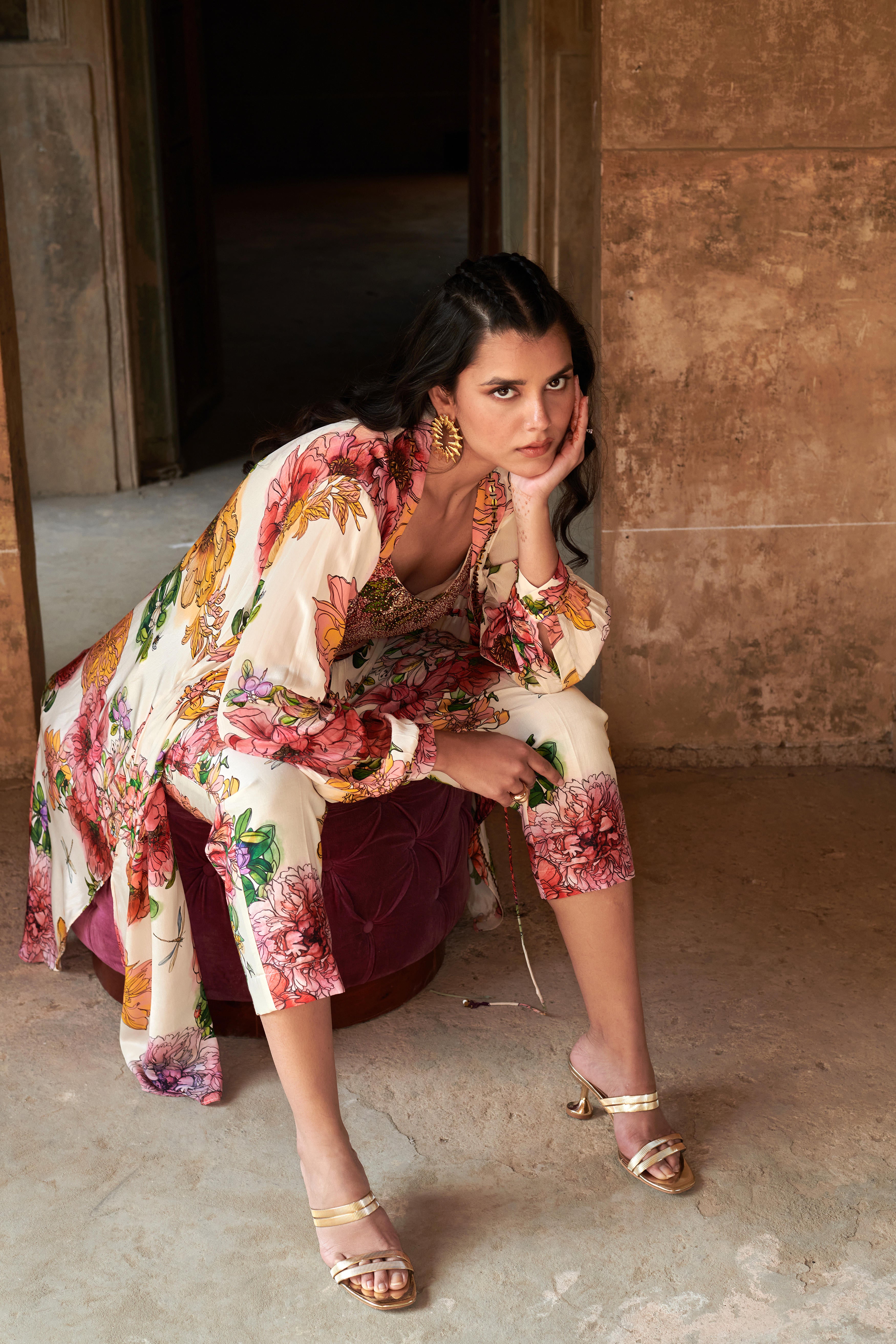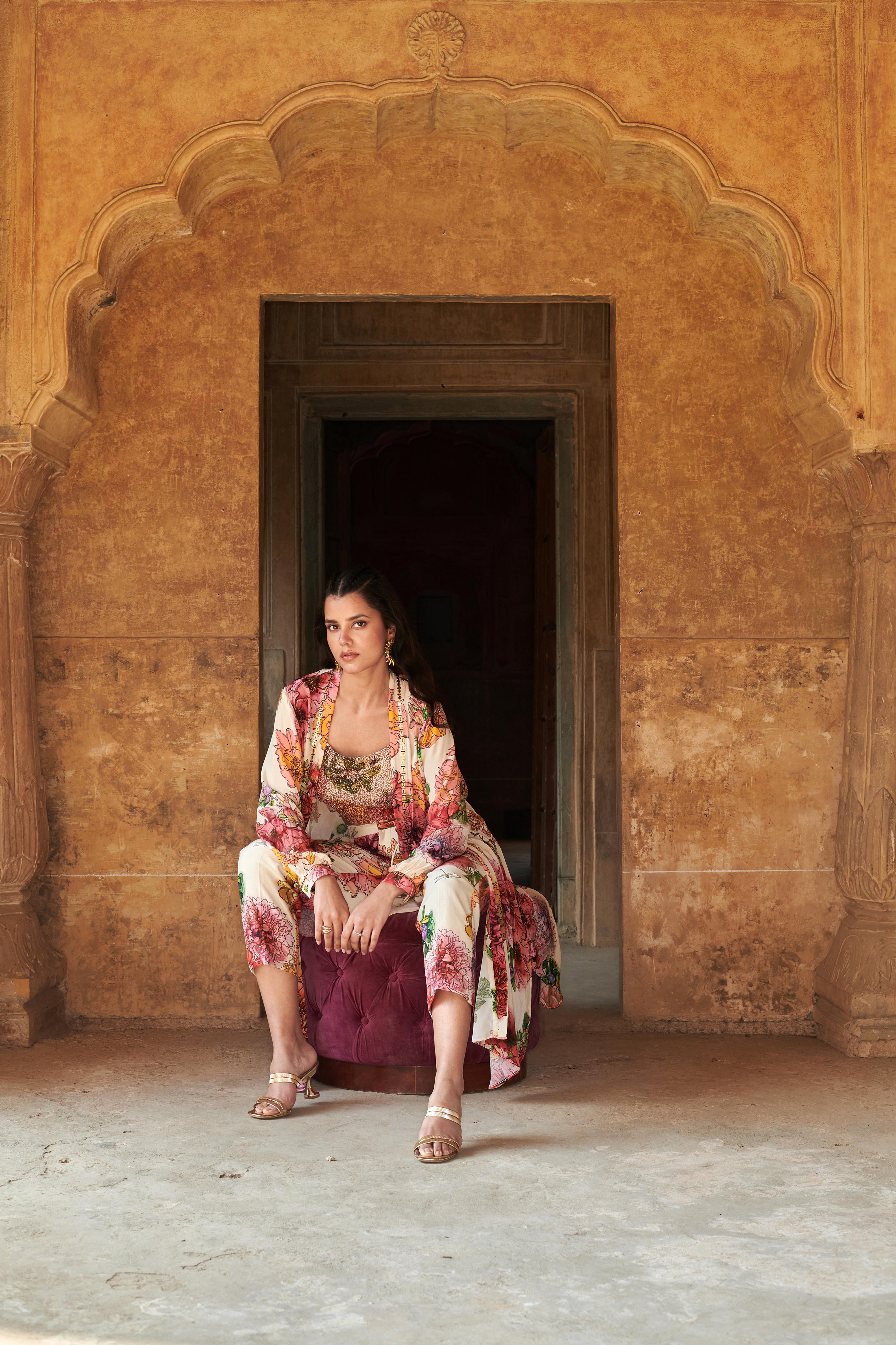A three piece set pairing a crop top, pants and overlay. The crop top features fully intricate hand embroidery with front round neck and side zip closer. Top length:15" A pair of straight fit pants featuring half elasticated belt and side inseam pockets. Pant length:36" Hi-low overlay designed with a drawstring at the waist for adjustable comfort and style, has exquisite hand embroidery on it and tassels accents. Overlay front length:43" Back length: 46"
