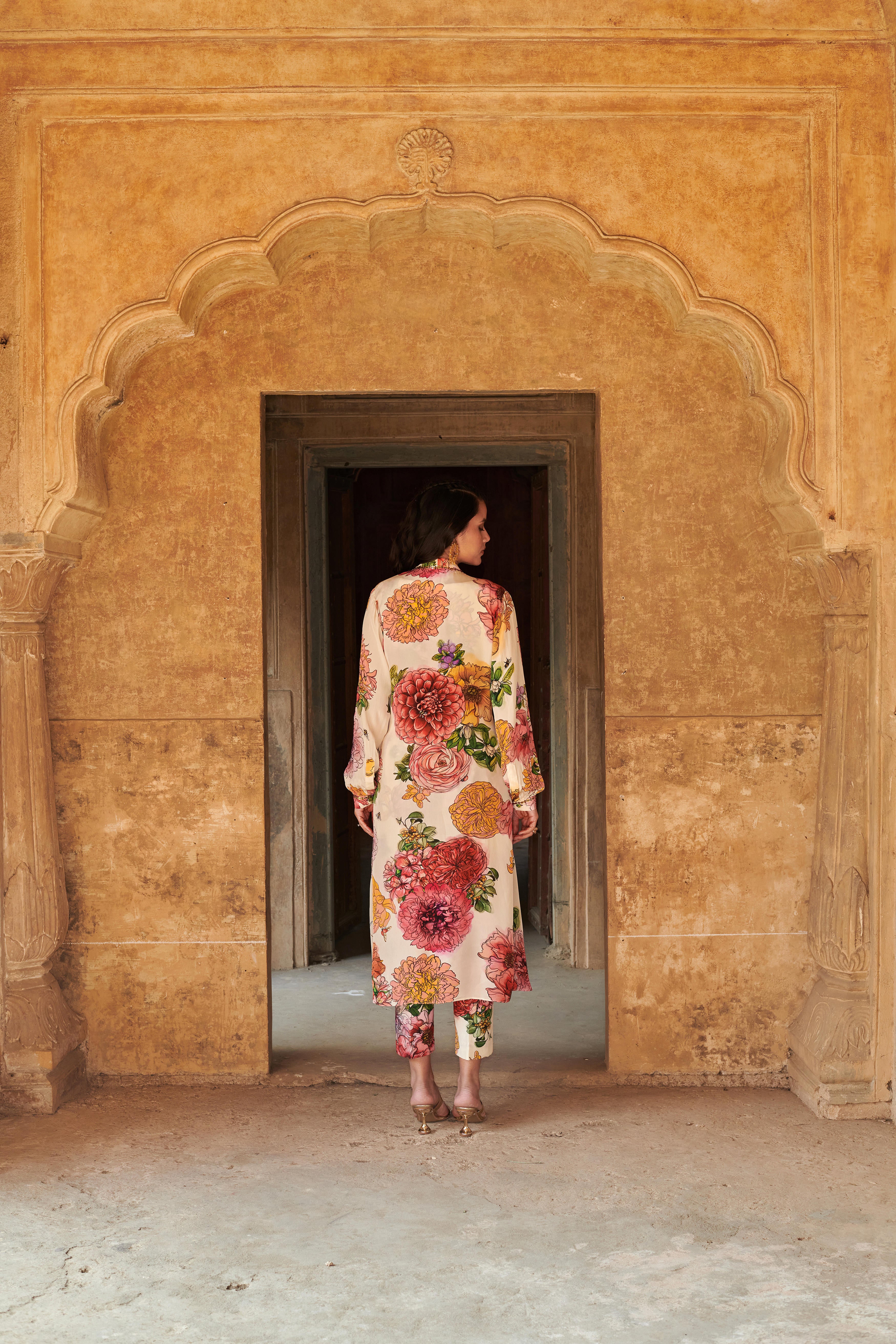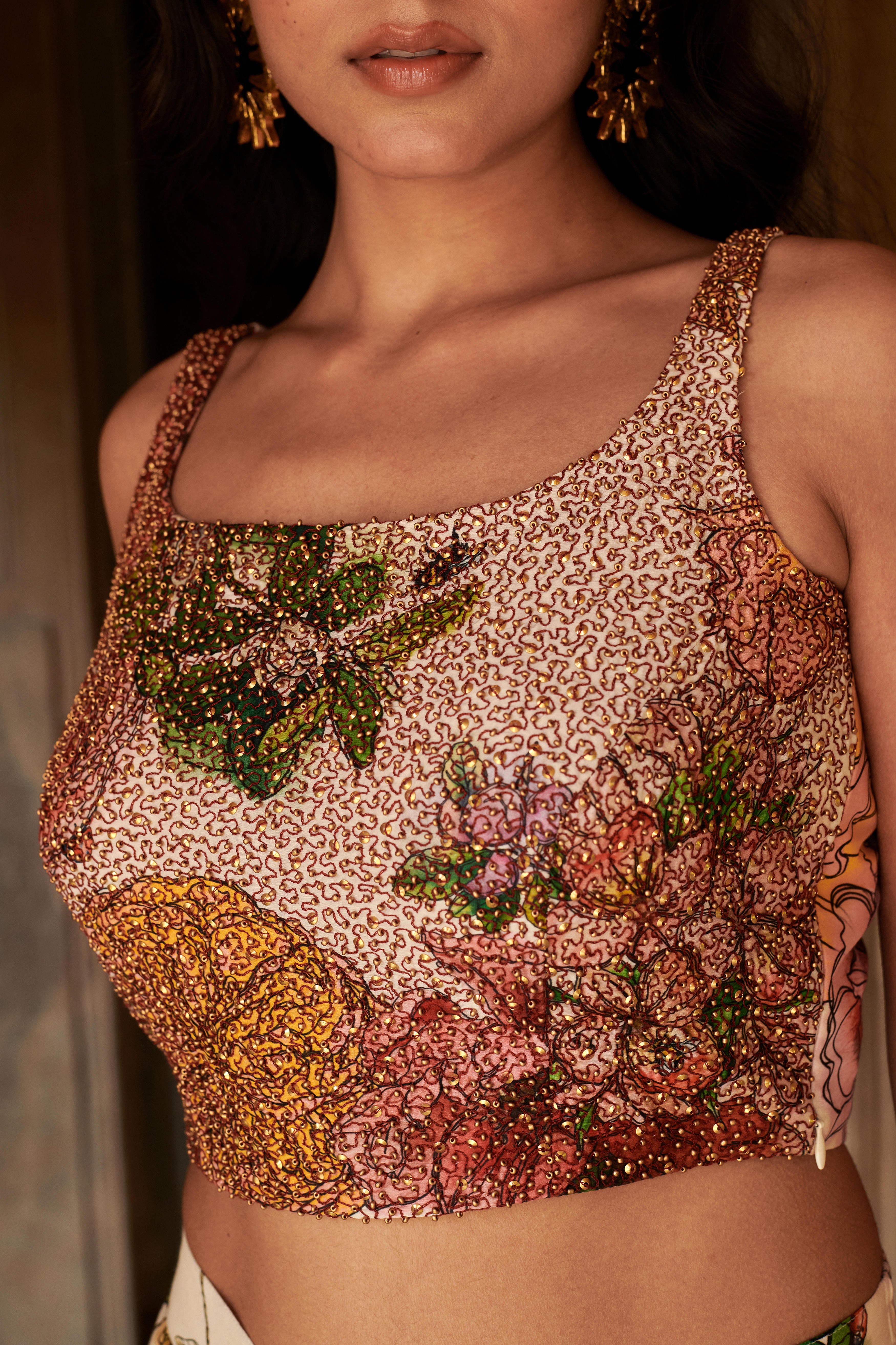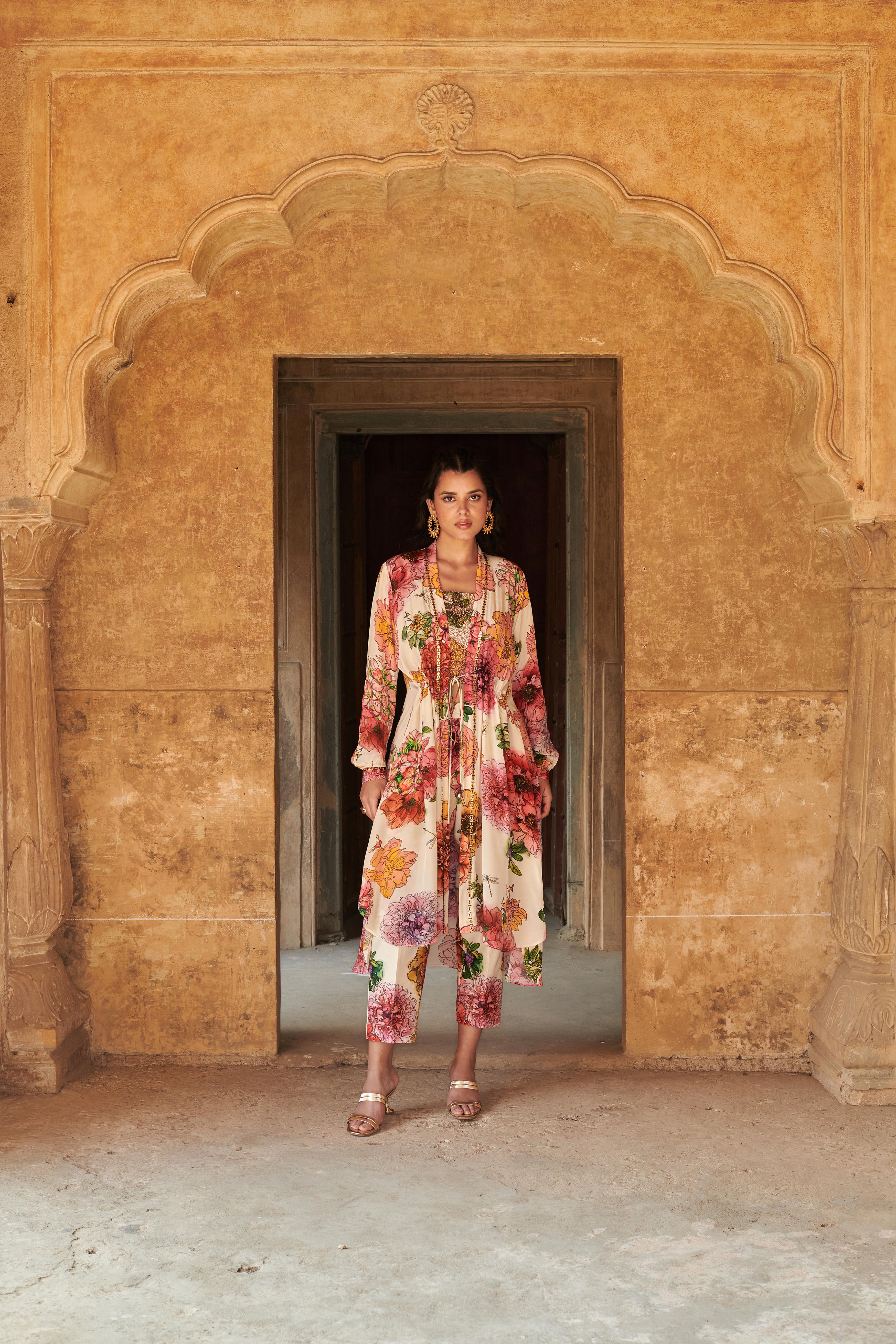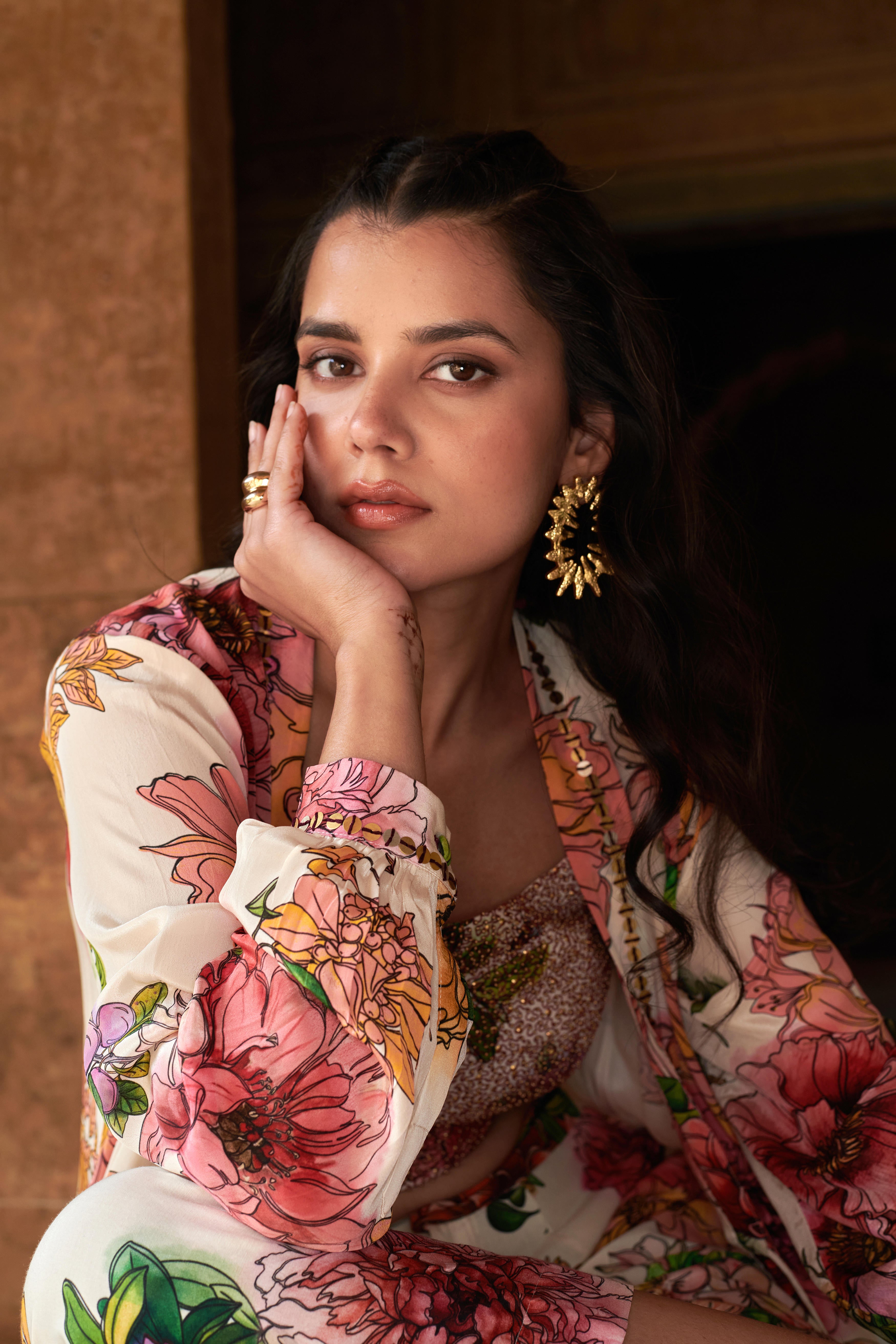 A three piece set pairing a crop top, pants and overlay. The crop top features fully intricate hand embroidery with front round neck and side zip closer. Top length:15" A pair of straight fit pants featuring half elasticated belt and side inseam pockets. Pant length:36" Hi-low overlay designed with a drawstring at the waist for adjustable comfort and style, has exquisite hand embroidery on it and tassels accents. Overlay front length:43" Back length: 46"