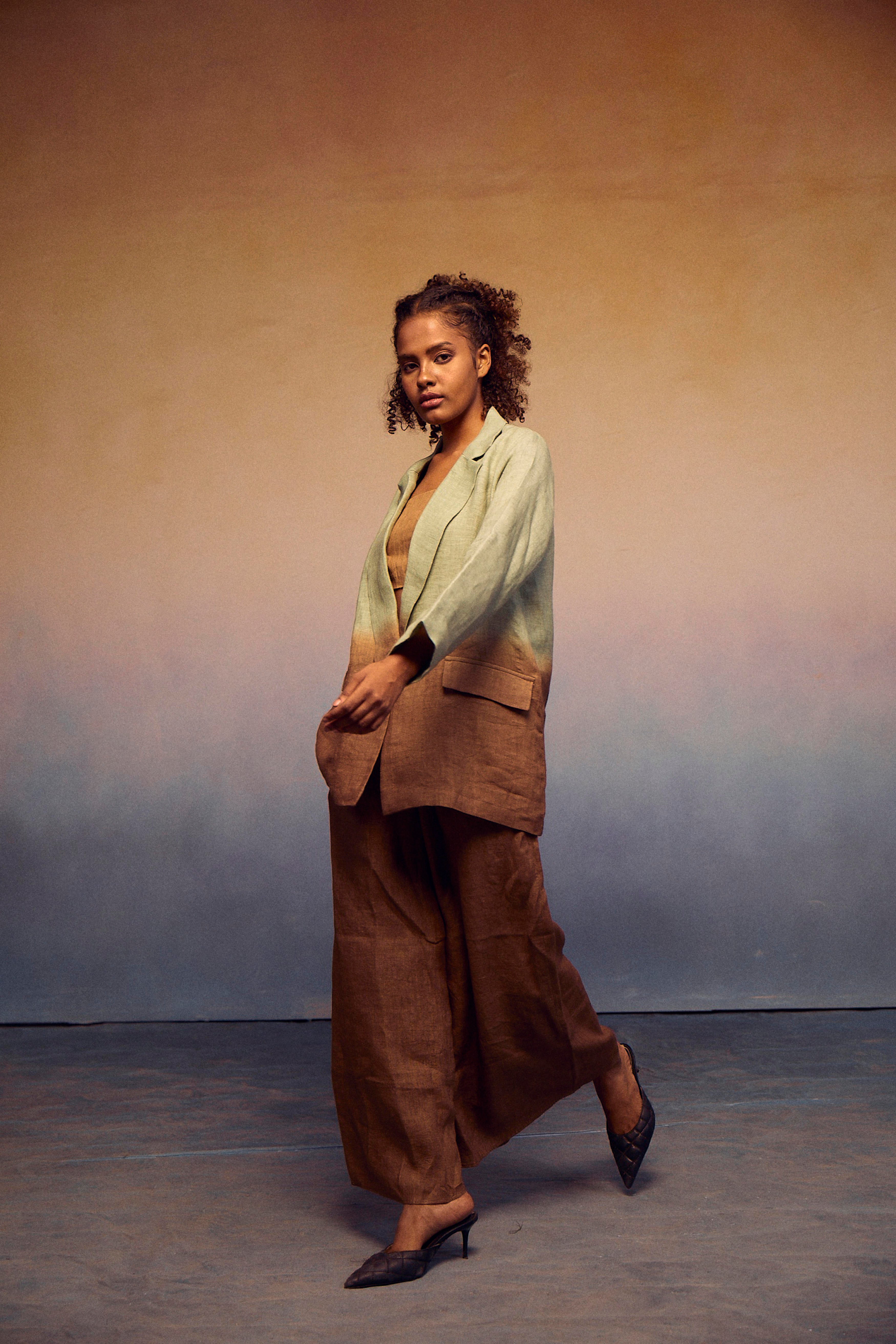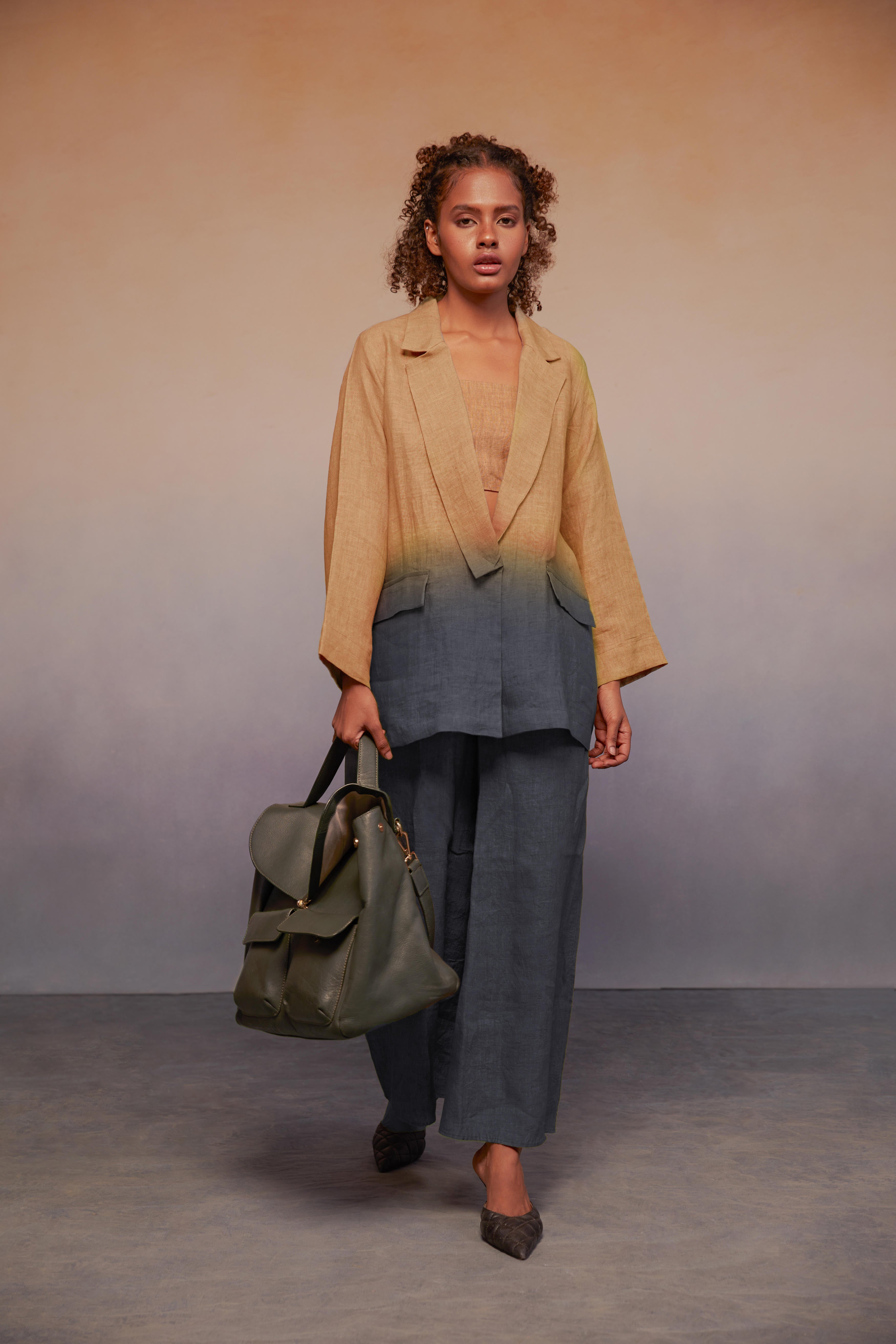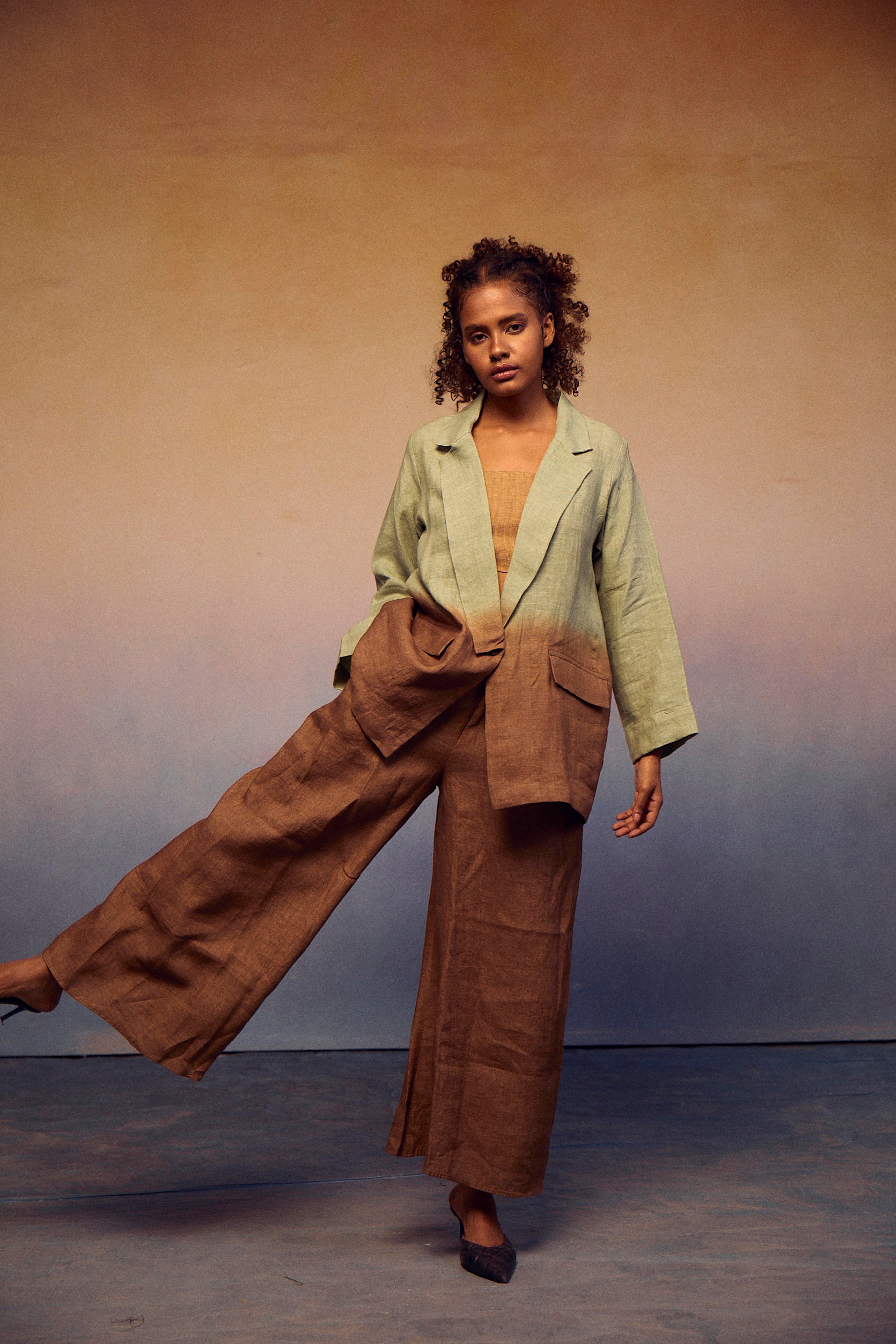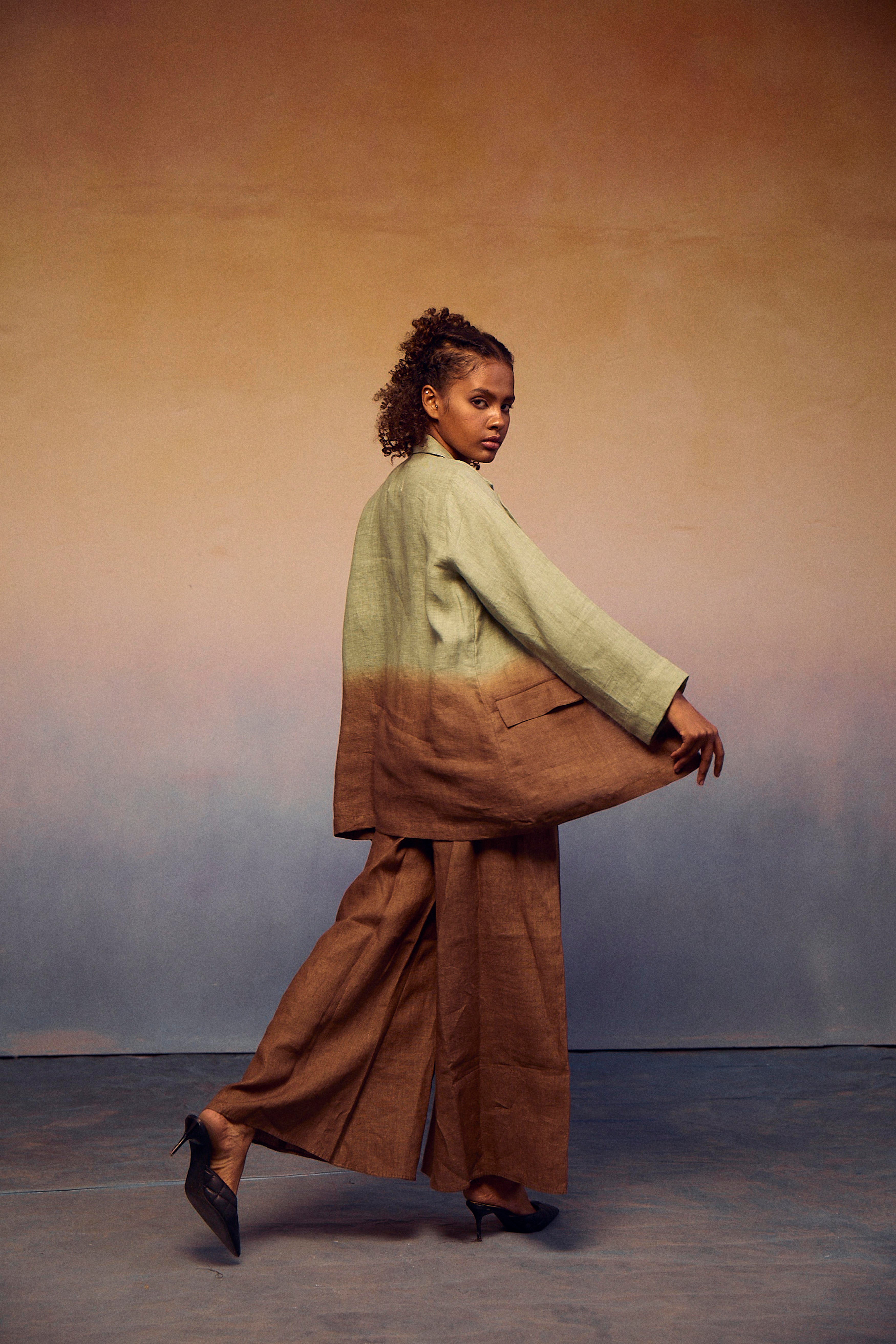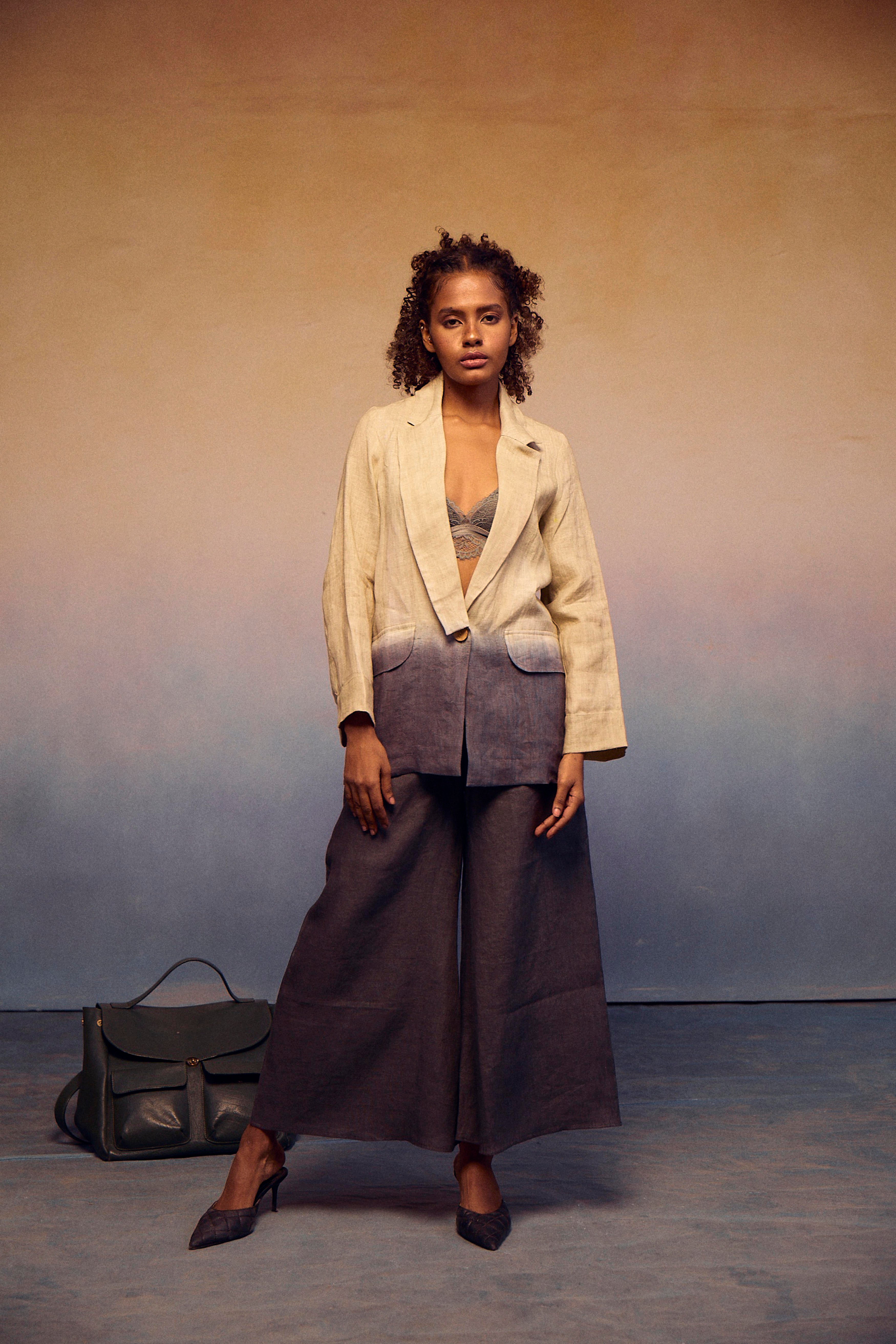 Our Ombre Fitted Blazer with Double Collar Detail, complete with functional pockets and a striking ombre effect. Paired flawlessly with our Ombre Pondi Pants for a chic ensemble.