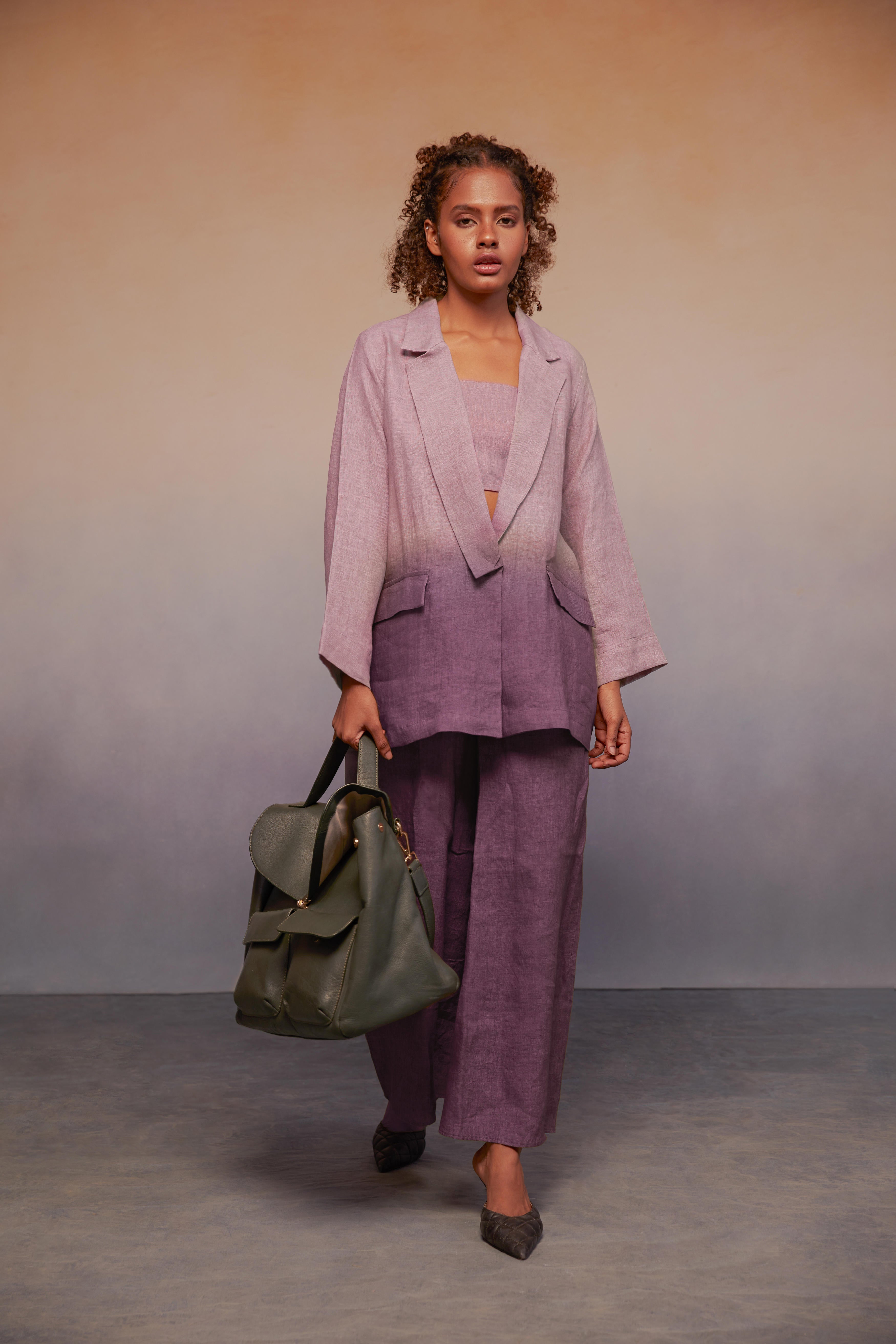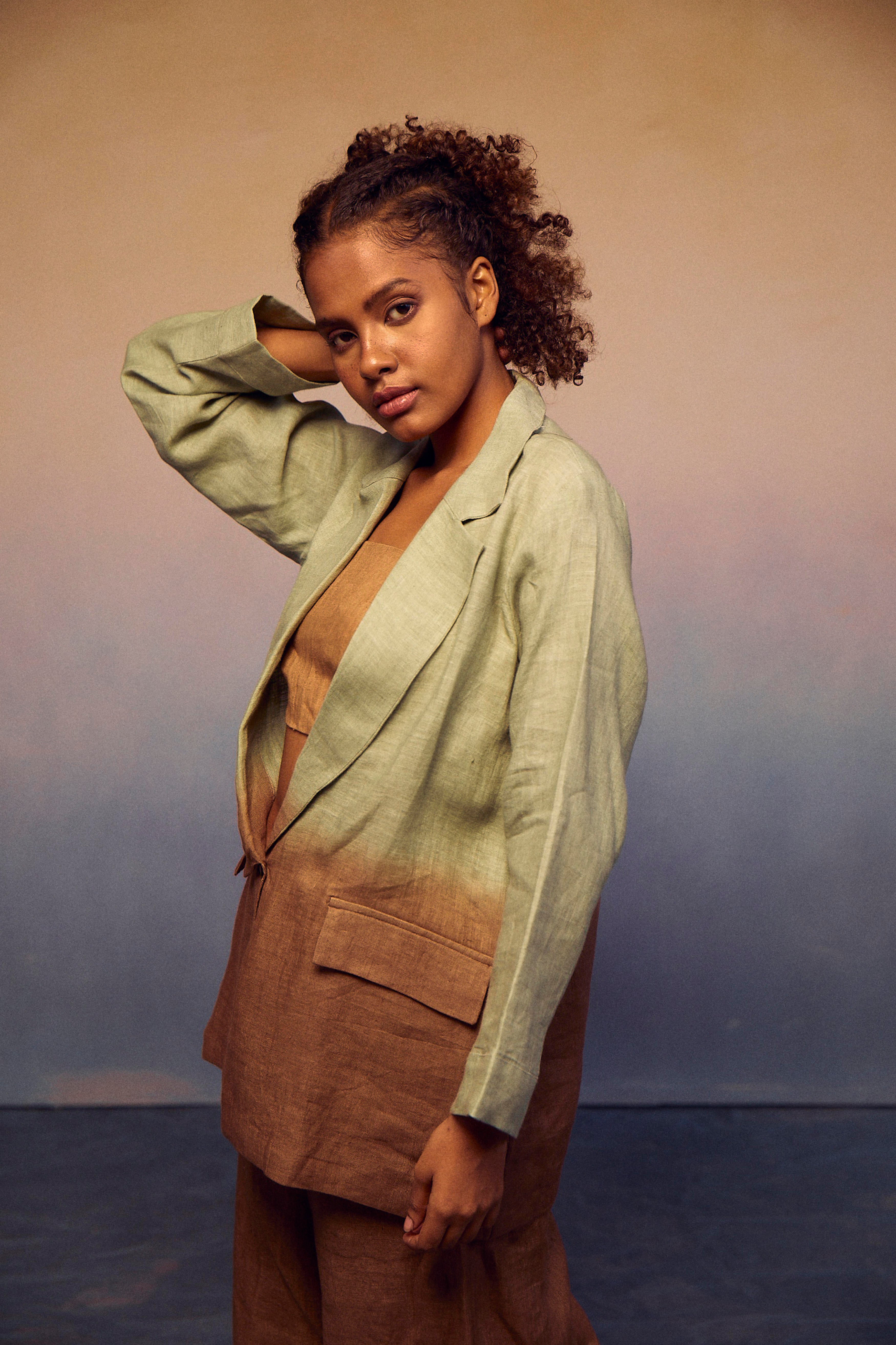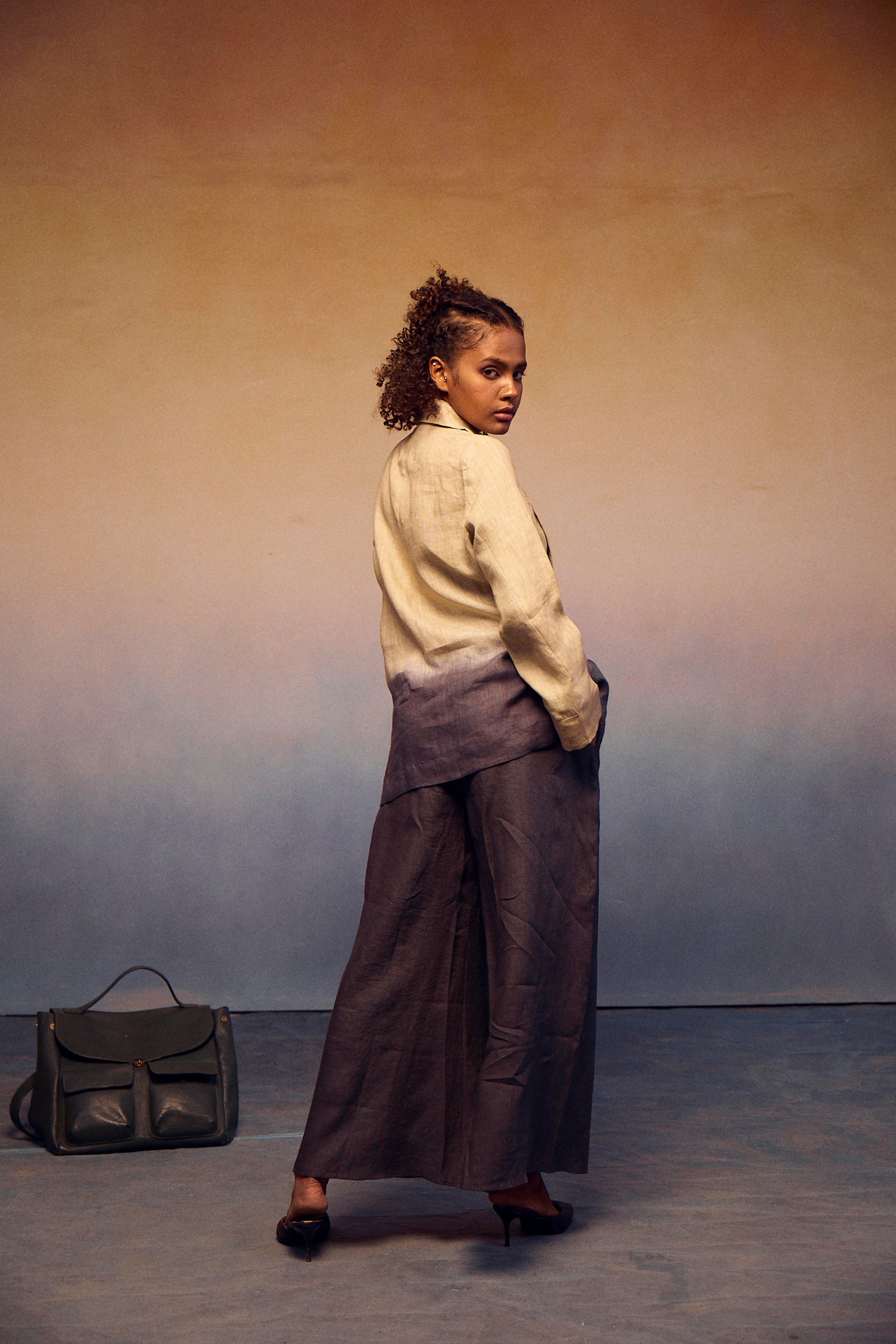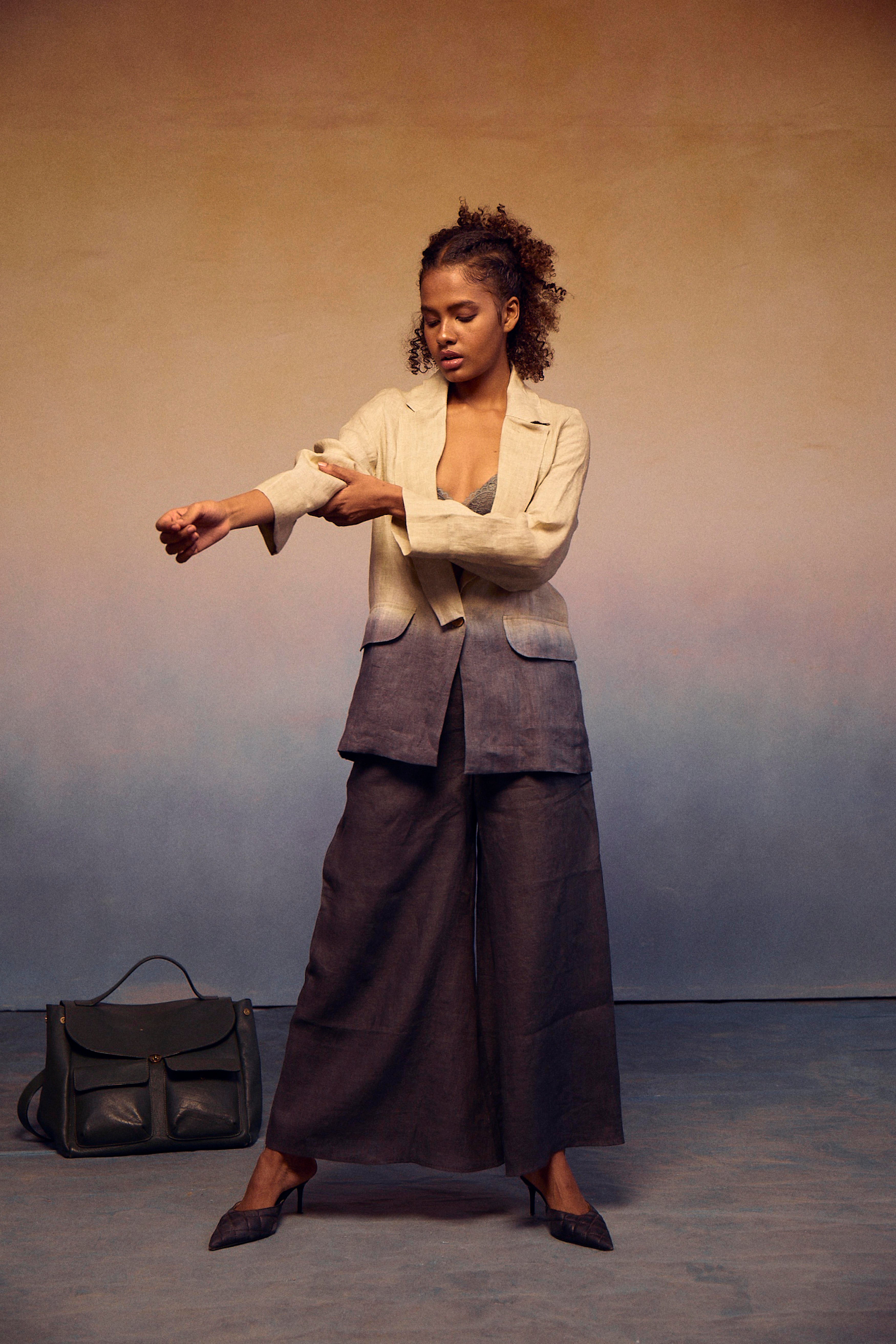 Our Ombre Fitted Blazer with Double Collar Detail, complete with functional pockets and a striking ombre effect. Paired flawlessly with our Ombre Pondi Pants for a chic ensemble.