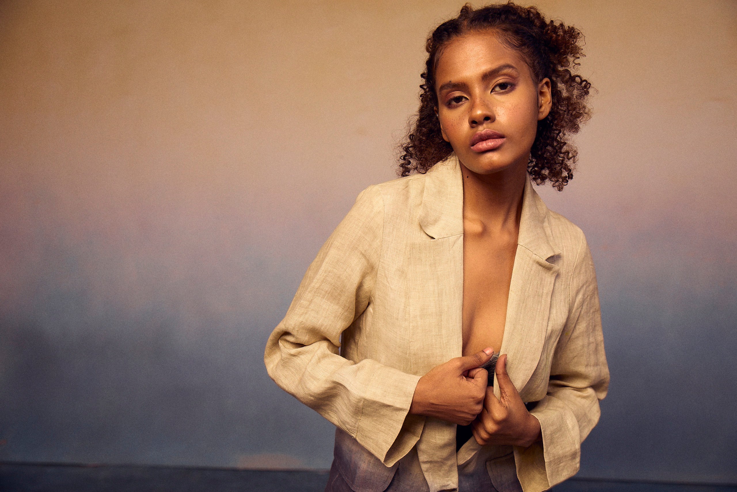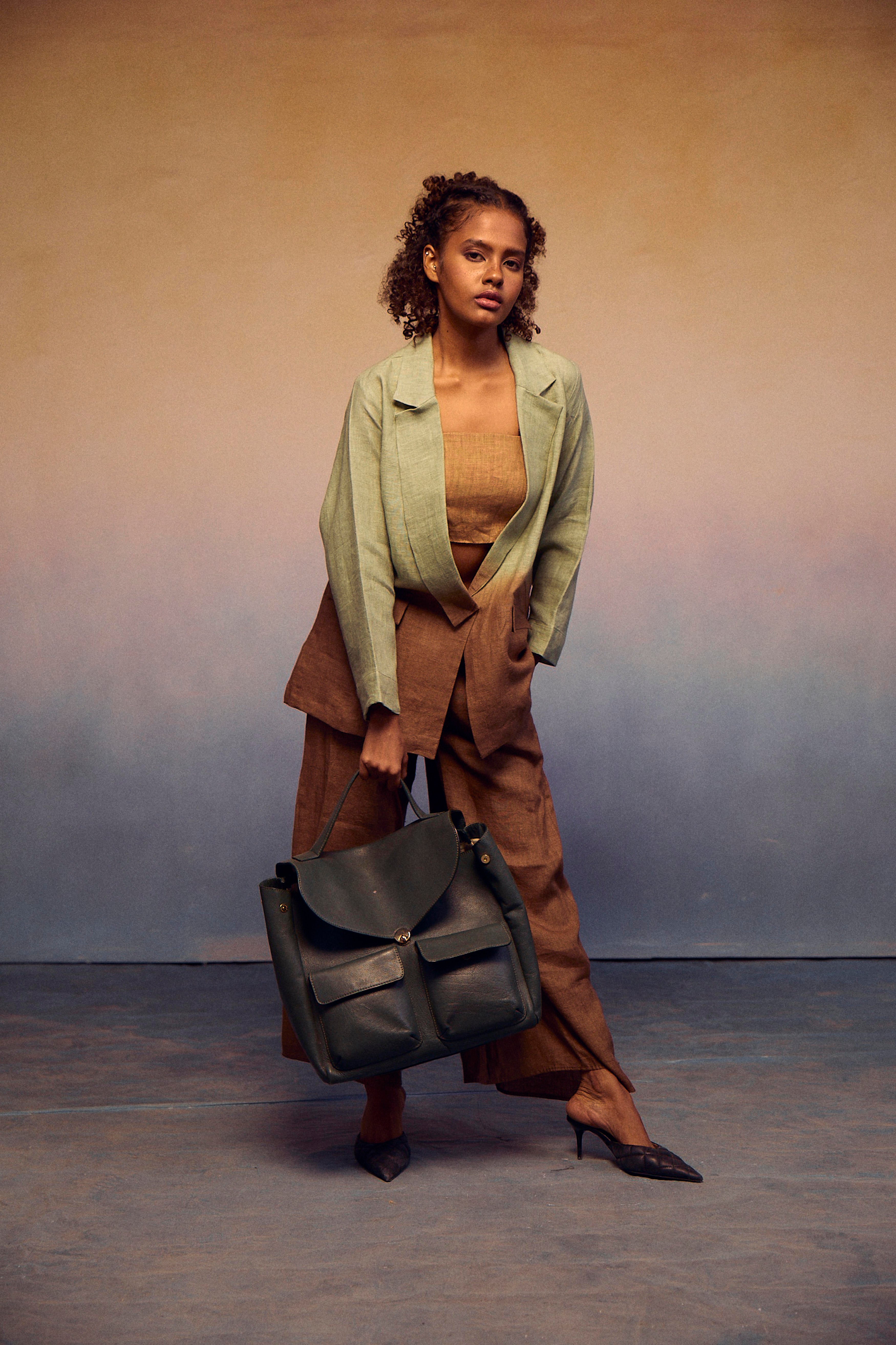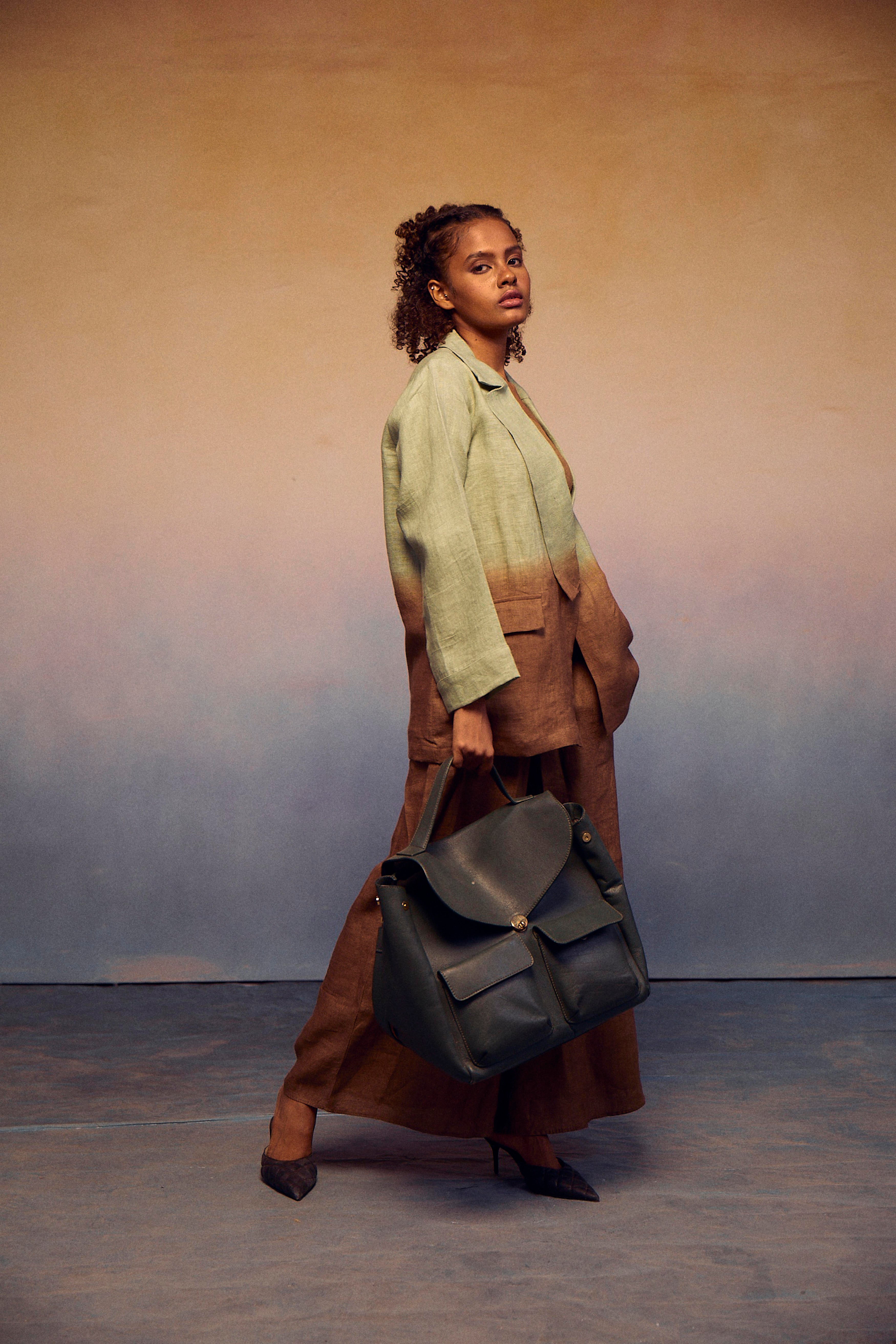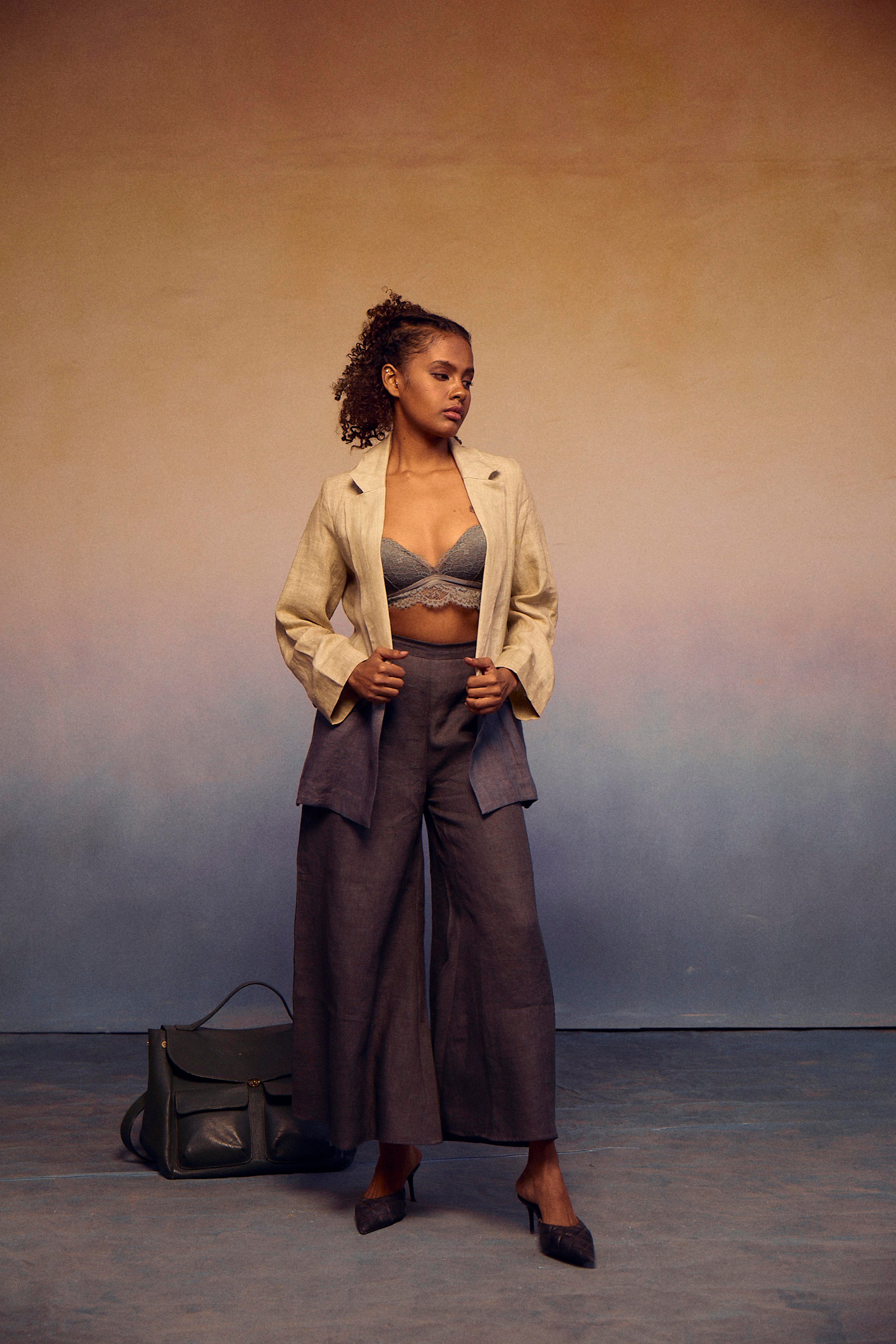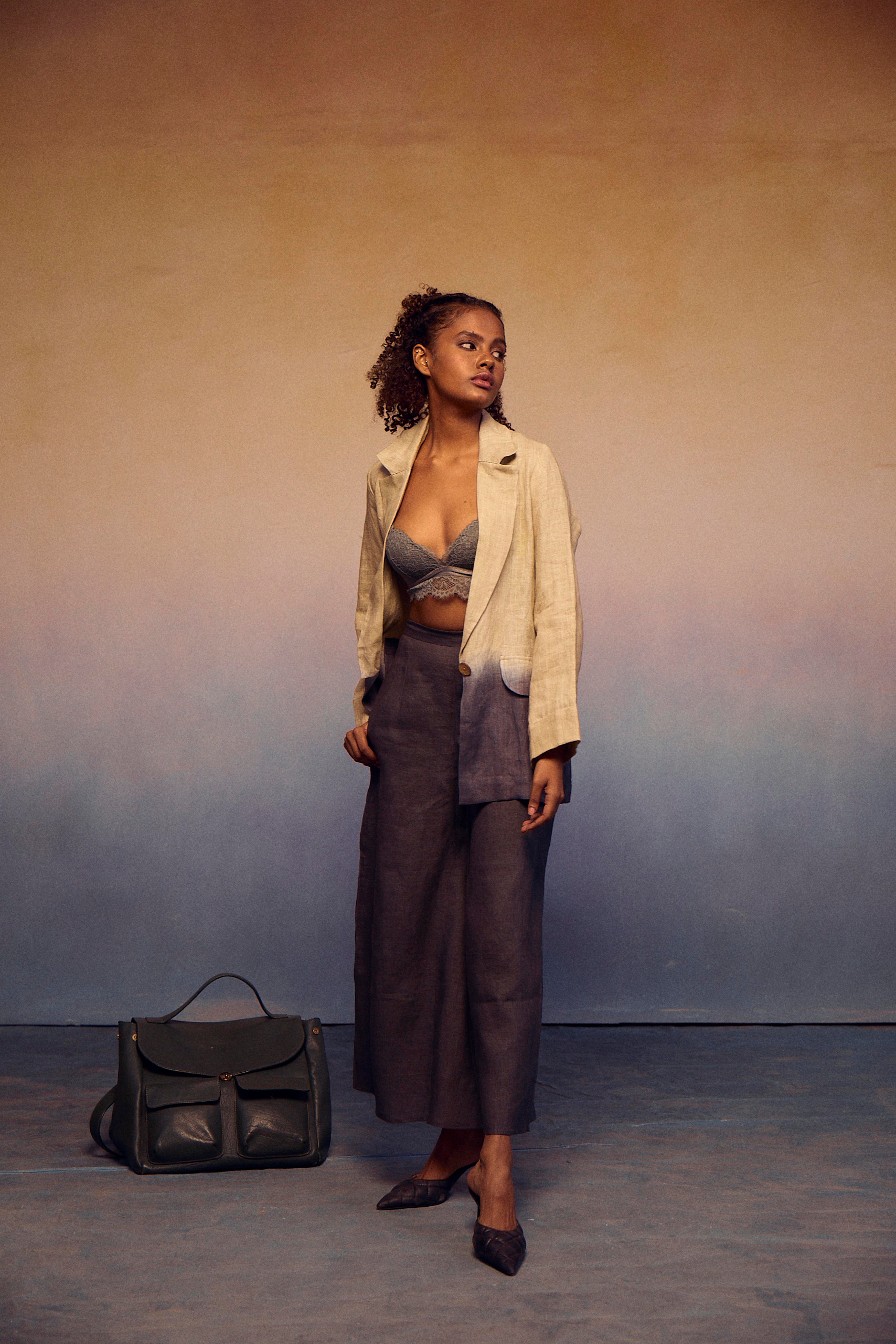 Our Ombre Fitted Blazer with Double Collar Detail, complete with functional pockets and a striking ombre effect. Paired flawlessly with our Ombre Pondi Pants for a chic ensemble.