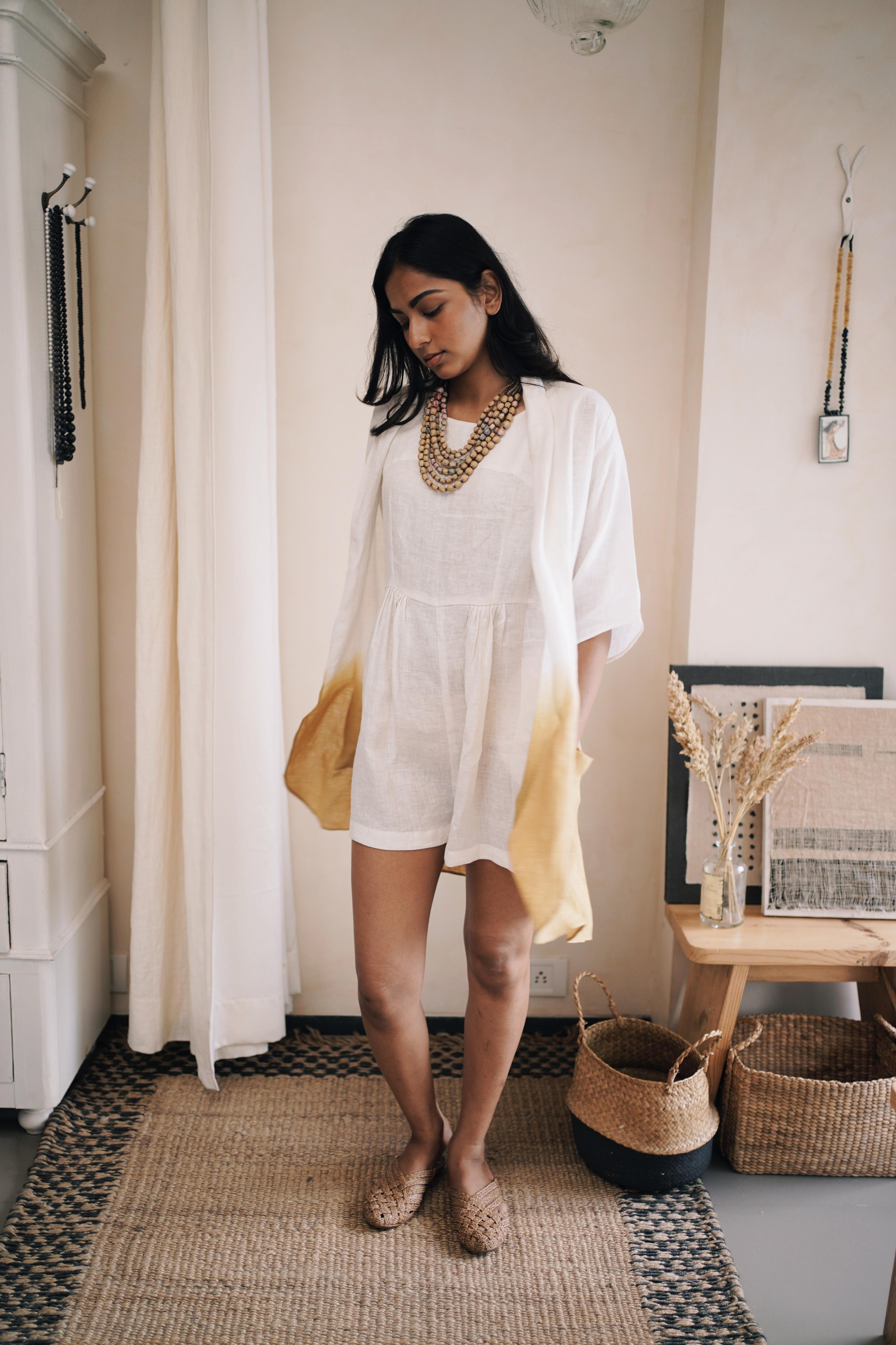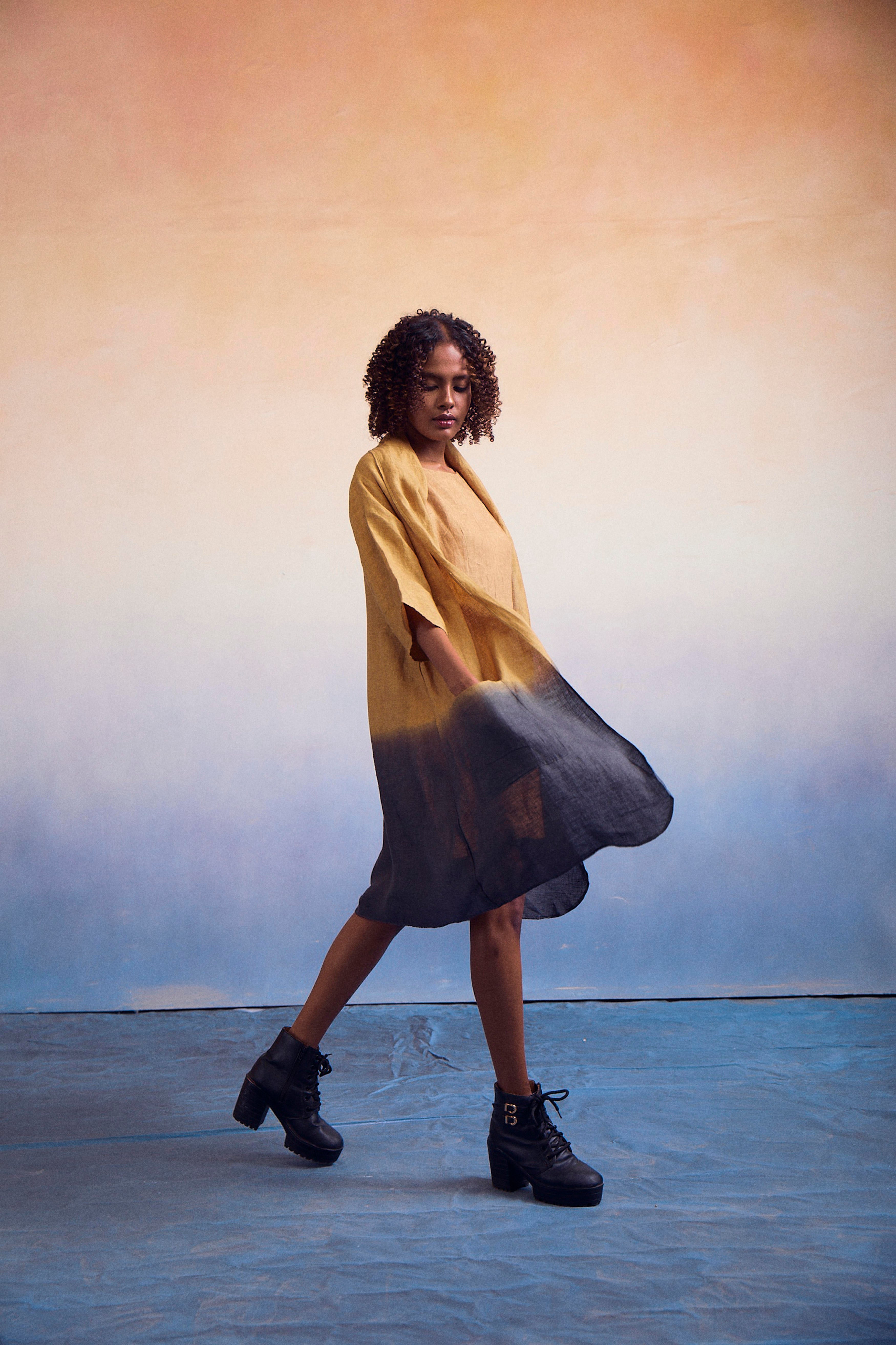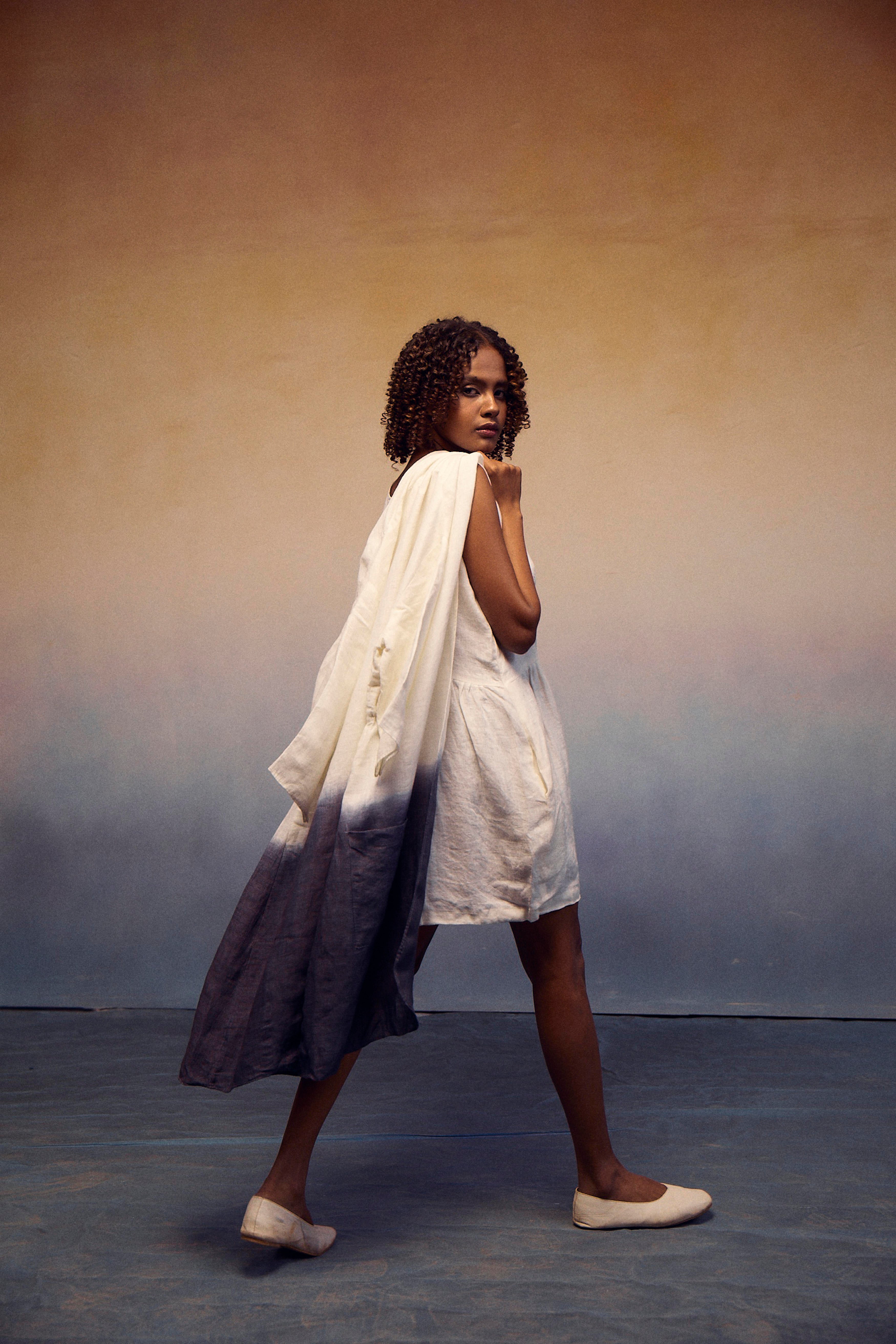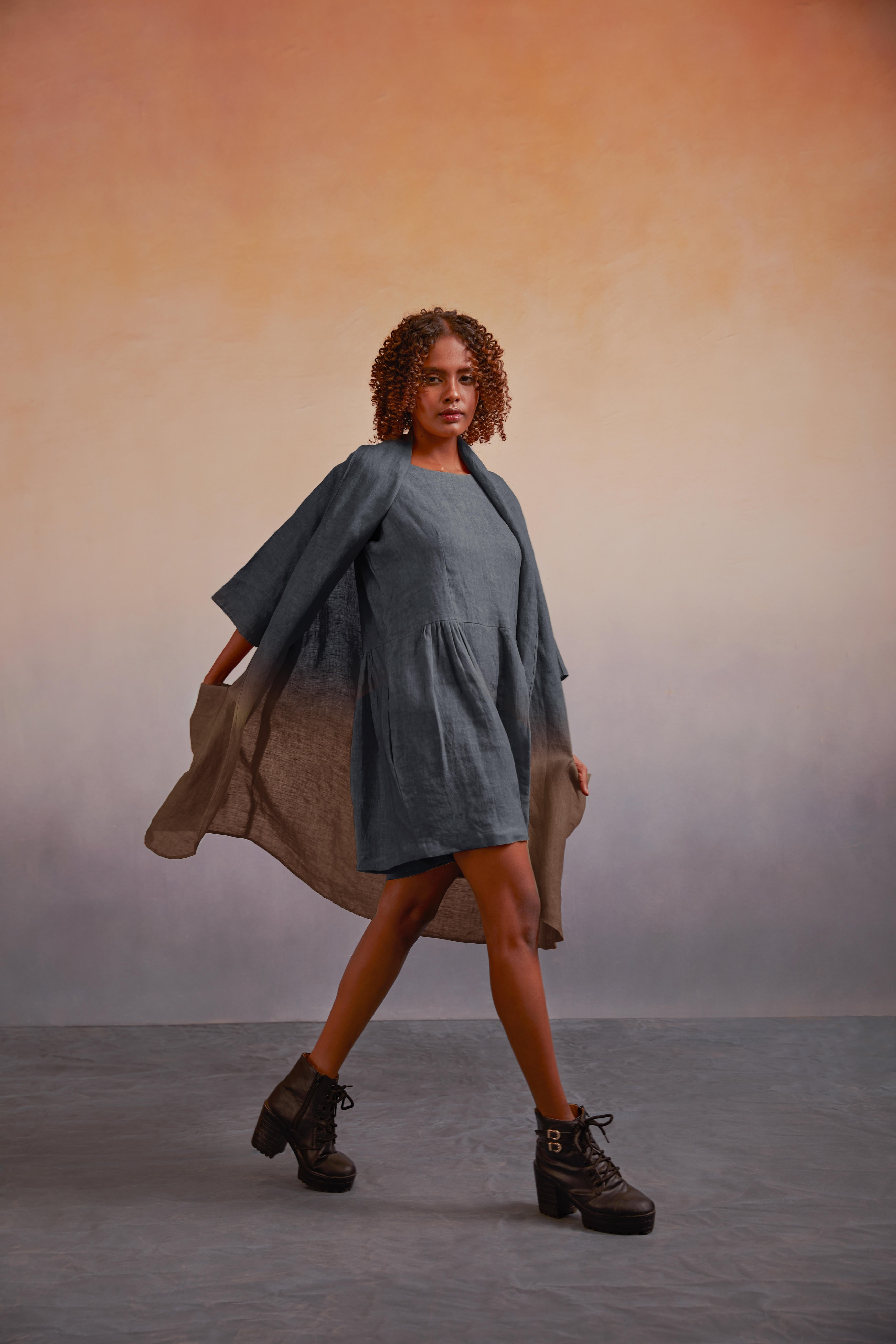 A 2 PC jumpsuit with overlay, which gives freedom and playfulness as well as a style statement. A short length with wide legs boy jumpsuit which brings comfort and a long jacket accompanies to add a statement that makes the entire two-piece outfit as a formal evening wear. Collection: Ocean of ombre
