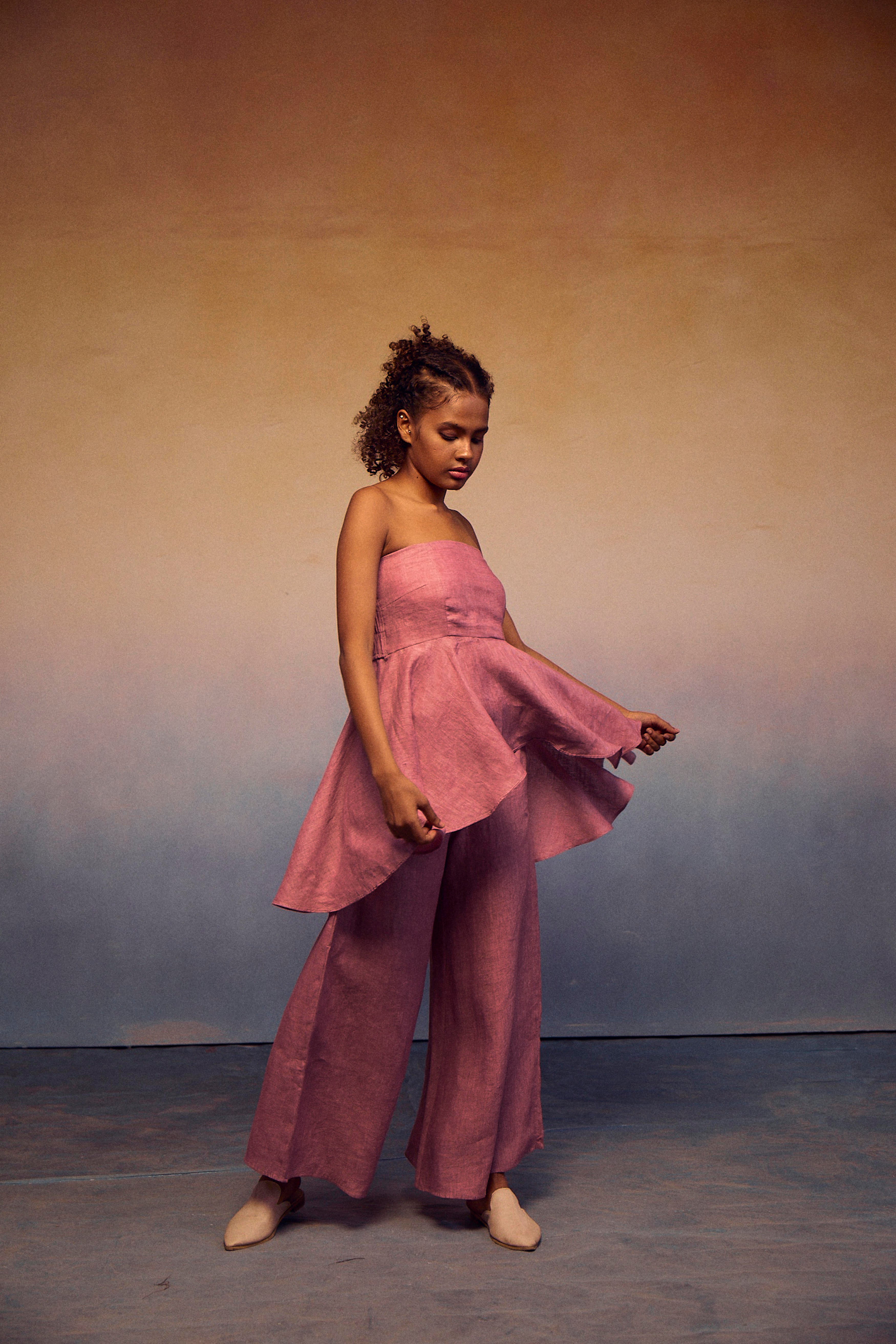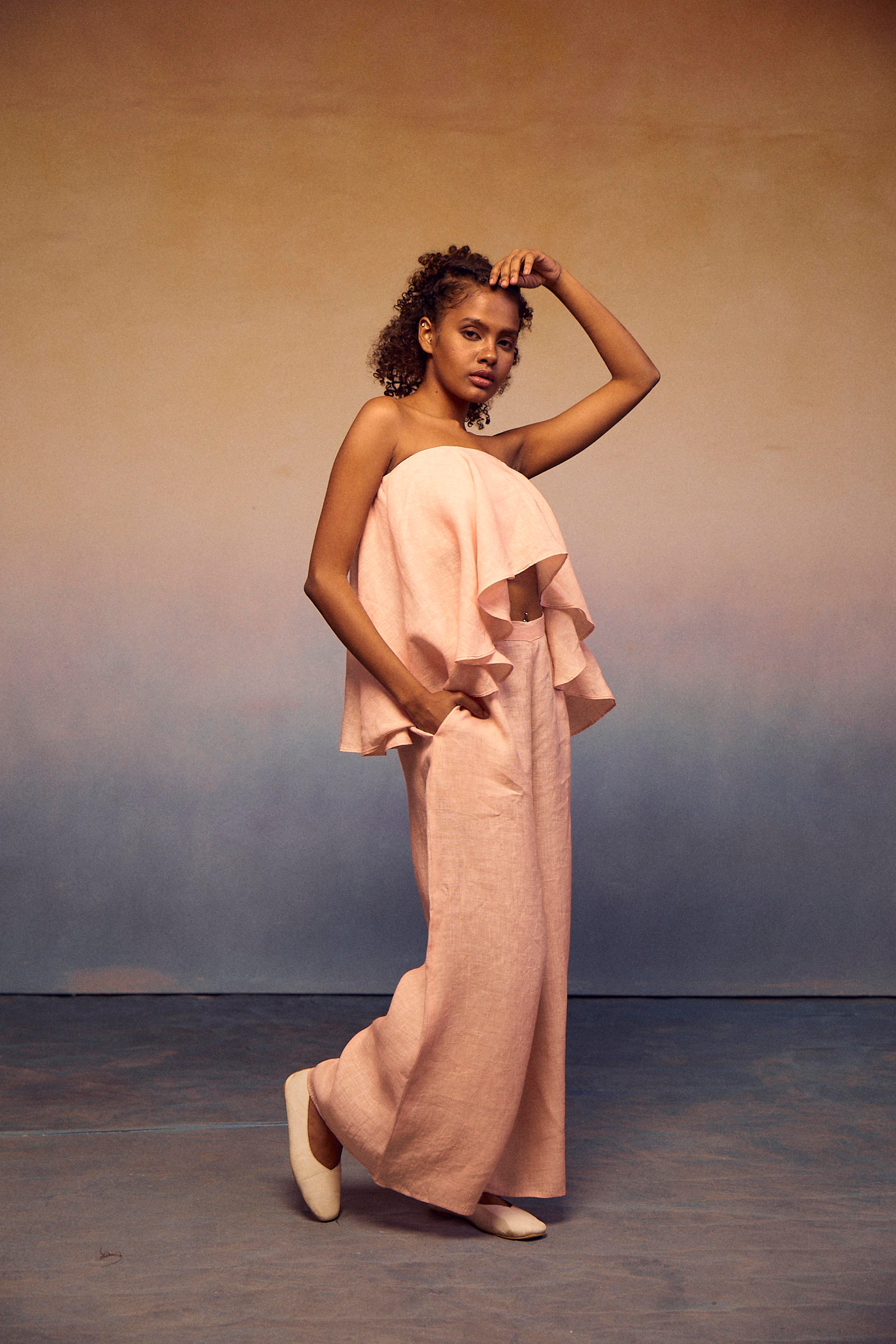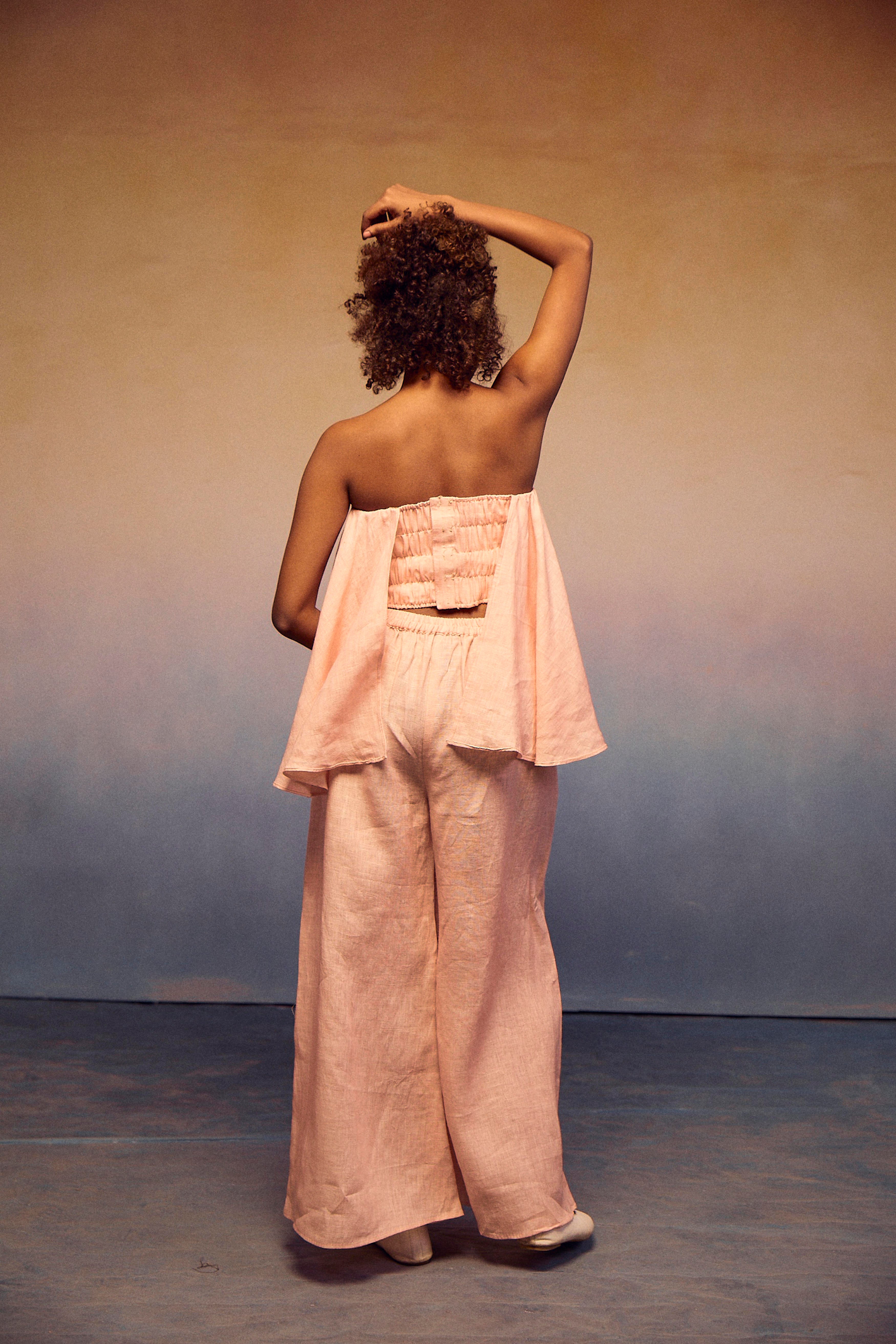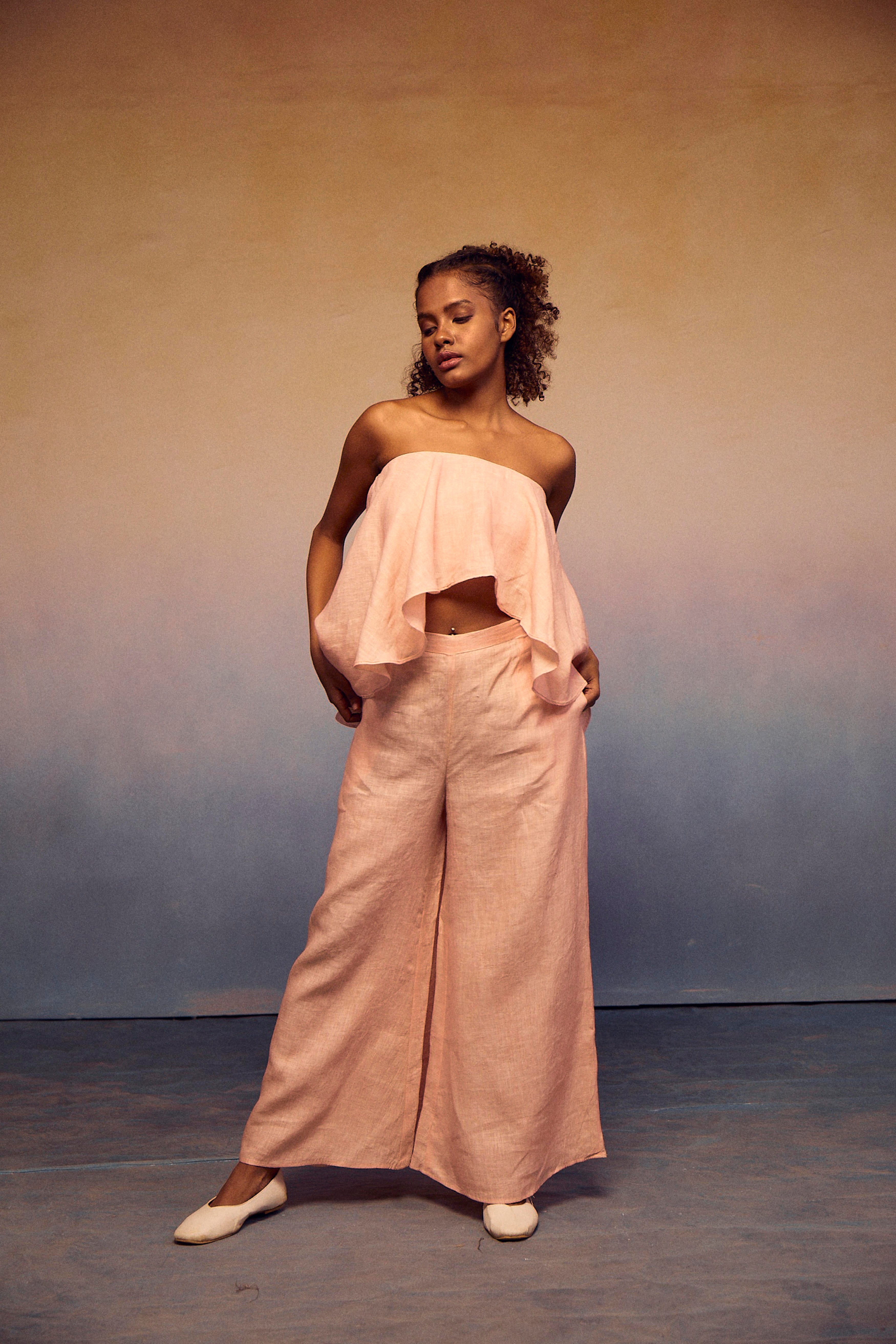 The epitome of style and comfort in our chic teasing coords set. The elastic tube top, featuring a fashionable front peplum, ensures exceptional comfort and breathability. Paired effortlessly with our pondi pants, this ensemble embodies a complete look that radiates sophistication and ease.