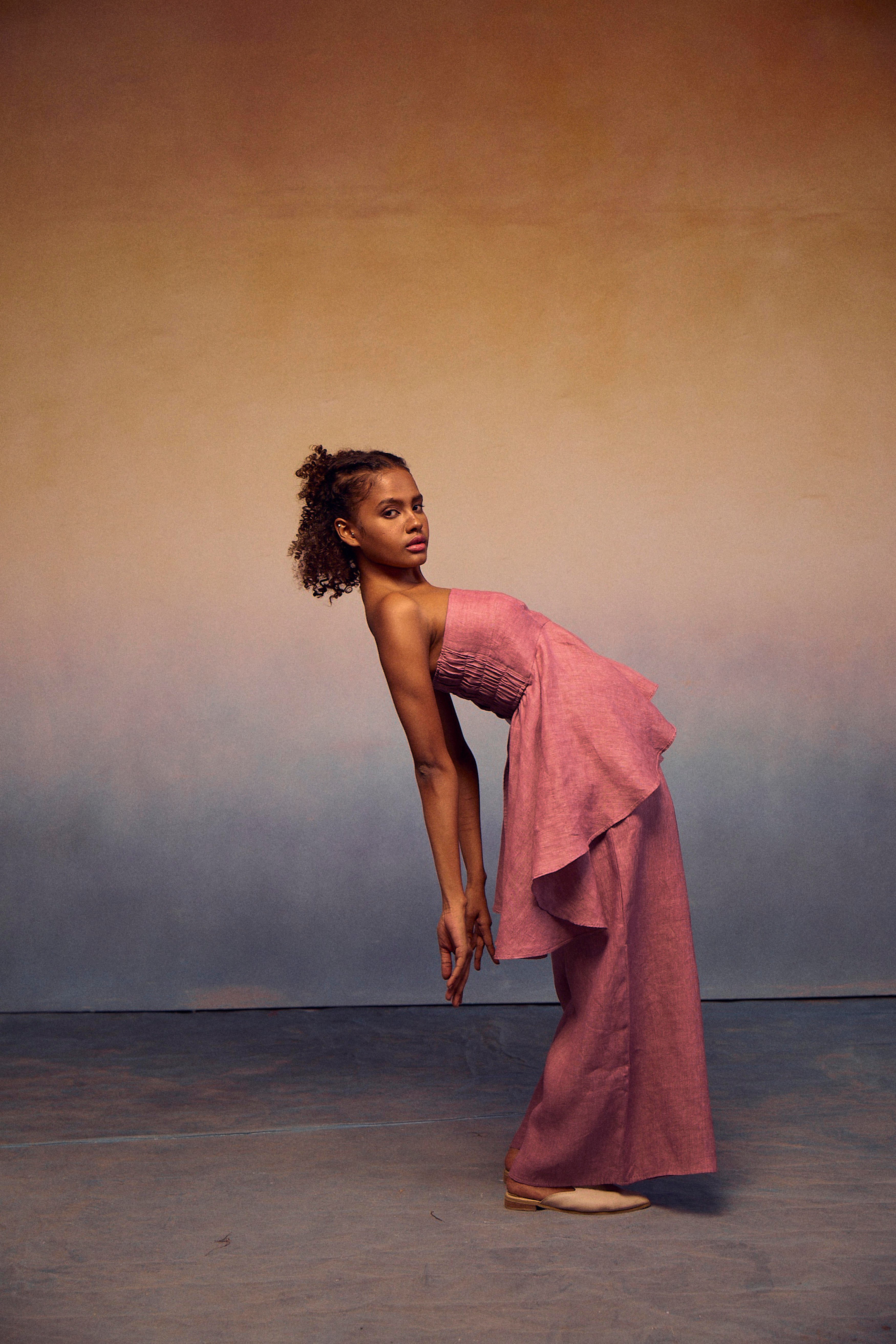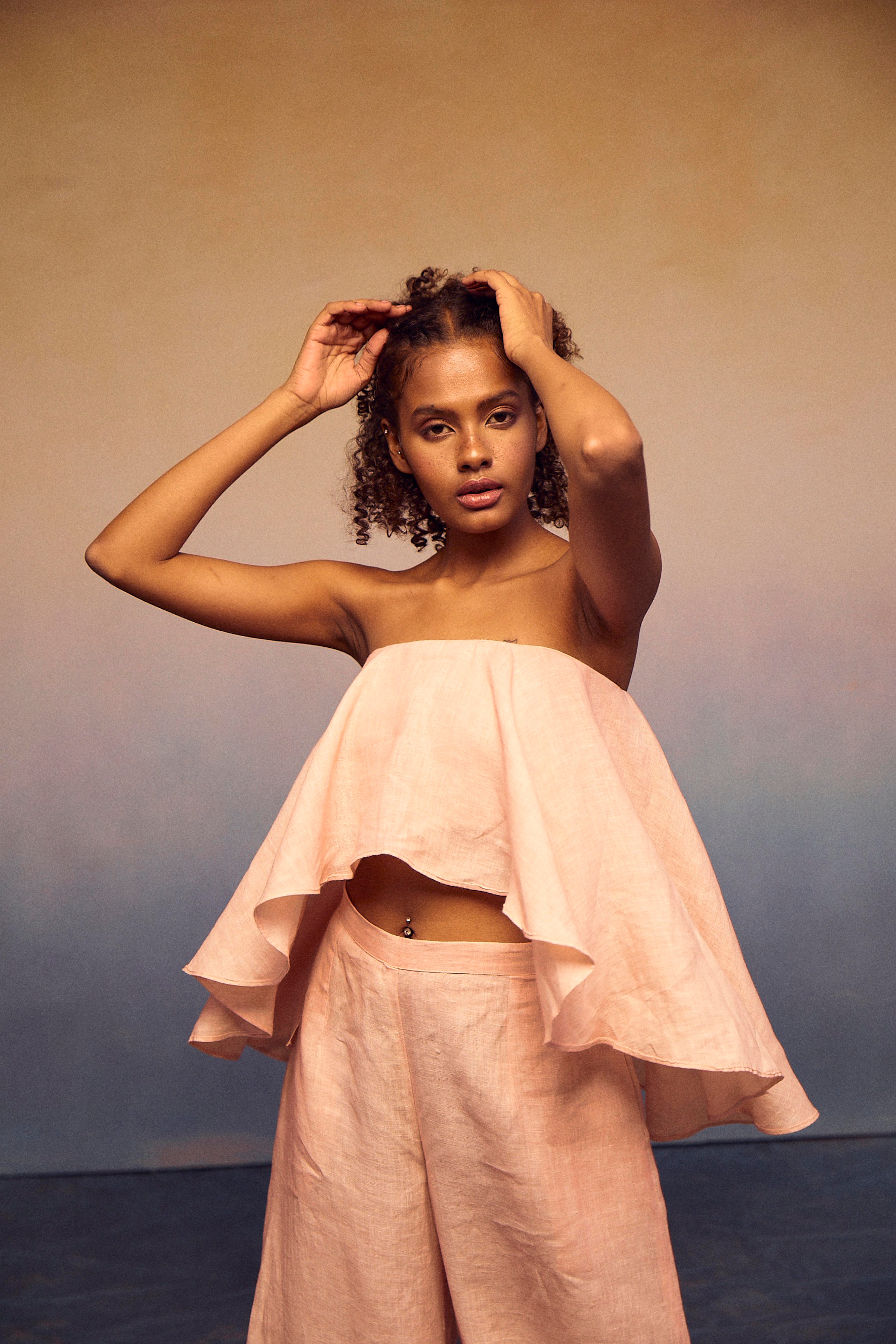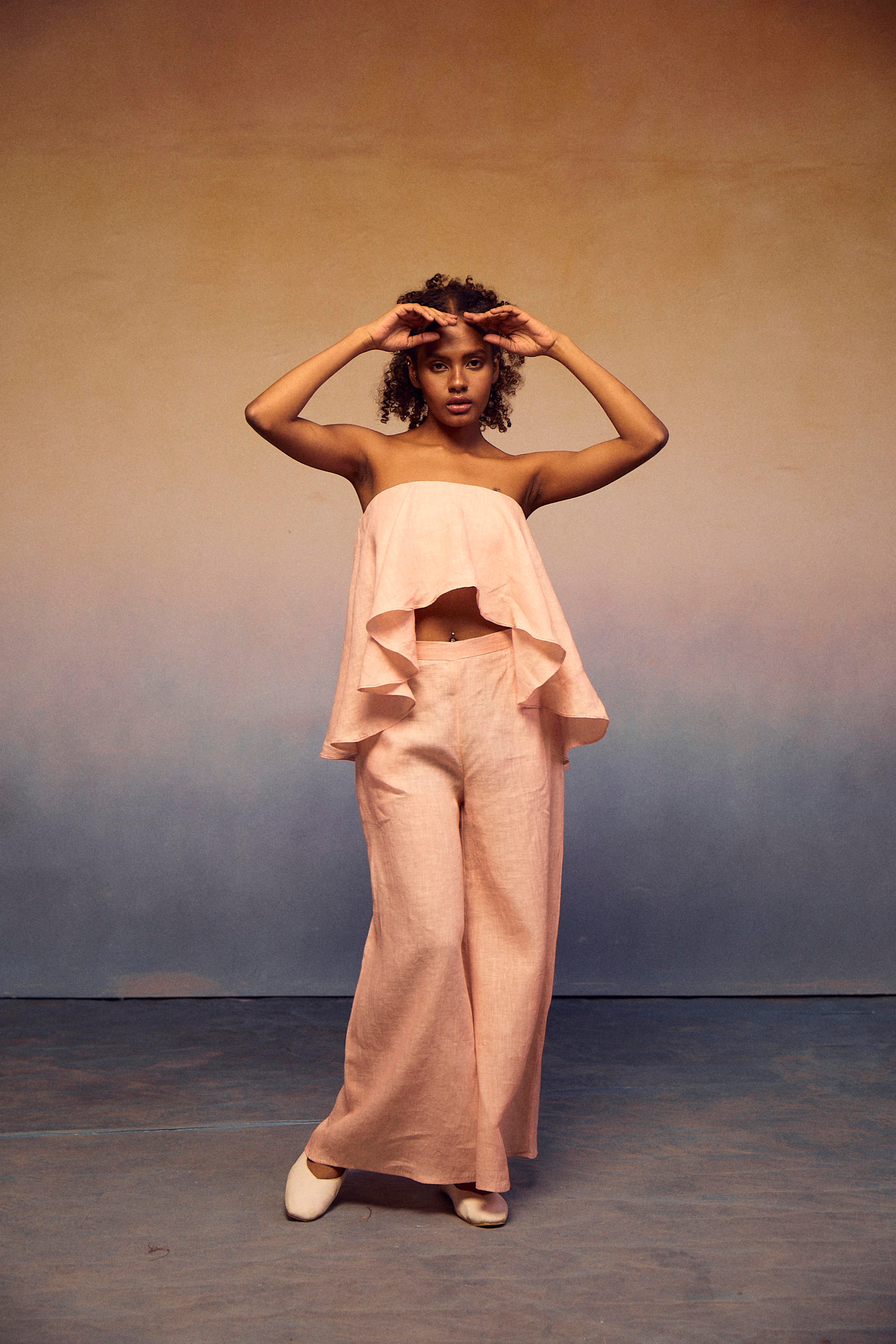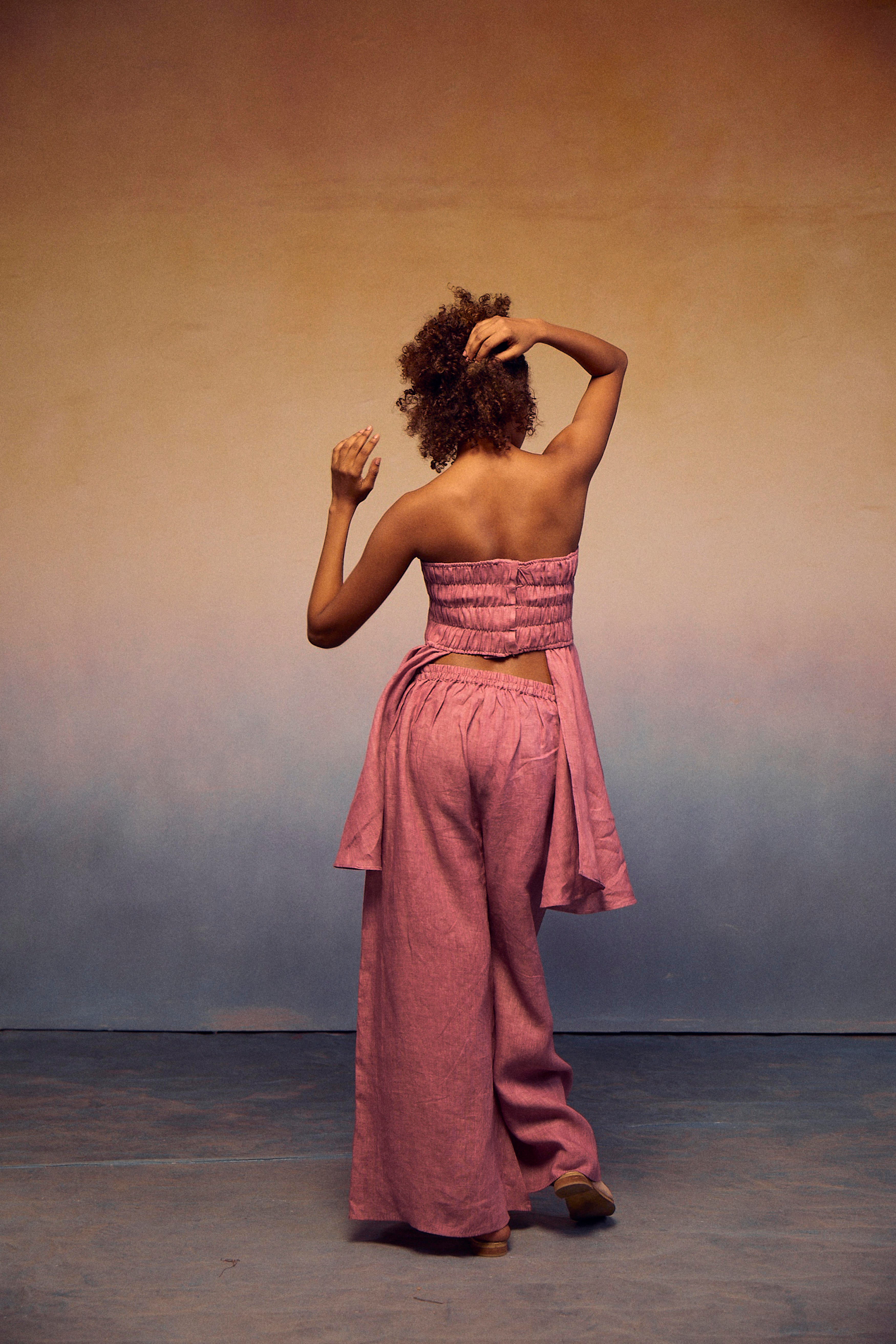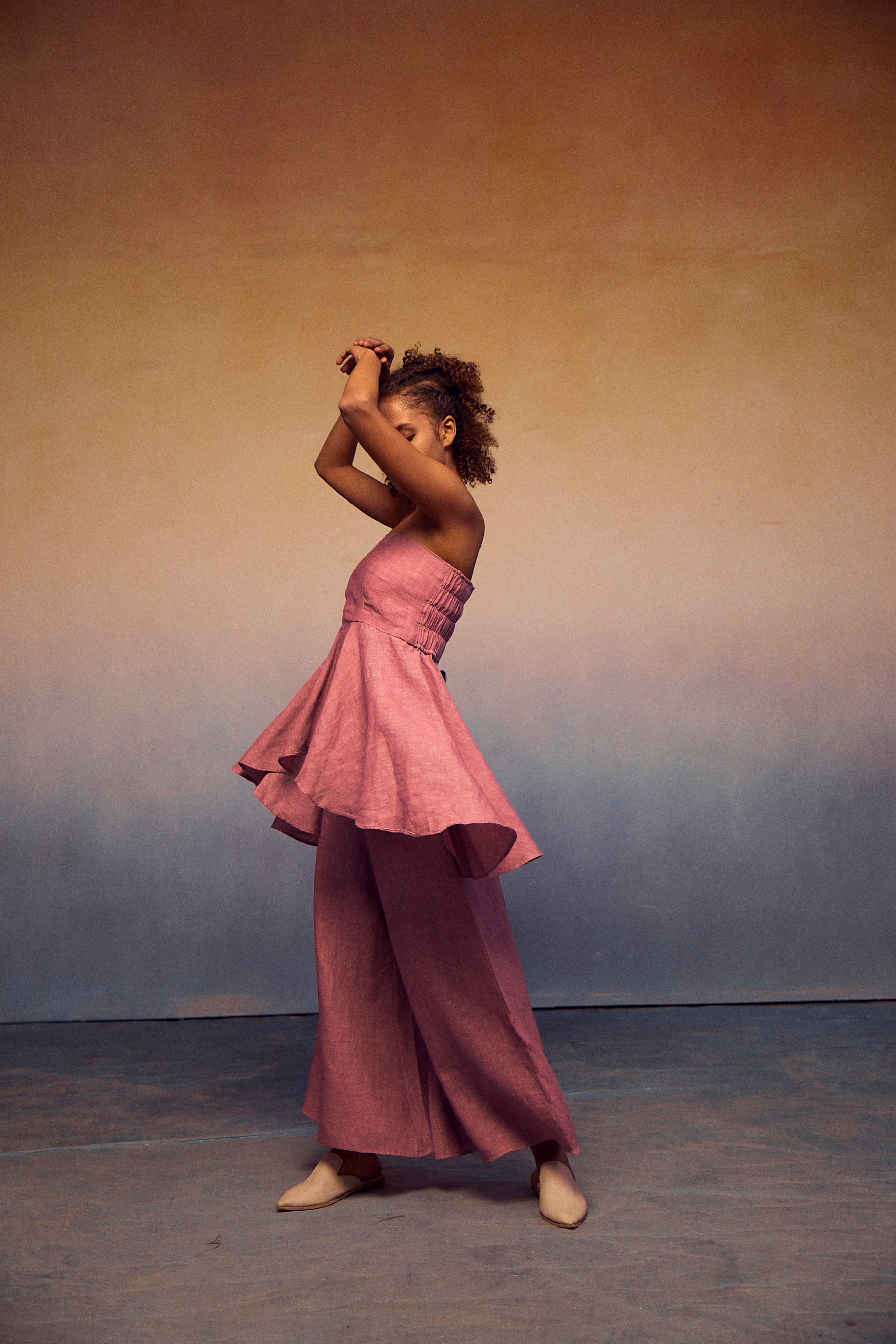 The epitome of style and comfort in our chic teasing coords set. The elastic tube top, featuring a fashionable front peplum, ensures exceptional comfort and breathability. Paired effortlessly with our pondi pants, this ensemble embodies a complete look that radiates sophistication and ease.
