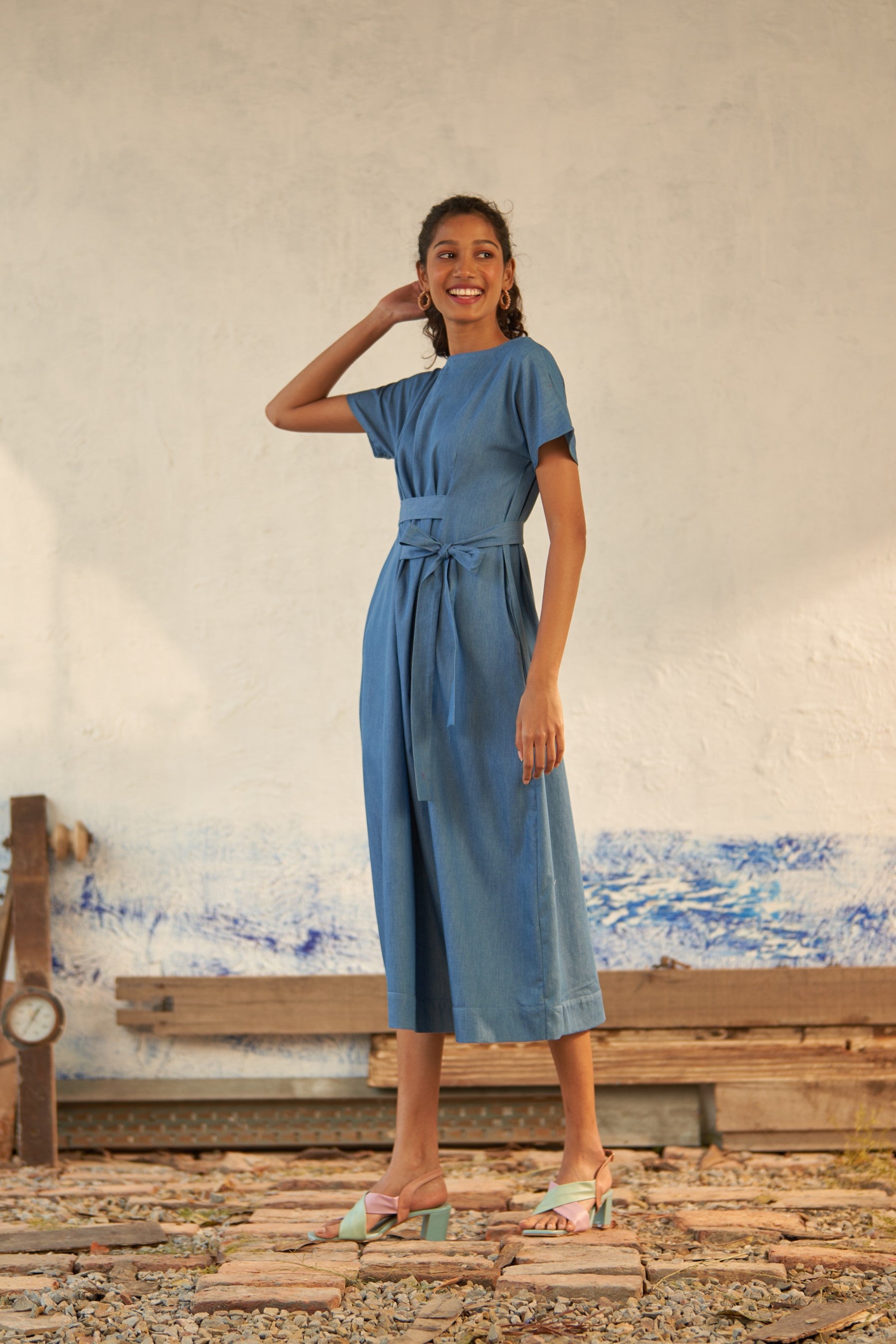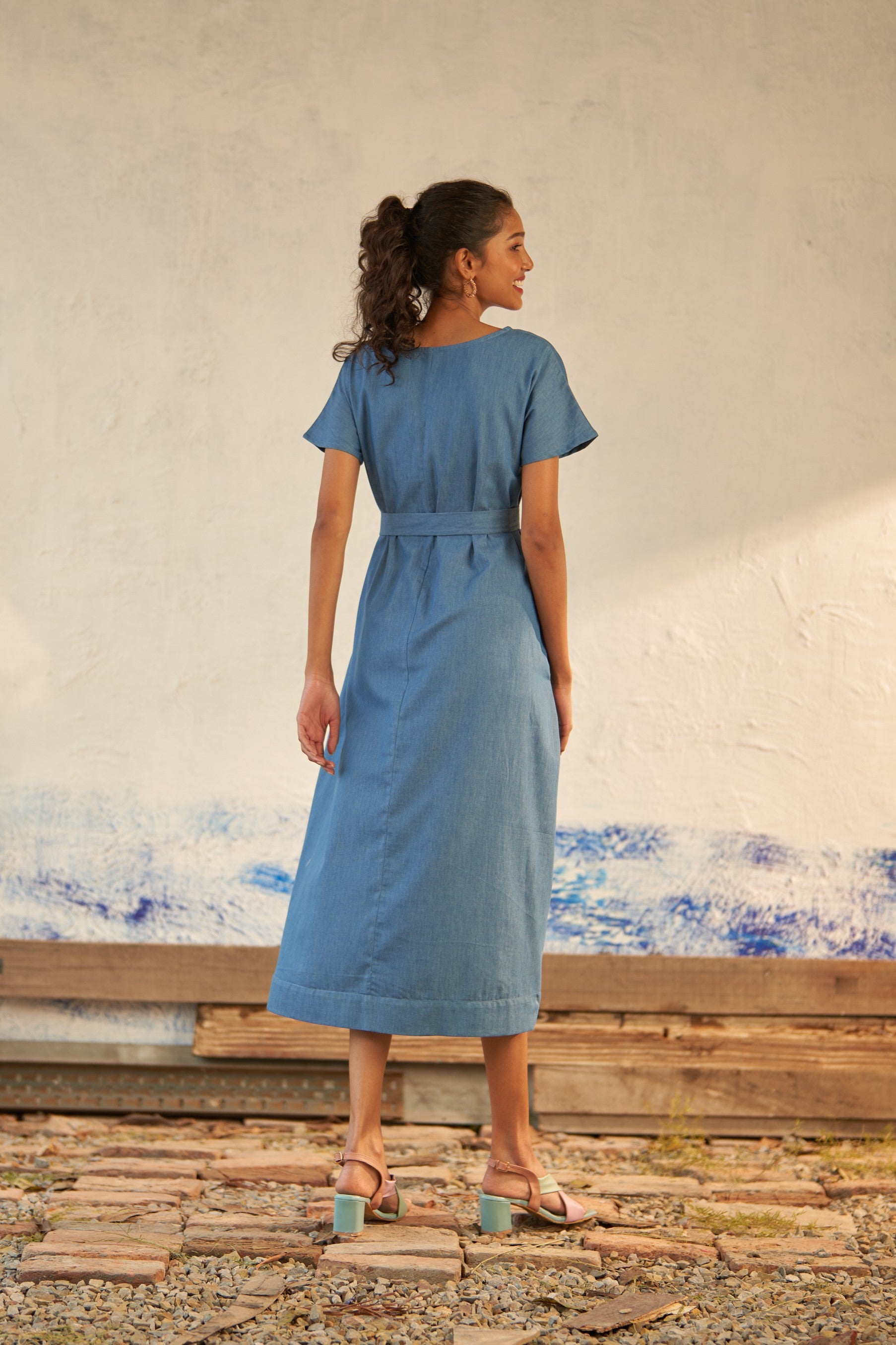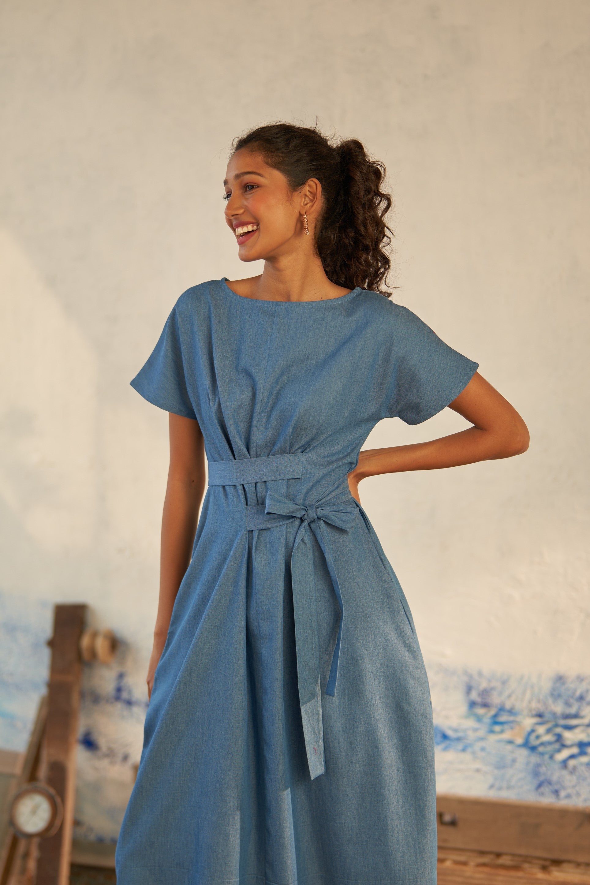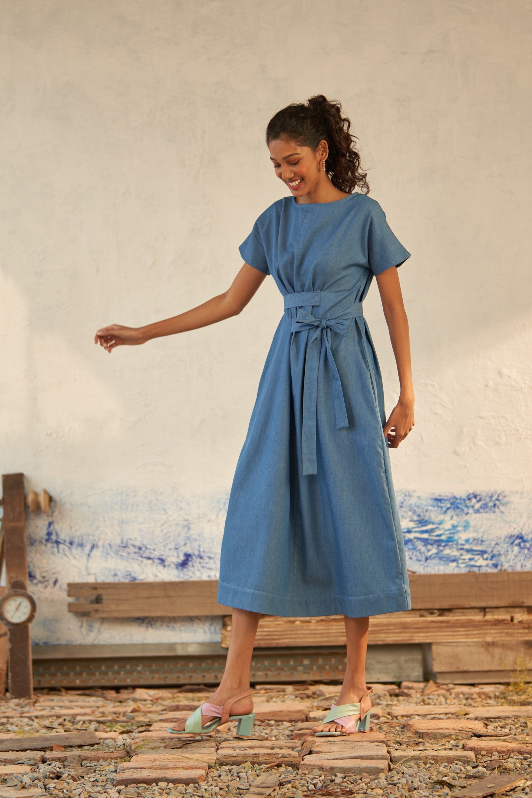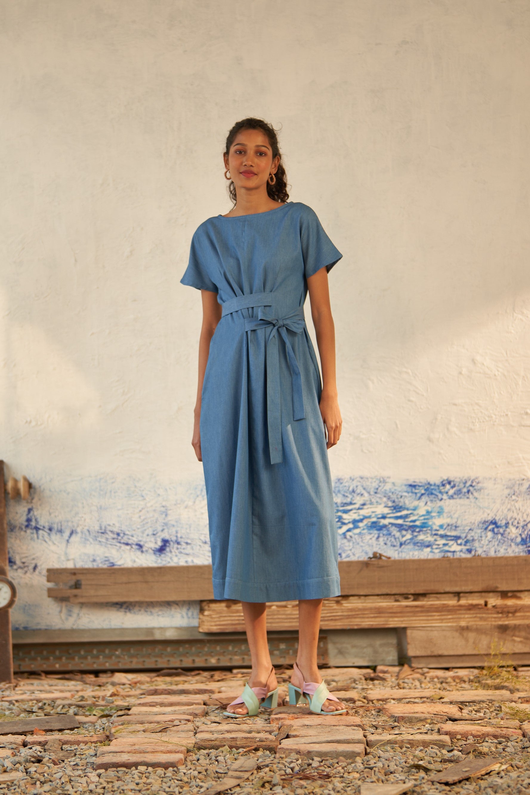 This whimsical double-belted dress exudes elegance and femininity. Designed to gently drape over the body, it emphasizes the waist and enhances the wearer's silhouette. Crafted from soft denim fabric, it features a charming U-shaped neckline and a distinctive double-belted waistline. Versatile and chic, this dress effortlessly transitions from casual to formal occasions.