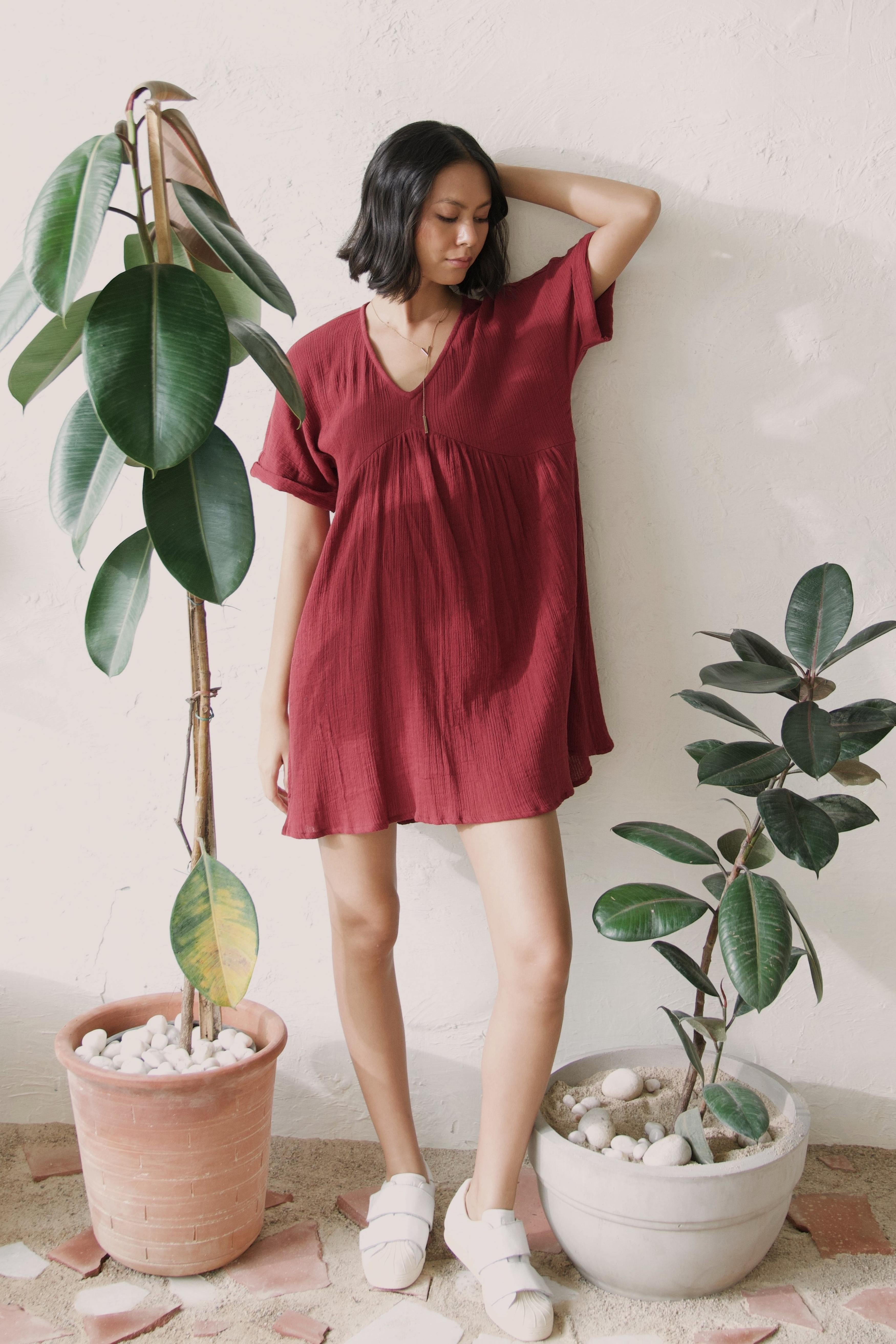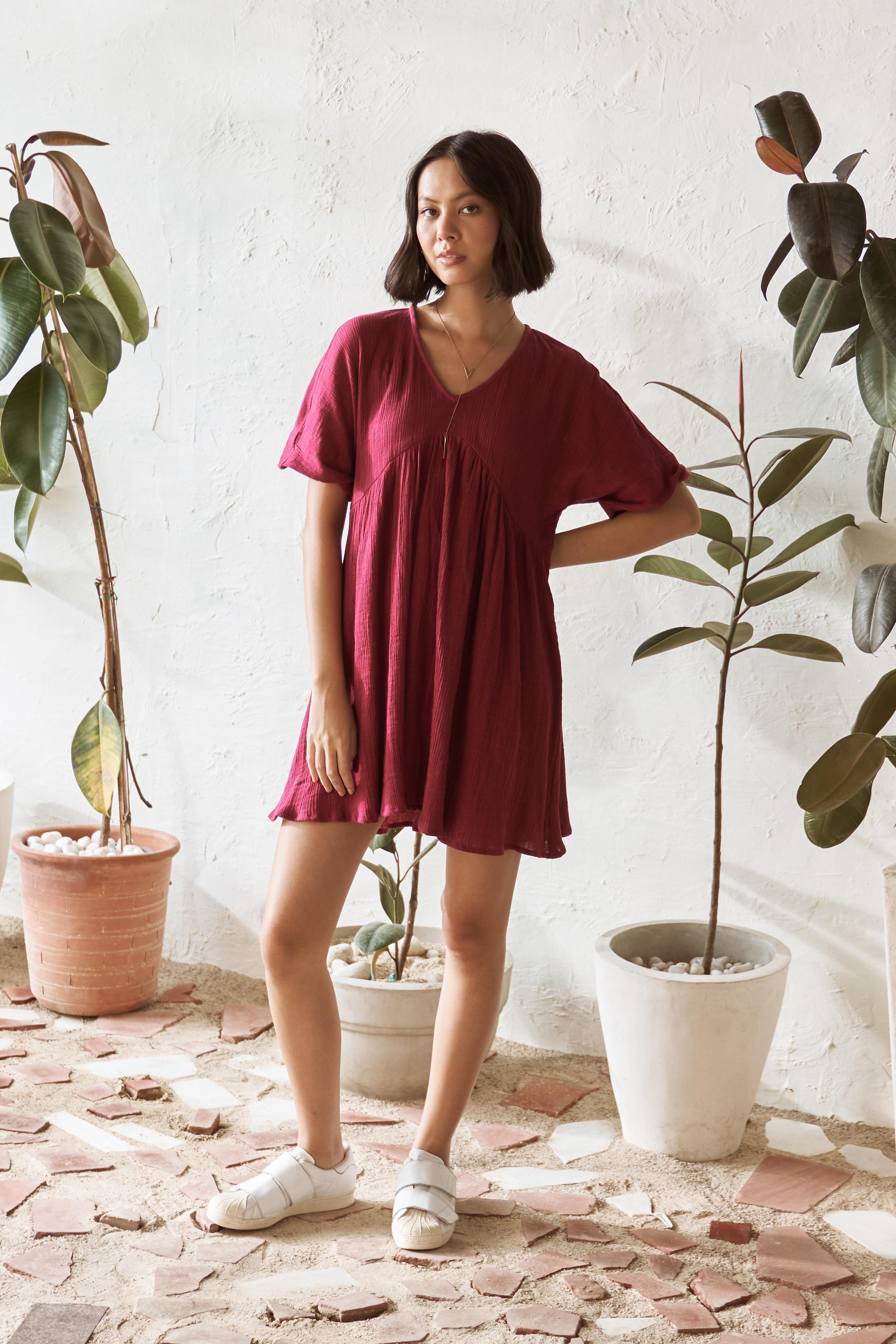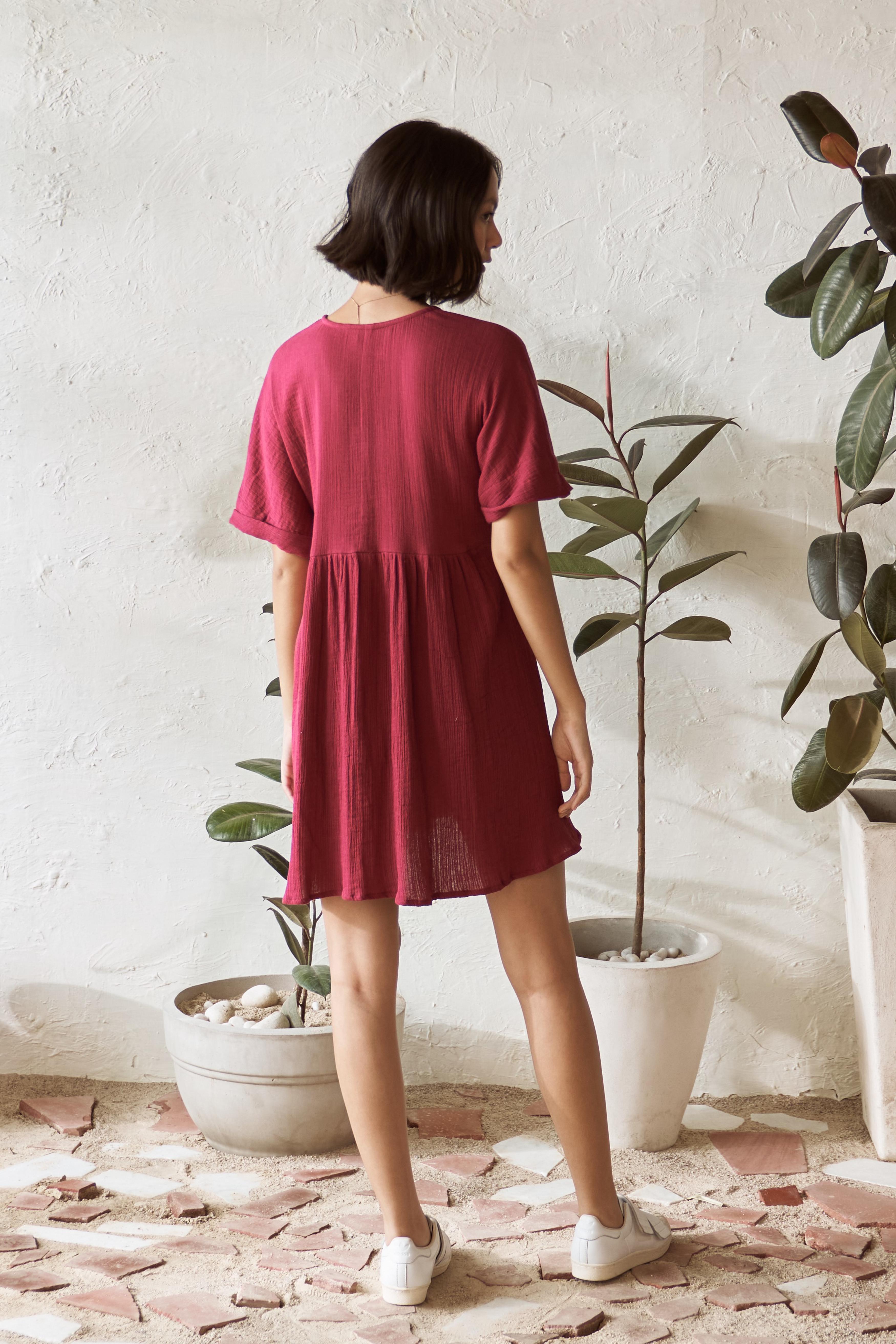 This short dress offers an easy-breezy fit, making it perfect for days when you want to look put-together with minimal effort. Just slip it on, and you're ready to go, whether you're running errands or enjoying a casual day out. Designed for comfort and style, the simple yet smart design of this dress makes it a must-have wardrobe staple. Embrace the combination of comfort and chic with the Canoopi Crimson Dress, perfect for everyday explorations.