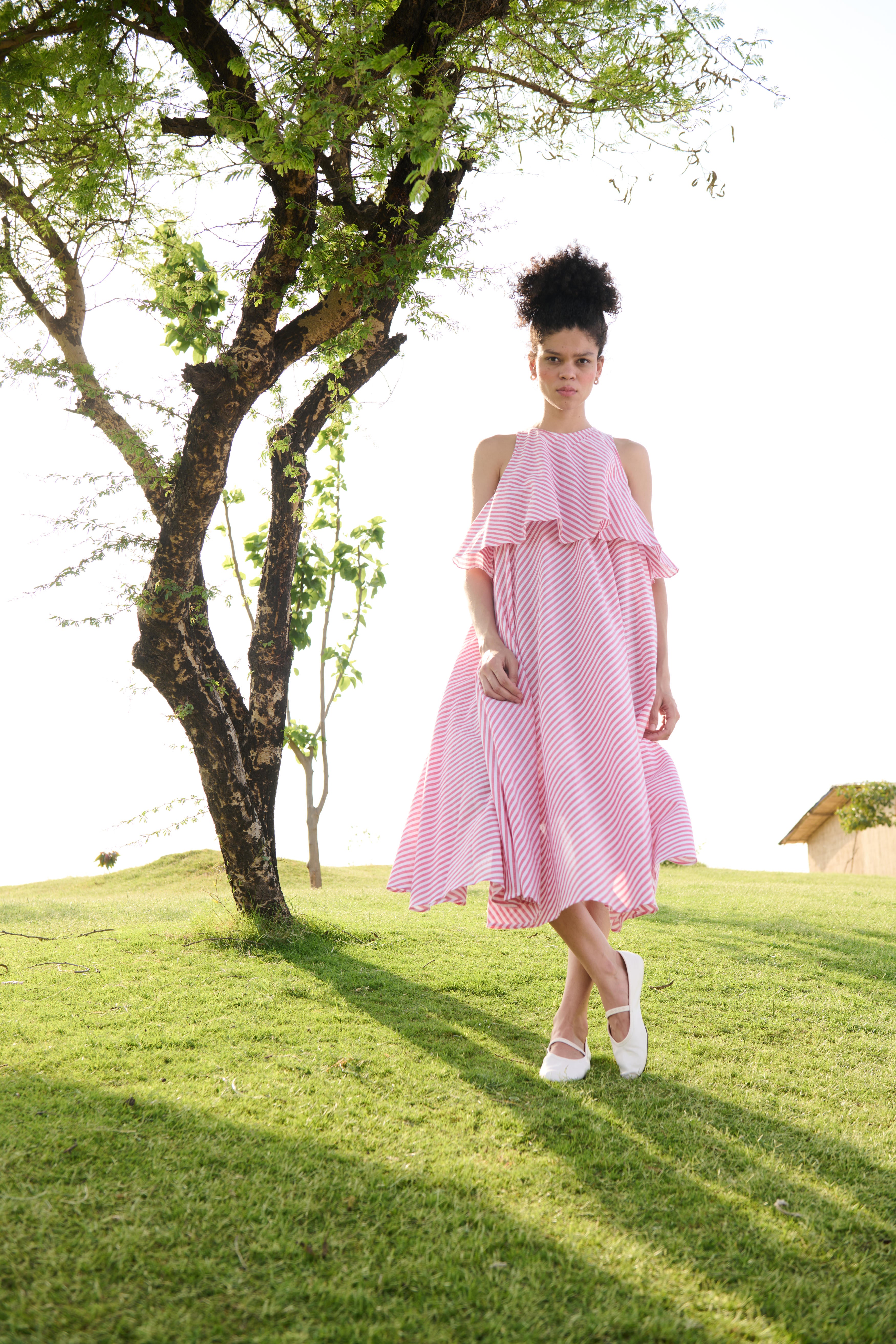 The camellia dress is crafted with cotton fabric with a layered panel to give an extra drape to the dress.