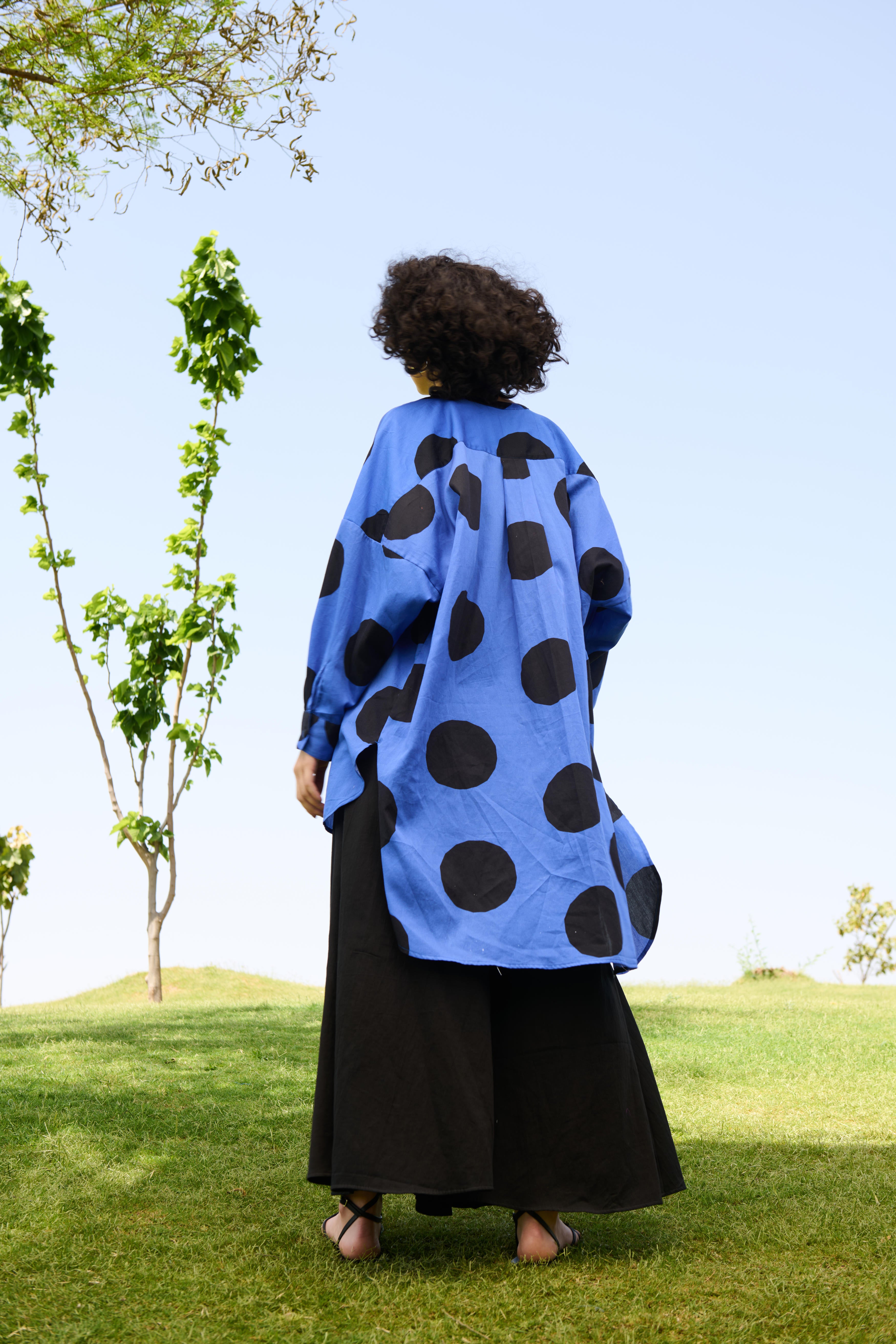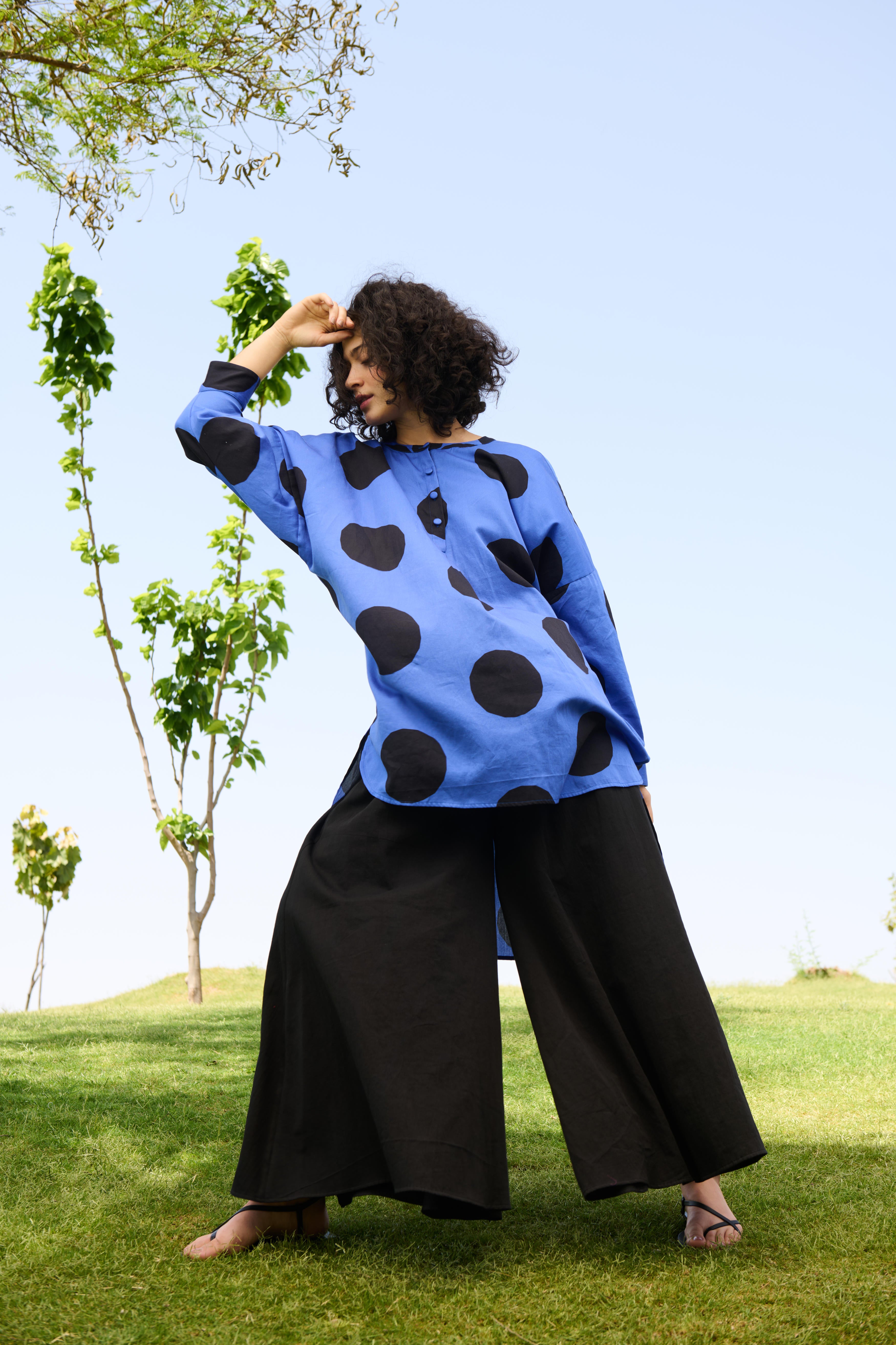 The coralbell coord set is crafted from our linen cotton loversized tunic in our small blue polka print paired with super comfortable flare pants.