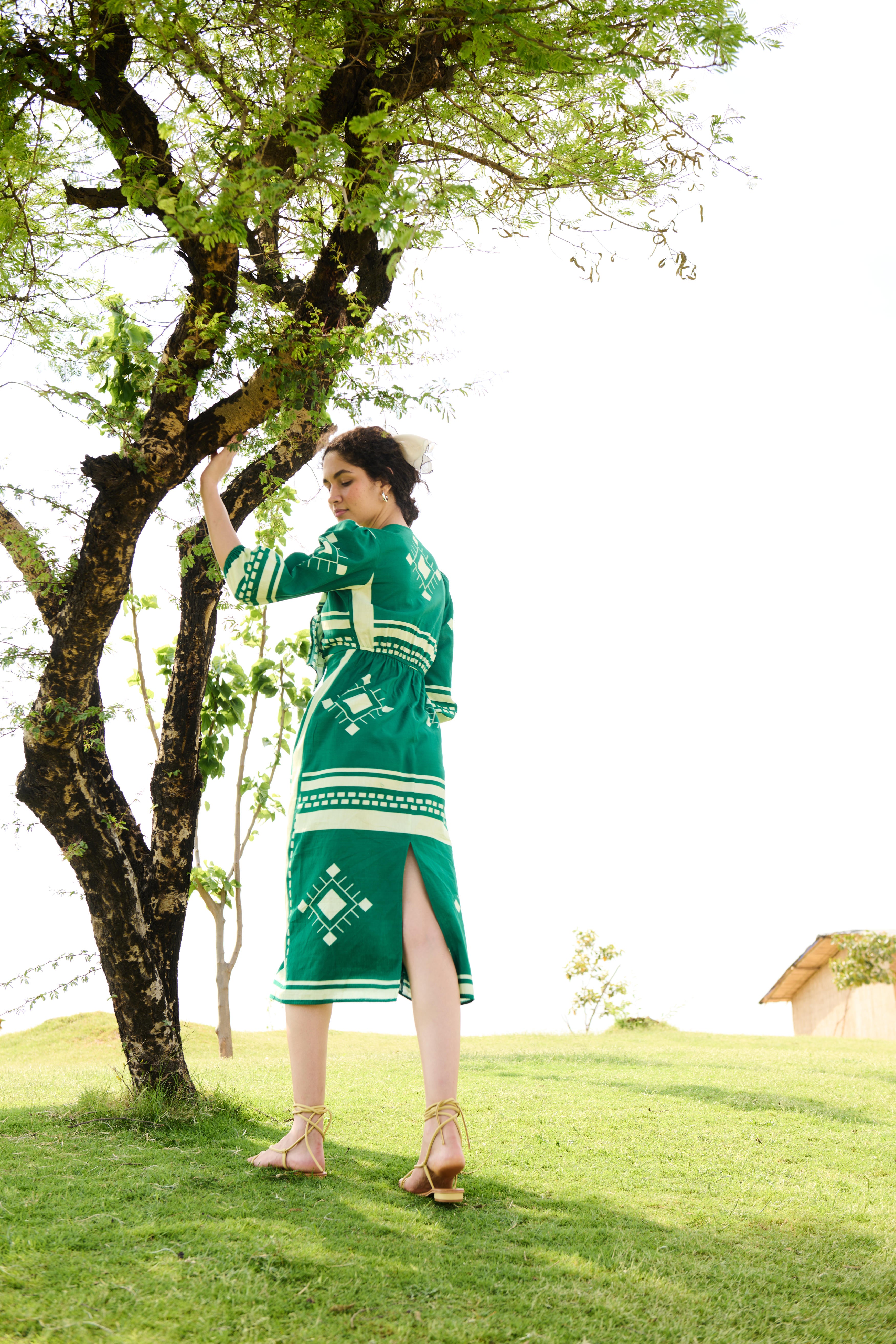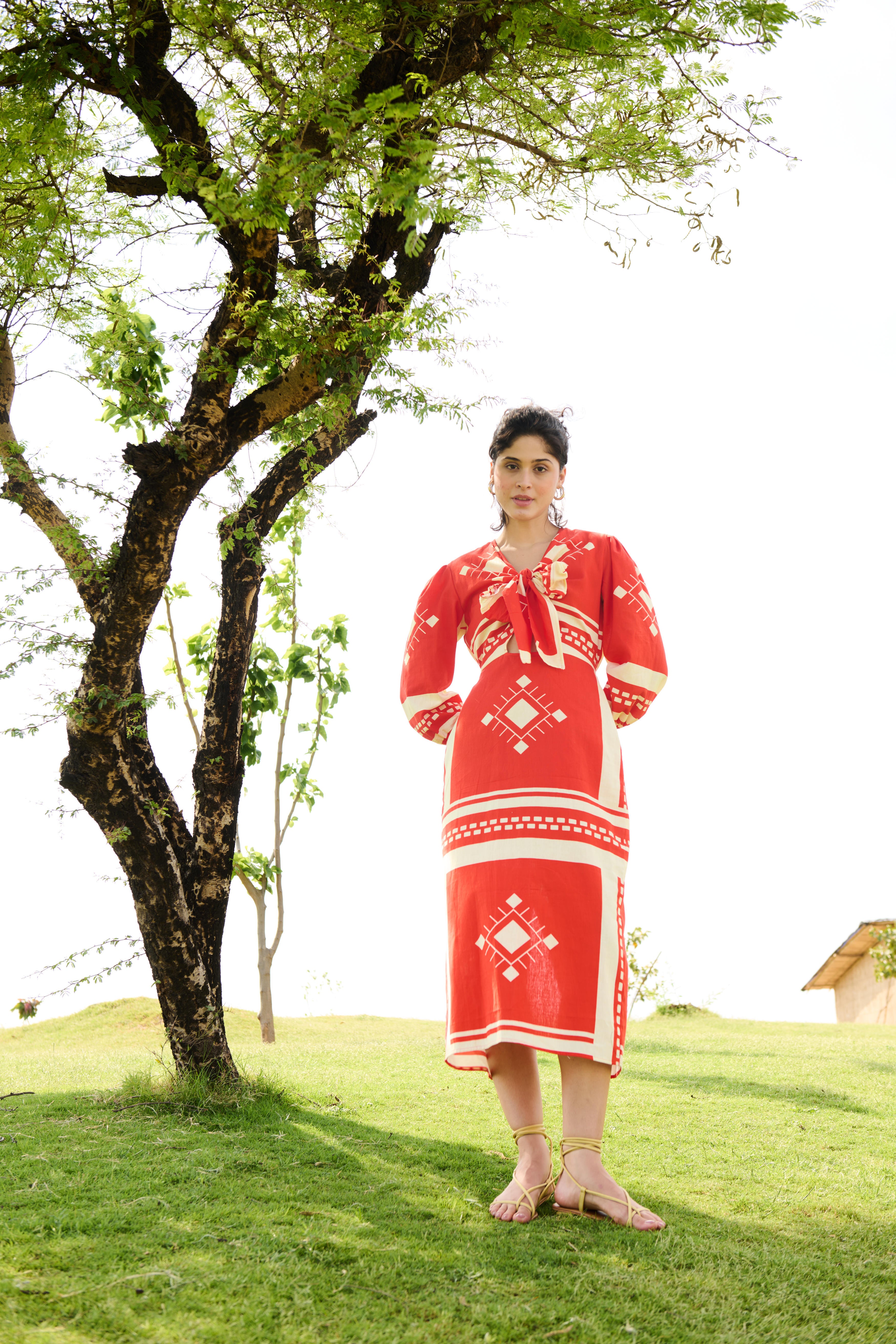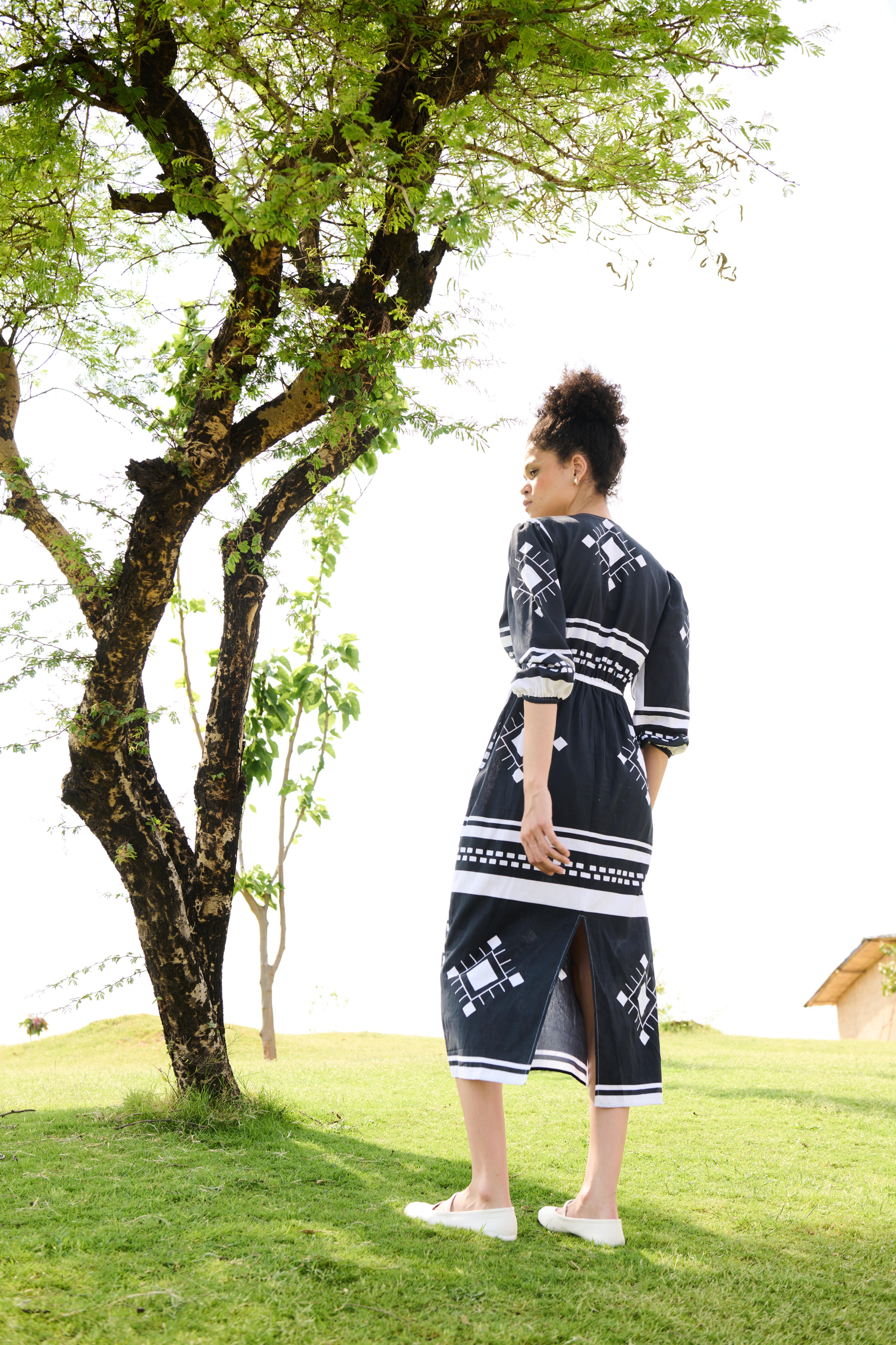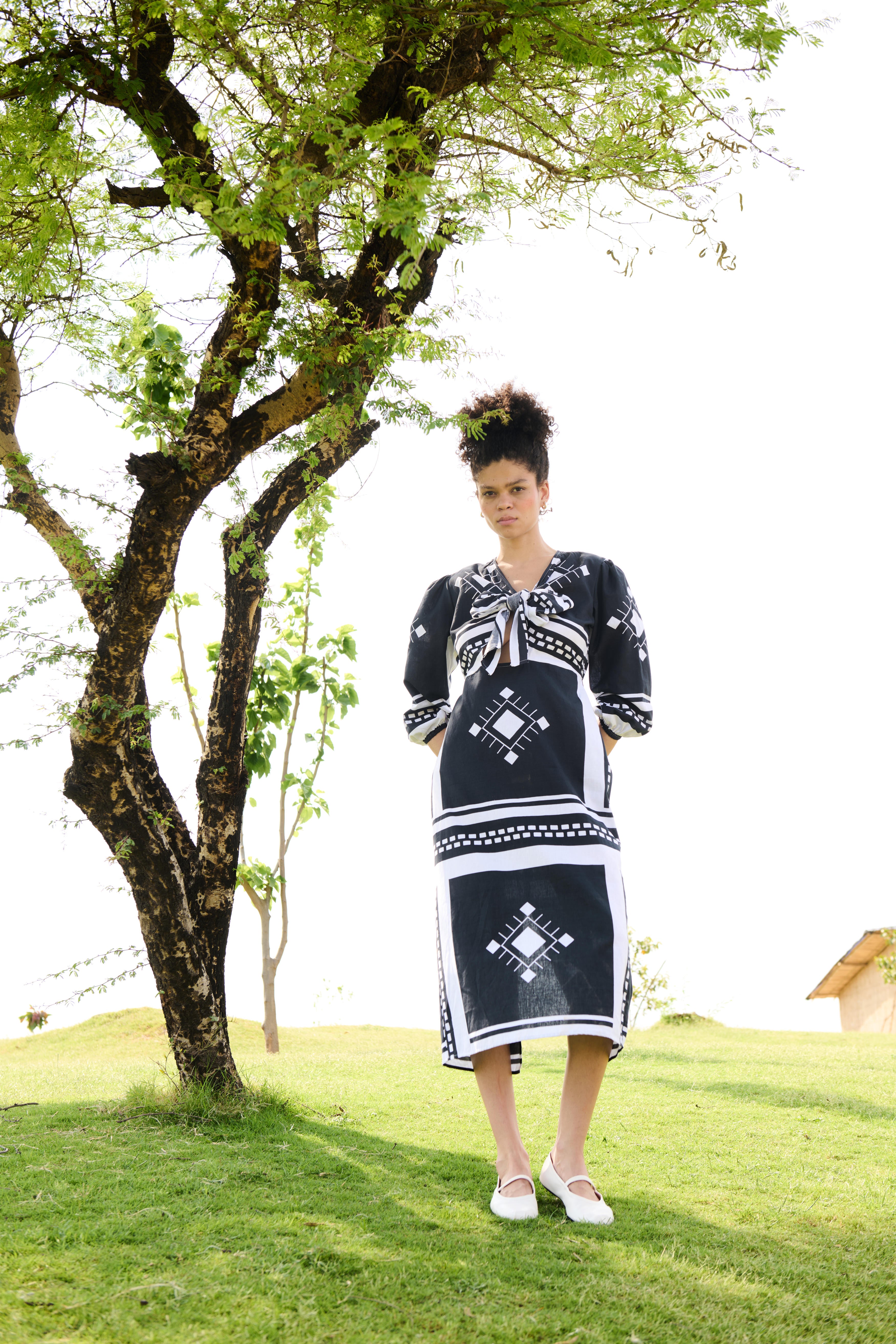 The Dahlia dress crafted with linen cotton fabric is a bodycon design with a knot at the high waist and a back slit.