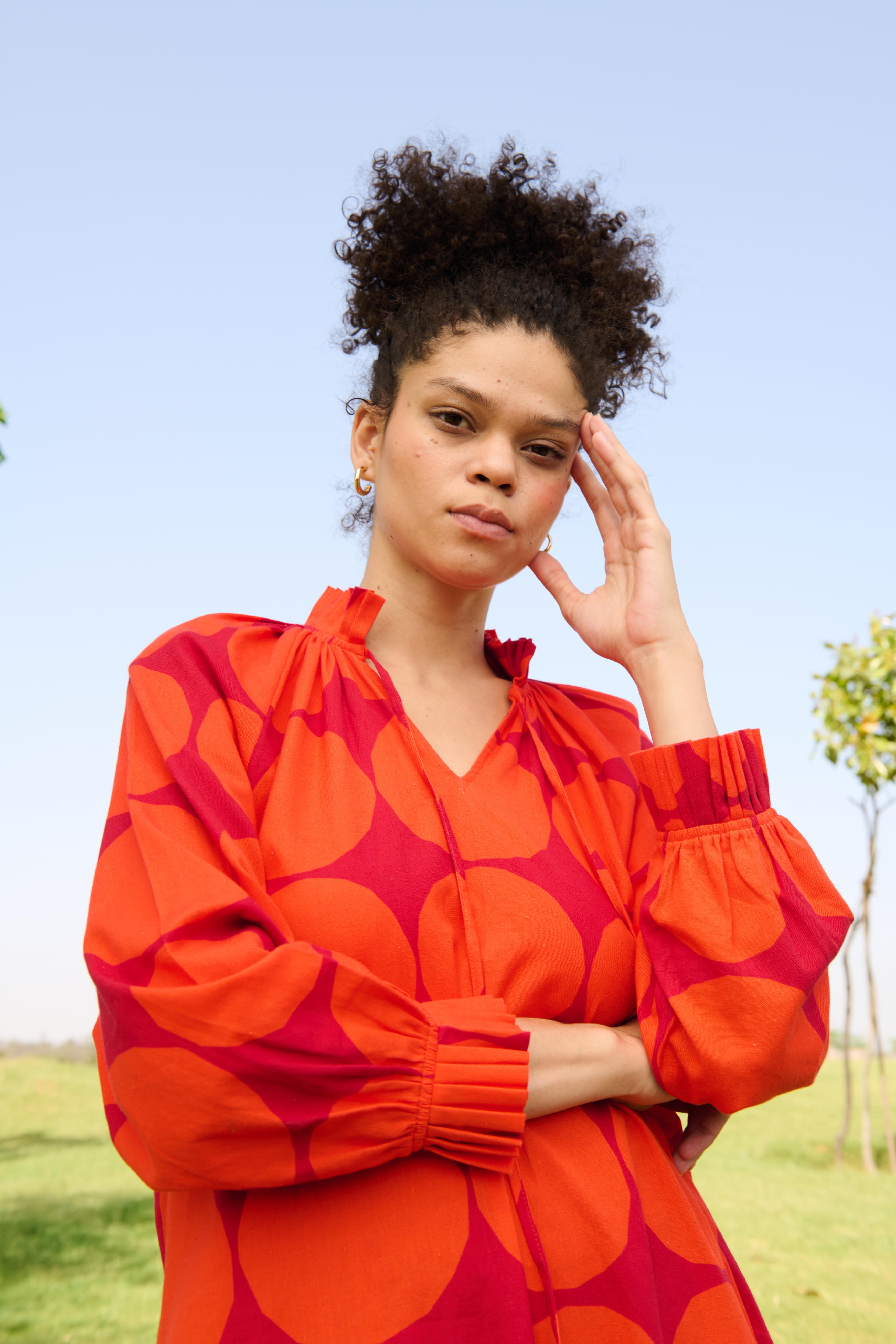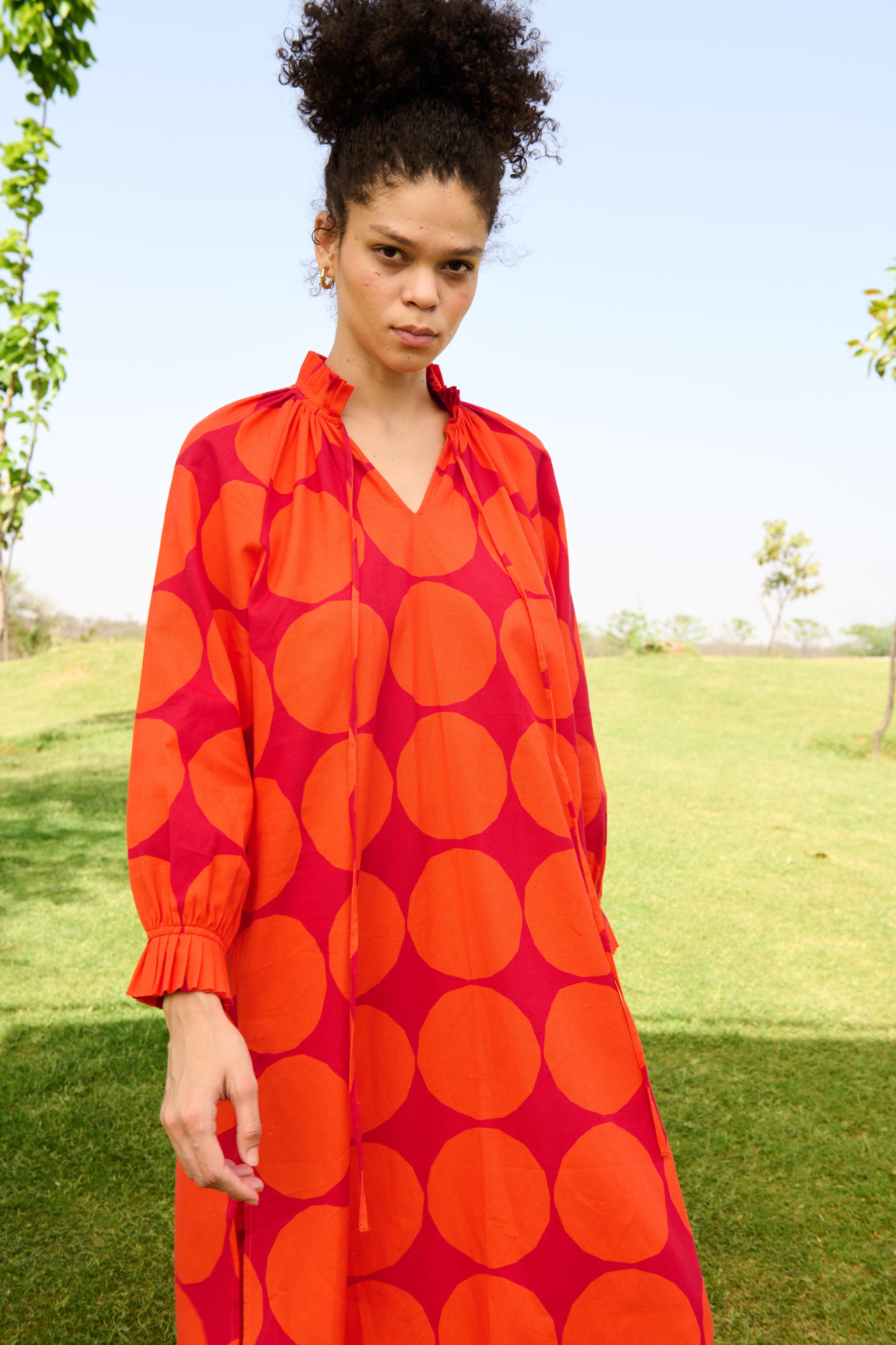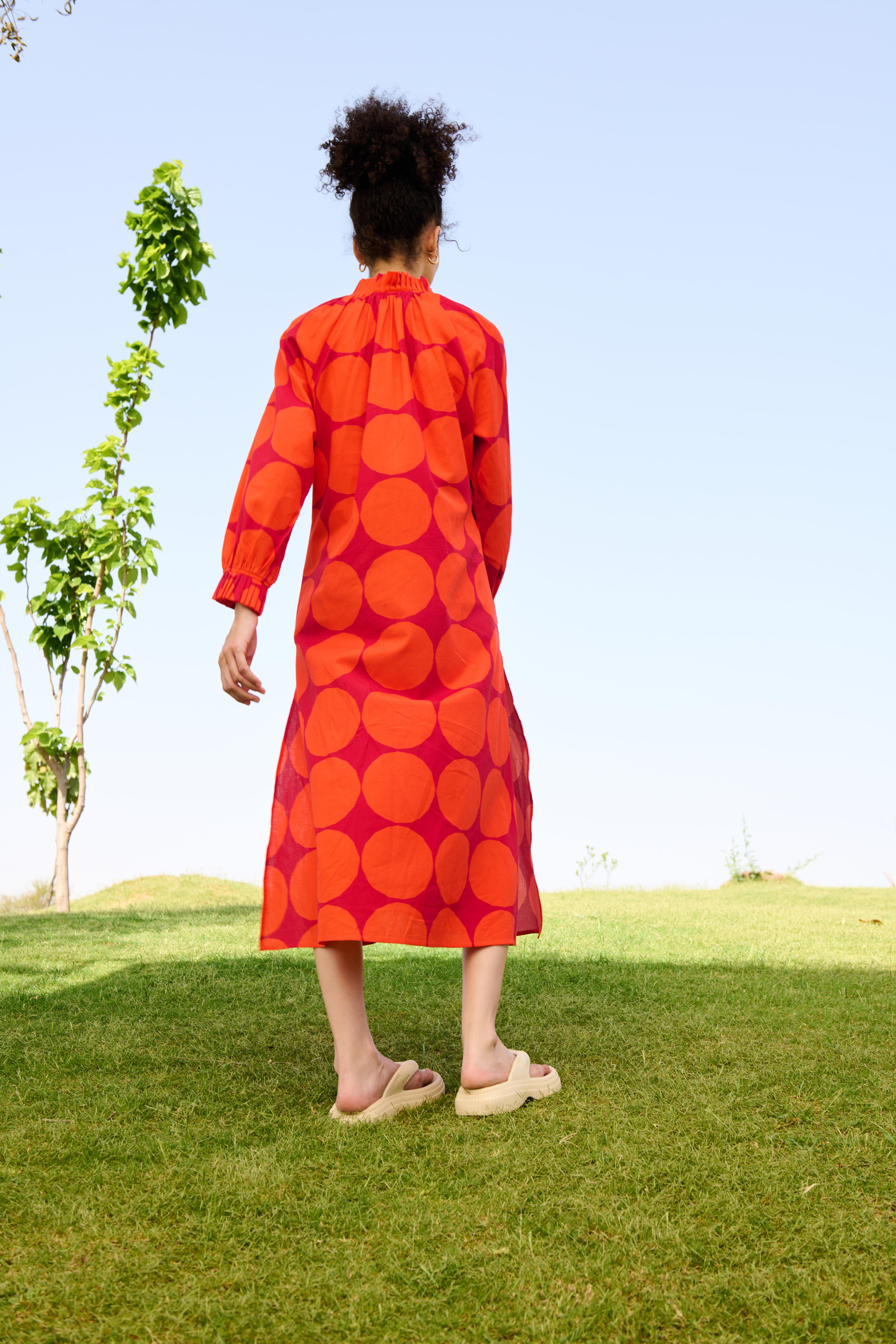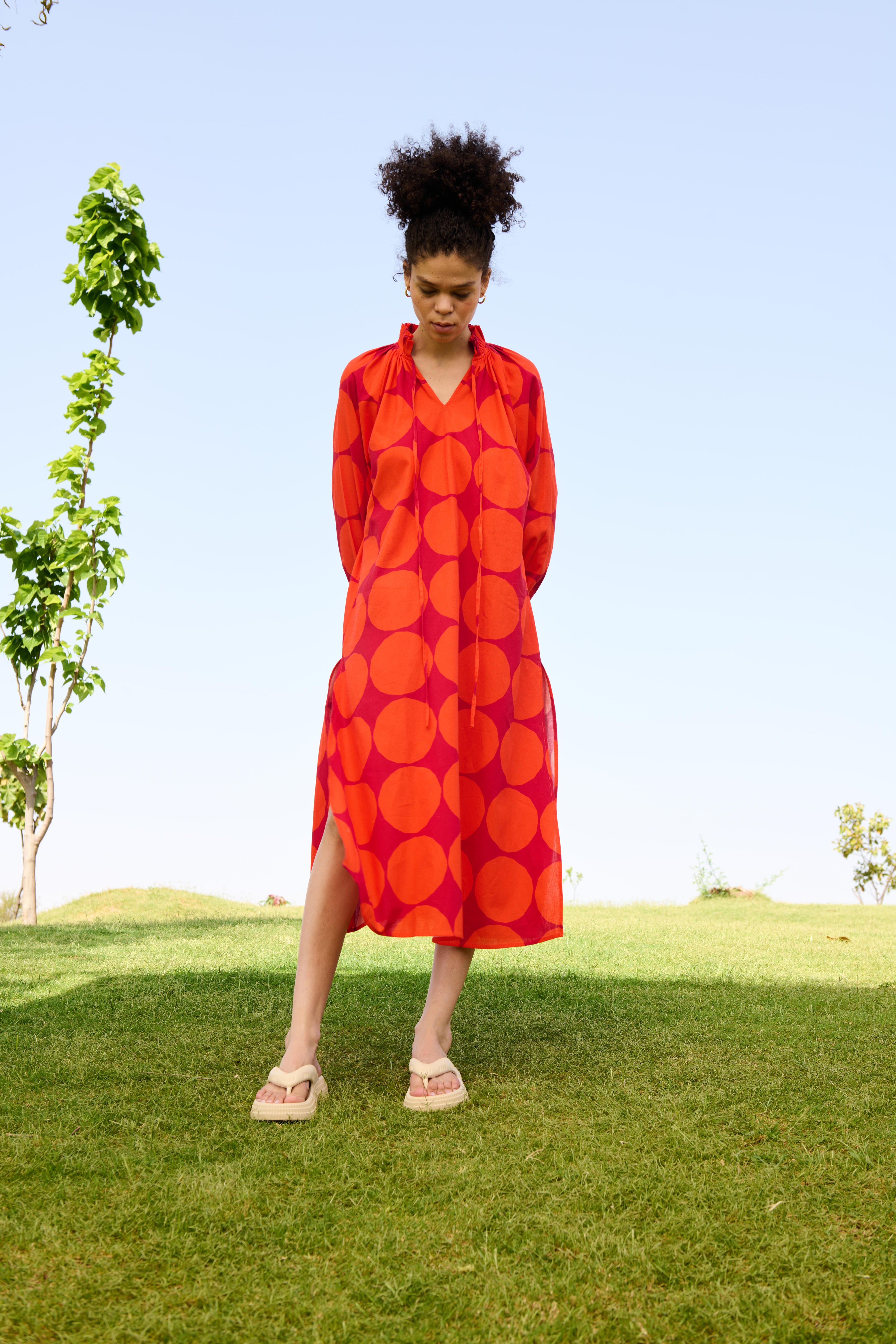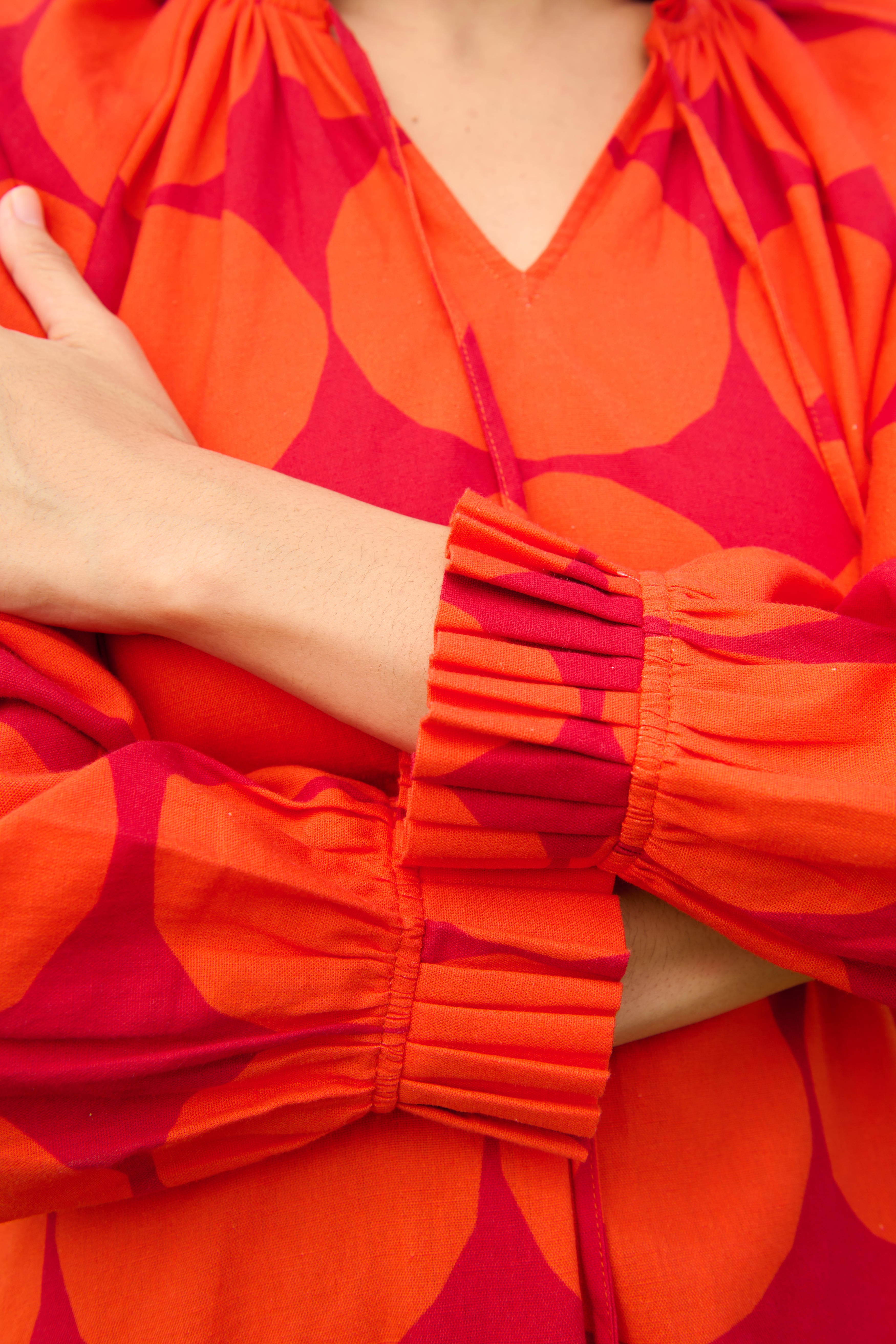 The Daisy Midi dress is crafted from our Linen cotton fabrication. It has pleat detailing in the neck & sleeves with both side slits.