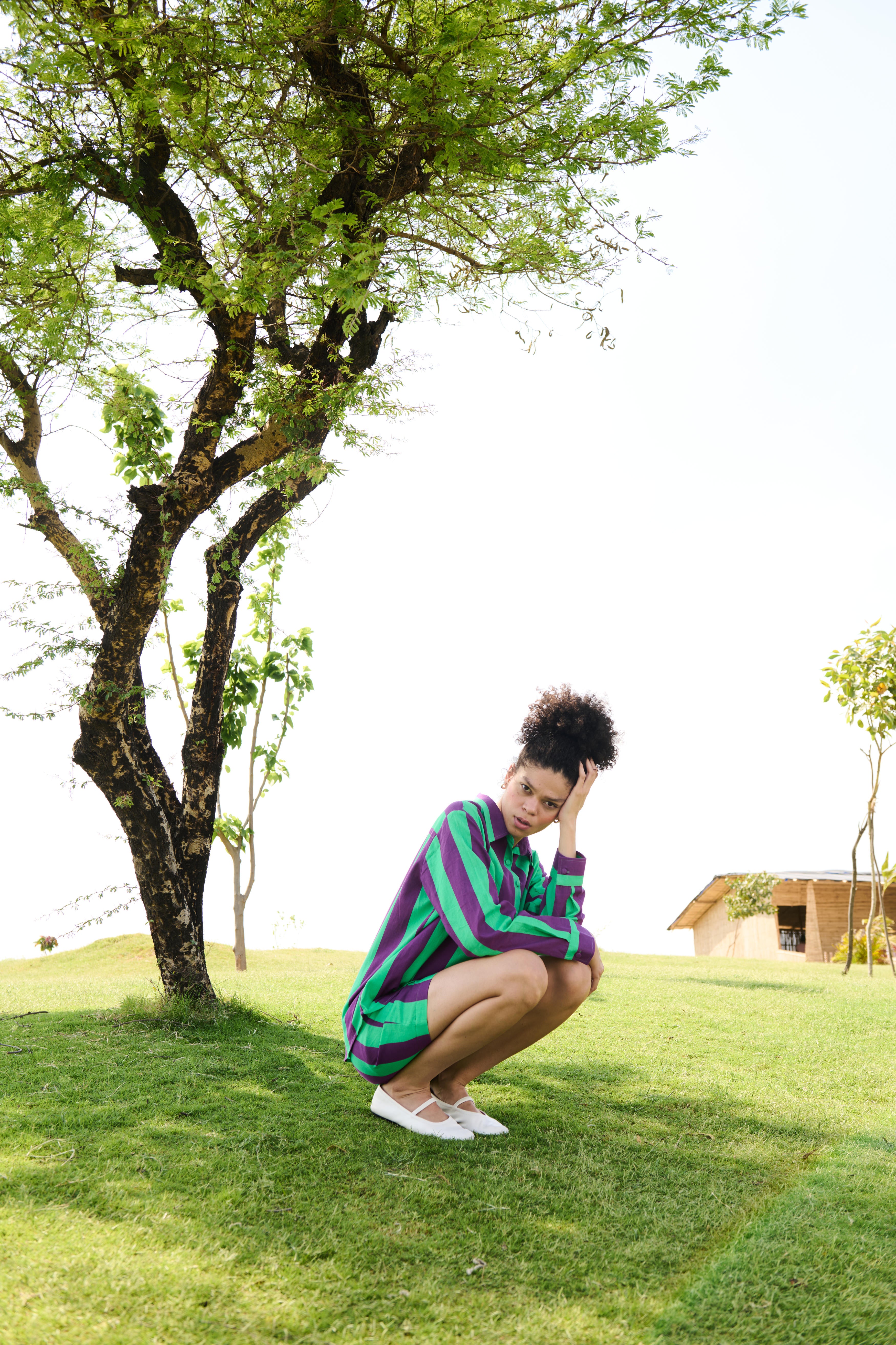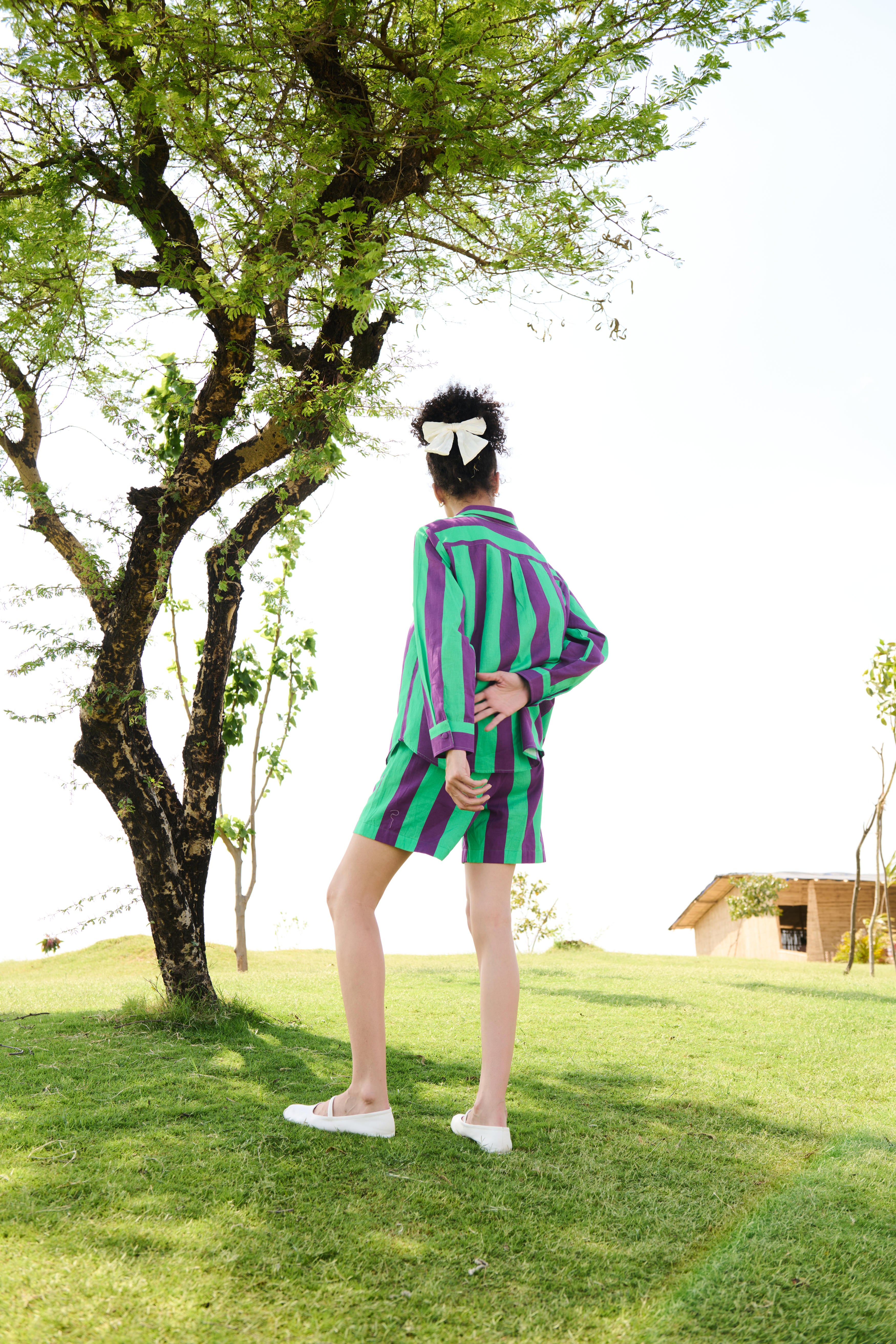 The Diana coord set is crafted from our linen cotton fabric with a Shirt in Purple & Green Stripes print paired with our leisure shorts.