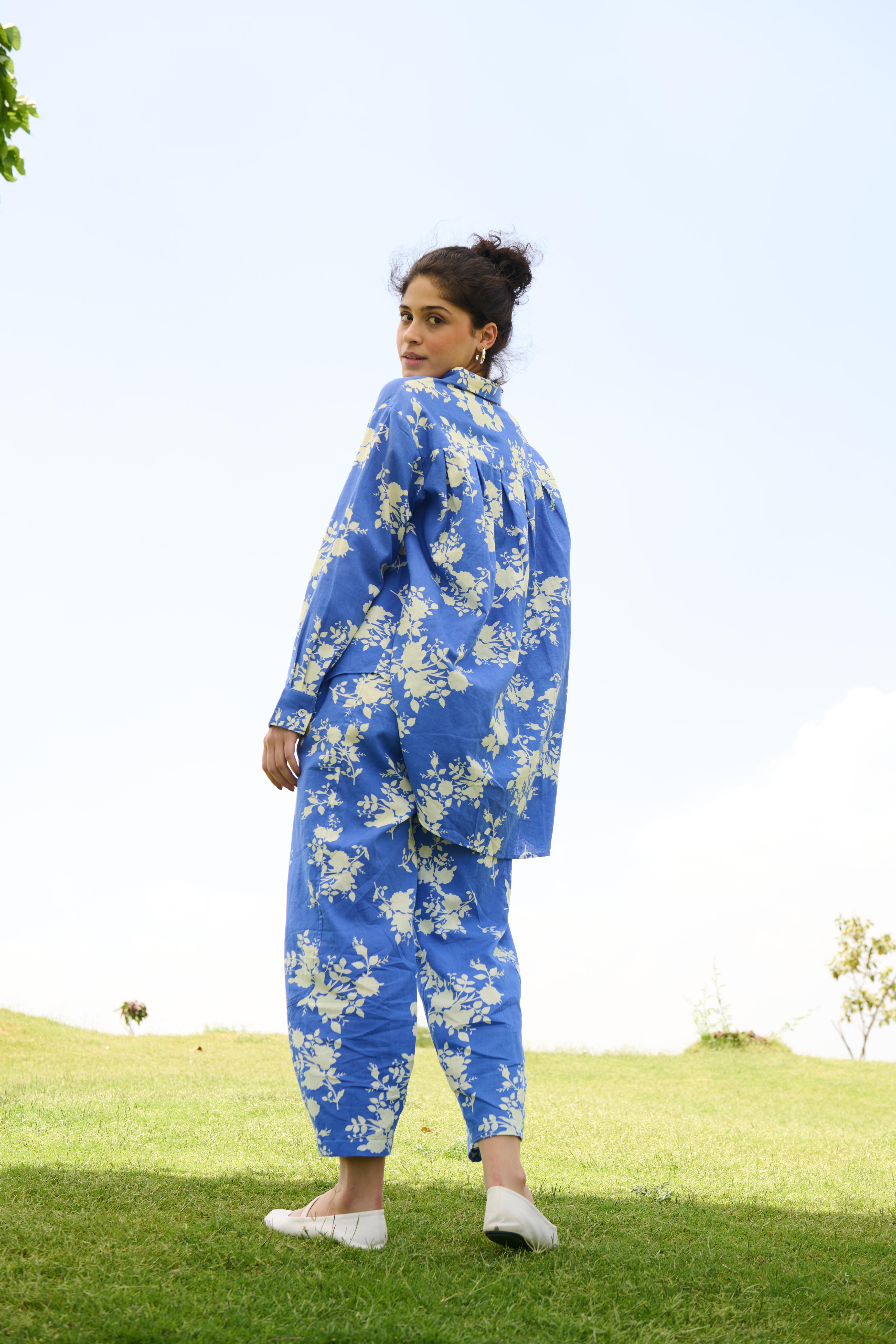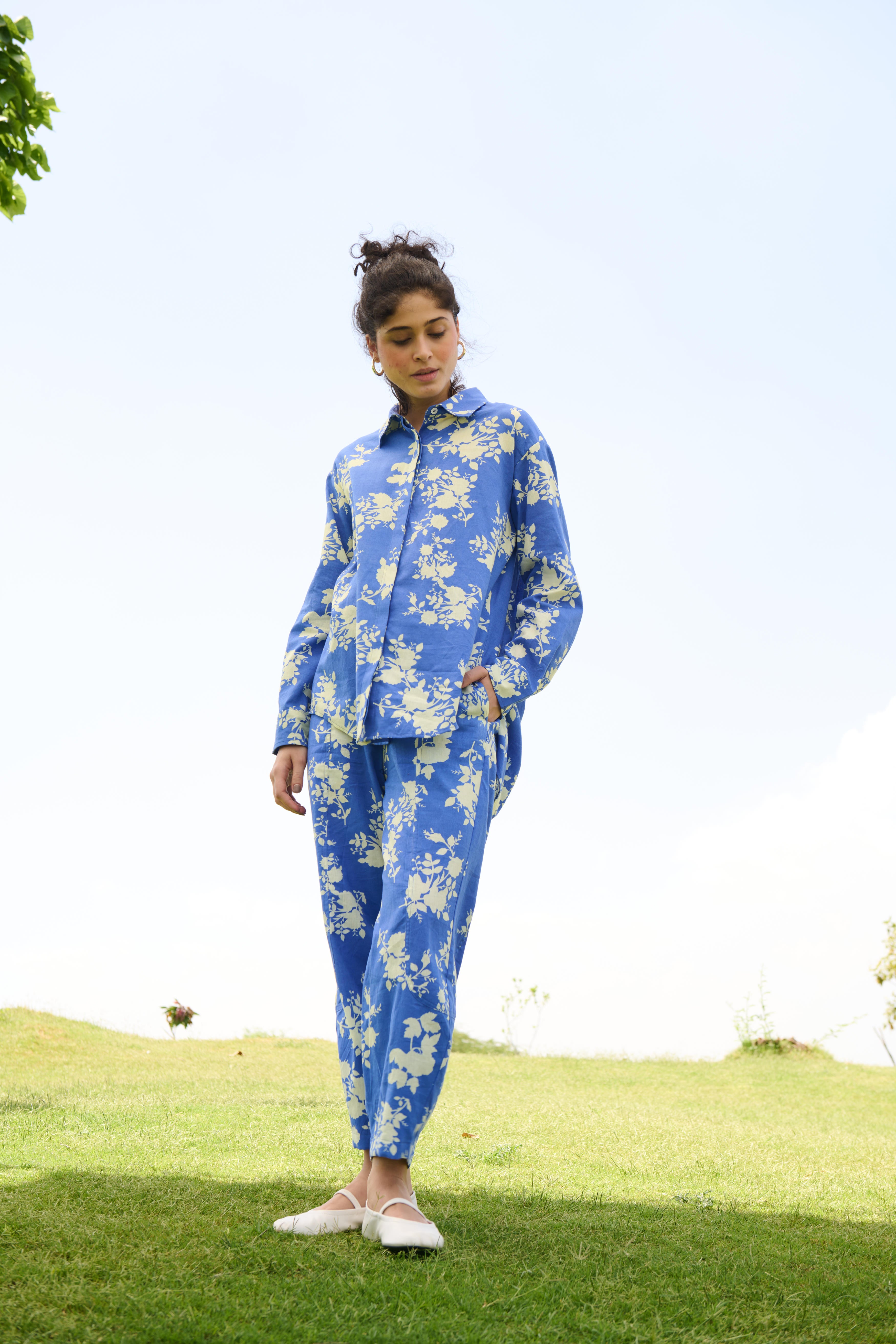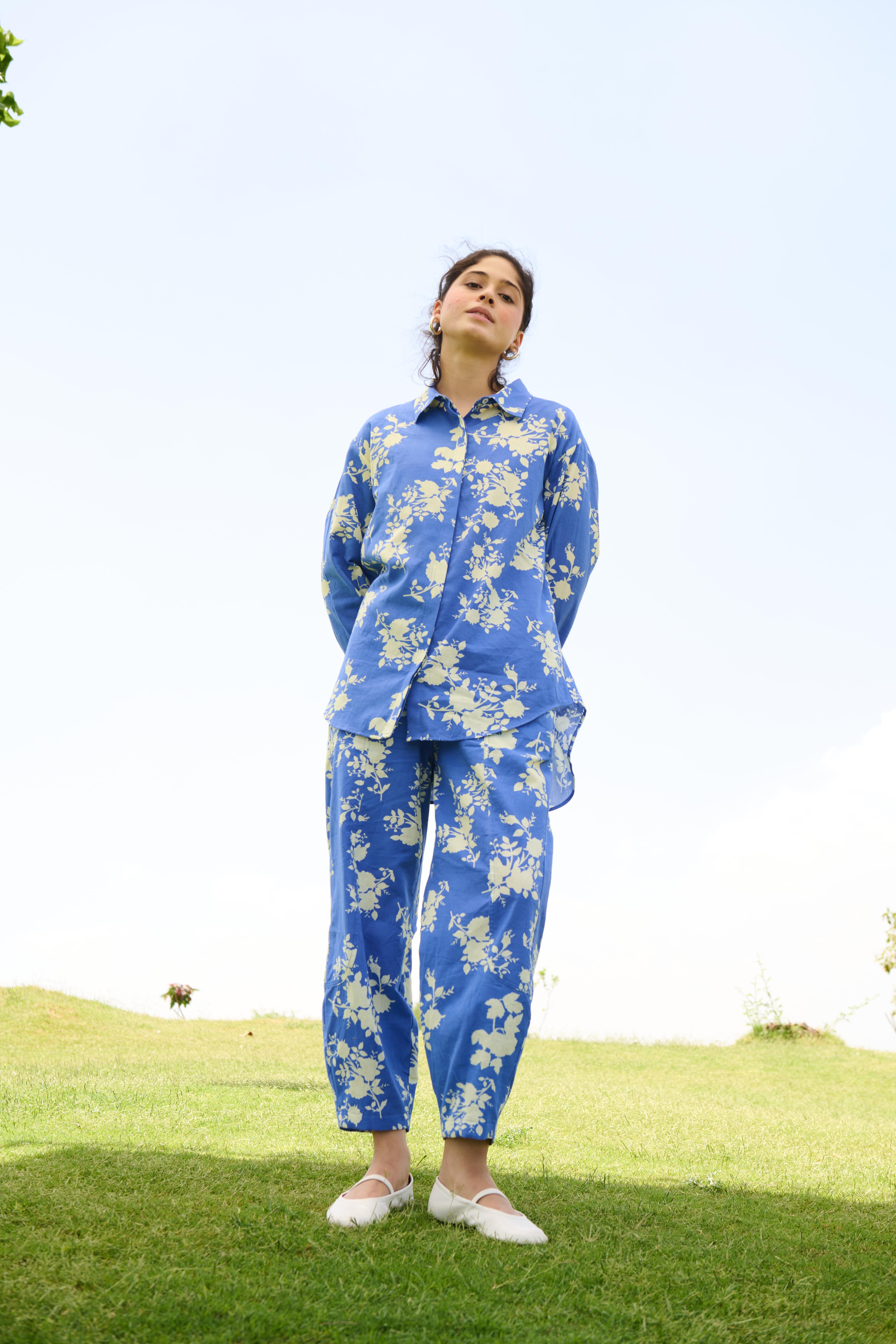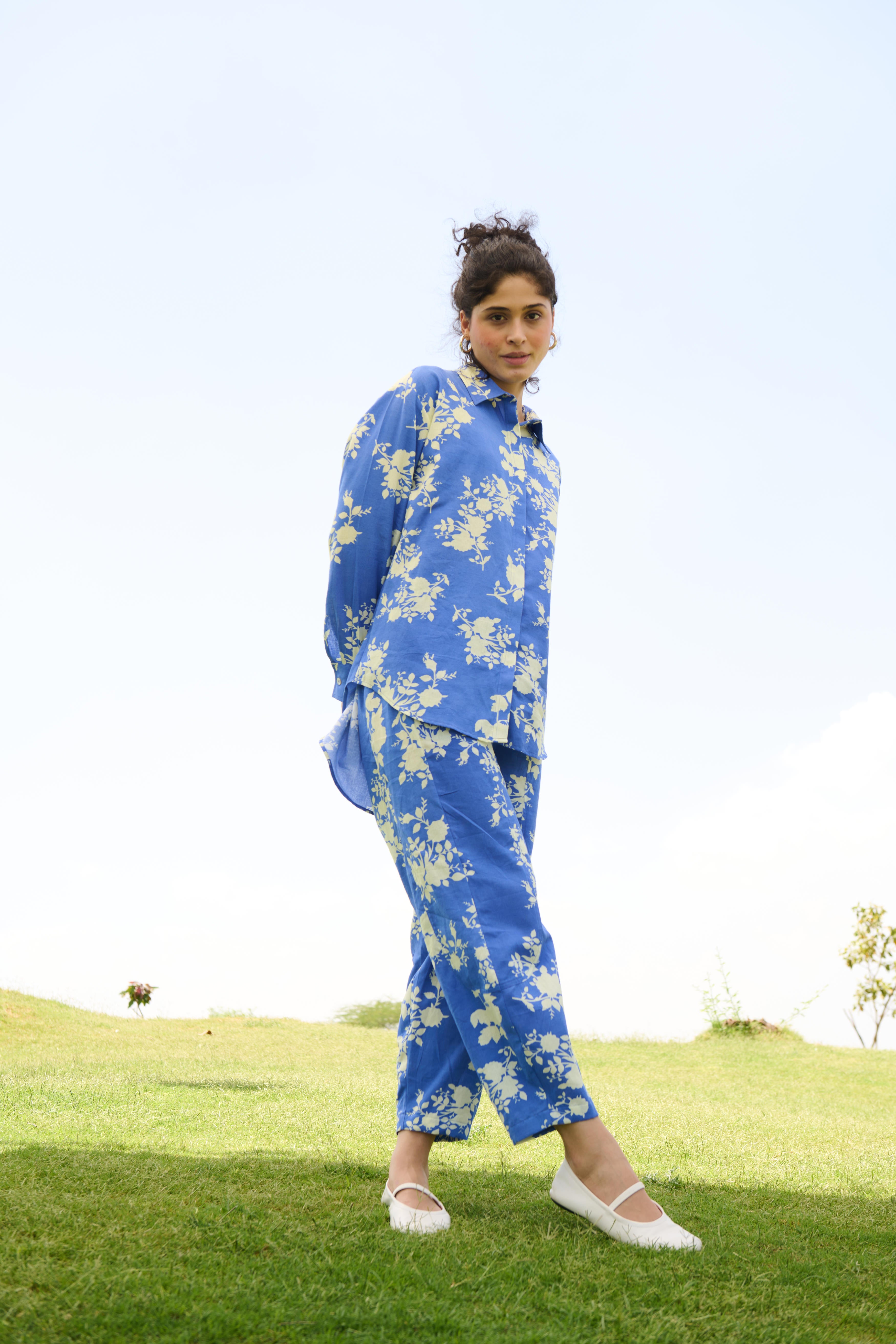 The Marigold coord set has a button down shirt crafted from our linen cotton fabric paired with our panelled trouser with stitch detailing.