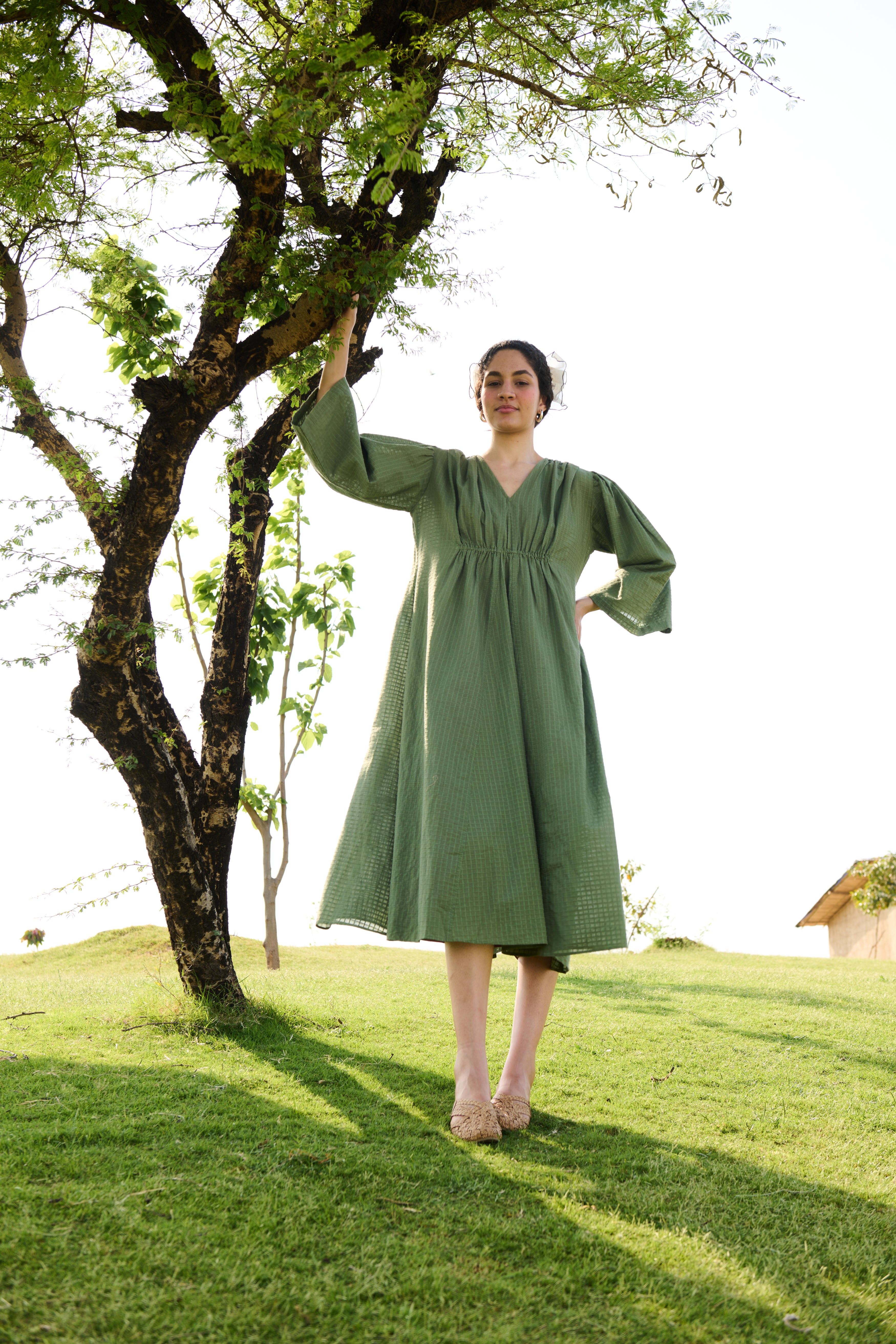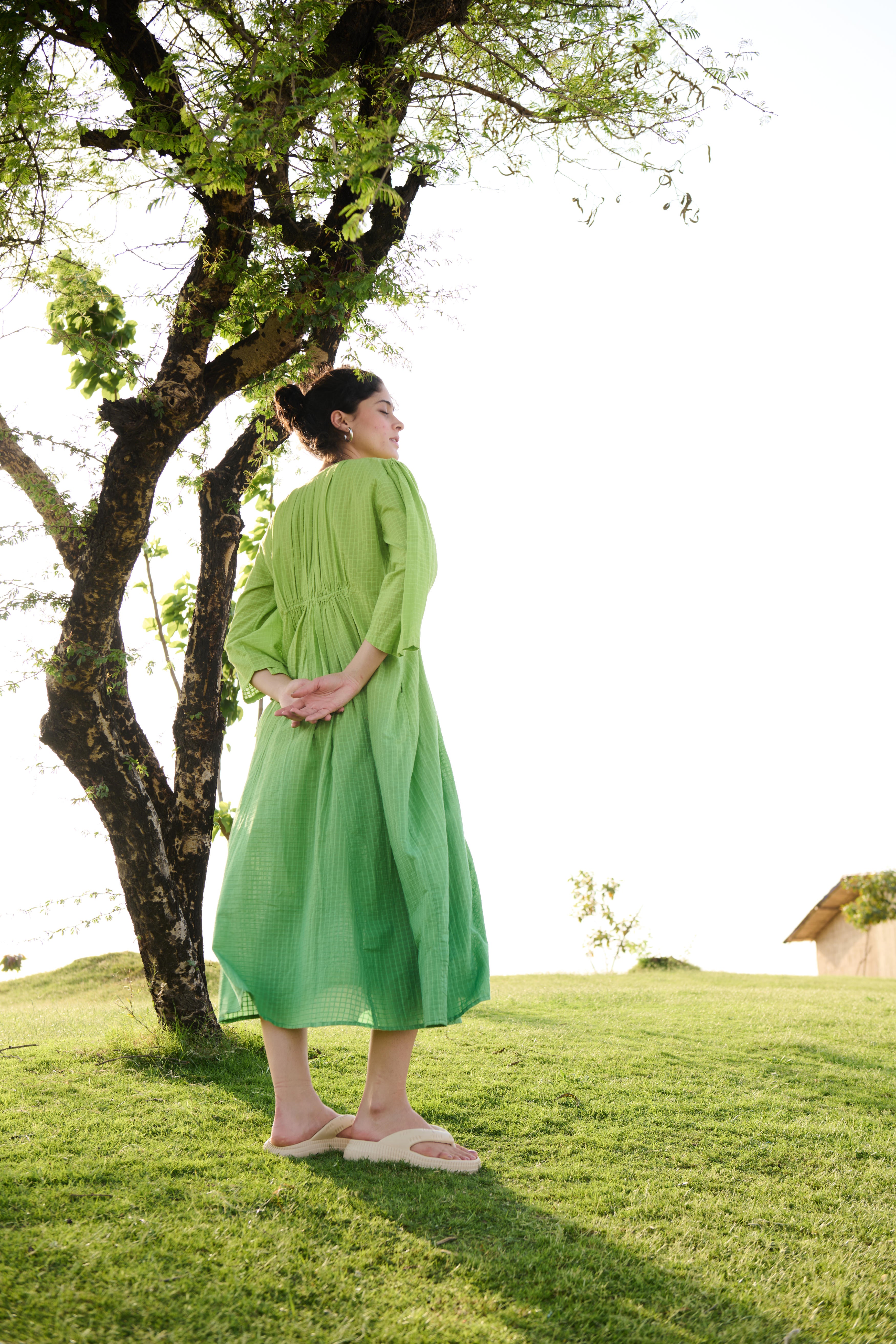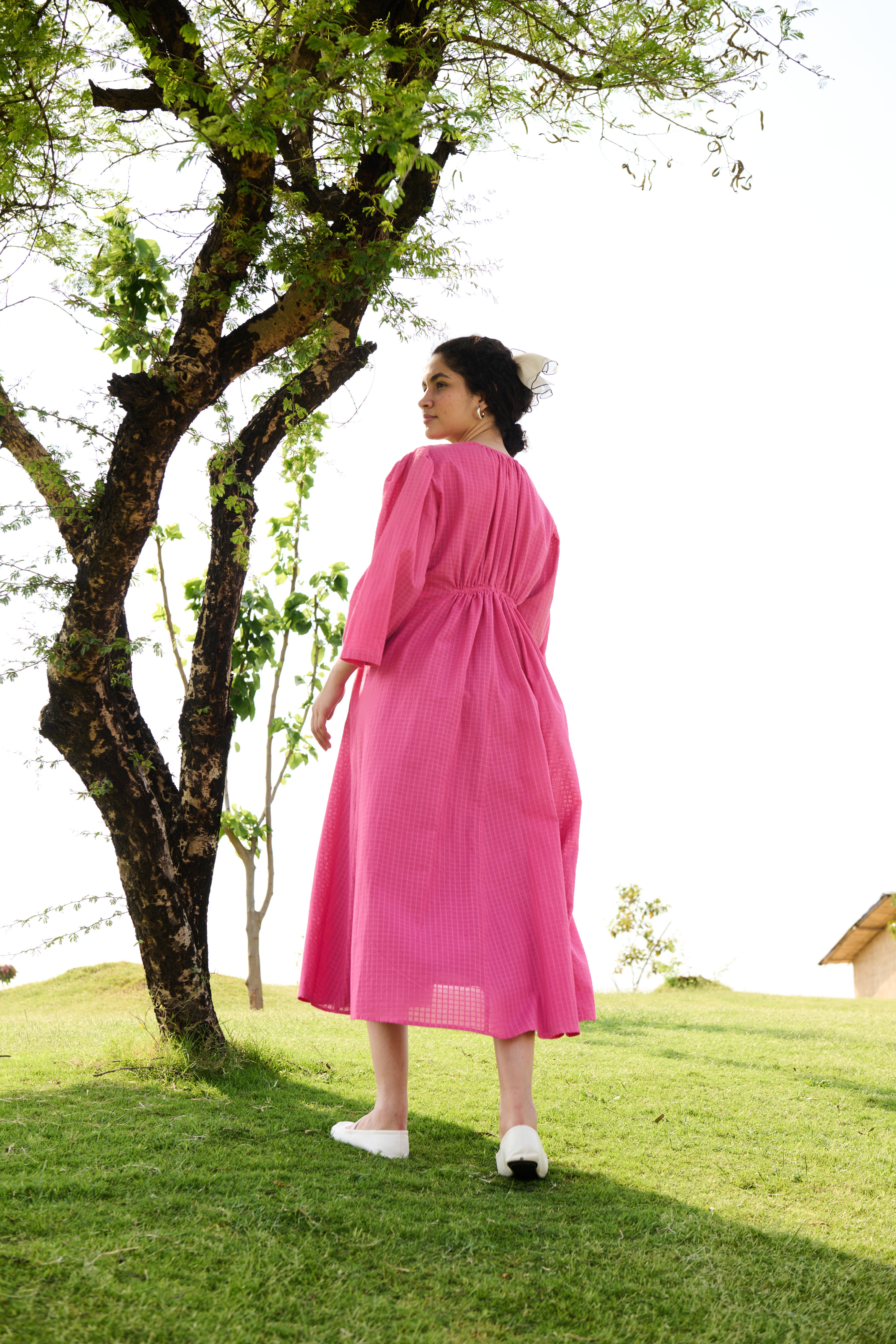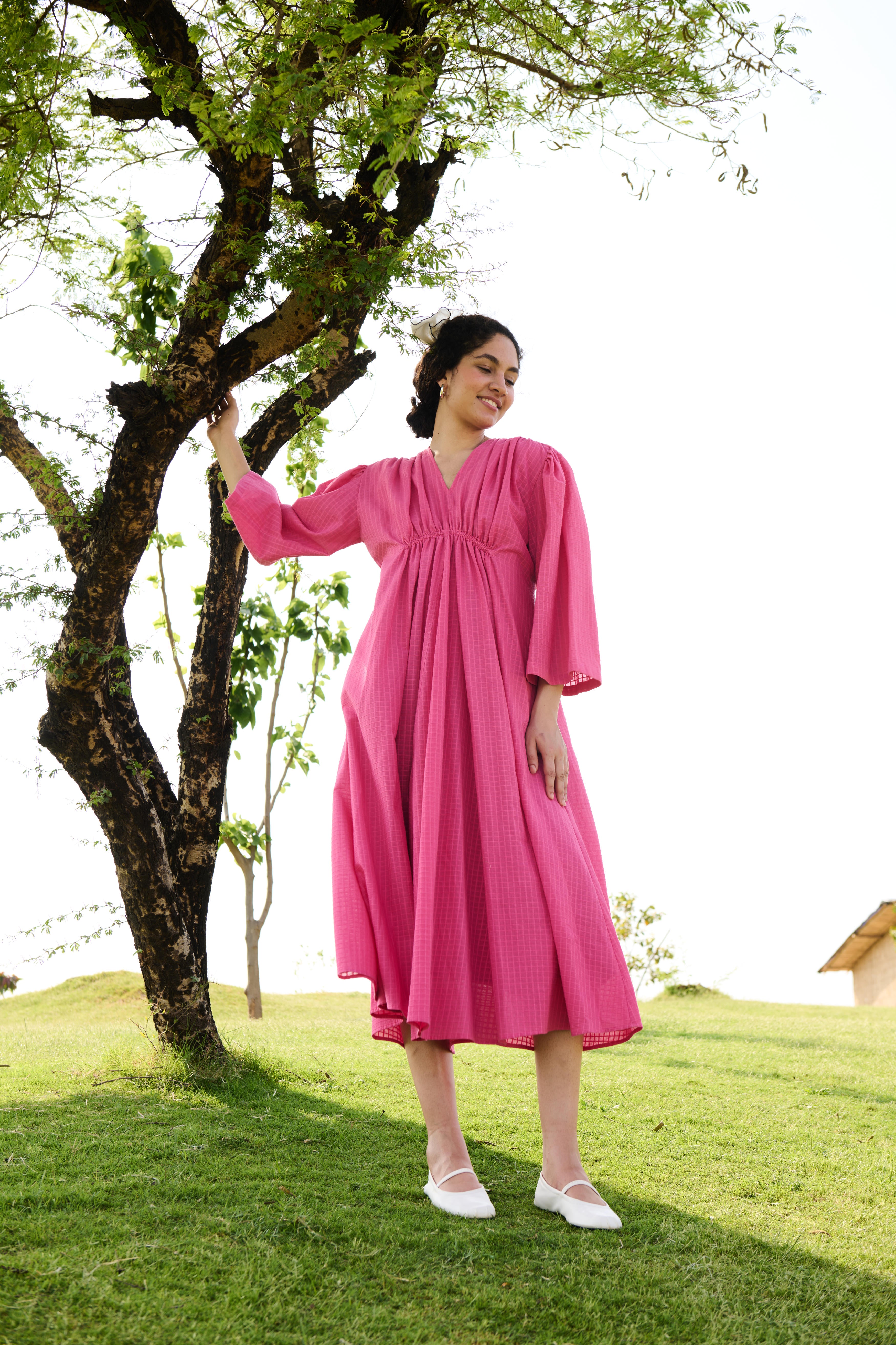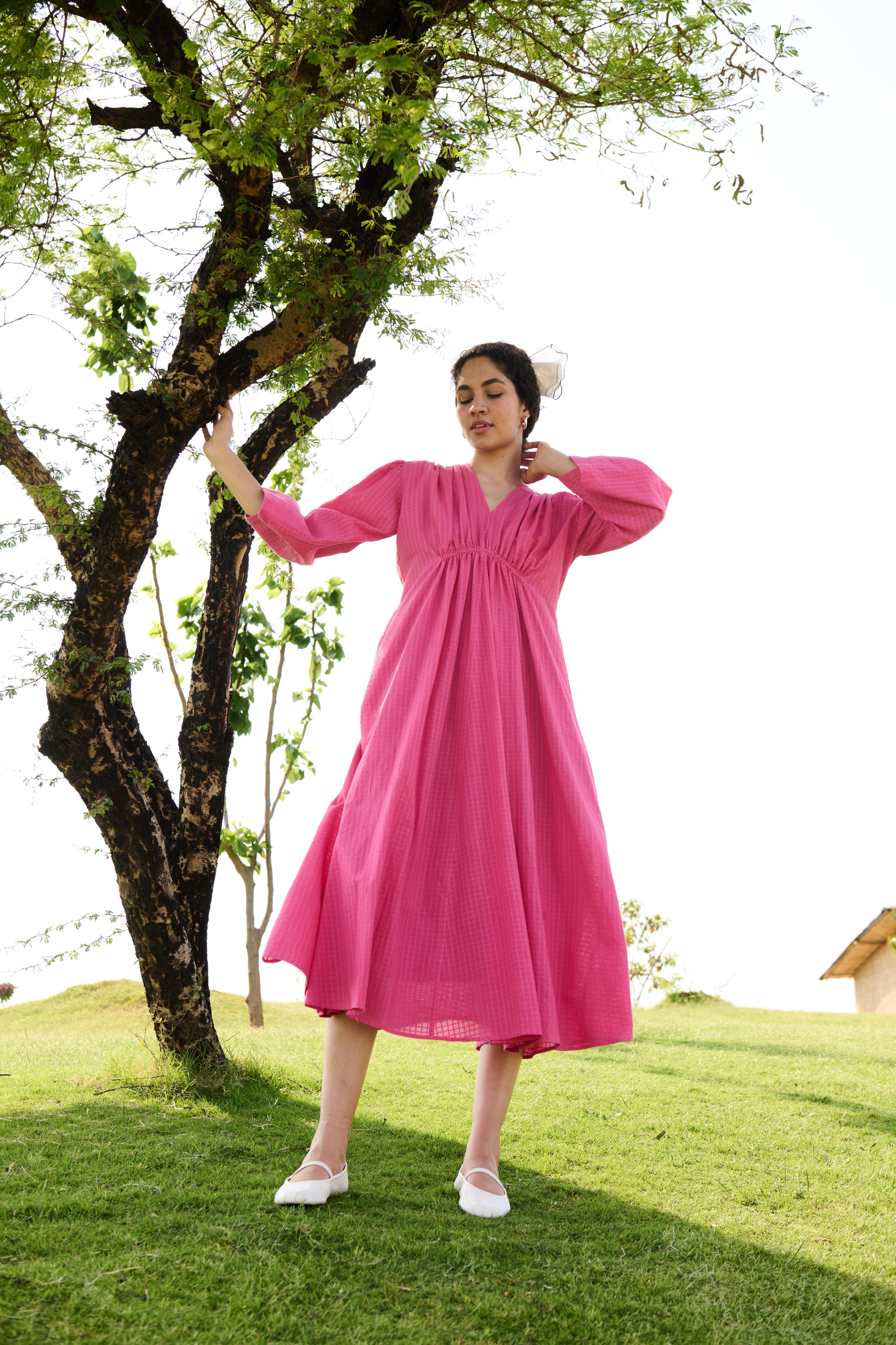 The Shringara dress is crafted with our checkered cotton fabric in the prettiest of azo free ombres with elasticated detailing at the bust.