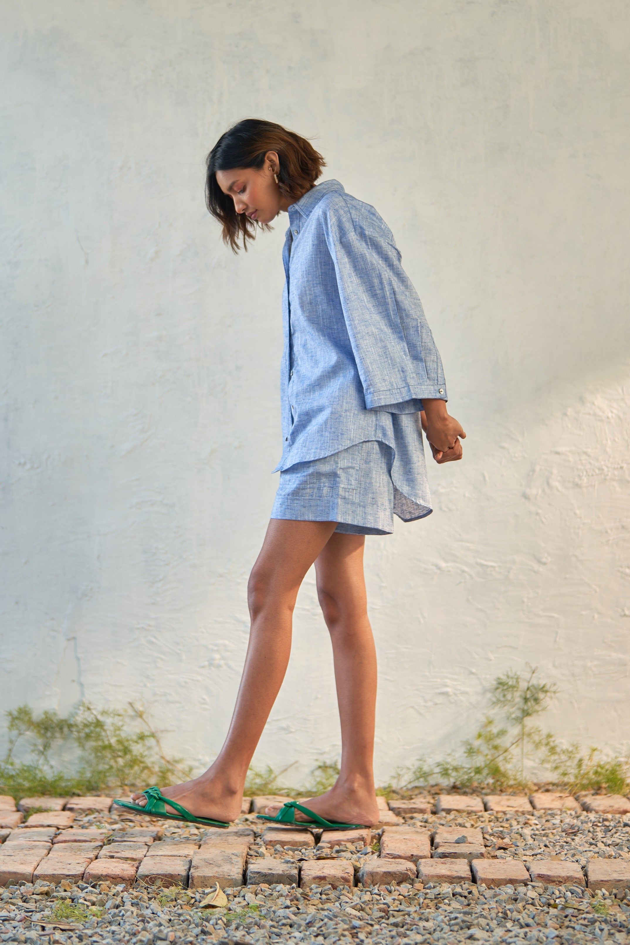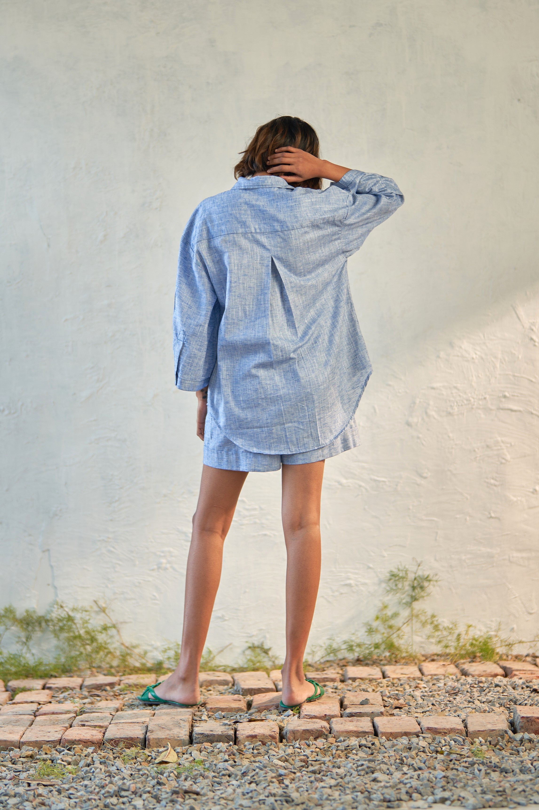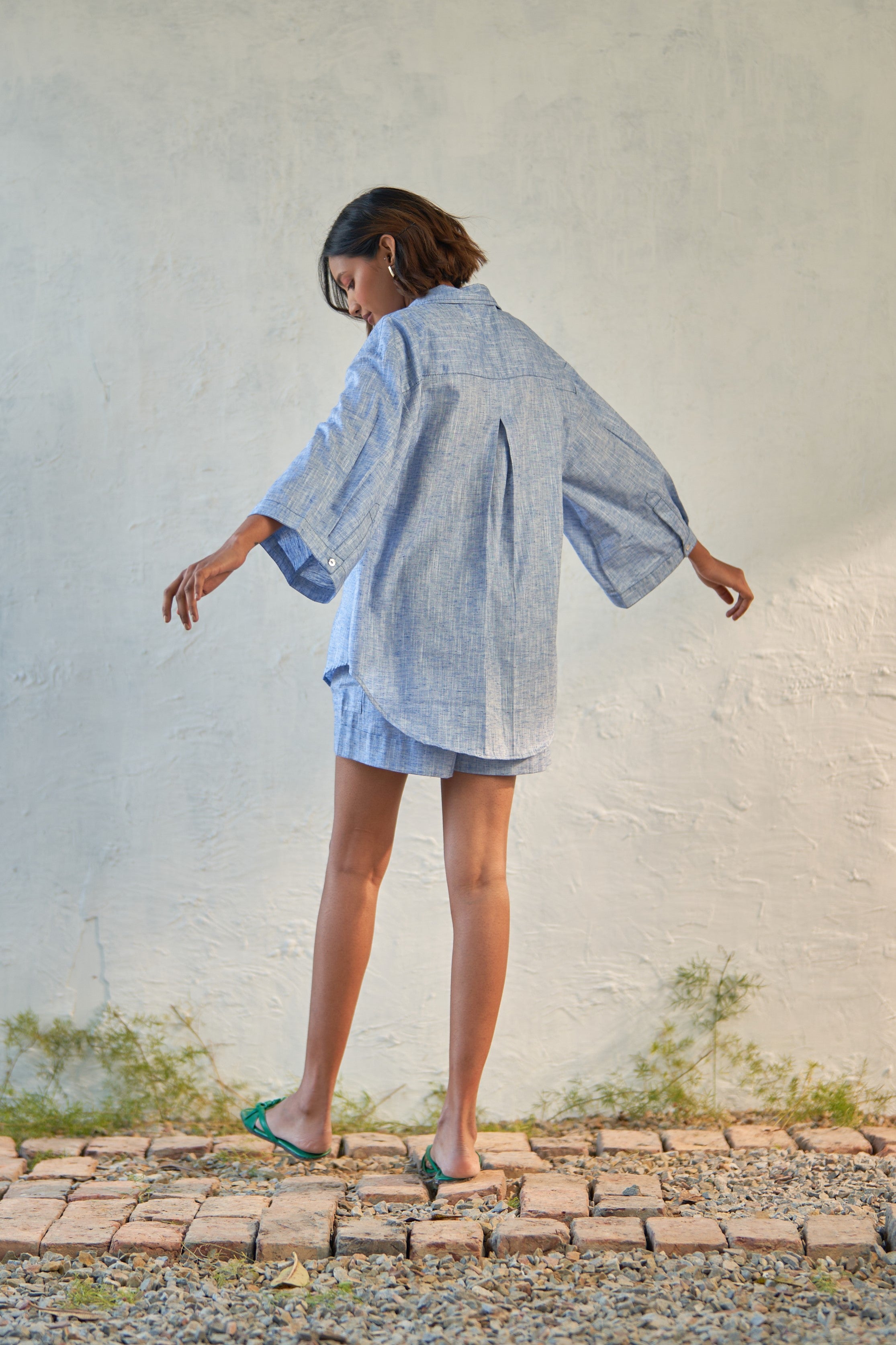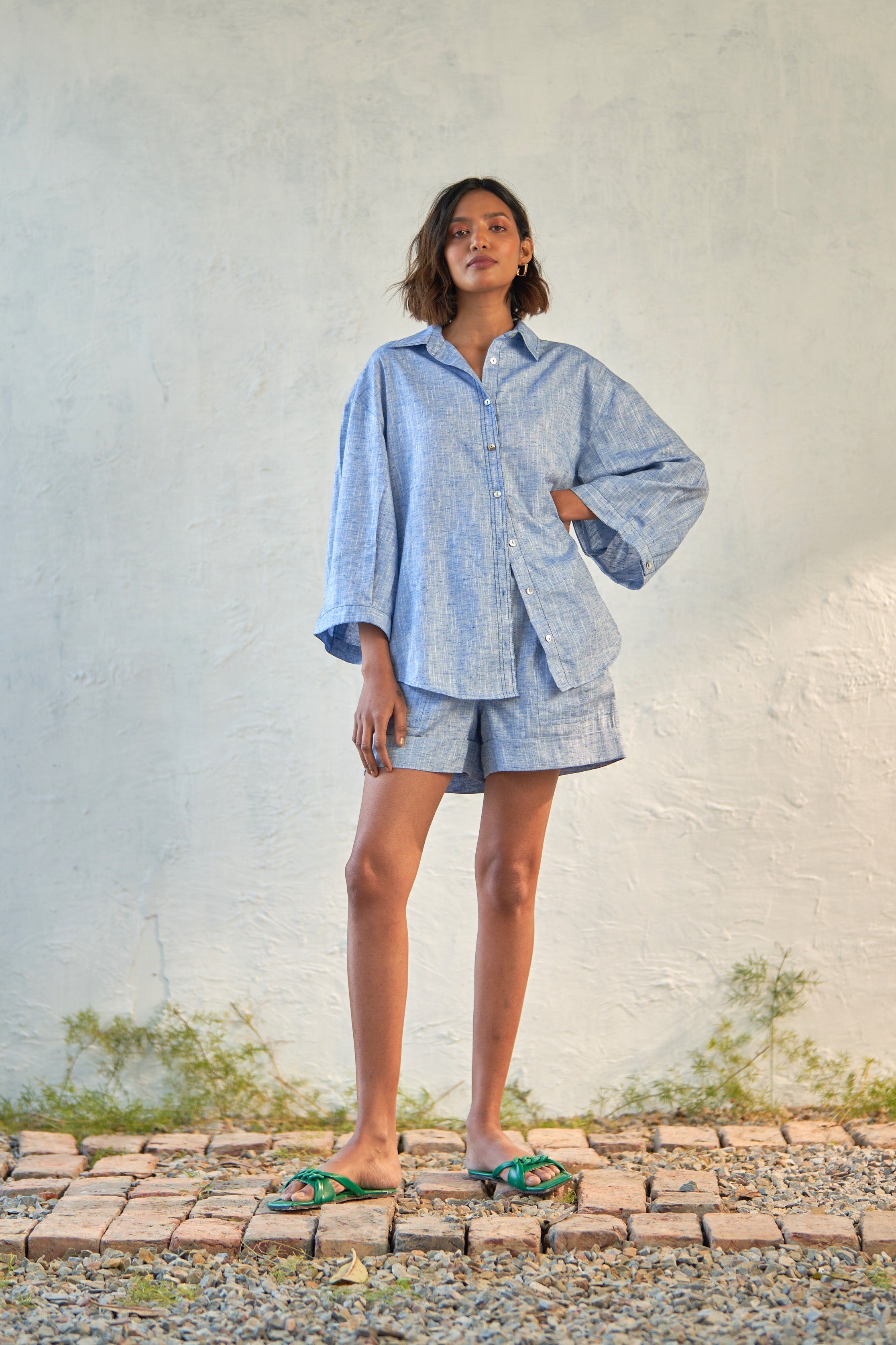 Step into leisurely adventures with this exceptional duo crafted from textured cotton. The shirt boasts a flattering V-neckline, adorned with delicate shell buttons, and features chic pleated 3/4 sleeves that add a touch of sophistication. Paired with matching shorts, complete with a half elastic waistband and convenient flap pockets, this ensemble is perfect for exploring in style.