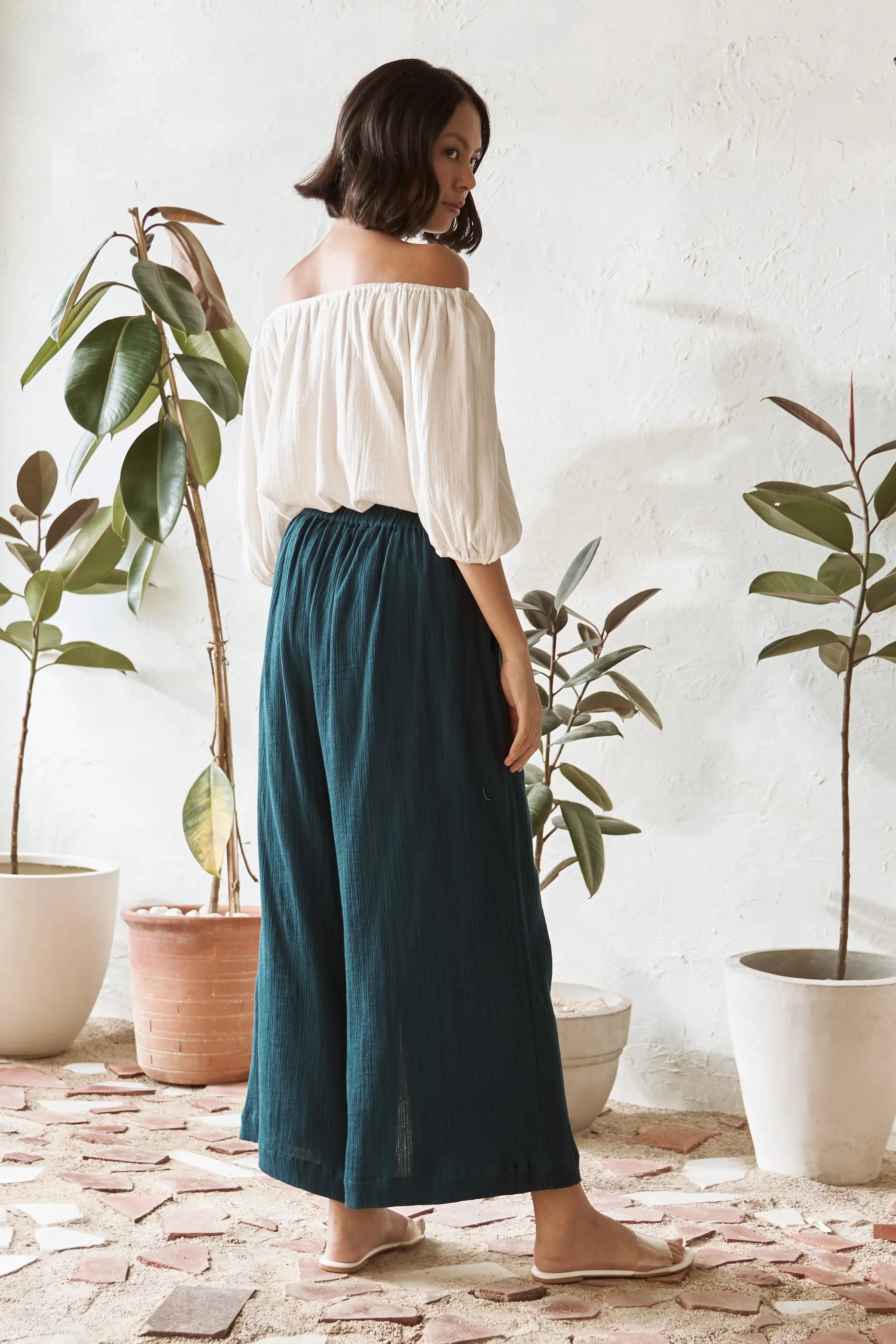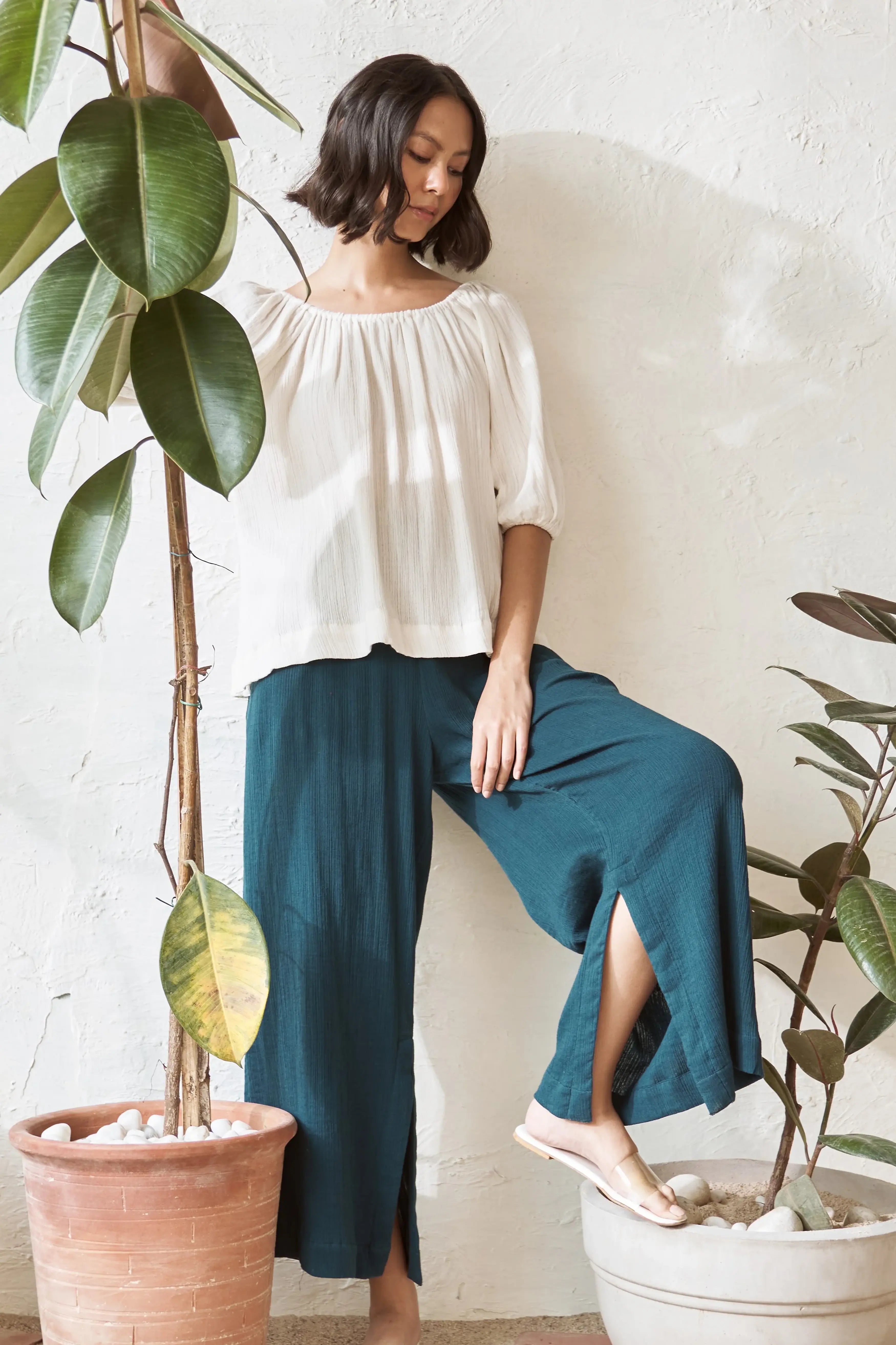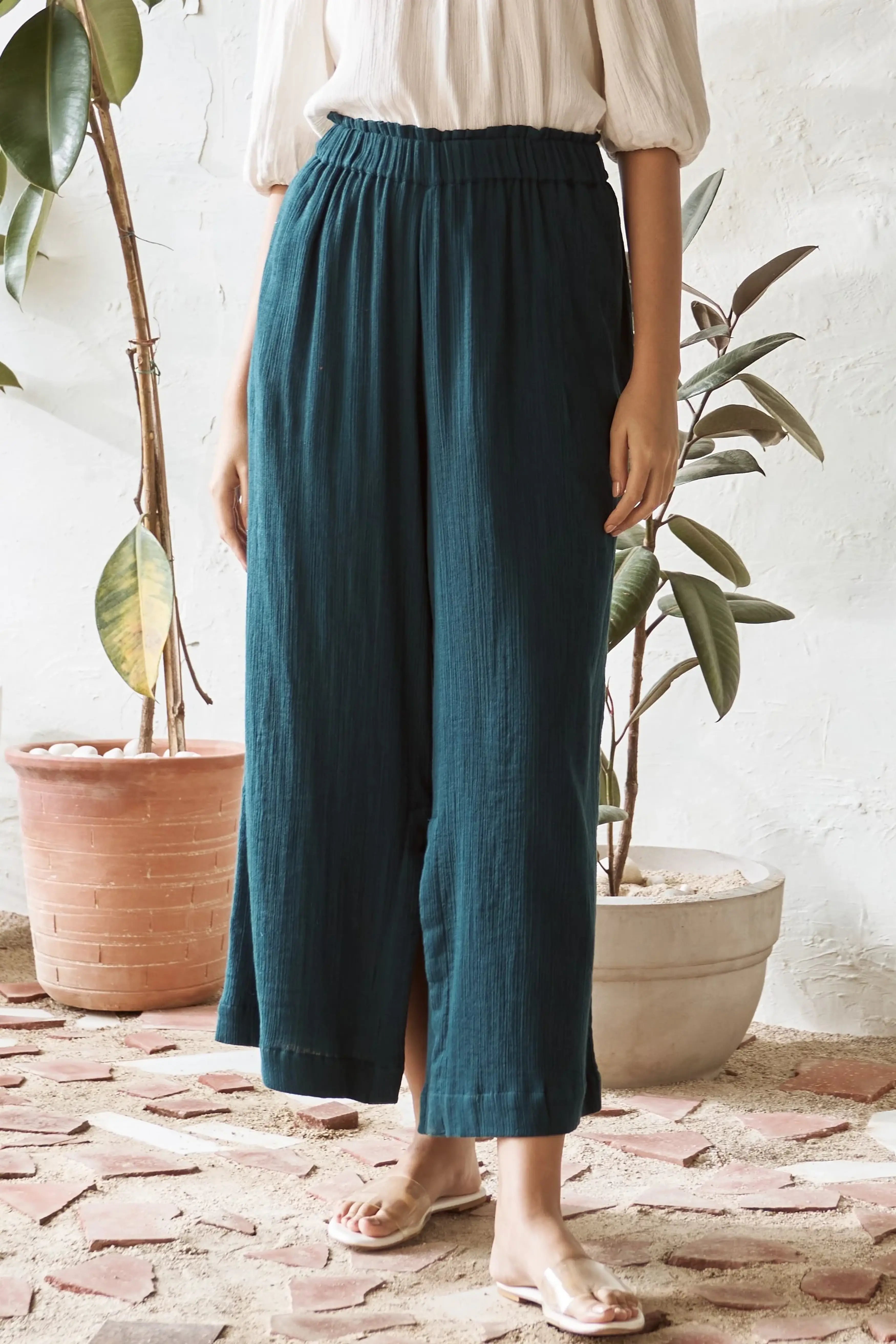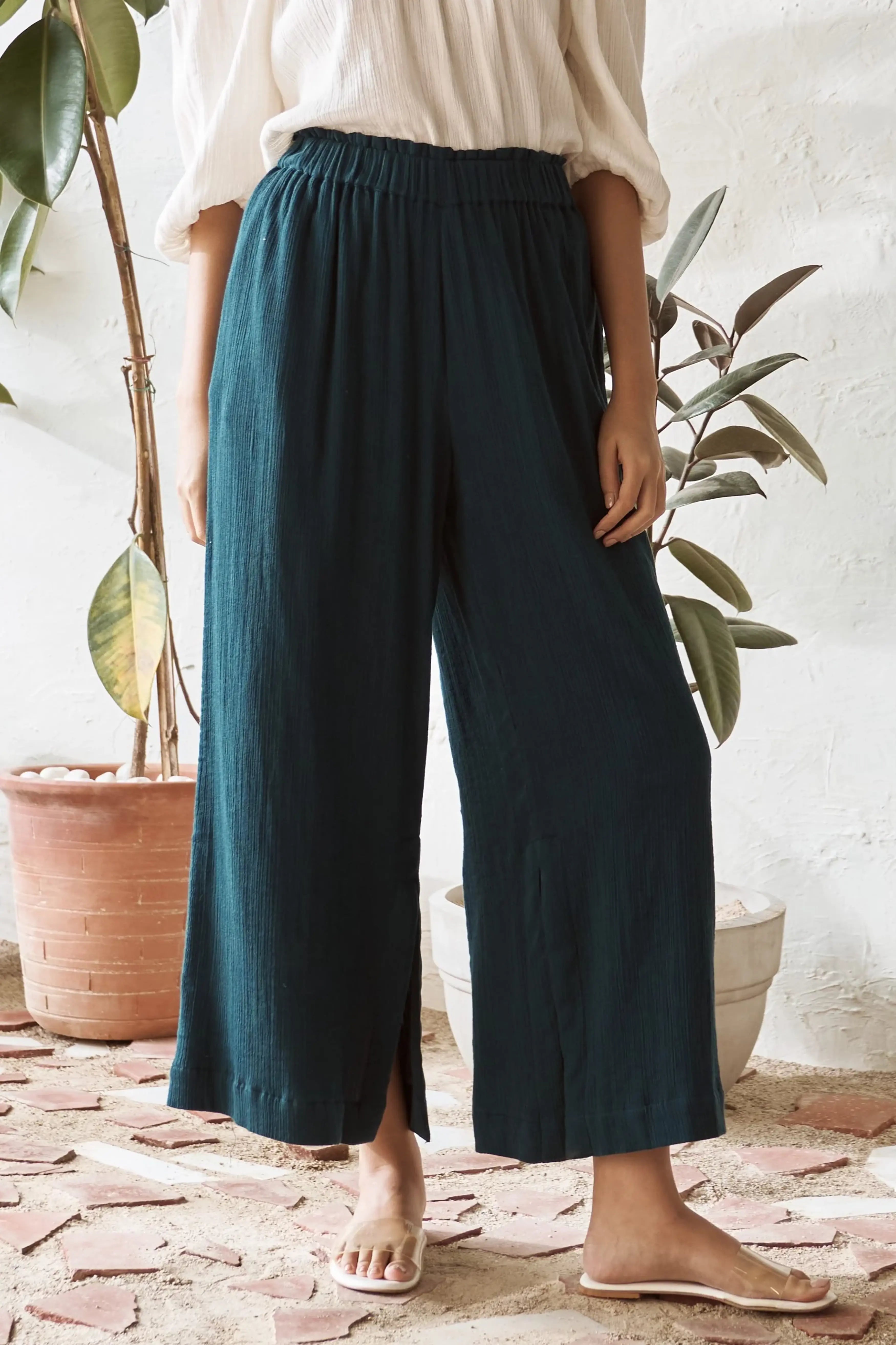 Enhance your style with the Orchid Pants in vibrant teal. These chic pants are designed with stylish side slits, making them a versatile choice for pairing with any tank top or mixing with other pieces. With an elasticated waistband and practical side pockets, the Orchid Pants provide ultimate comfort for all-day wear. Perfect for creating various looks, these pants are an essential addition to your wardrobe, offering endless styling possibilities while keeping you both stylish and comfortable.