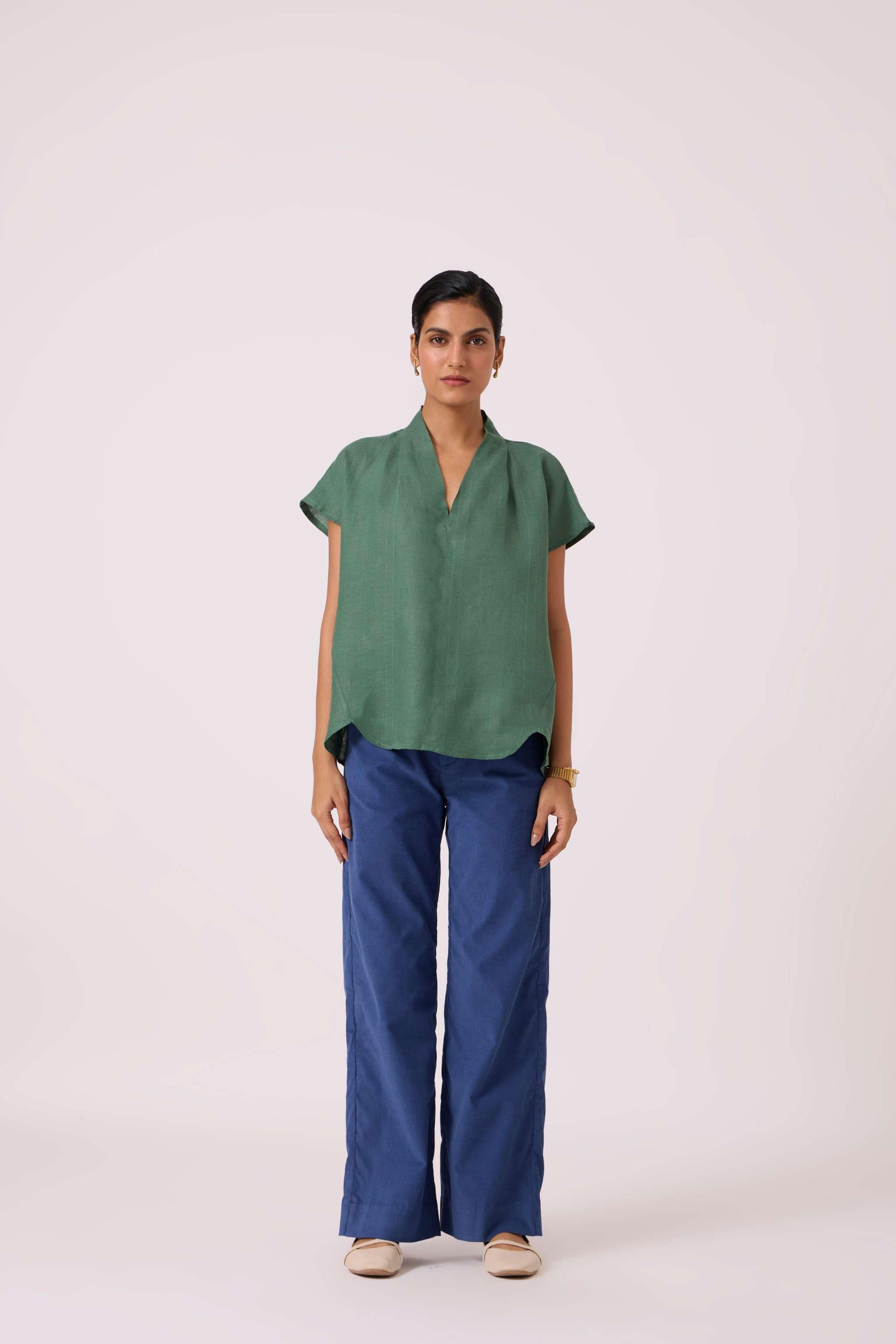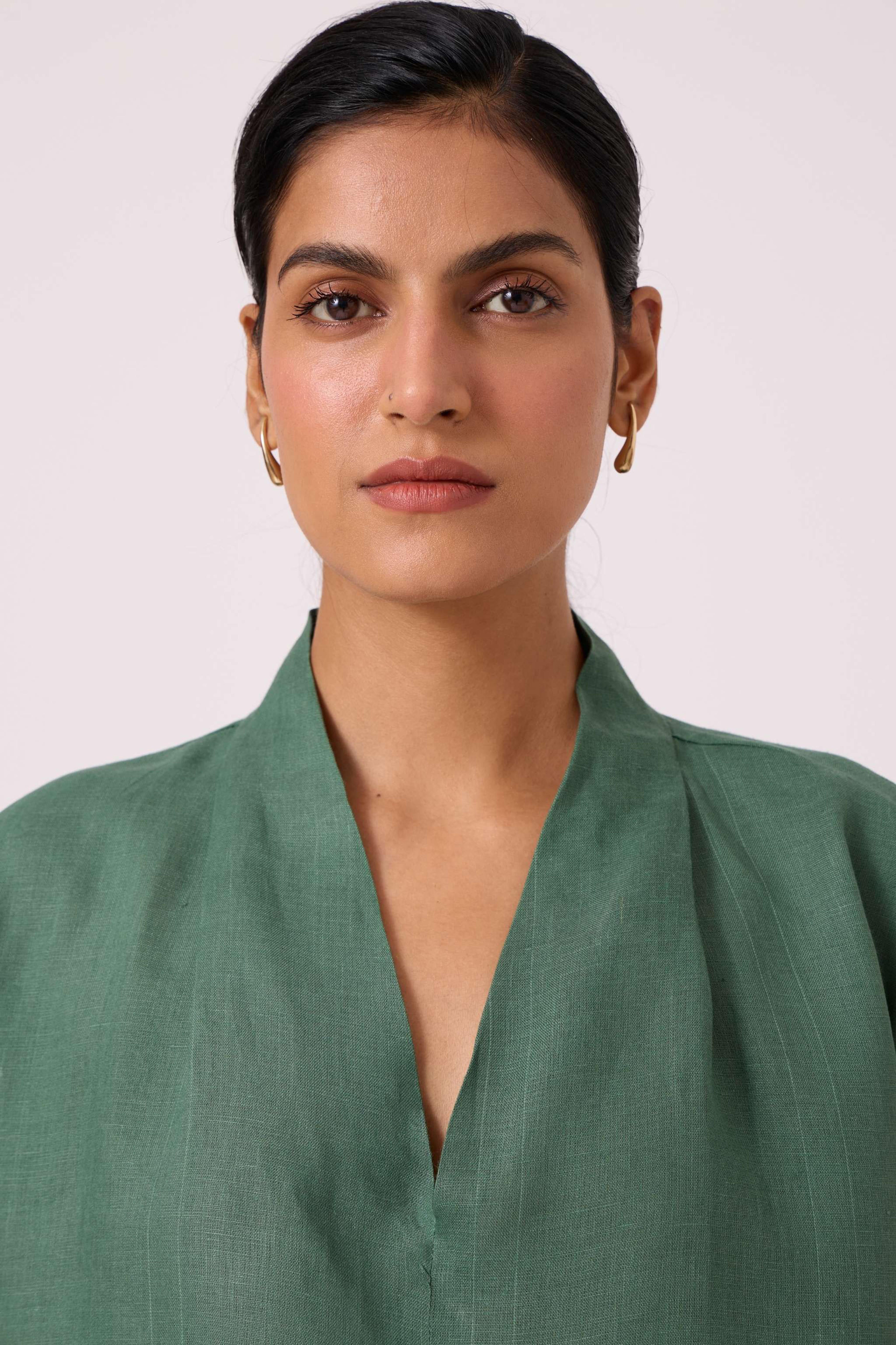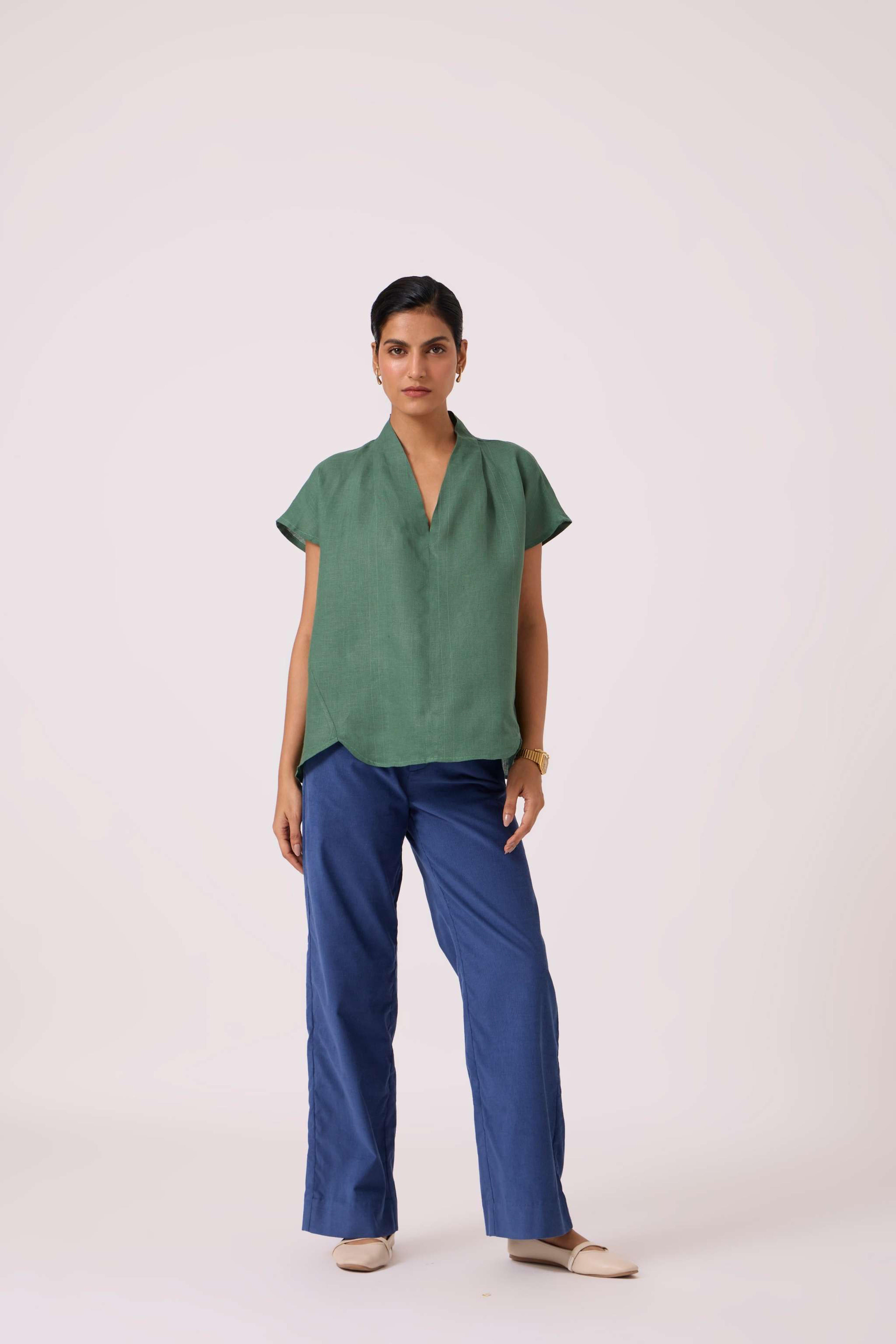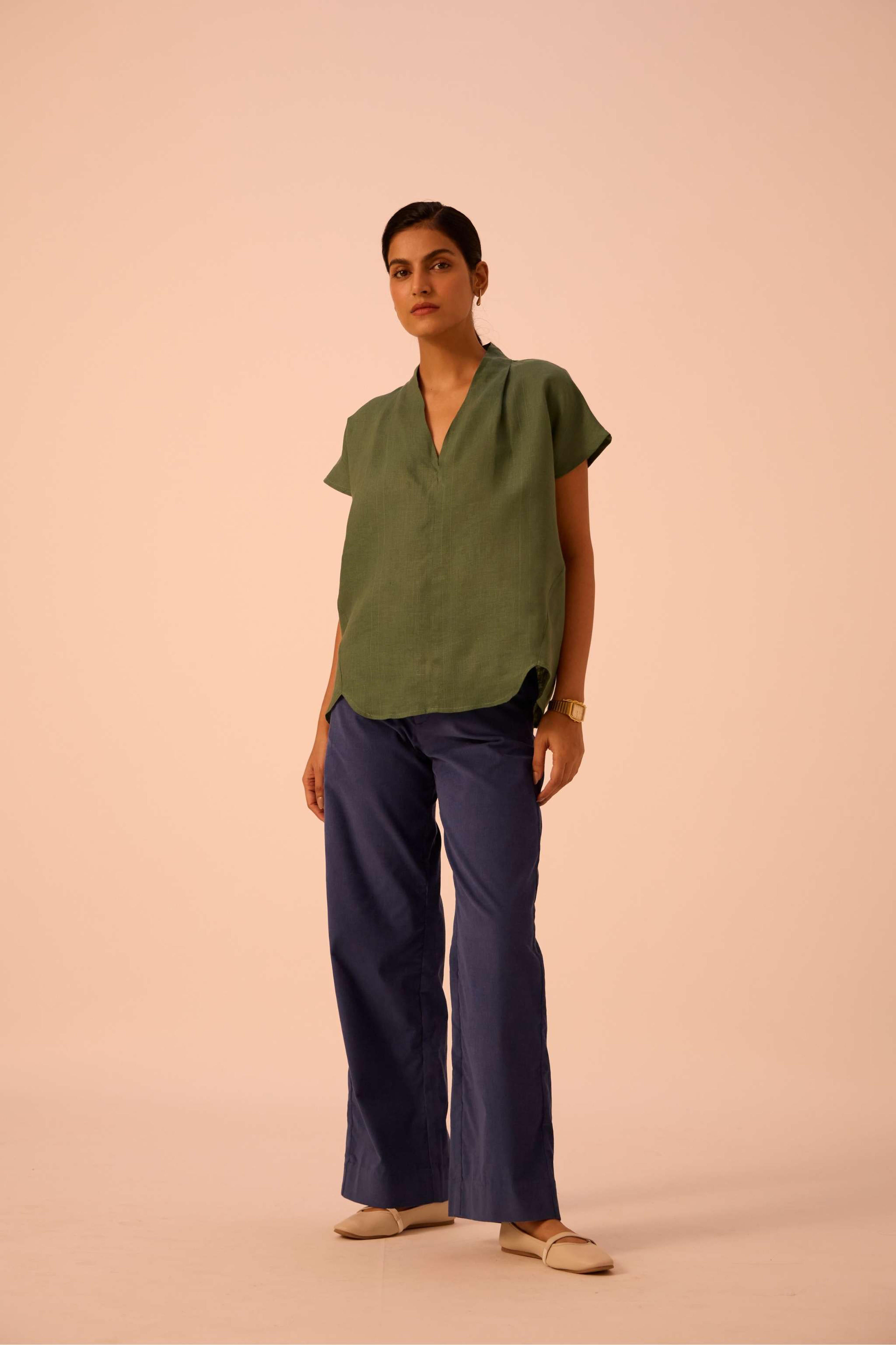 This *regular-fit top* features a refined *V-neck* and a pleated collar, adding a sophisticated detail. It has a *drop shoulder sleeve* design for a relaxed silhouette. The model, Chhavi, is 5'6" and is wearing a size XS.