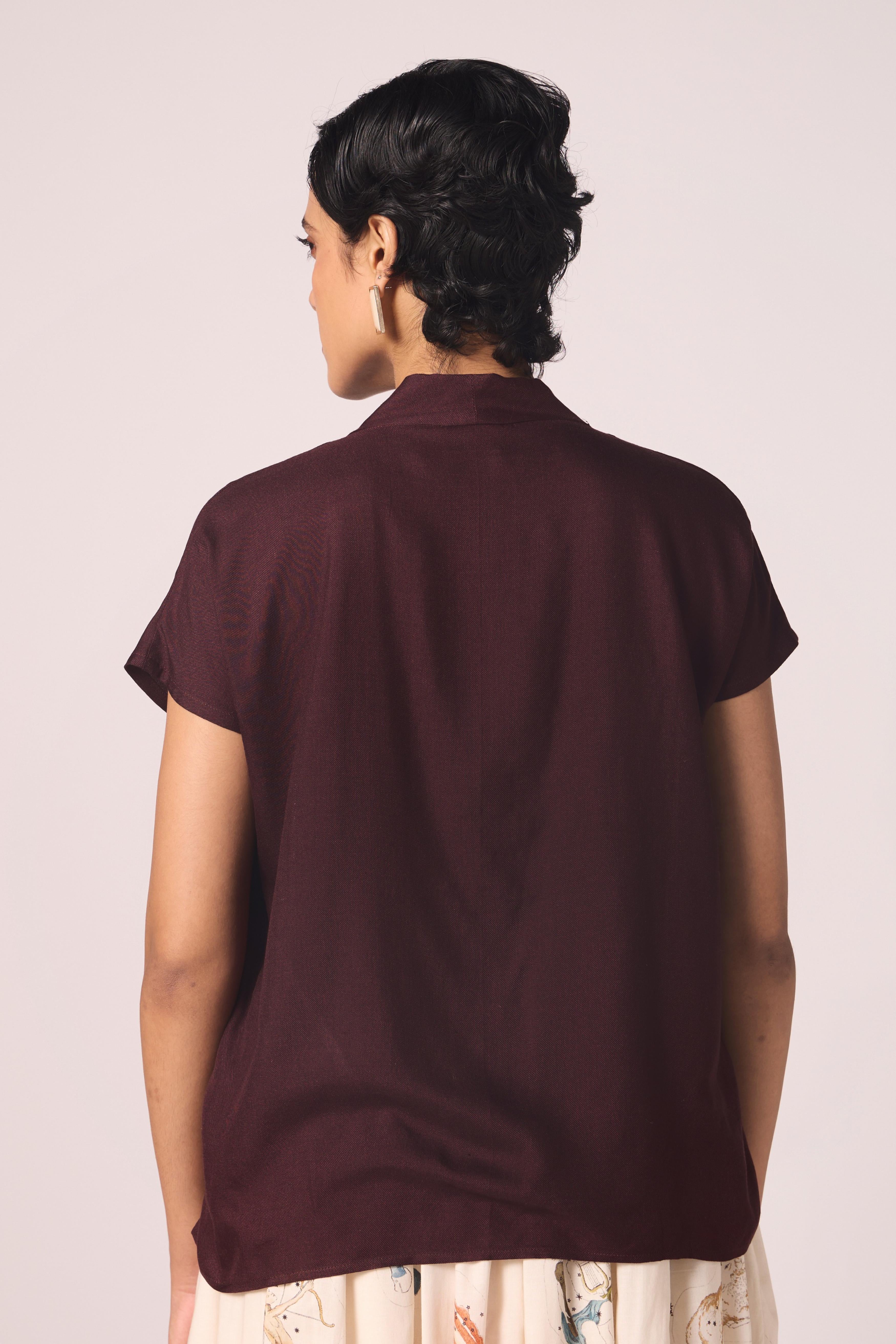 The neckline opens into a soft V, framed by a pleated collar. Short sleeves balance the line, making this top an effortless piece that transitions with ease. - Regular Fit - Anushka is 5'8 and wearing S . Her body measurements are Bust: 32", Waist: 29", Hips: 36" - Spun silk twill - V-neck with pleated collar detail - Short sleeves, regular fit