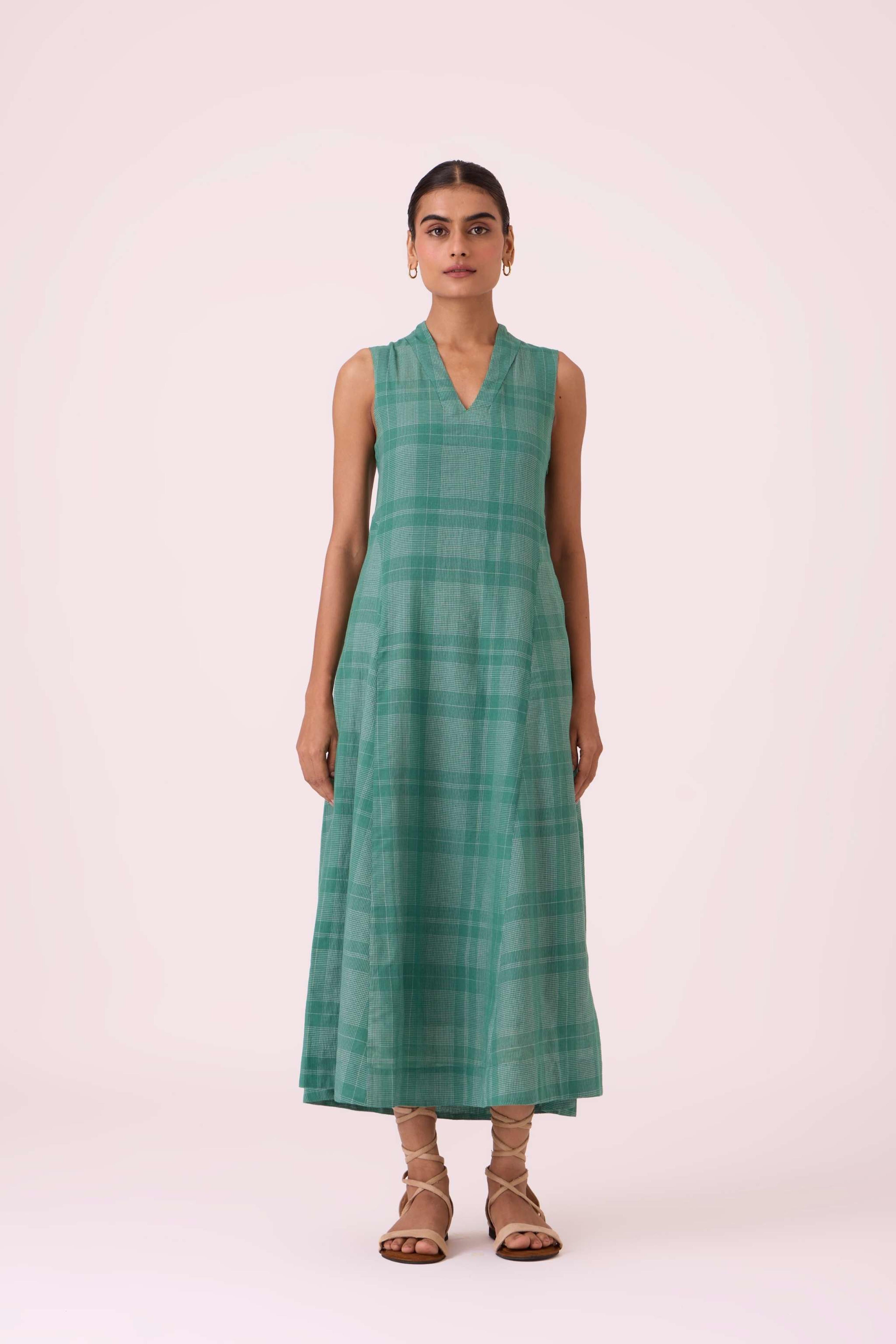 This intricately tailored dress offers a fresh take on the classic *fit and flare* silhouette. It features a defined *V-neckline*, practical *in-seam pockets*, and a *side zip* for a seamless look. Designed for a *slim fit*, this dress also comes with a *slip*. The fabric is a unique design developed in-house and *handwoven by artisans in Bengal*. The model, Chhavi, is 5'6" and is wearing a size XS.