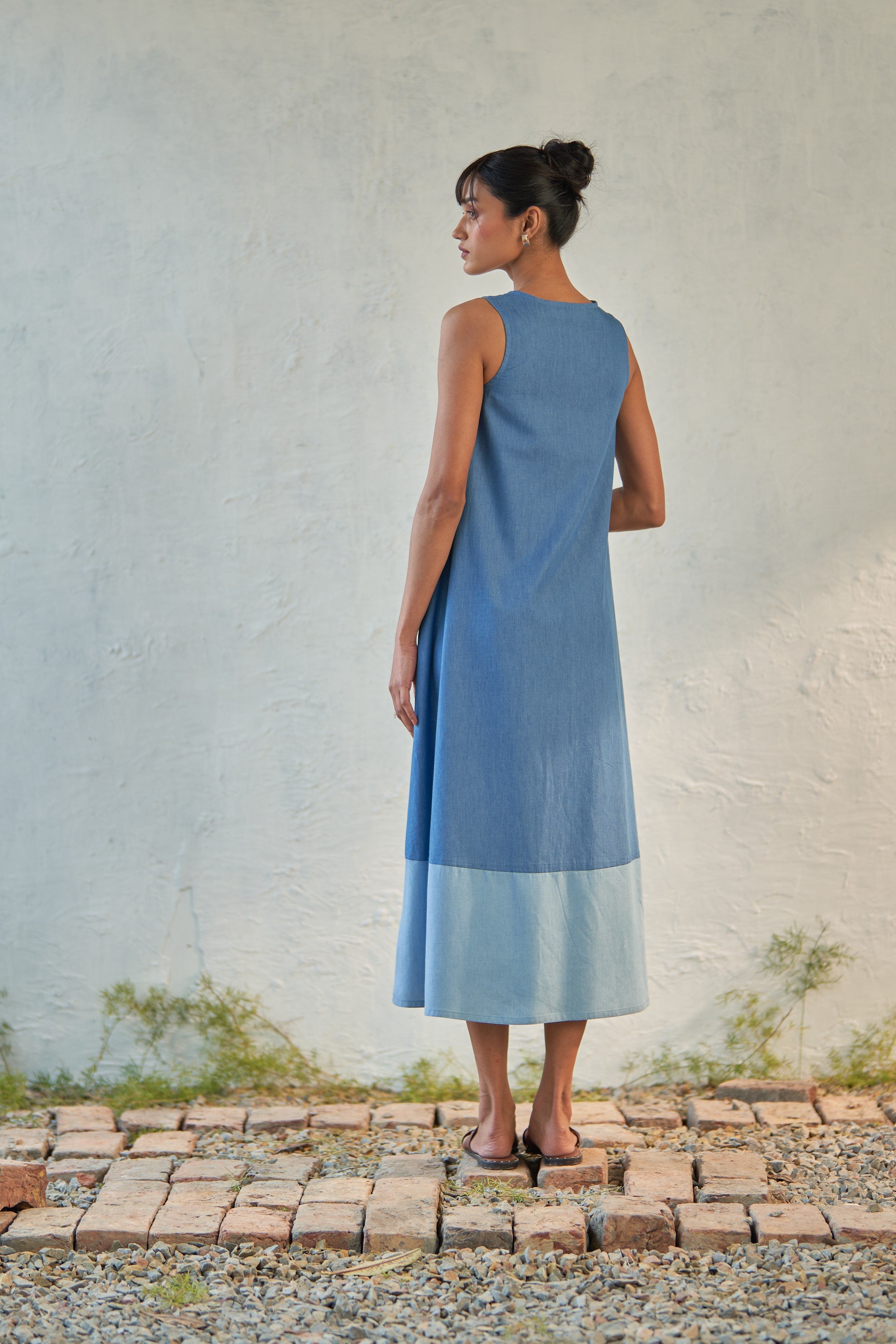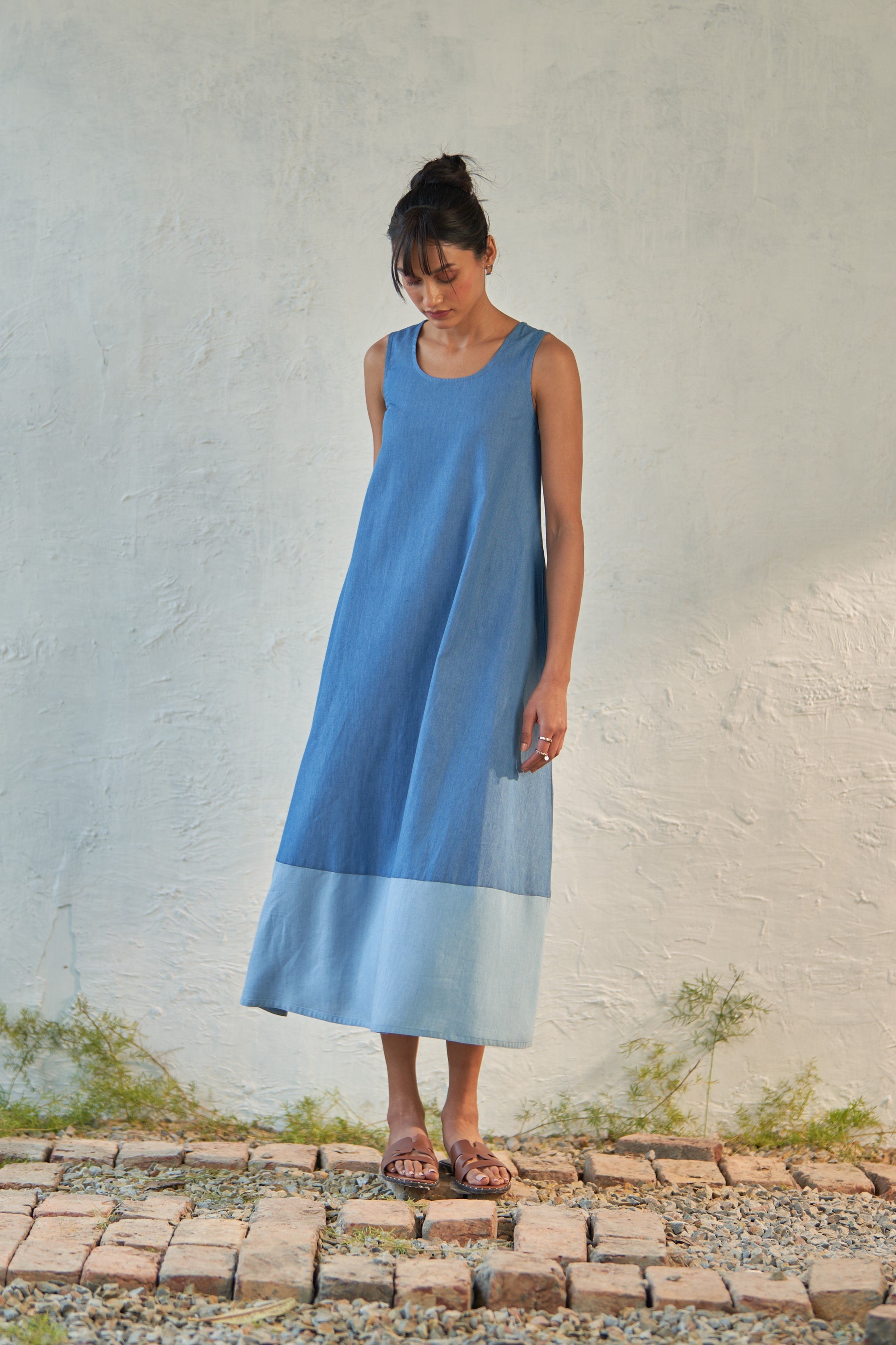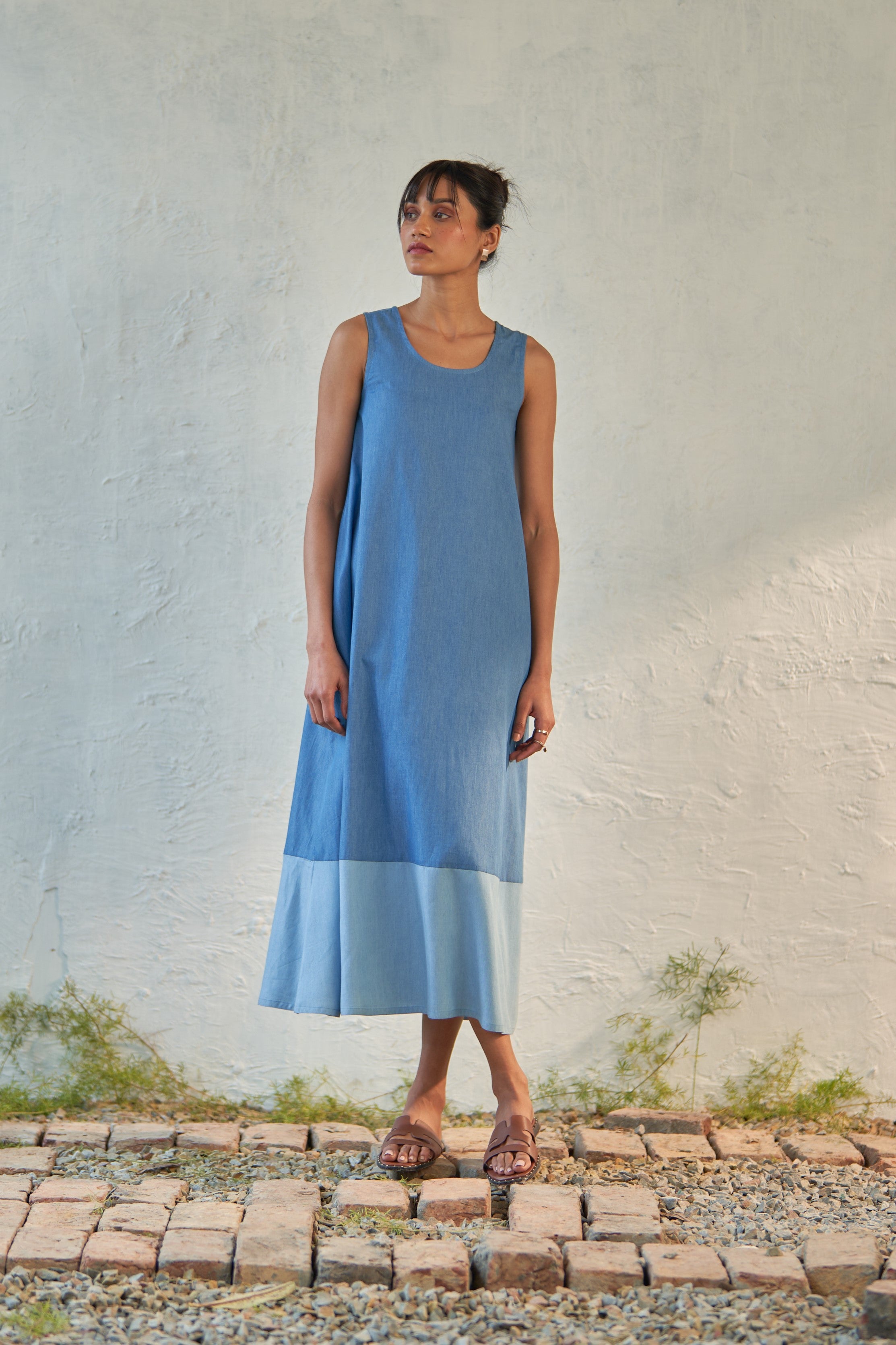 This dual-toned dress is crafted from soft denim fabric, designed to gently fall through the frame with a scoop neck and a curved hem. Sleeveless with a voluminous flare, it allows you to sway swiftly from morning to evening. Add it to your collection of no-brainer outfits.