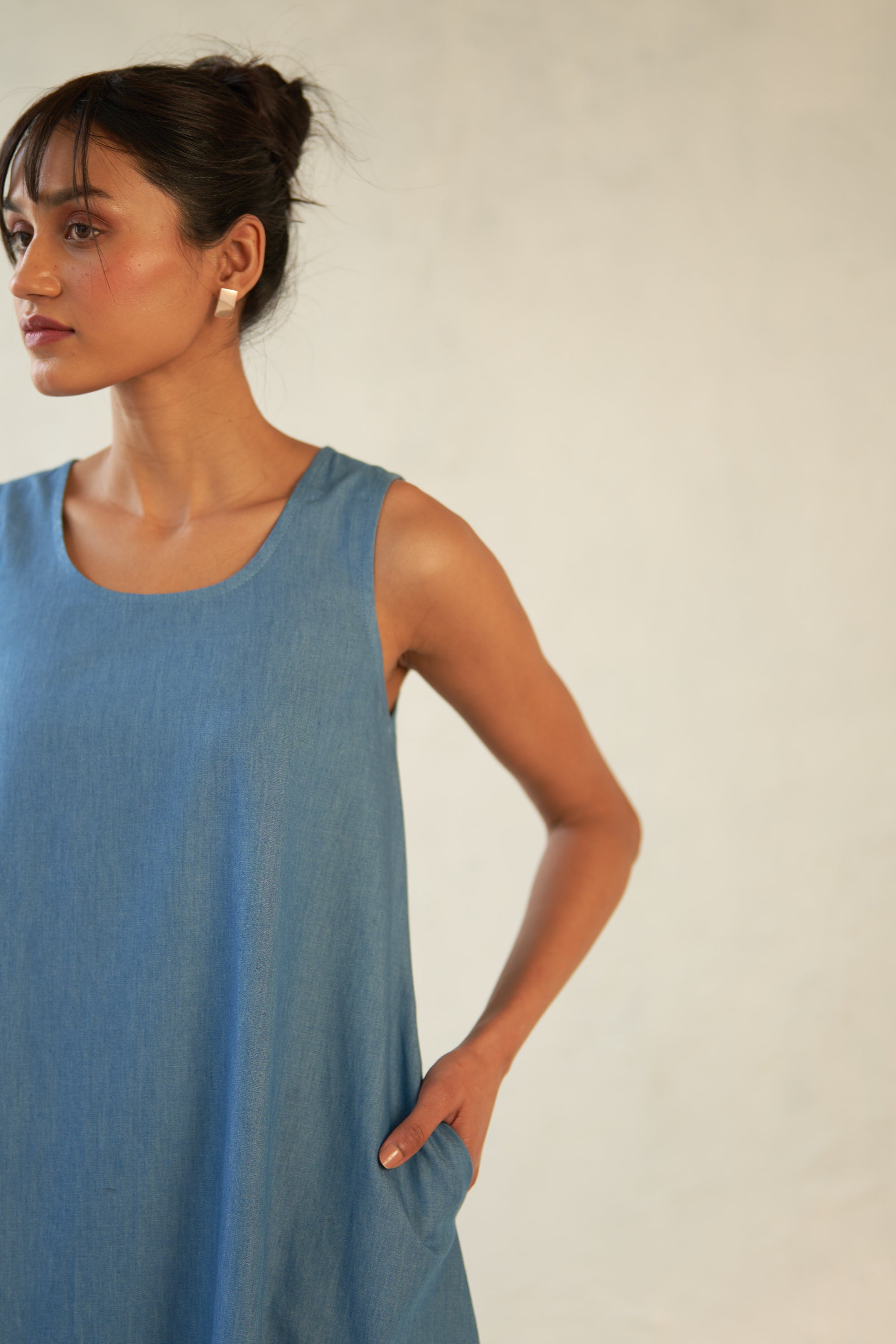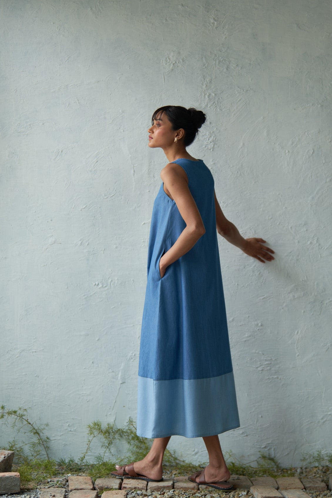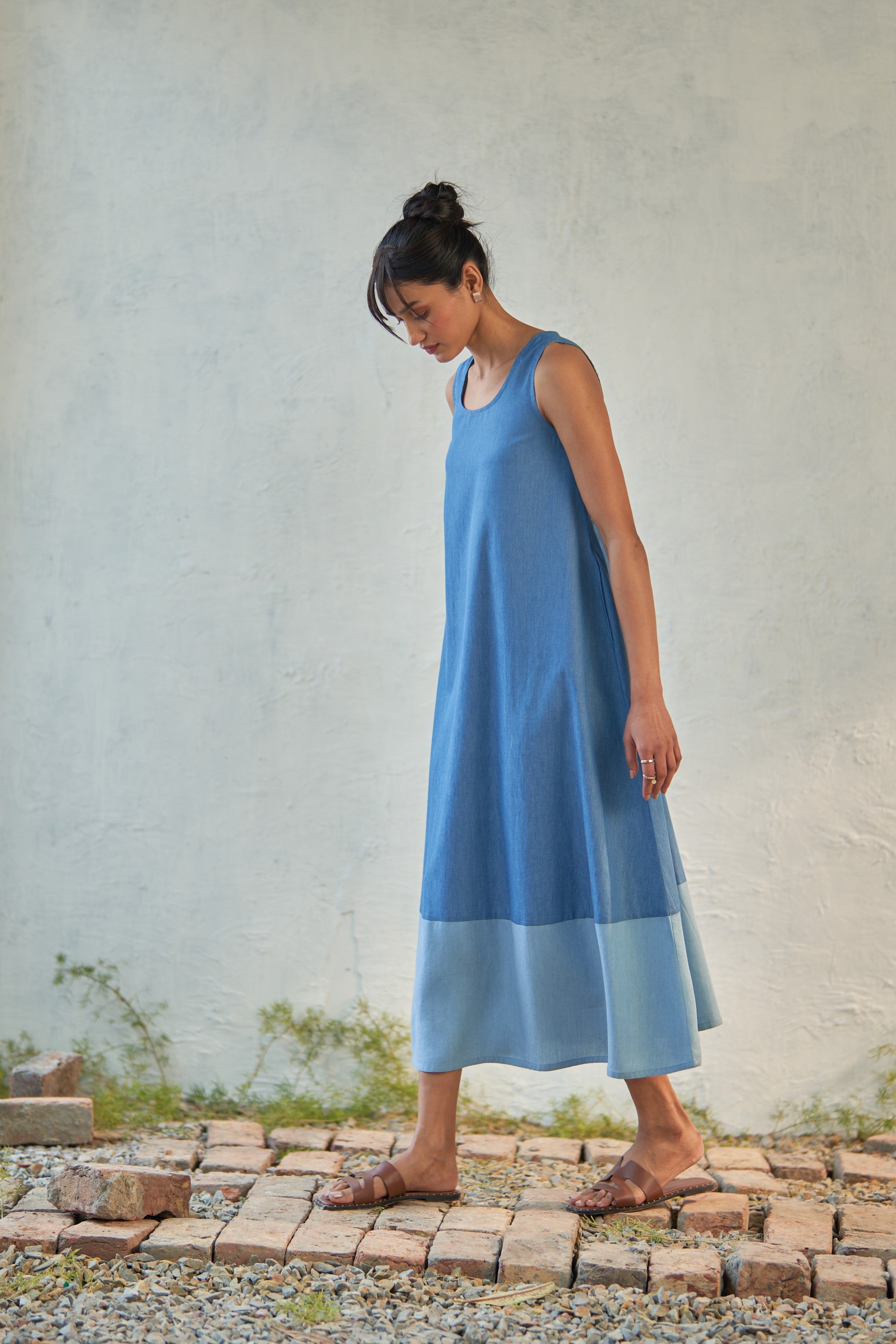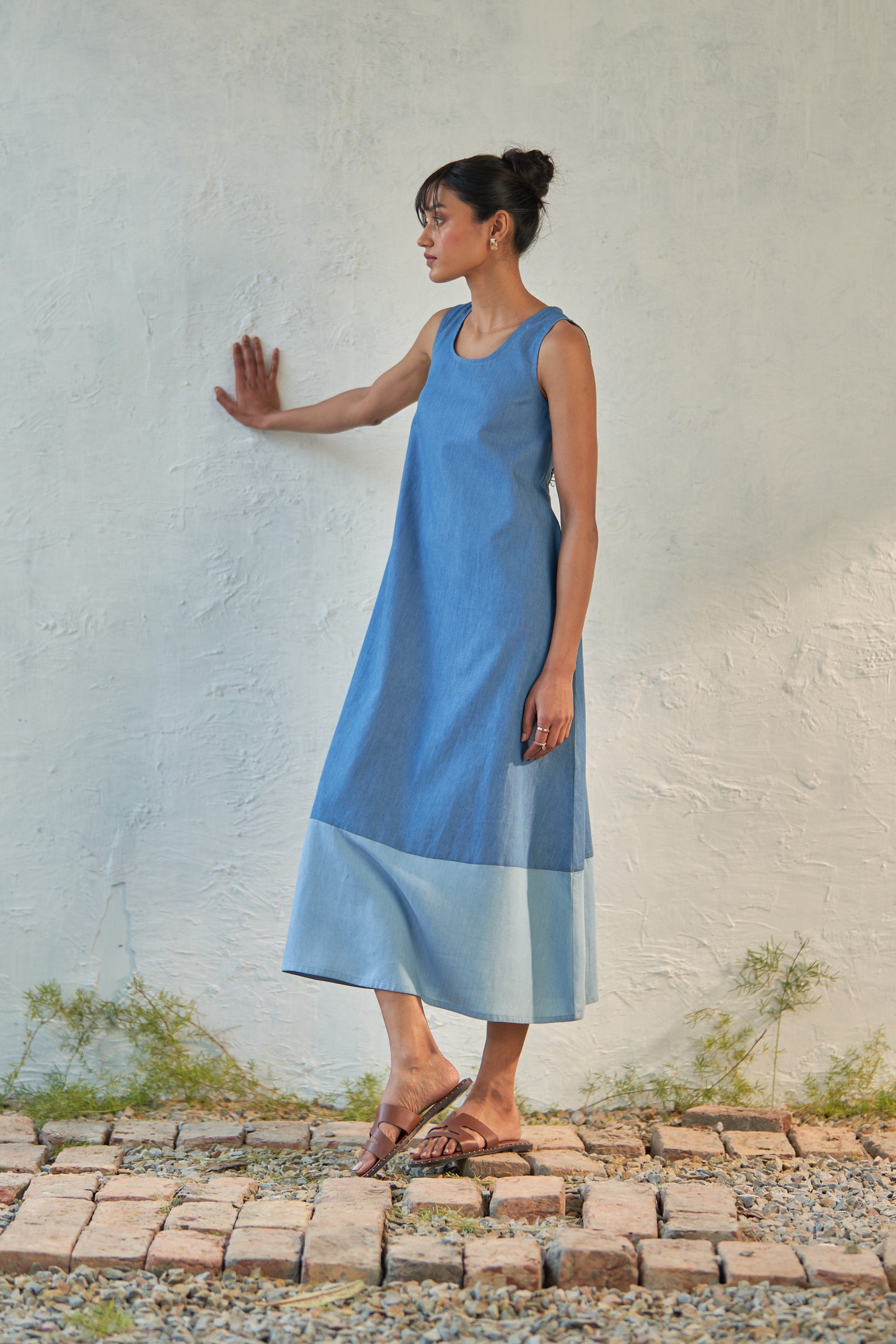 This dual-toned dress is crafted from soft denim fabric, designed to gently fall through the frame with a scoop neck and a curved hem. Sleeveless with a voluminous flare, it allows you to sway swiftly from morning to evening. Add it to your collection of no-brainer outfits.
