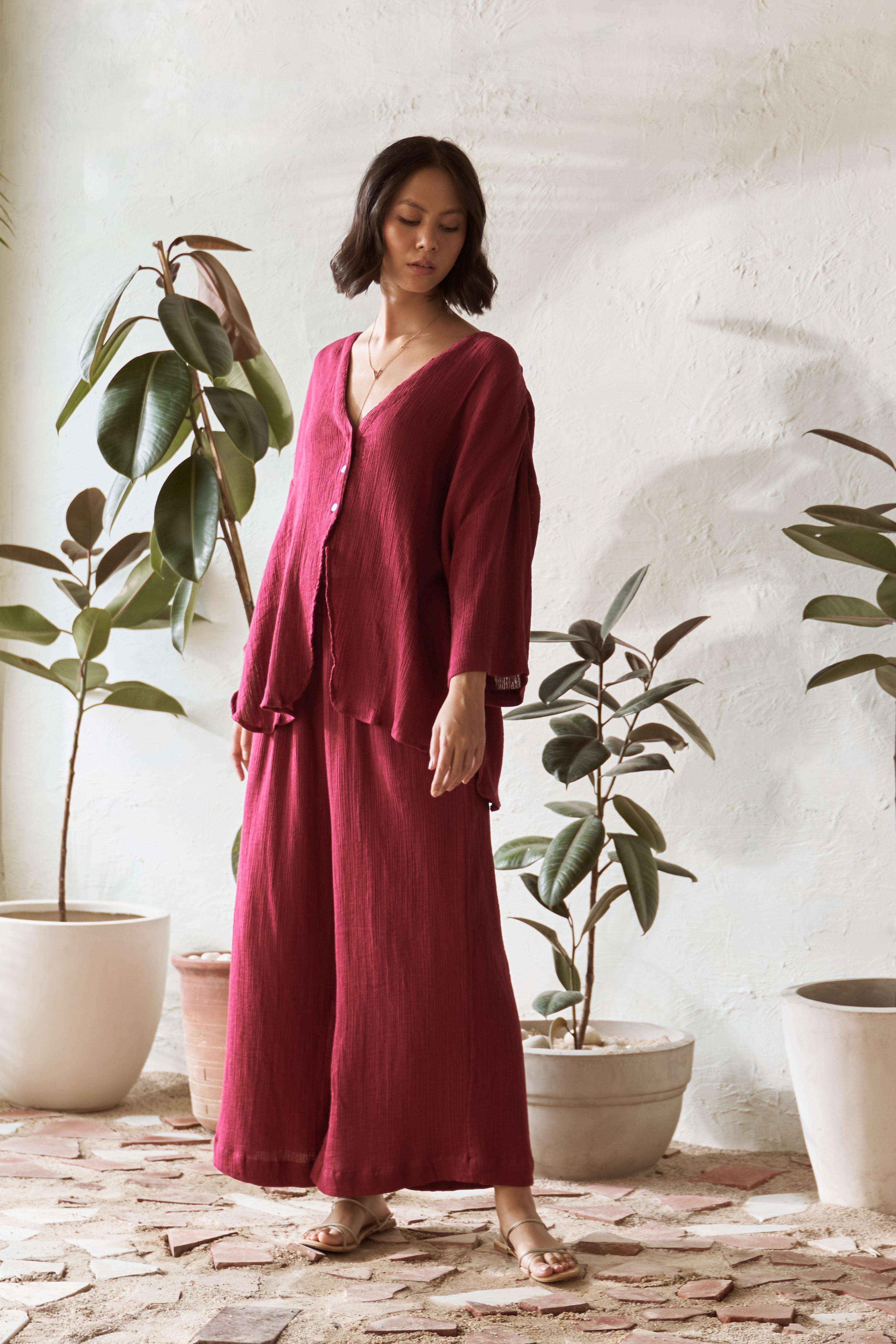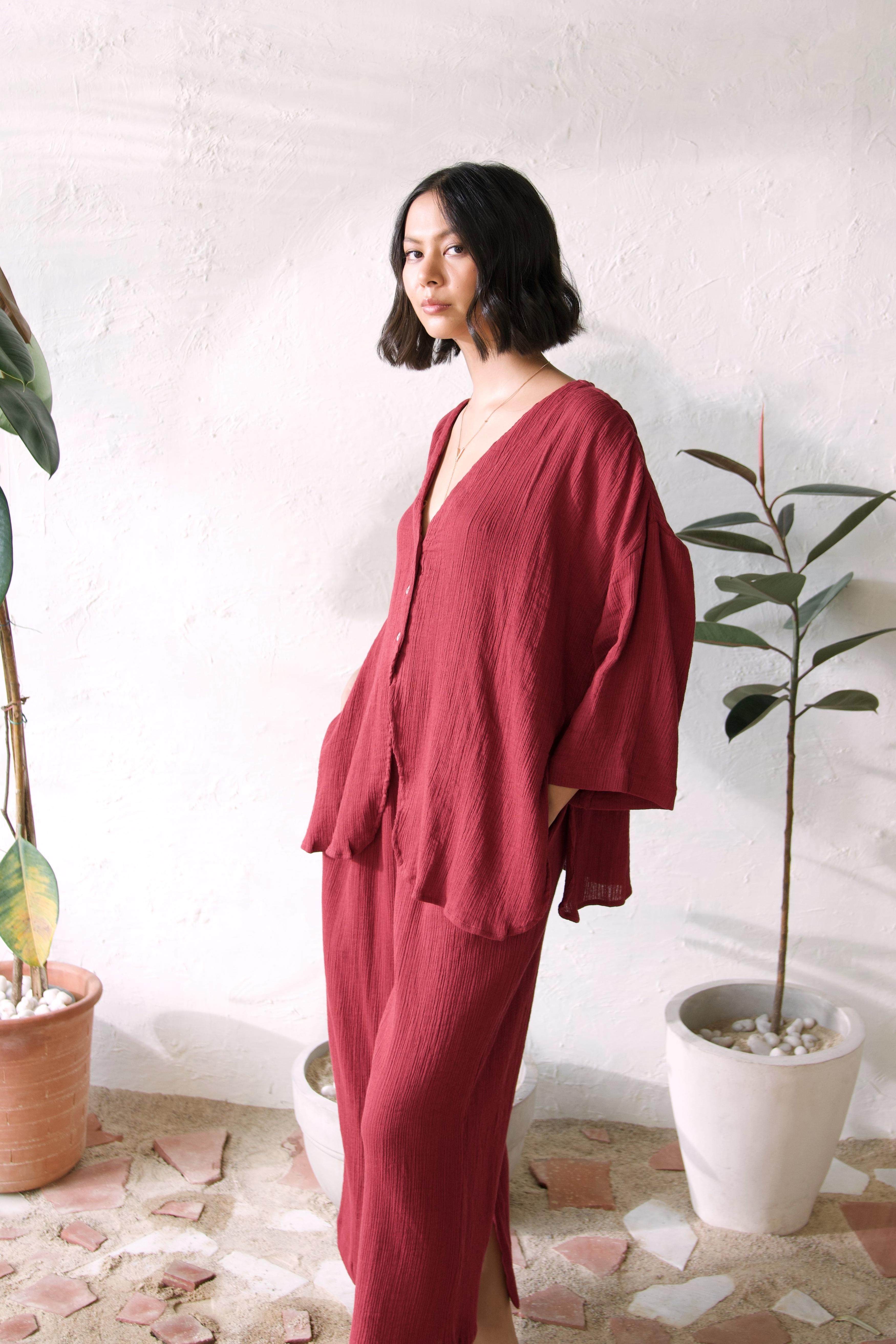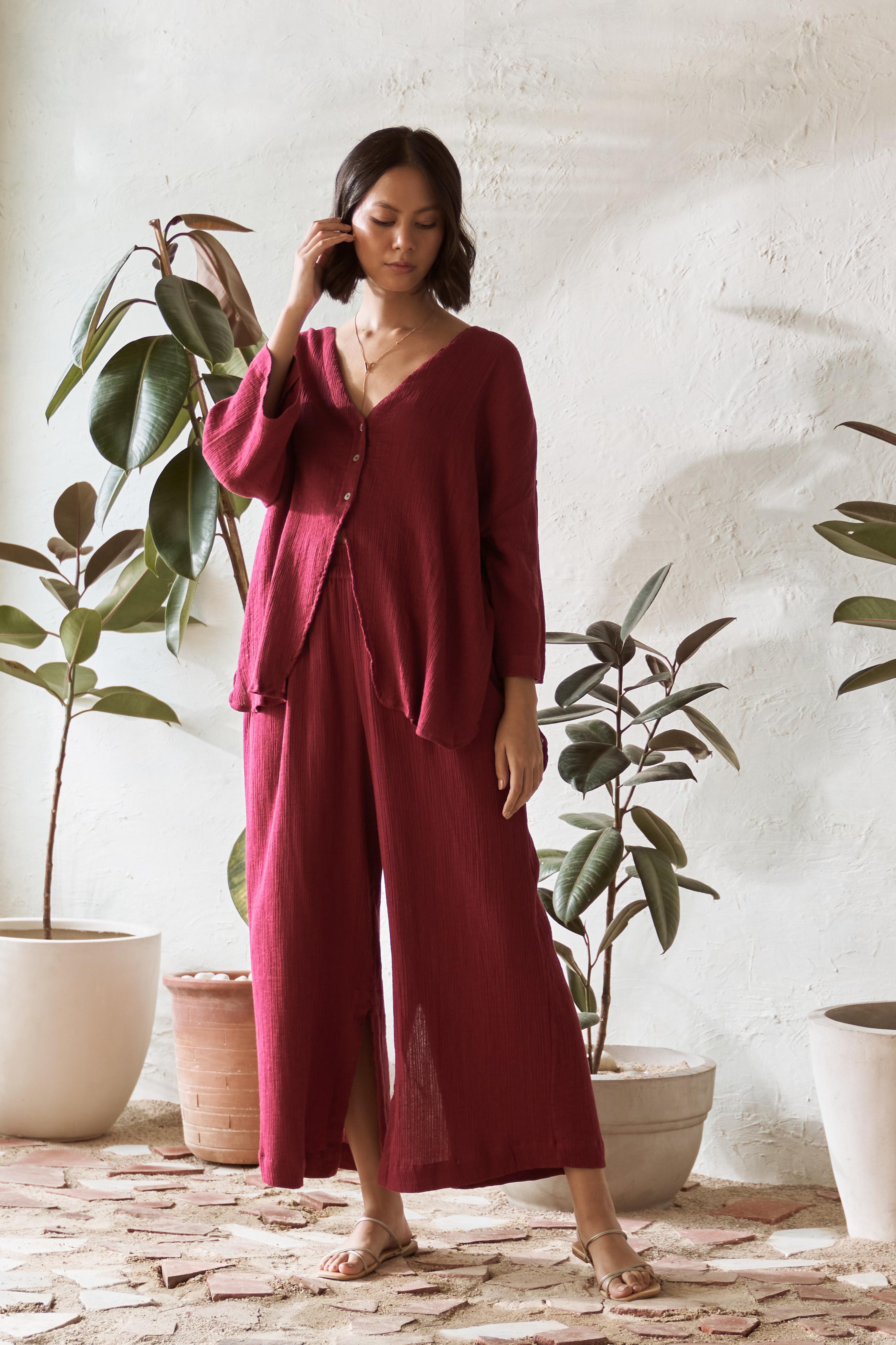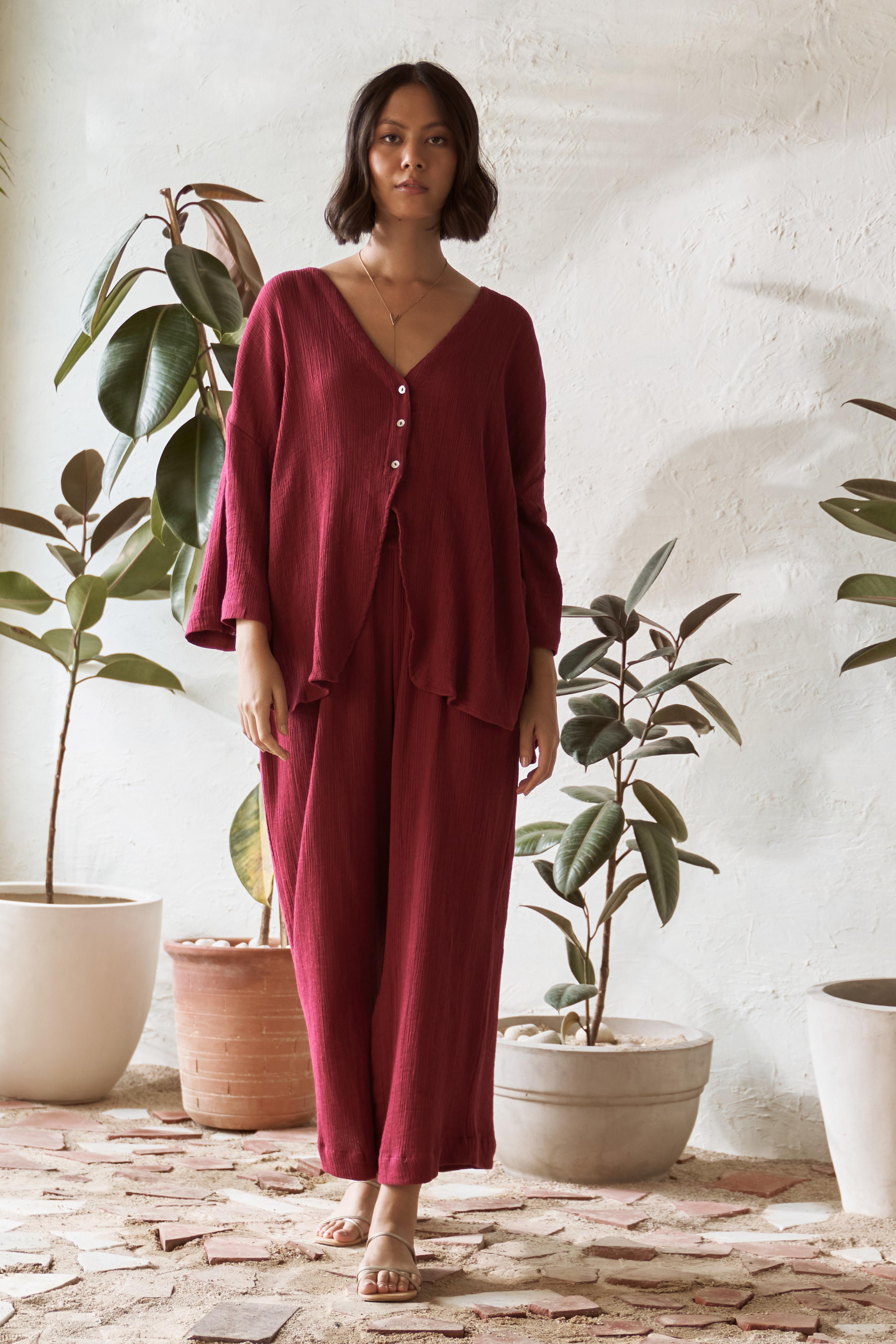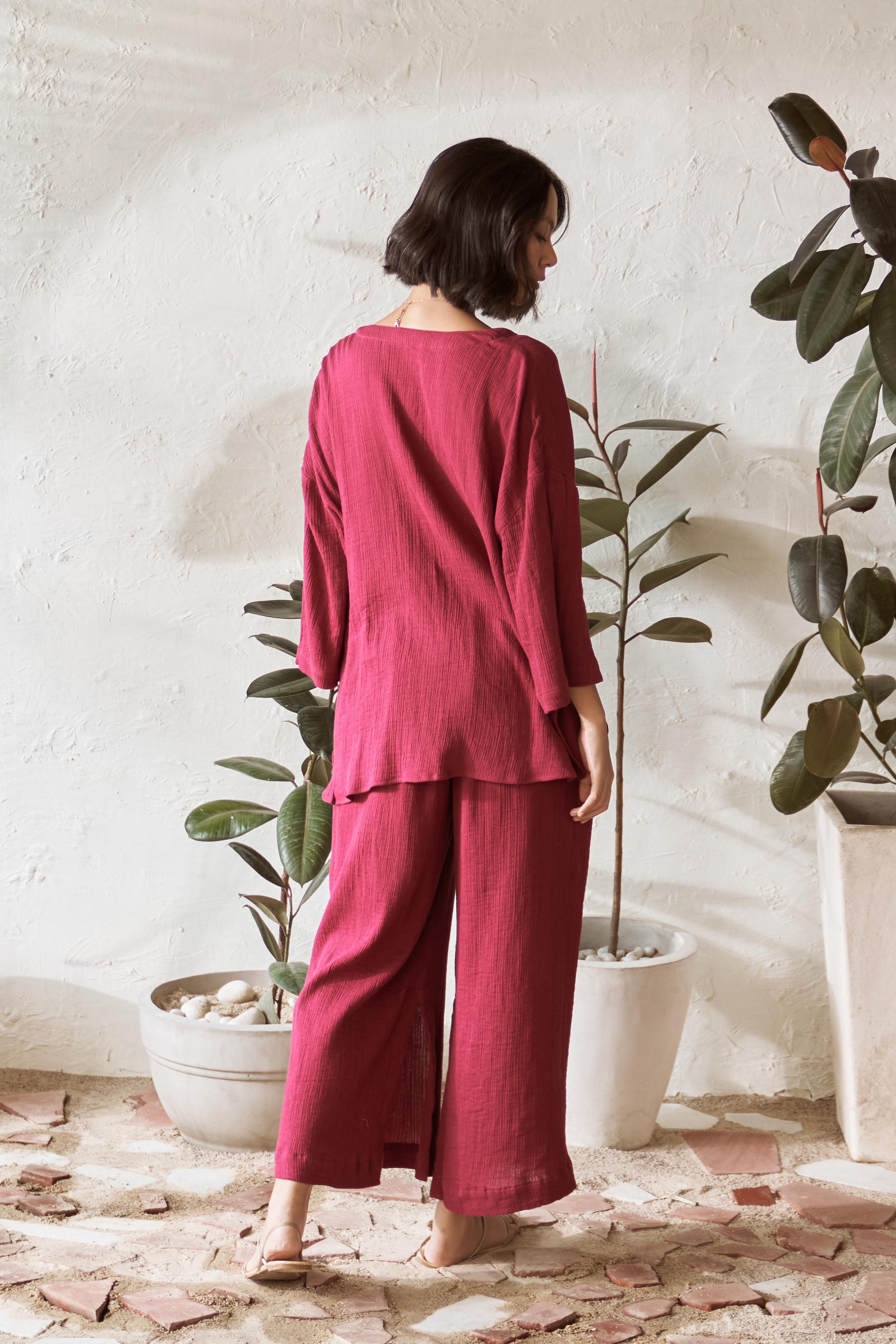 Elevate your wardrobe with this chic co-ord set, featuring a fresh take on the classic tailored shirt and stylish flared pants. The top boasts a plunging neckline without collars, seamlessly merging into a short placket and free-flowing panels, making it perfect for layering or wearing on its own. Its modern oversized shape, tonal buttons, and slightly curved edges provide a contemporary twist, adding a touch of elegance to any outfit. Paired with flared pants that have an elasticated waistband for comfort, practical side pockets, and a smart slit at the bottom, this co-ord set is designed for effortless style and versatility, perfect for any occasion.