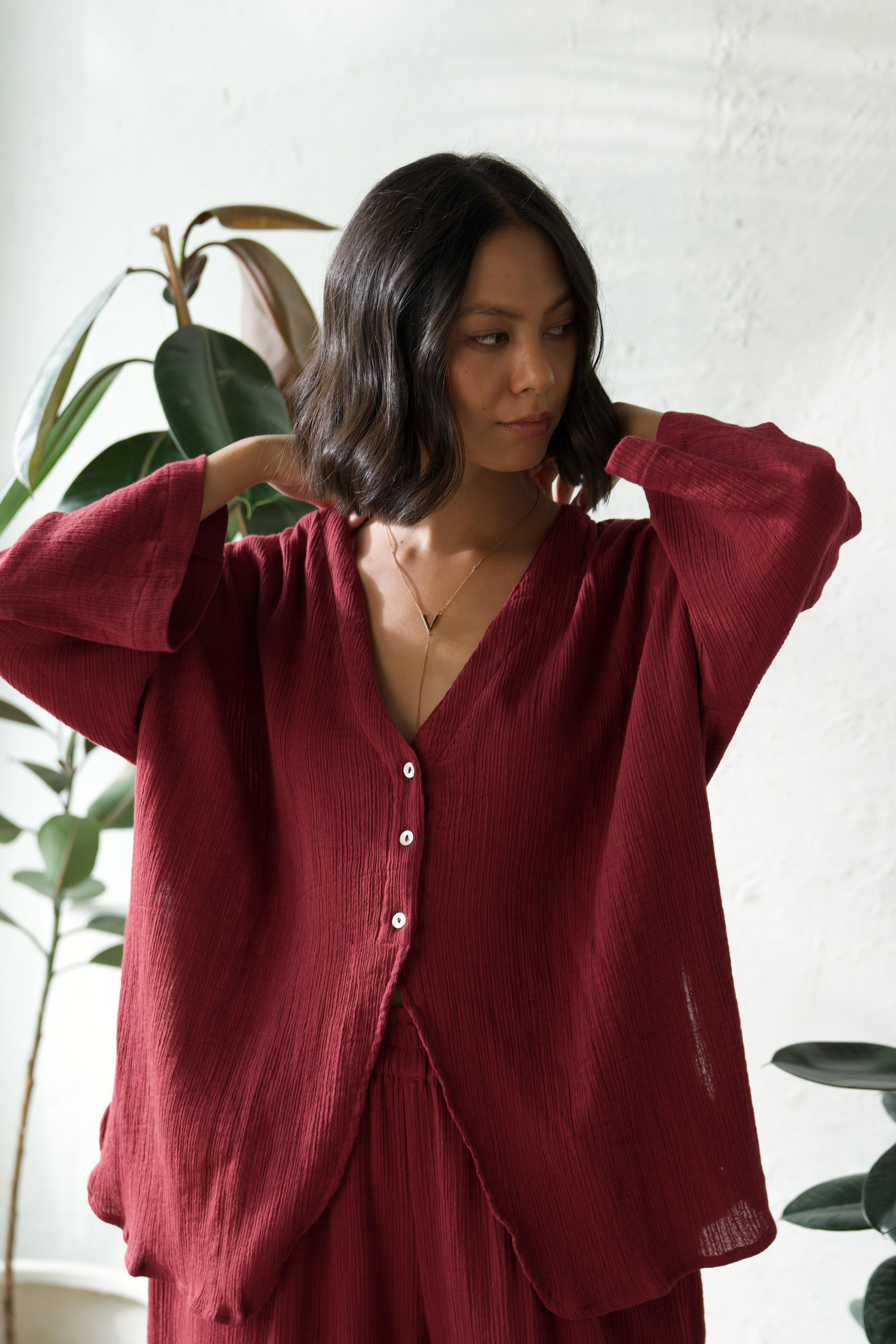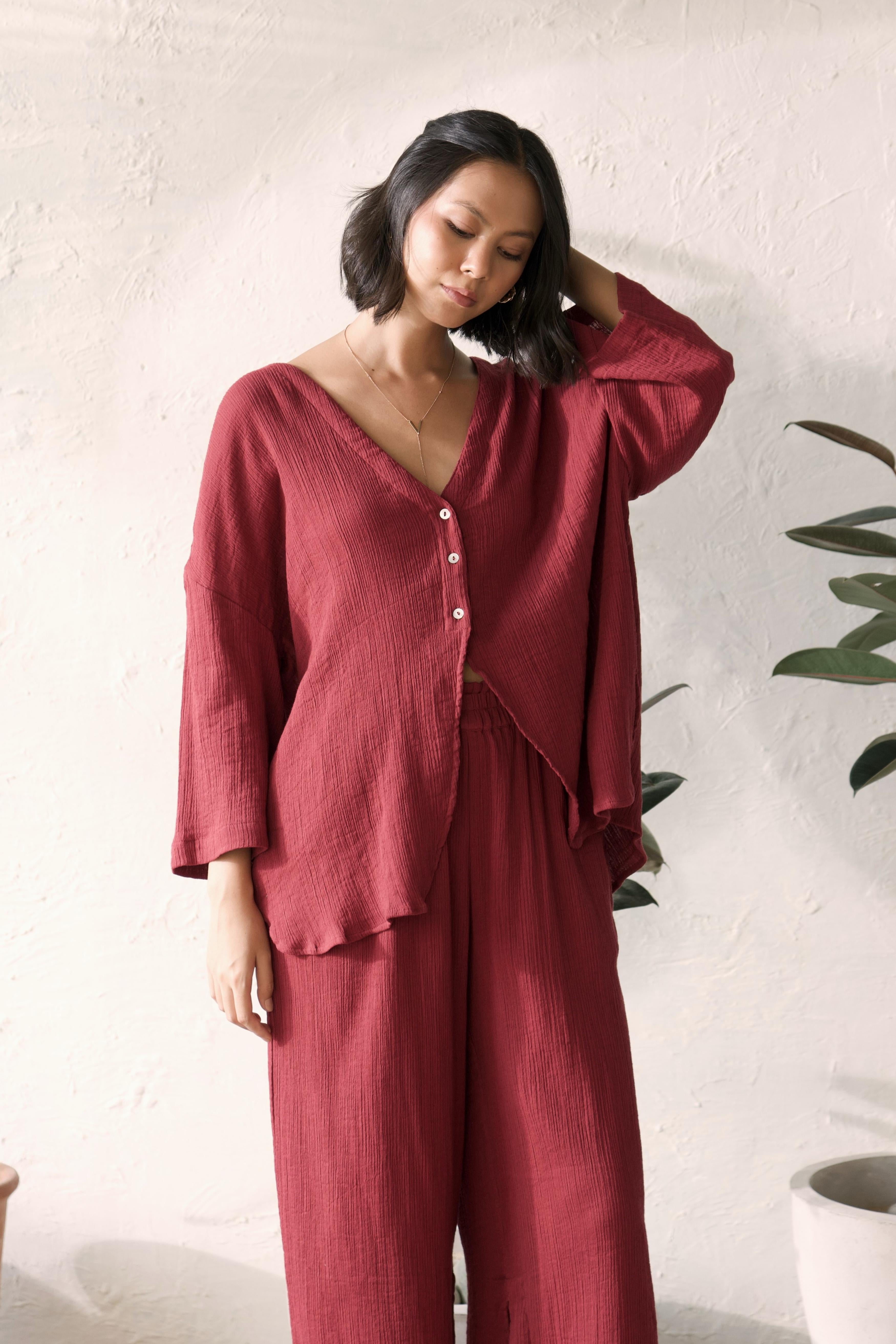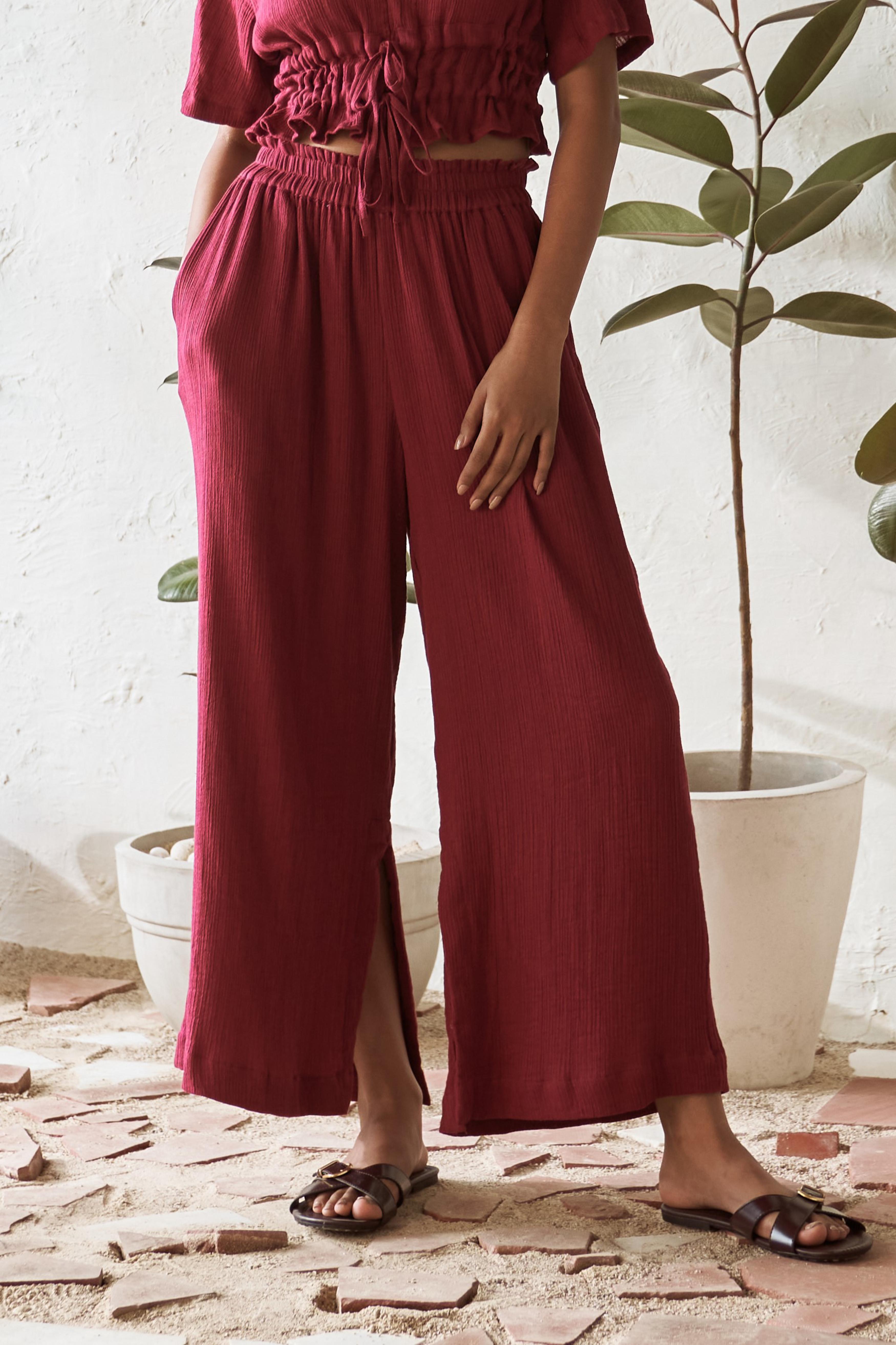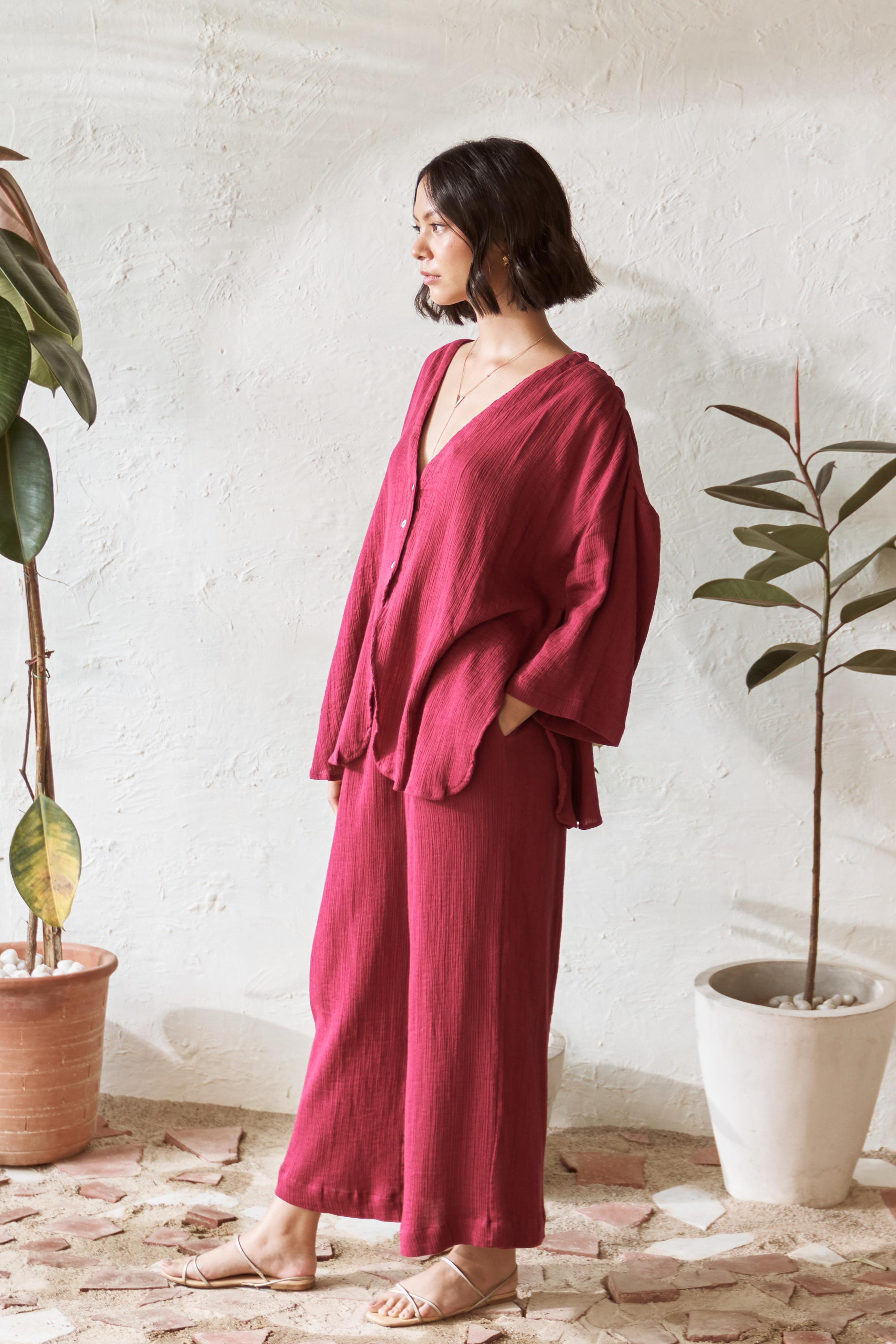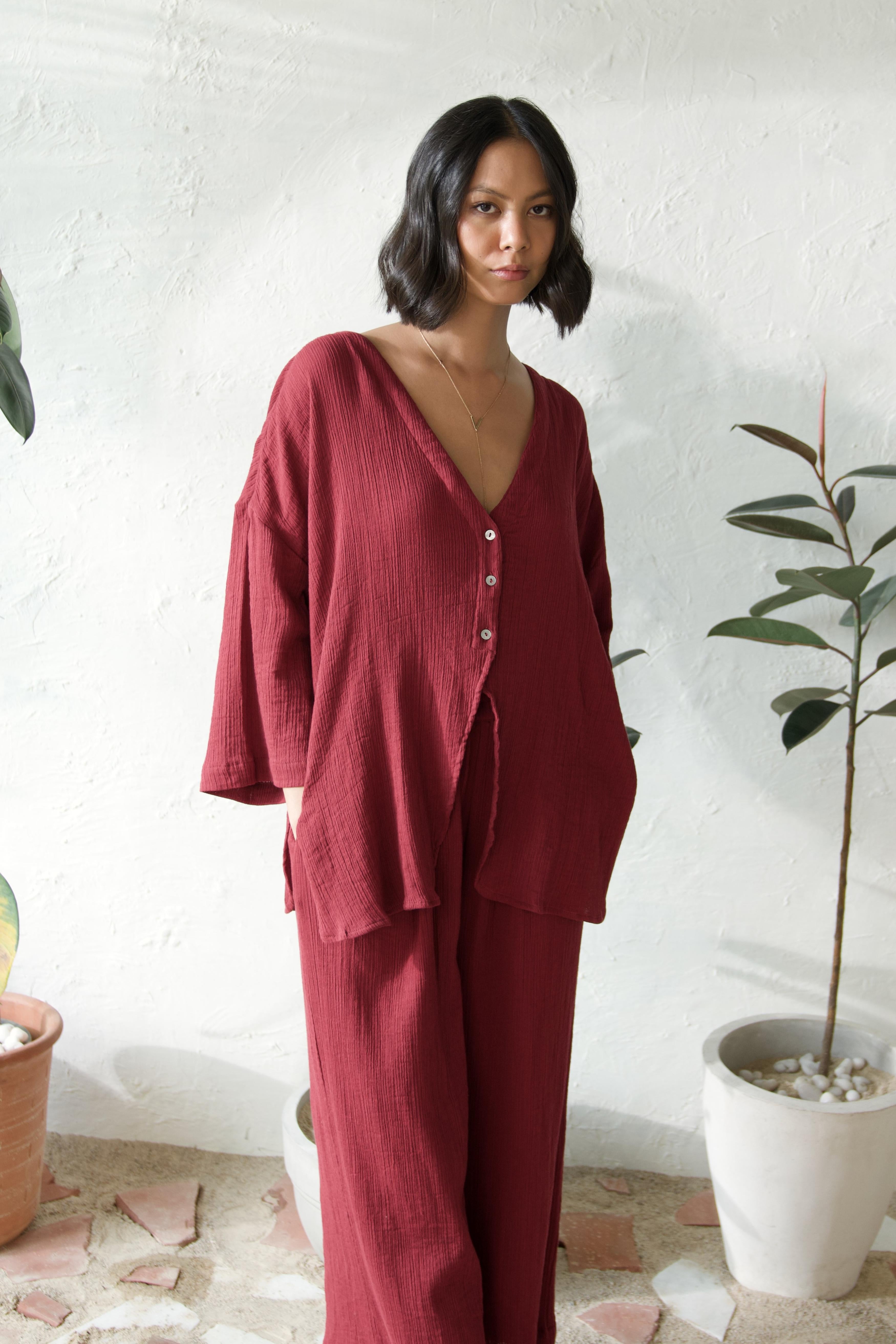 Elevate your wardrobe with this chic co-ord set, featuring a fresh take on the classic tailored shirt and stylish flared pants. The top boasts a plunging neckline without collars, seamlessly merging into a short placket and free-flowing panels, making it perfect for layering or wearing on its own. Its modern oversized shape, tonal buttons, and slightly curved edges provide a contemporary twist, adding a touch of elegance to any outfit. Paired with flared pants that have an elasticated waistband for comfort, practical side pockets, and a smart slit at the bottom, this co-ord set is designed for effortless style and versatility, perfect for any occasion.