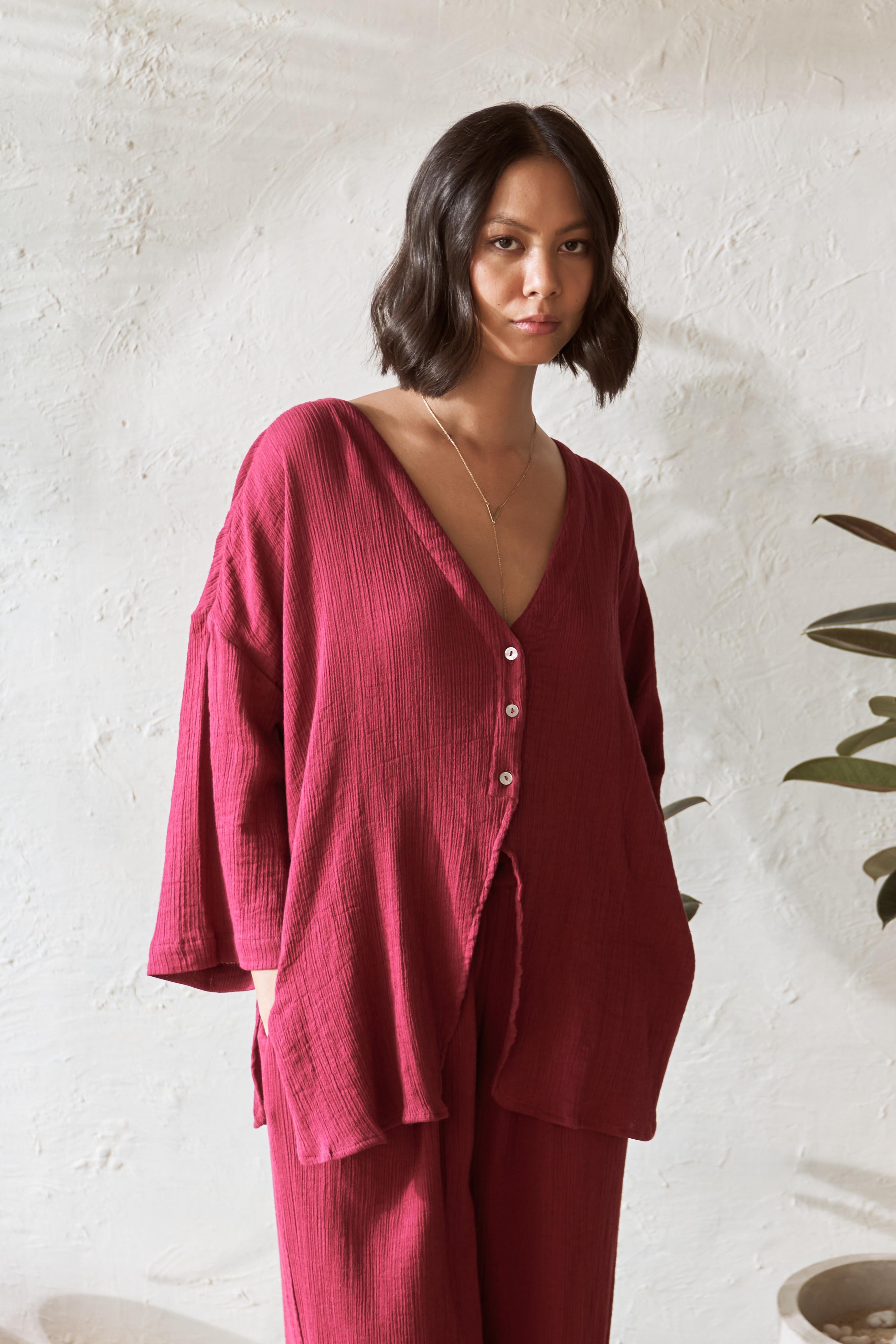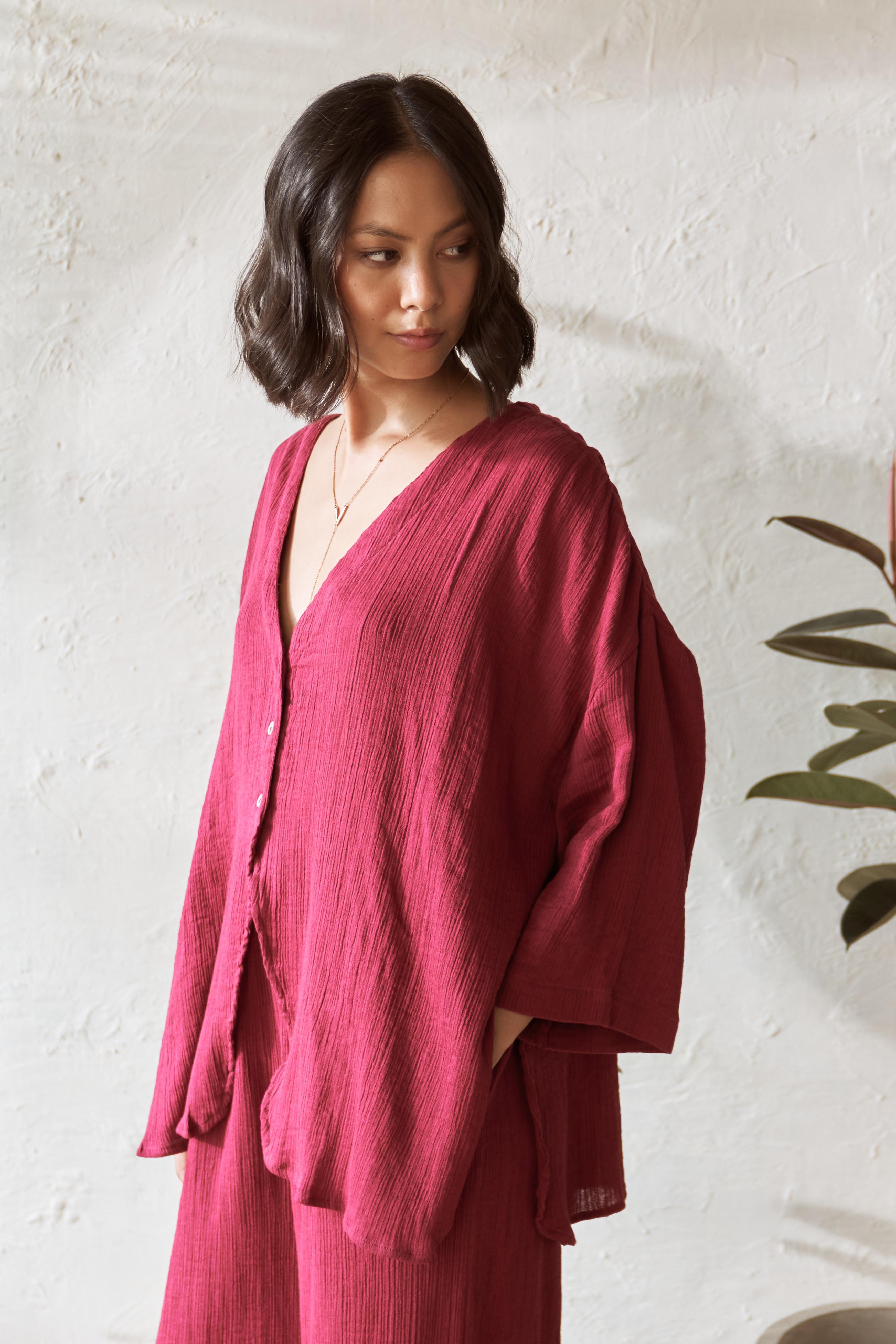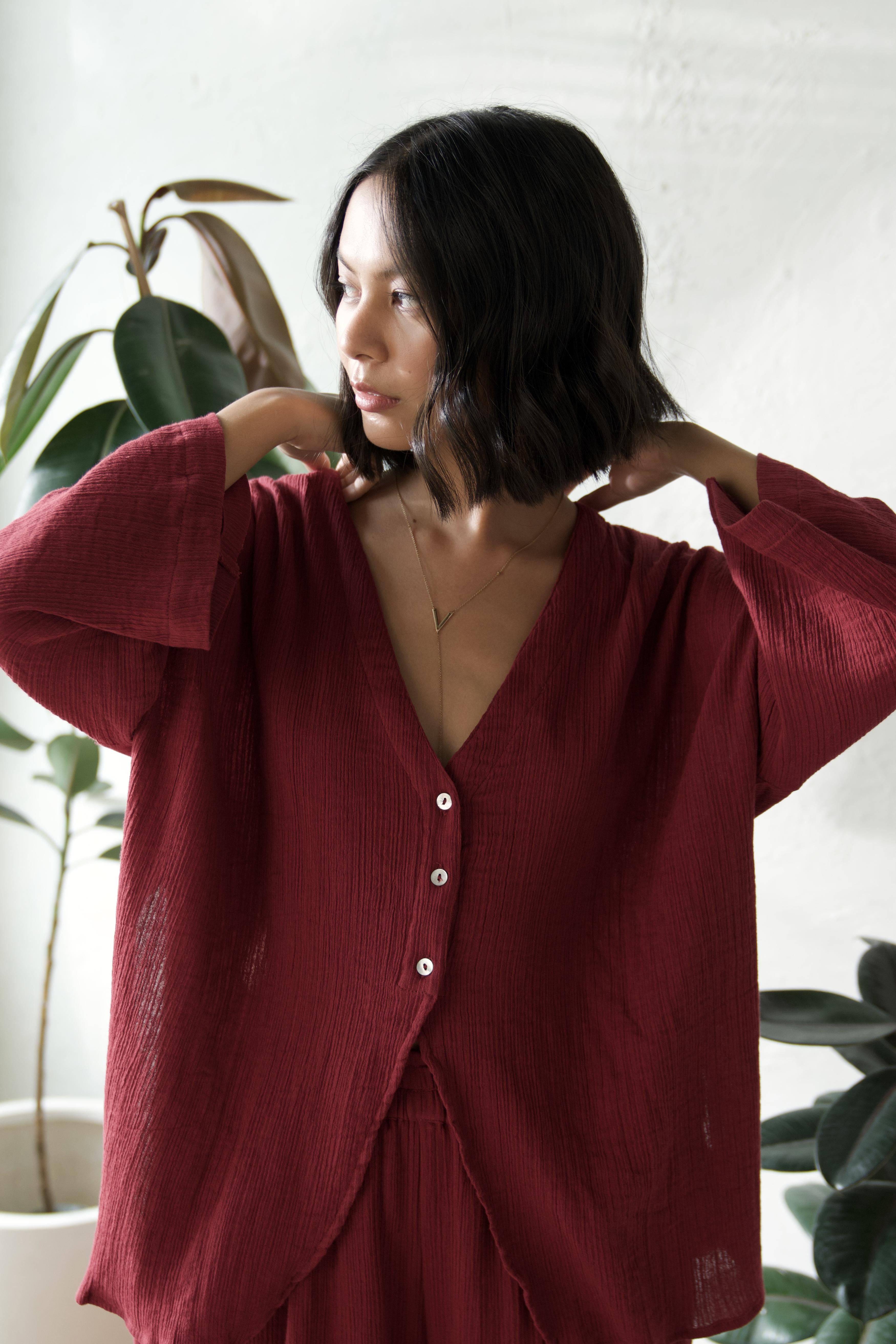 Taking inspiration from travelers who are constantly exploring, this silhouette offers a fresh interpretation of the classic tailored shirt. The plunging neckline, devoid of collars, seamlessly merges into a short placket and free-flowing panels. This shirt features a modern oversized shape, allowing for easy layering over tees. Tonal buttons and slightly curved edges add the finishing touches.