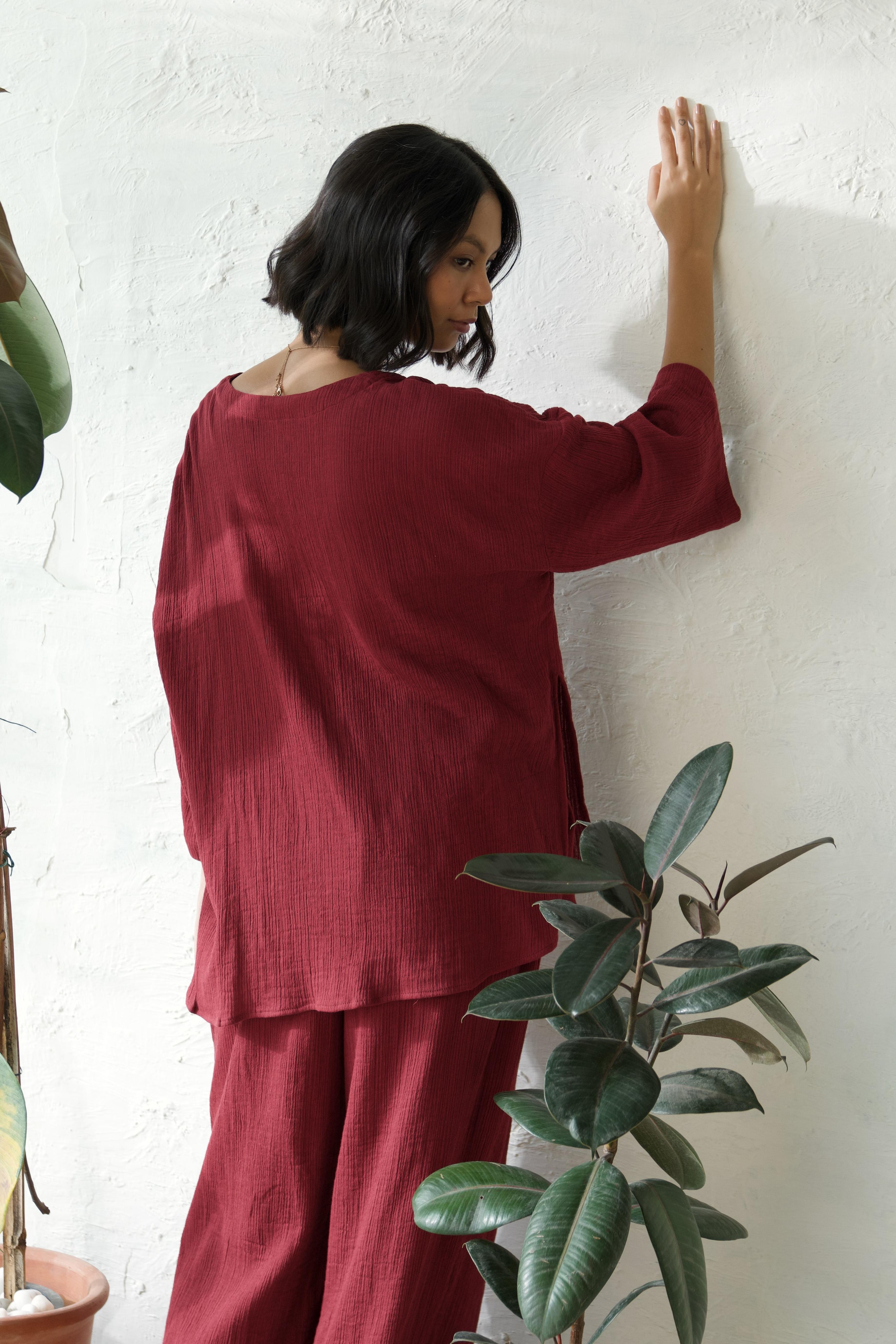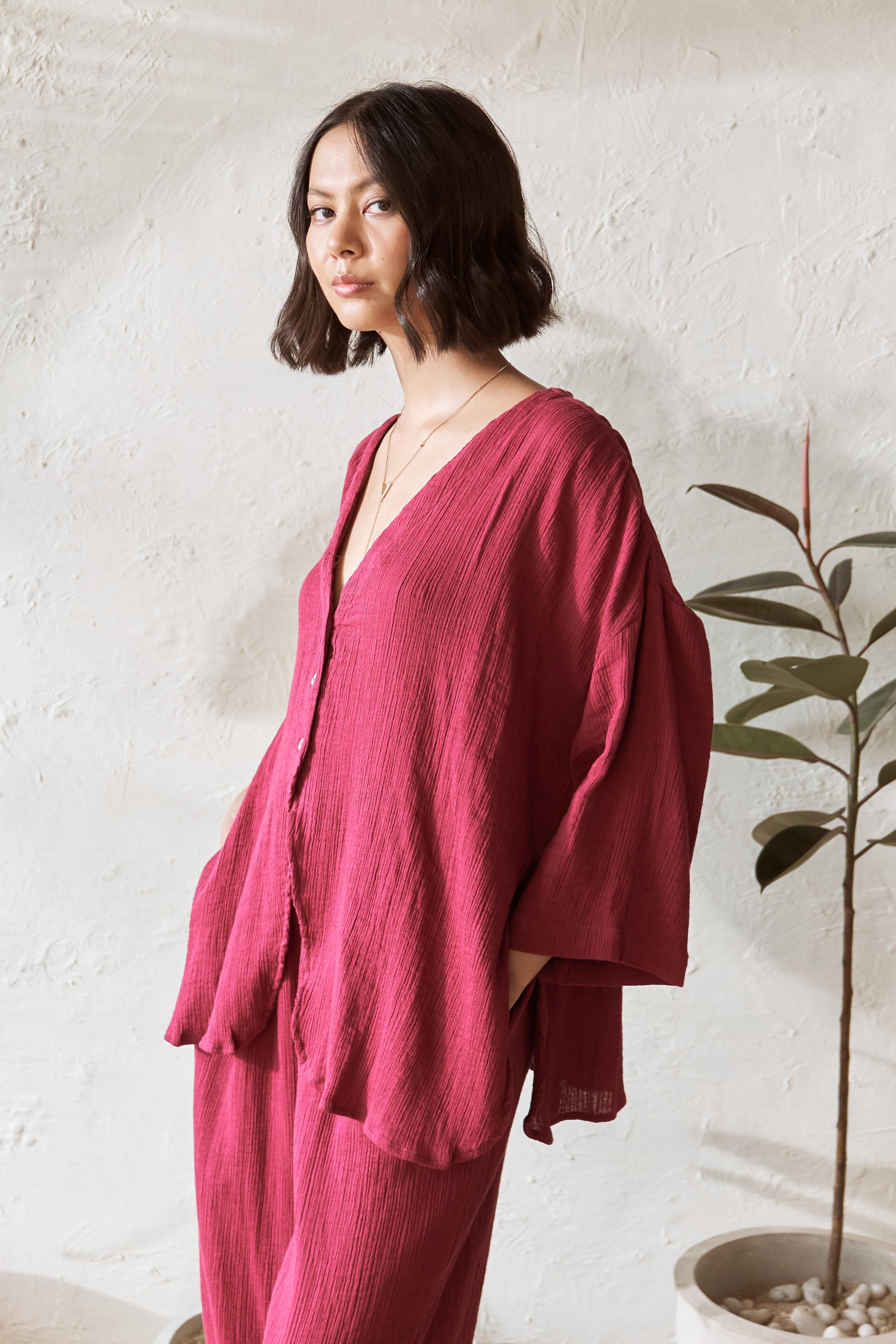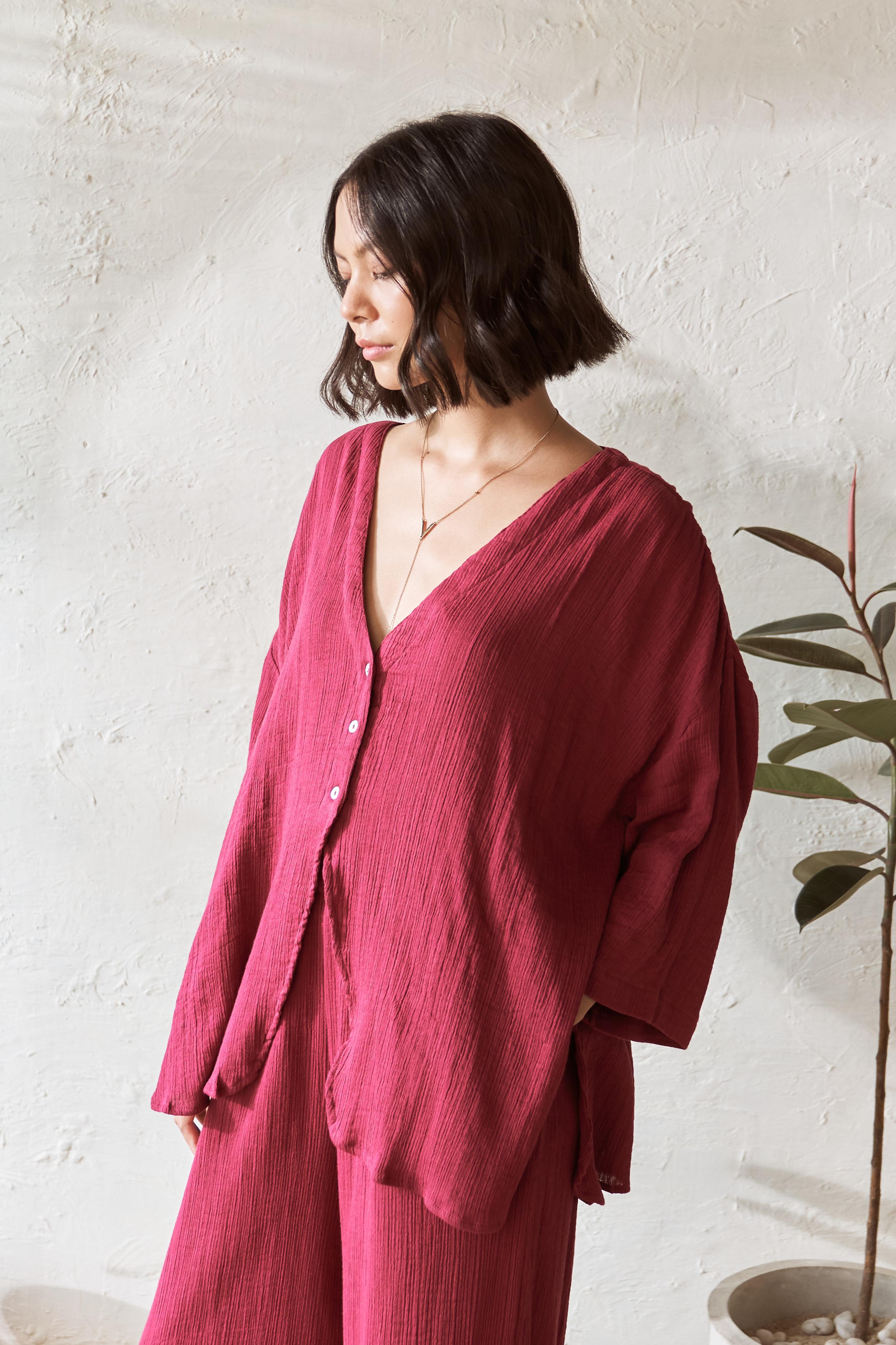 Taking inspiration from travelers who are constantly exploring, this silhouette offers a fresh interpretation of the classic tailored shirt. The plunging neckline, devoid of collars, seamlessly merges into a short placket and free-flowing panels. This shirt features a modern oversized shape, allowing for easy layering over tees. Tonal buttons and slightly curved edges add the finishing touches.