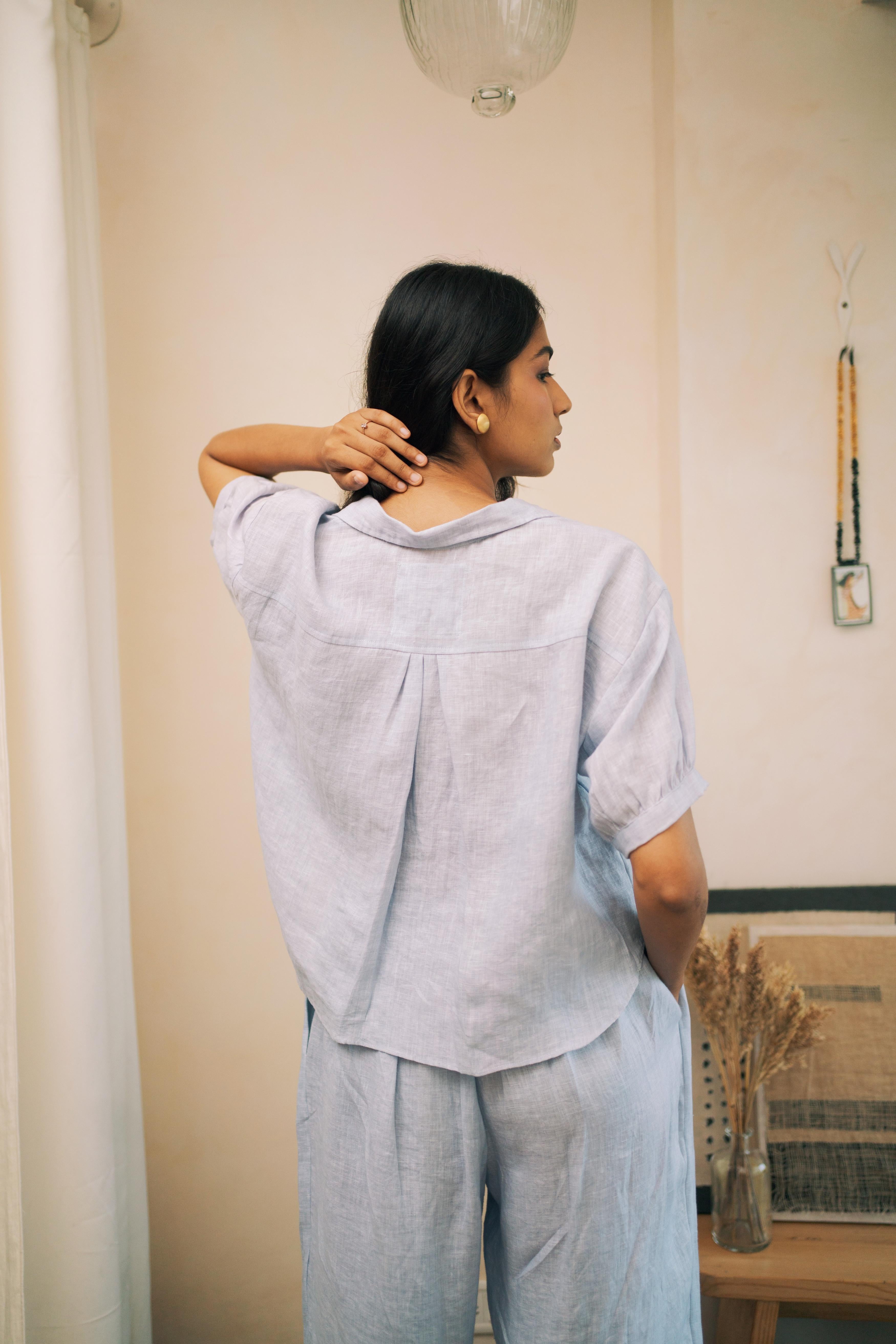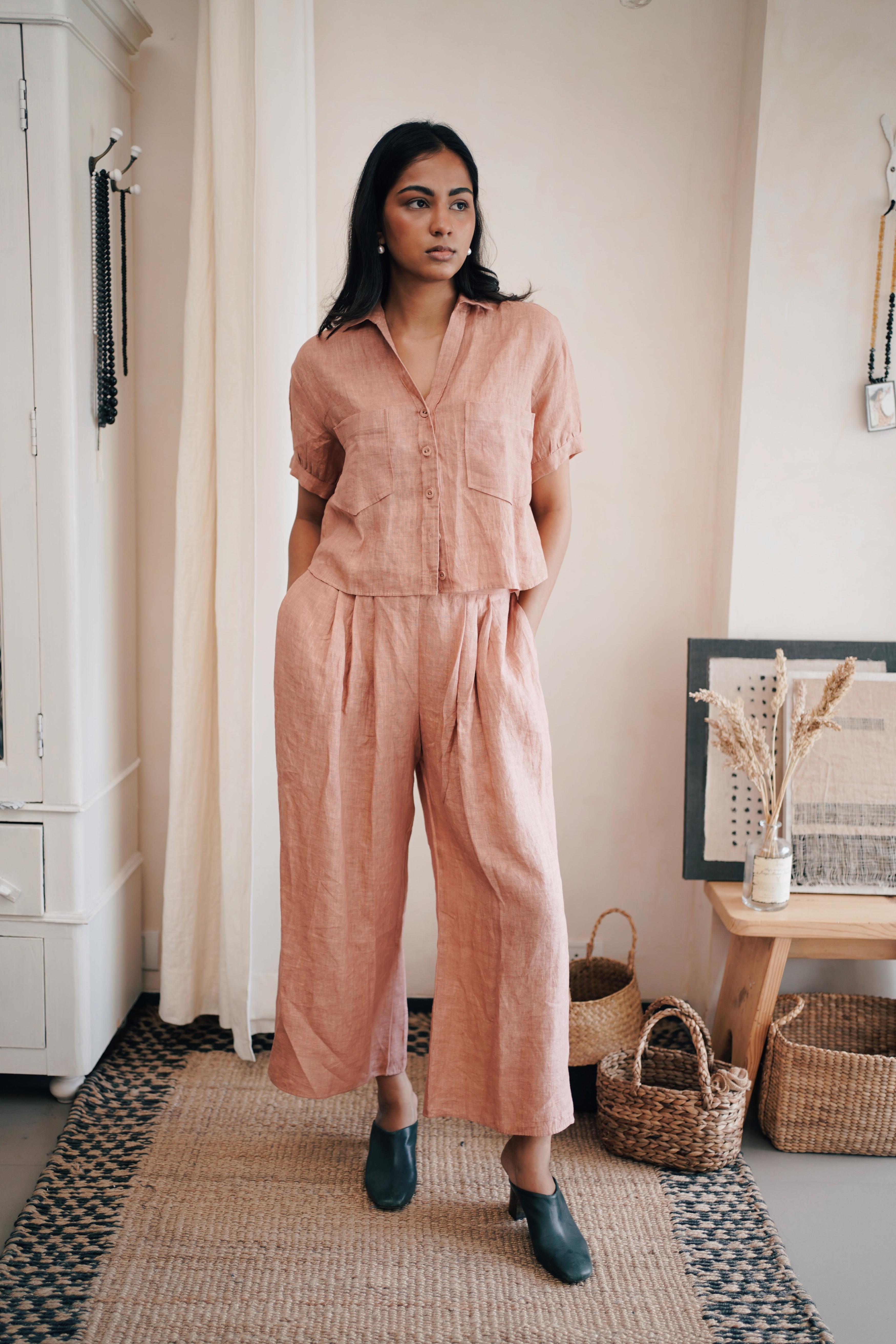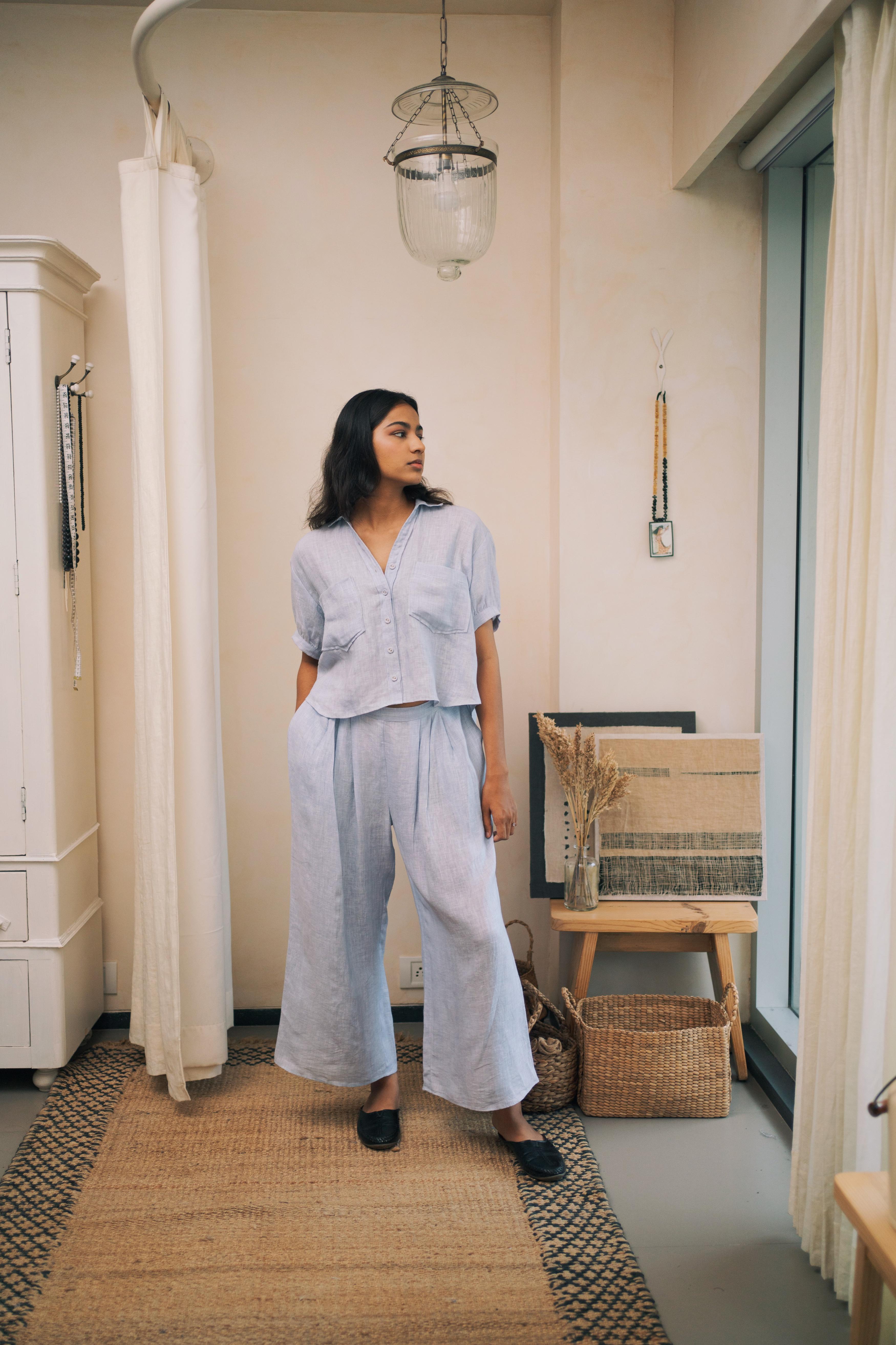 Smart button-down shirt with a deep V-neck and two side pockets on the chest giving it a complete look with ruffed pleated sleeves till elbow. Paired up with pleated pants making it a comfortable co-ord set.