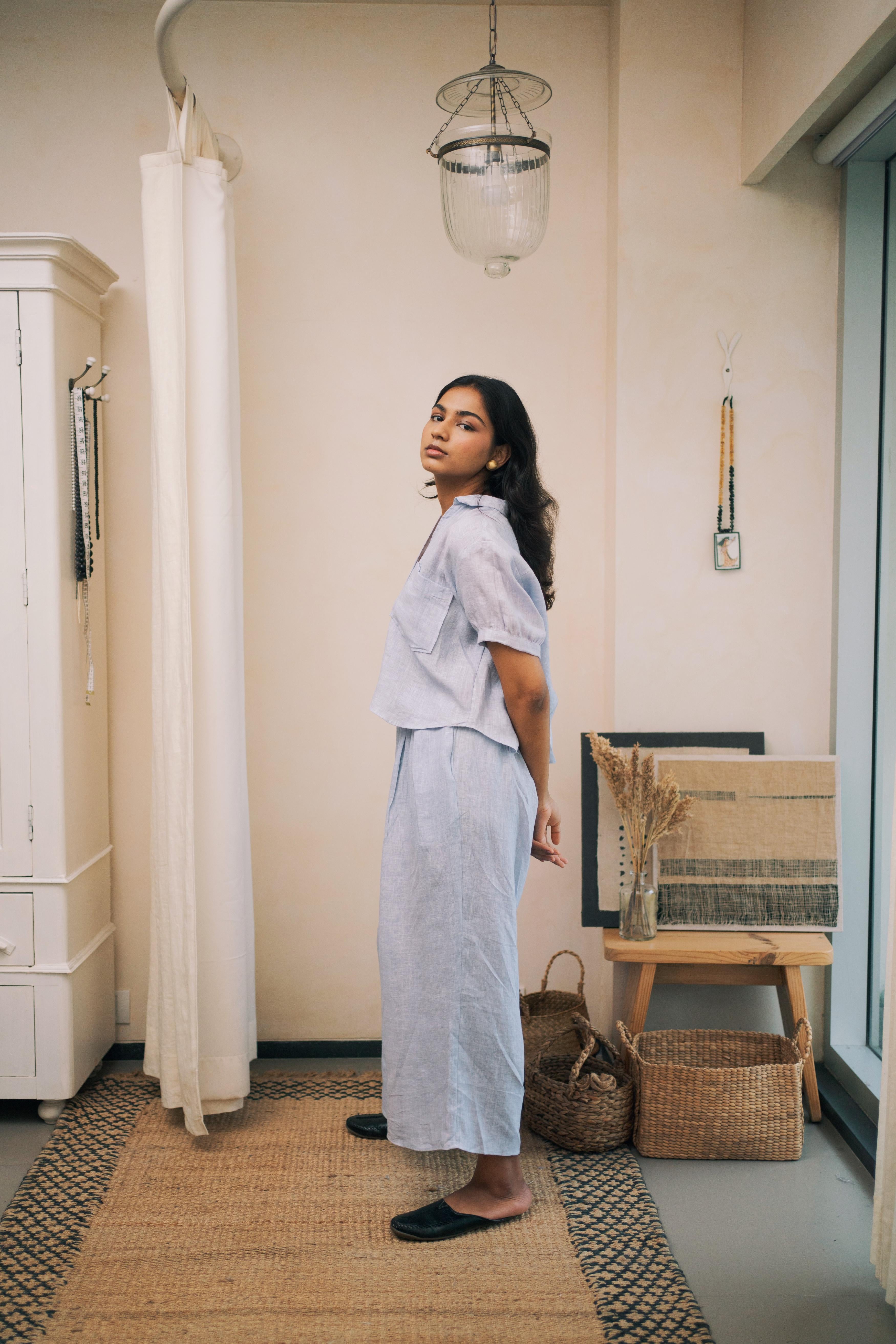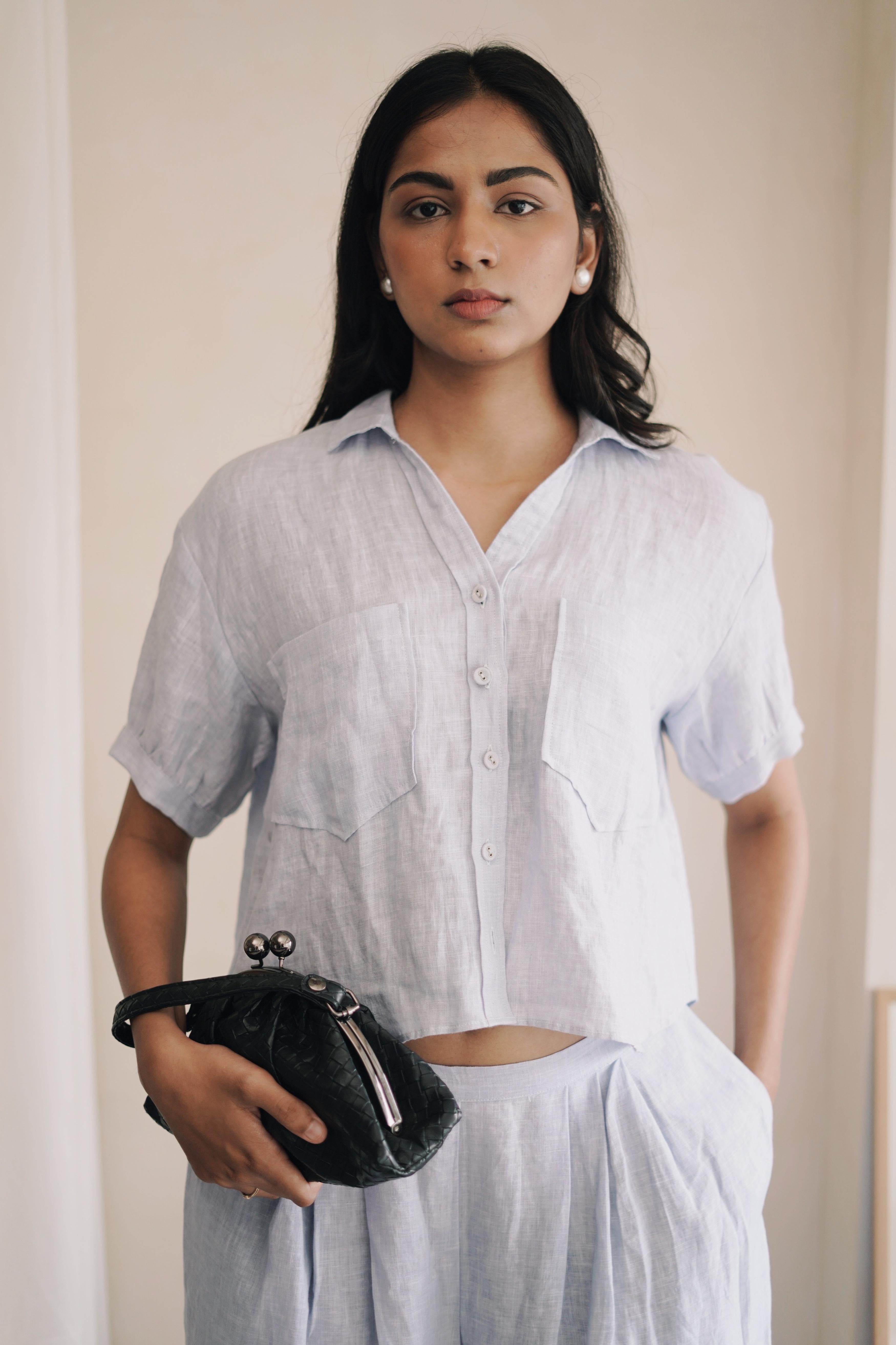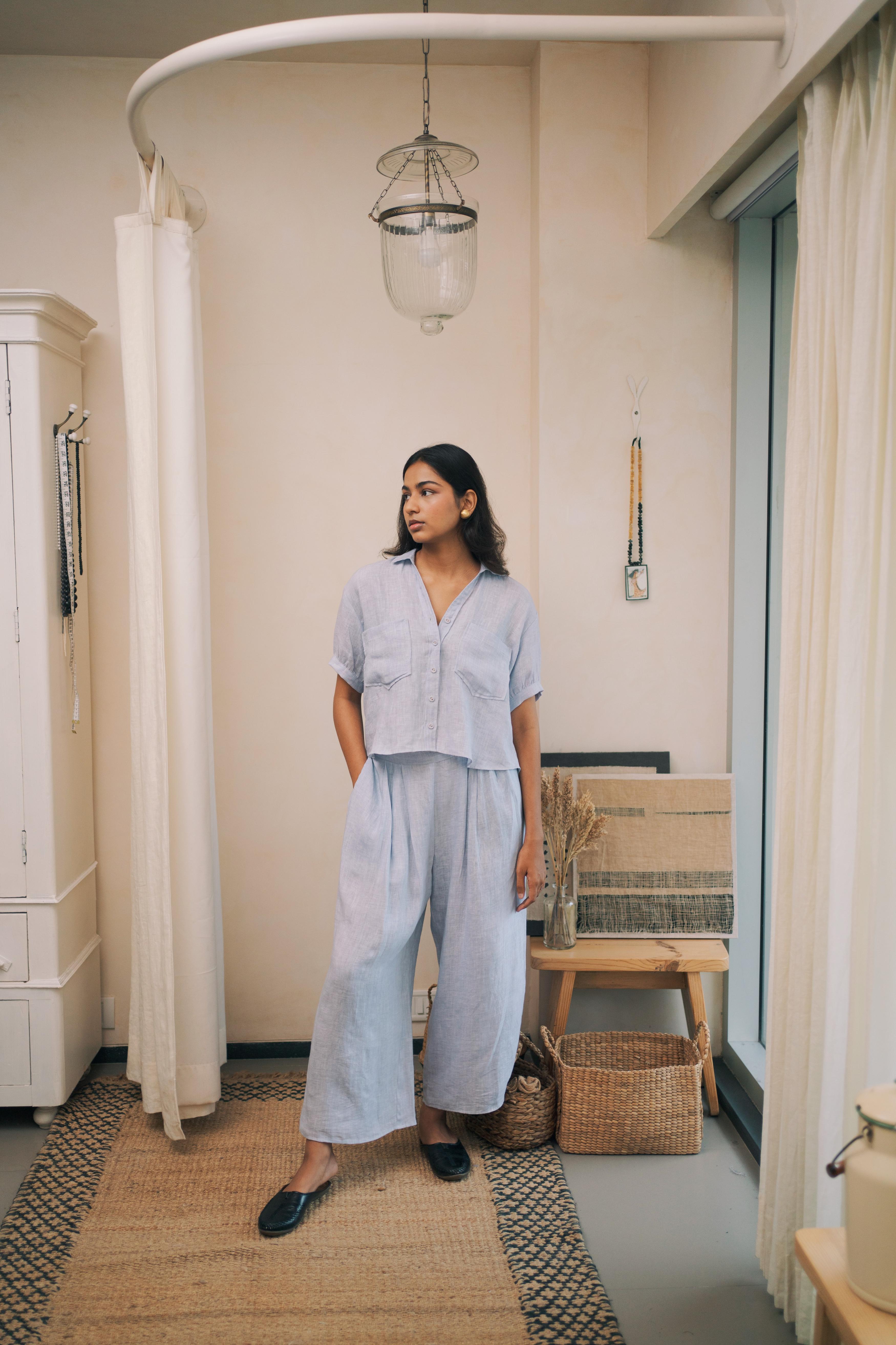 Smart button-down shirt with a deep V-neck and two side pockets on the chest giving it a complete look with ruffed pleated sleeves till elbow. Paired up with pleated pants making it a comfortable co-ord set.