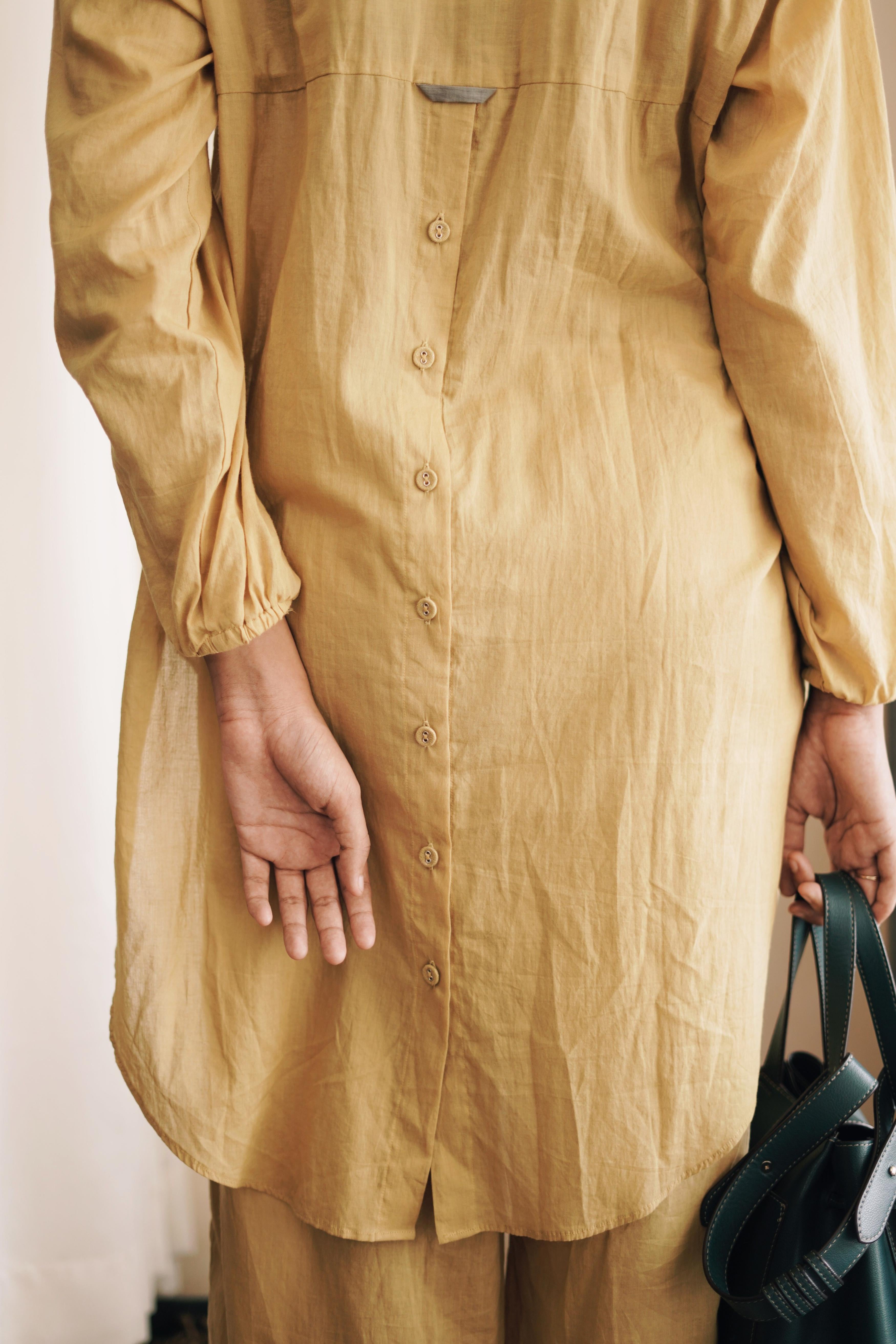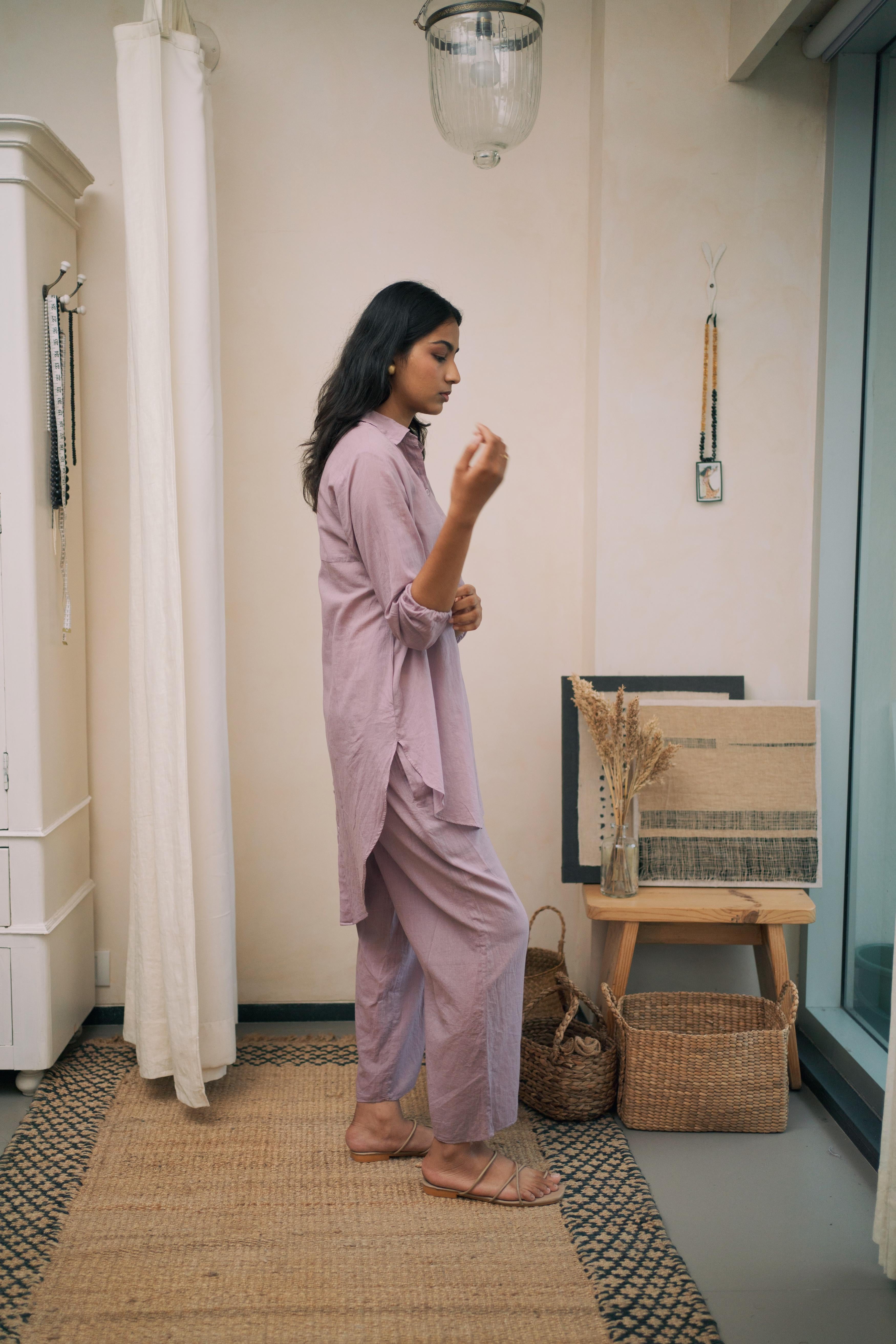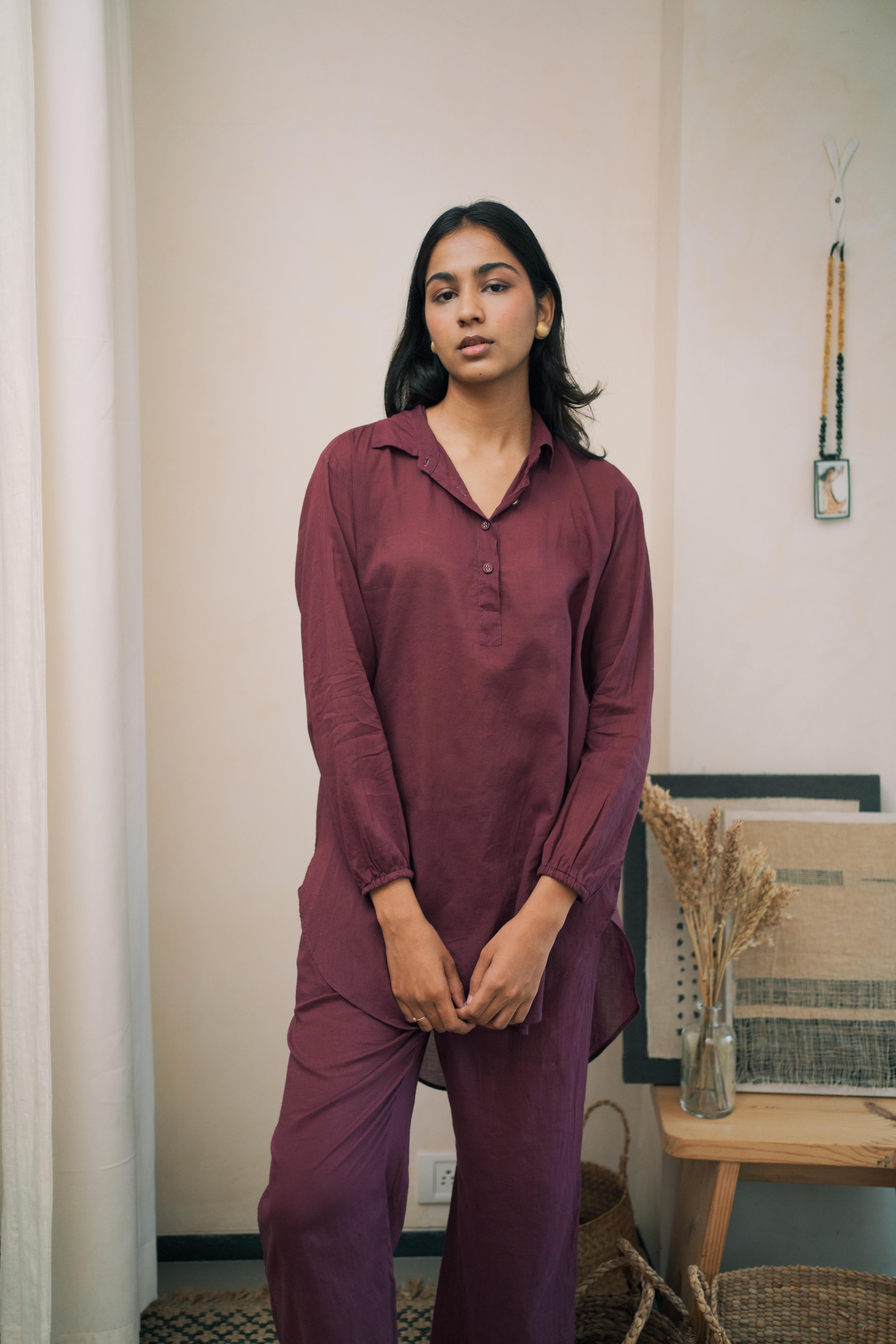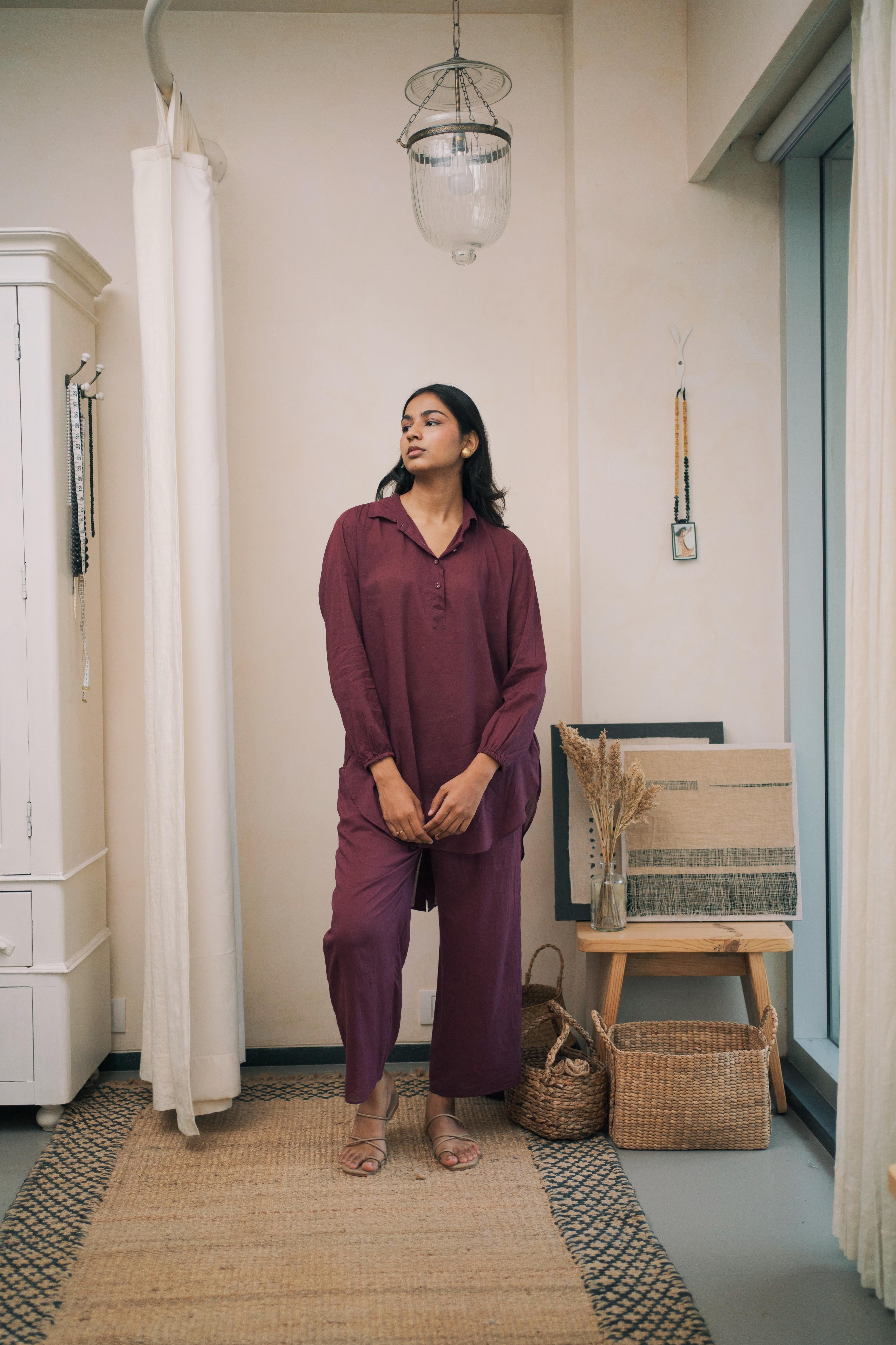 This breezy mul cotton cord set exudes effortless charm, boasting intricate button detailing on the back yoke. Crafted for comfort and style, it offers a timeless yet modern ensemble suitable for any occasion.