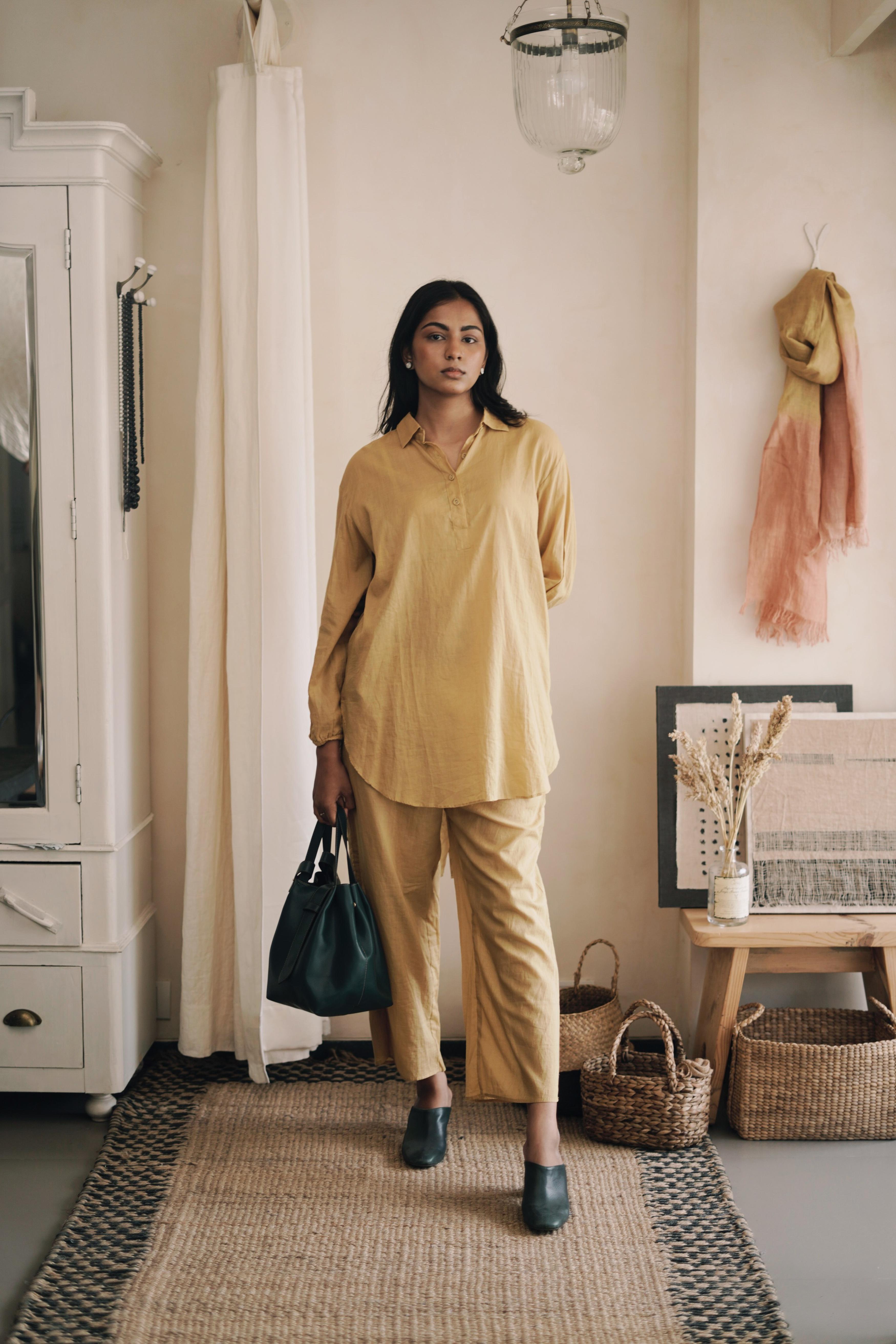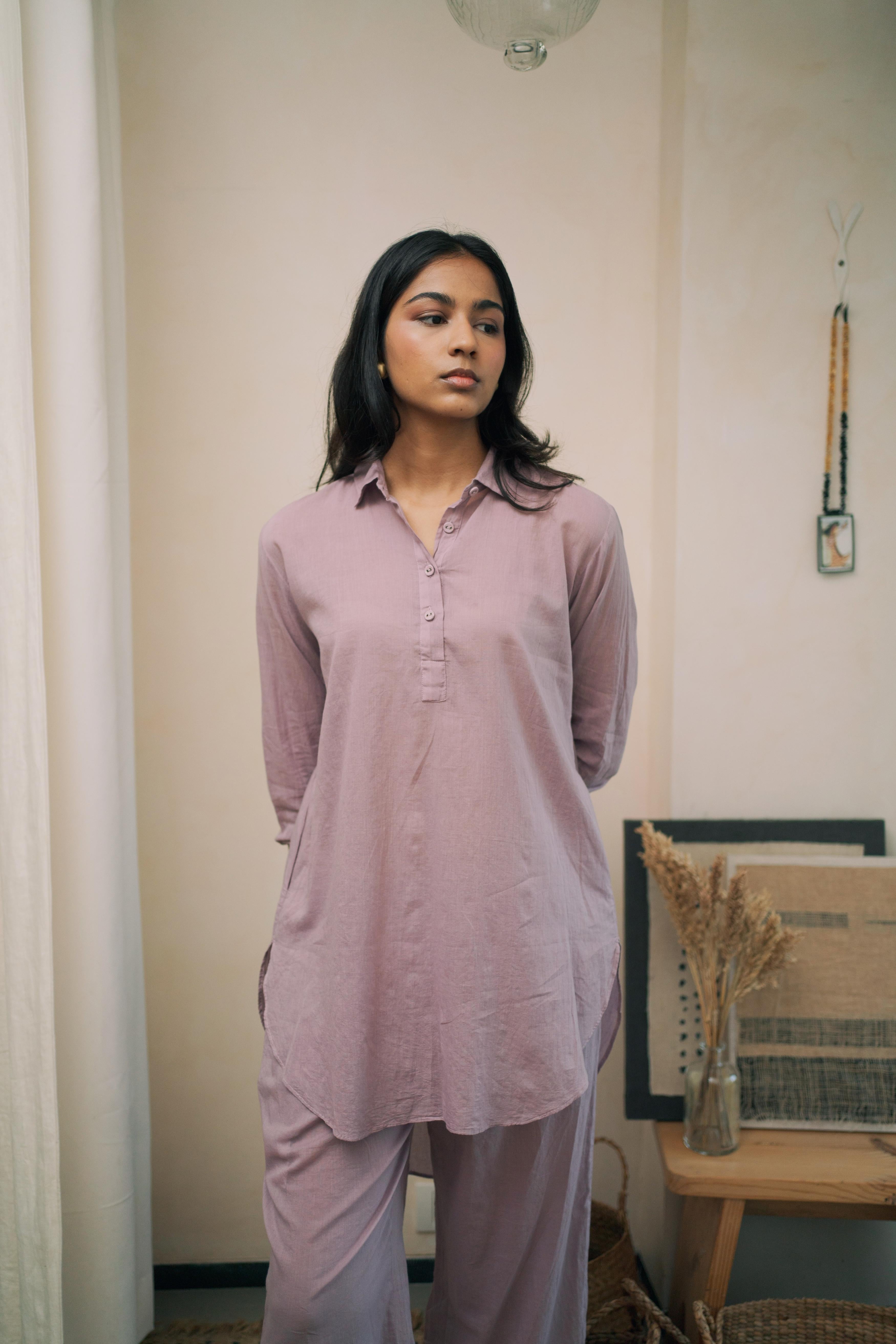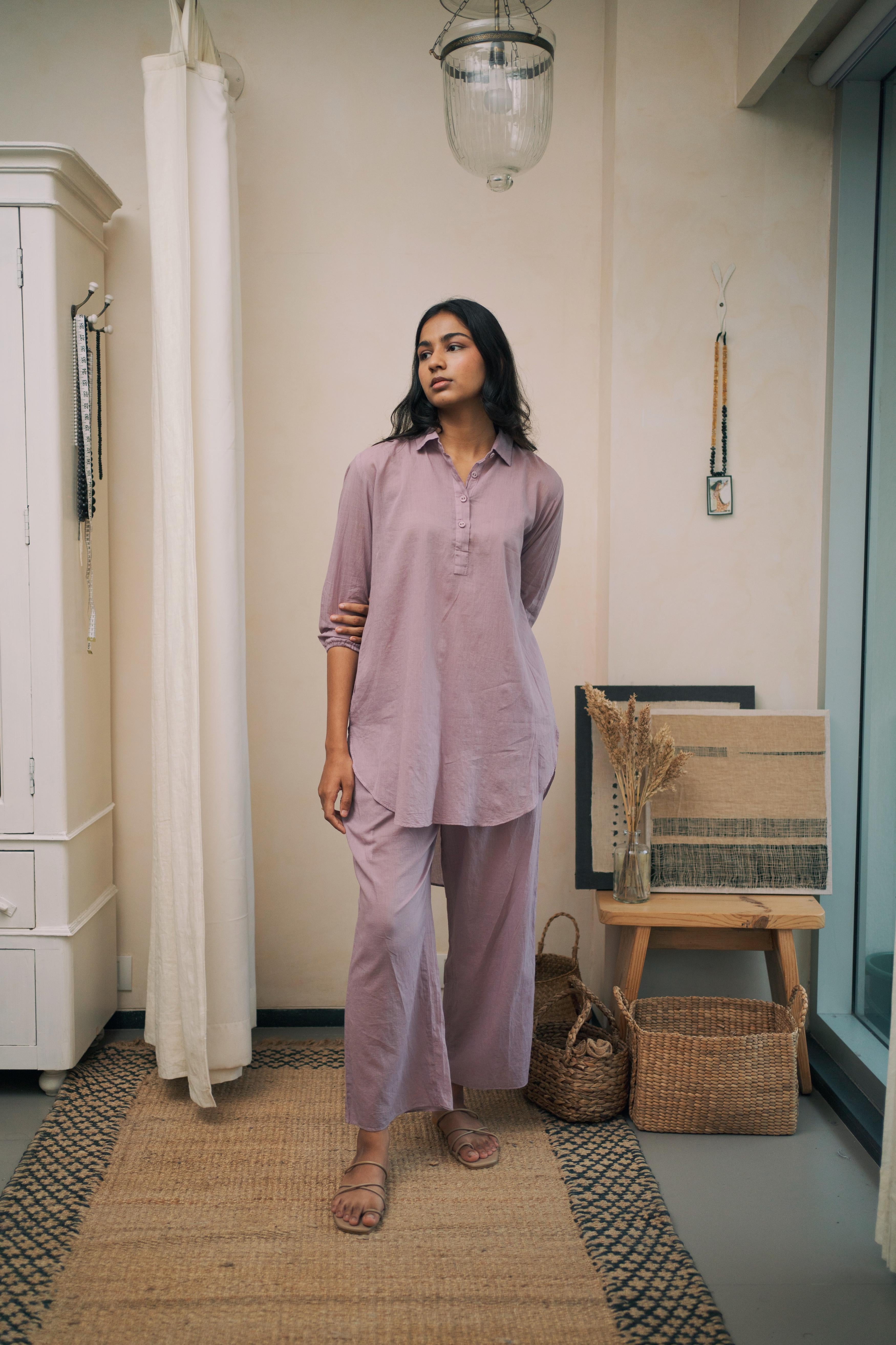 This breezy mul cotton cord set exudes effortless charm, boasting intricate button detailing on the back yoke. Crafted for comfort and style, it offers a timeless yet modern ensemble suitable for any occasion.