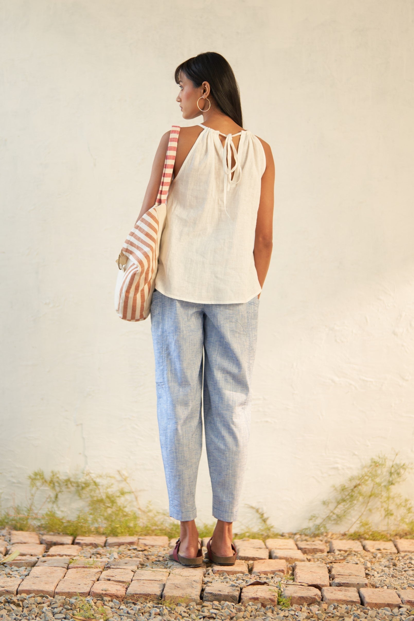 A fresh take on a classic favorite. Crafted from lightweight flex fabric in crisp white, it offers a breezy and effortless vibe for your easygoing day out. The tie-up neckline adds a stylish detail, creating soft gathers on both the front and back. With its cropped length, it pairs perfectly with high-waisted skirts, pants, or shorts, ensuring a versatile and chic look