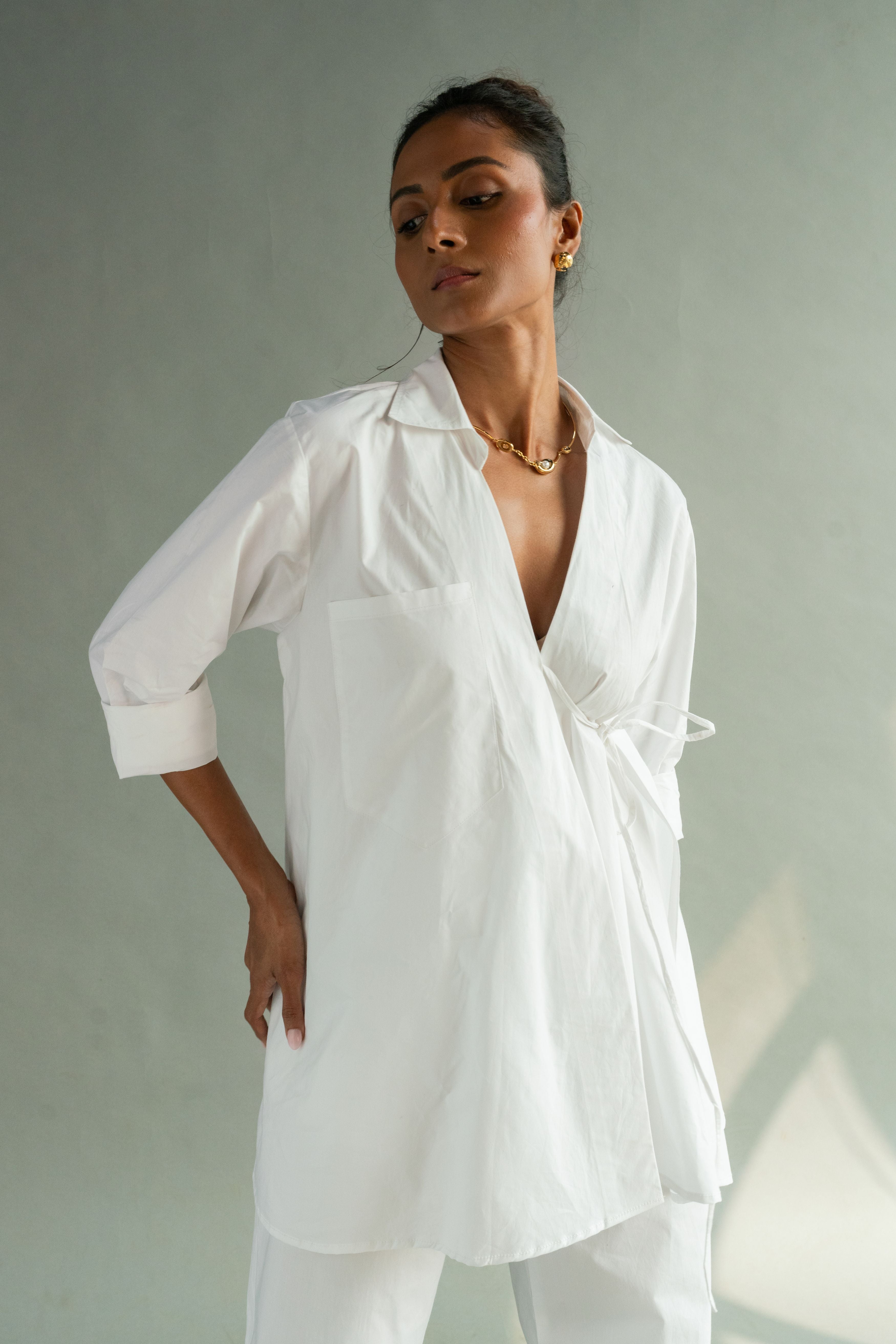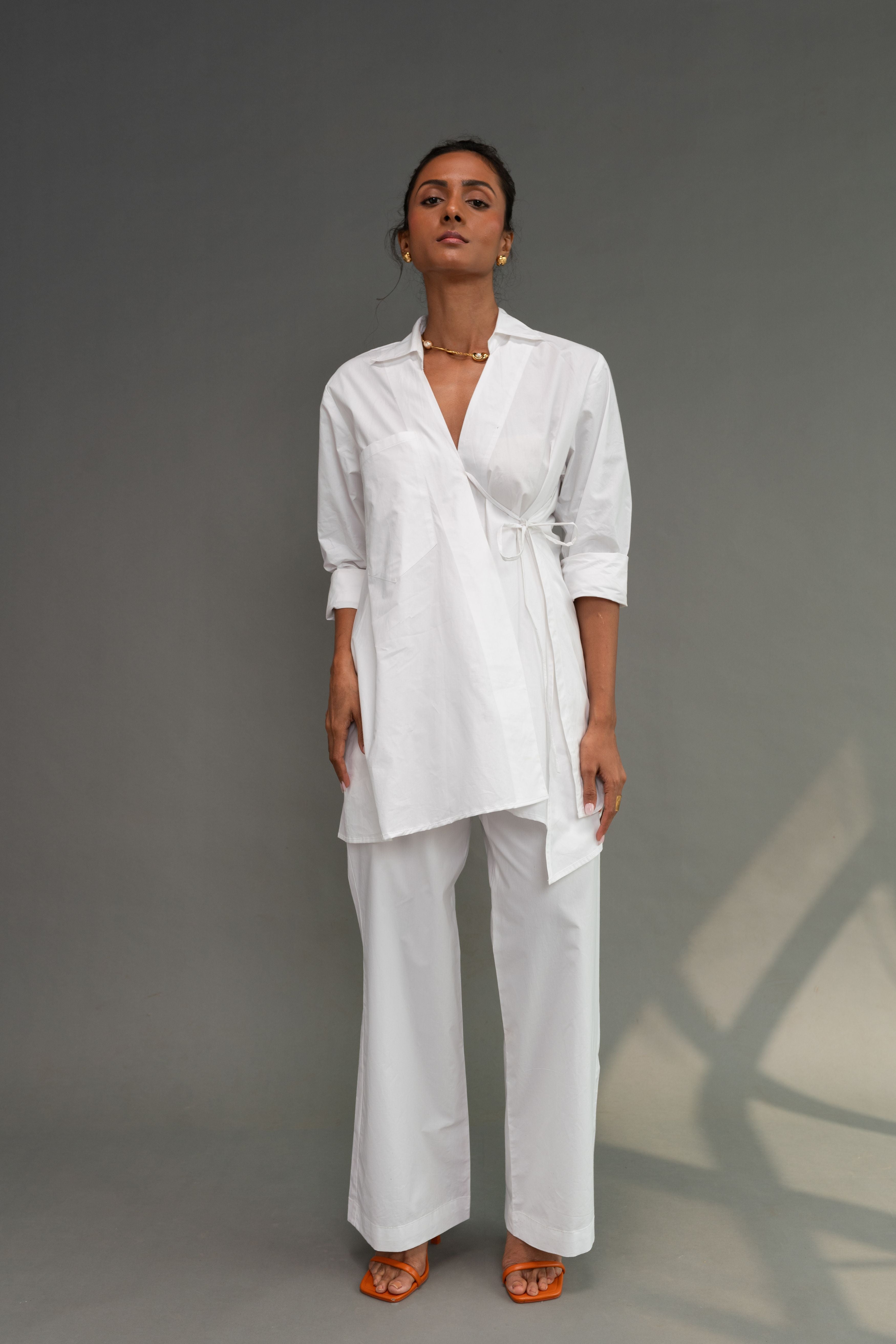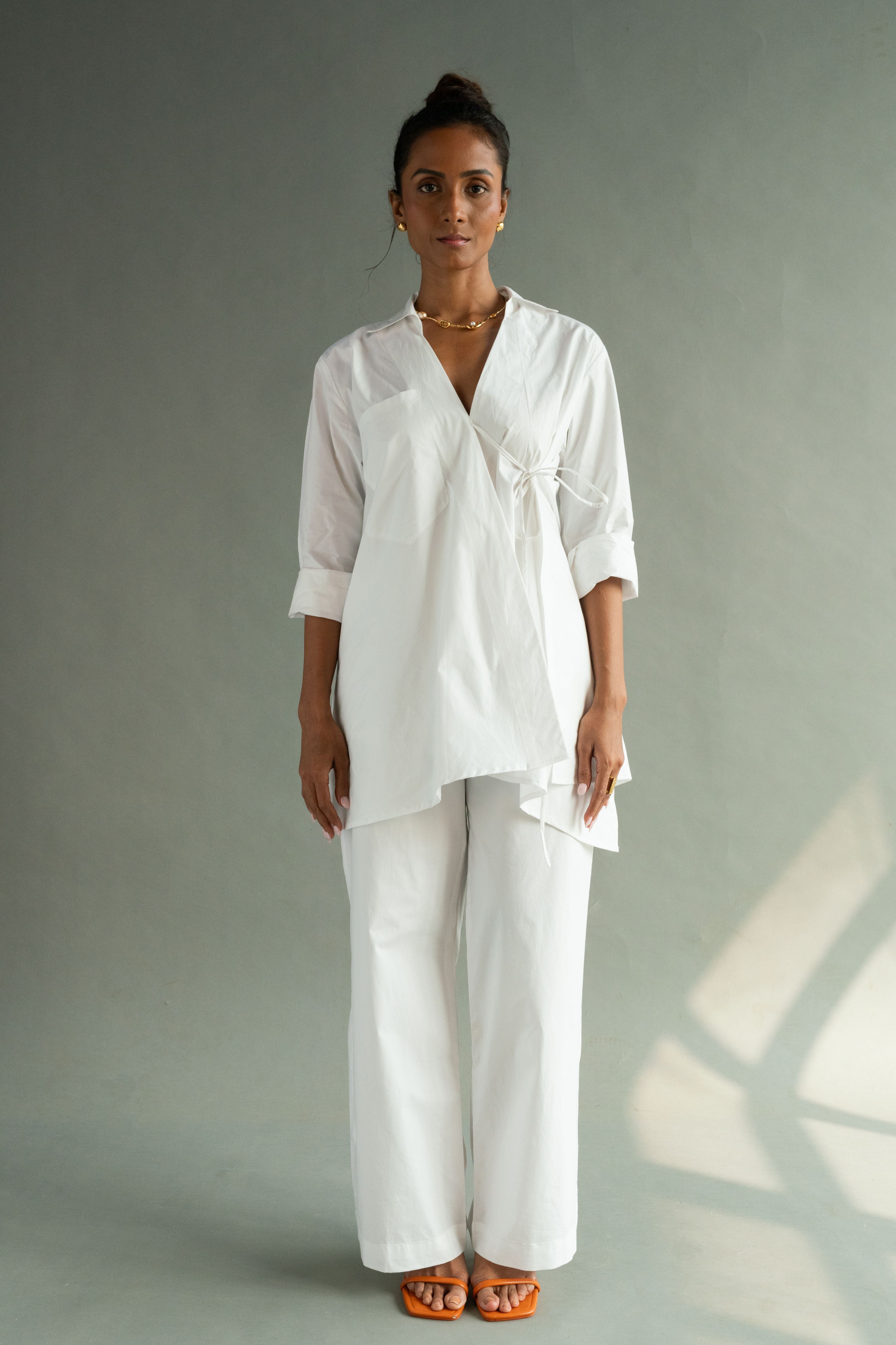 A wrap- around shirt with a shirt collar, v-neckline and a pocket on the right chest. It's paired with wide-legged full length pants having side pockets.