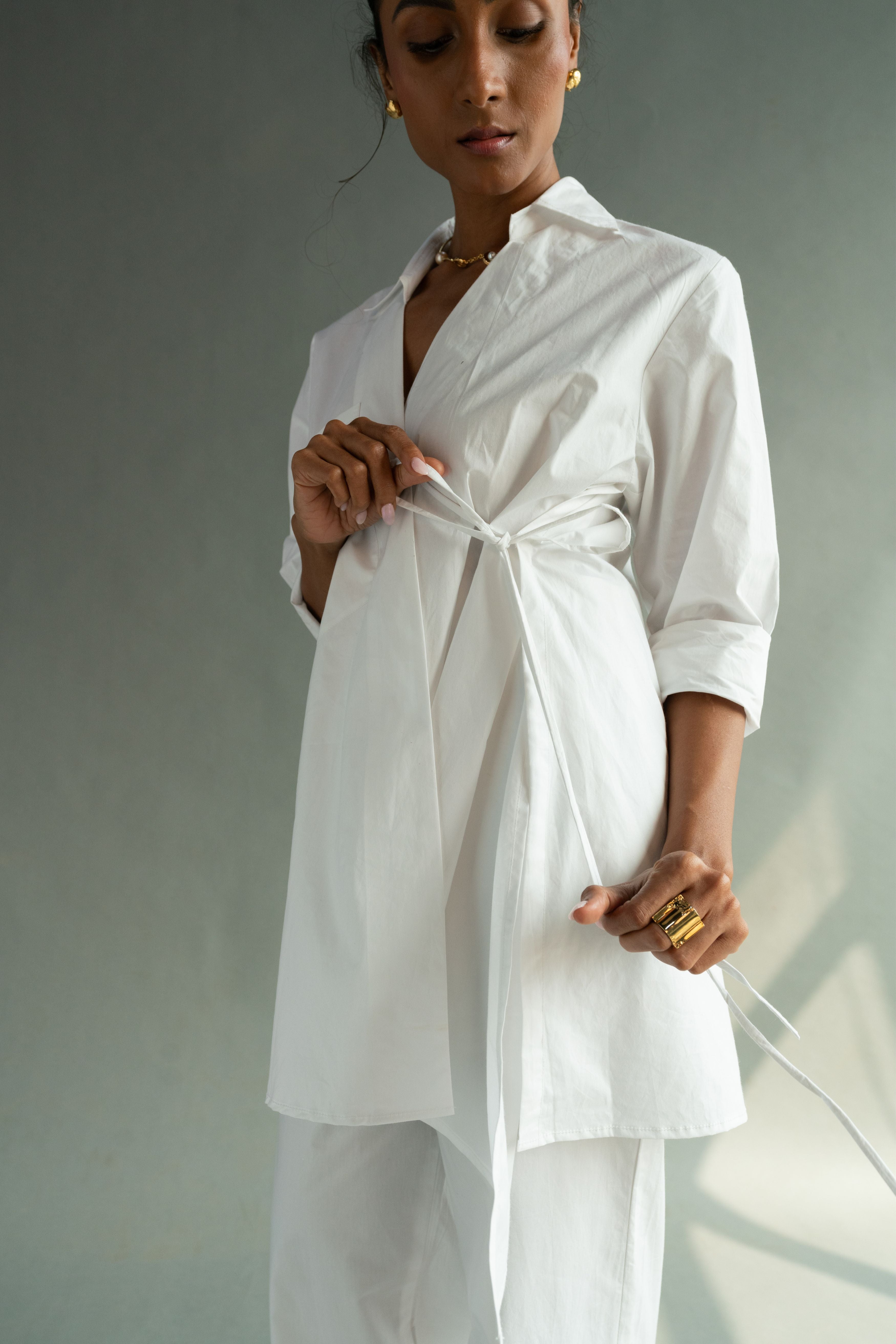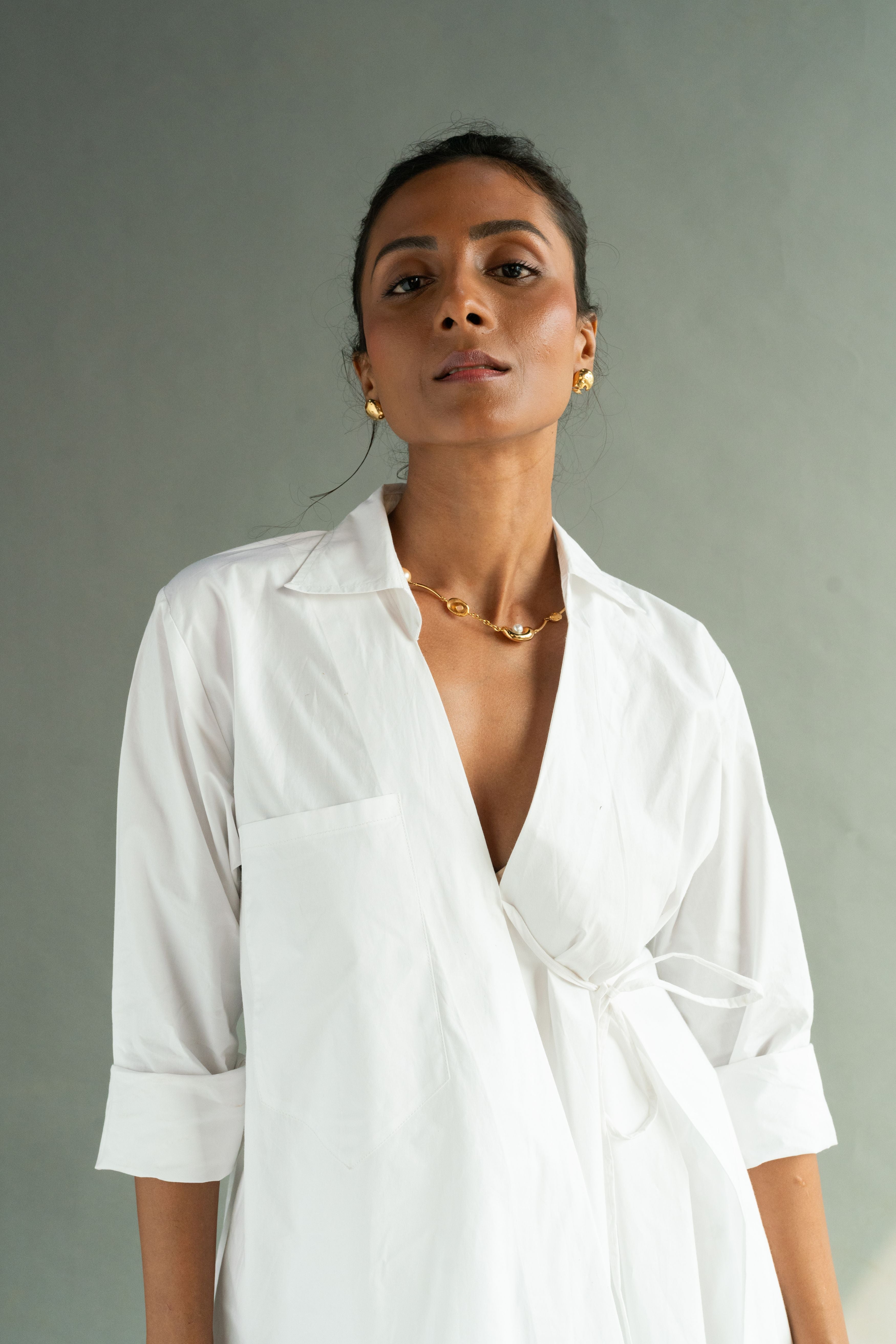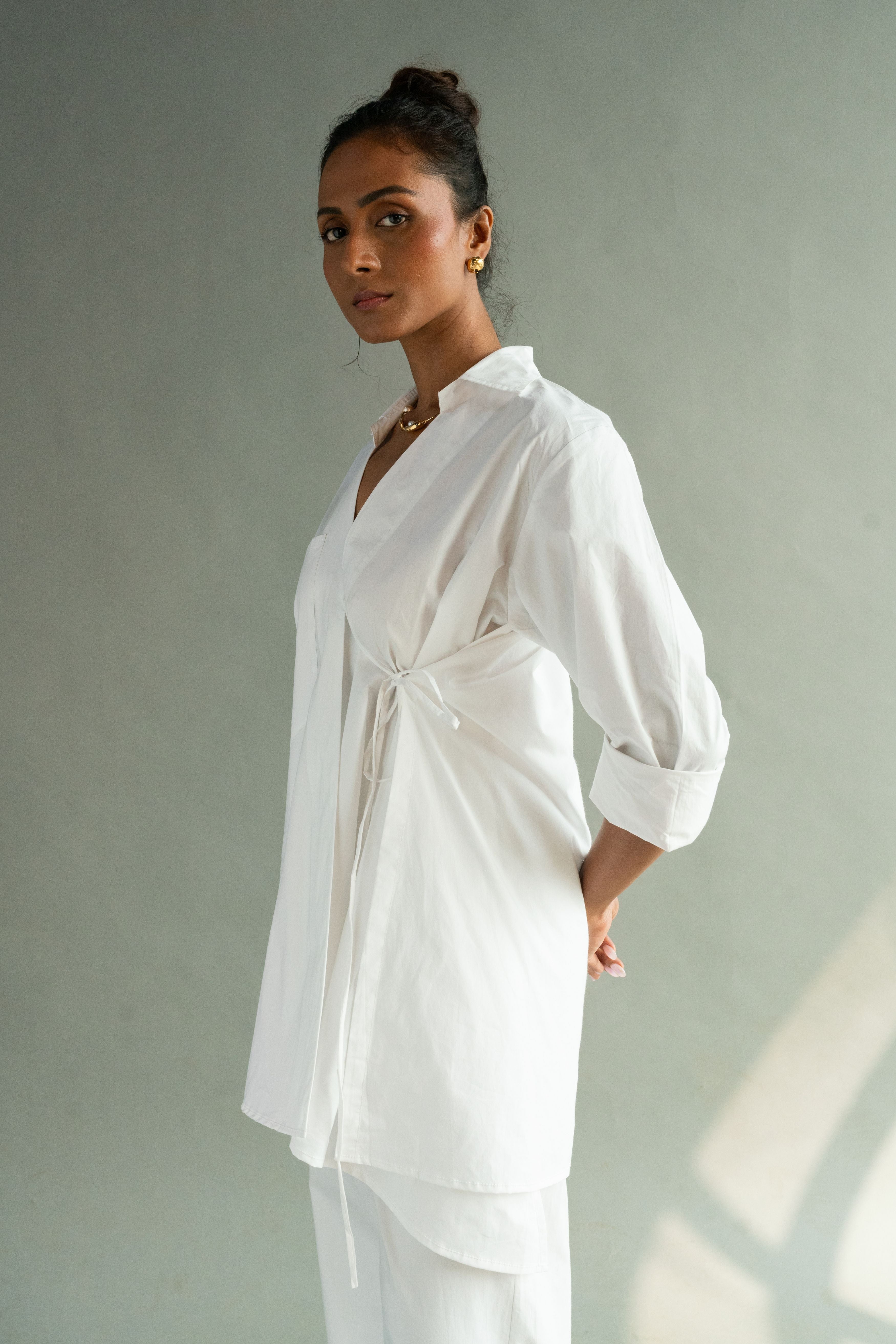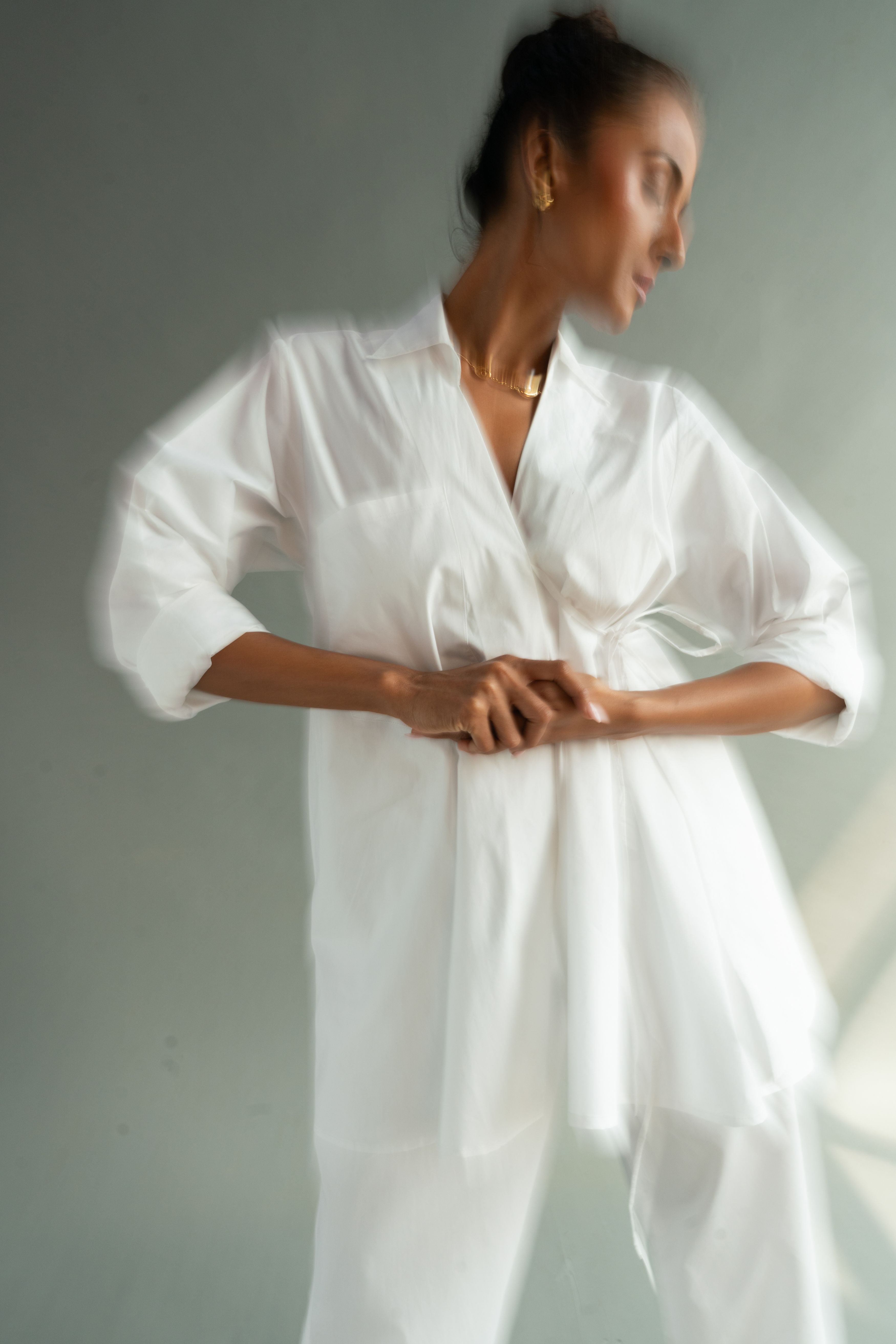 A wrap- around shirt with a shirt collar, v-neckline and a pocket on the right chest. It's paired with wide-legged full length pants having side pockets.