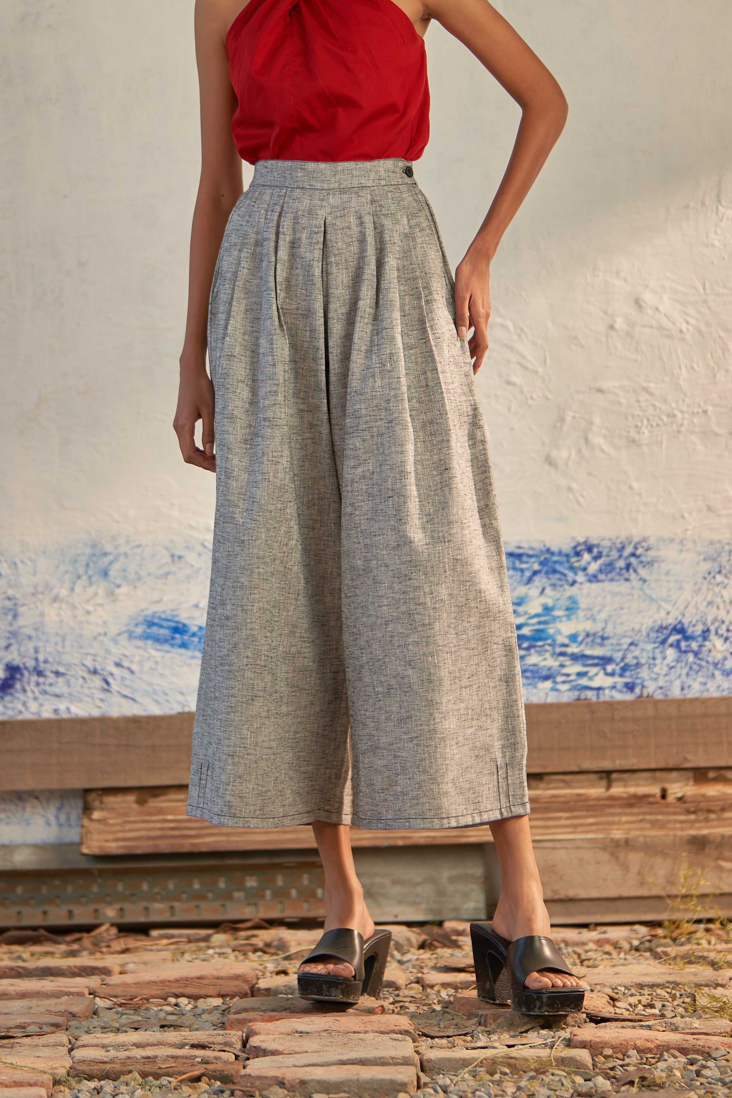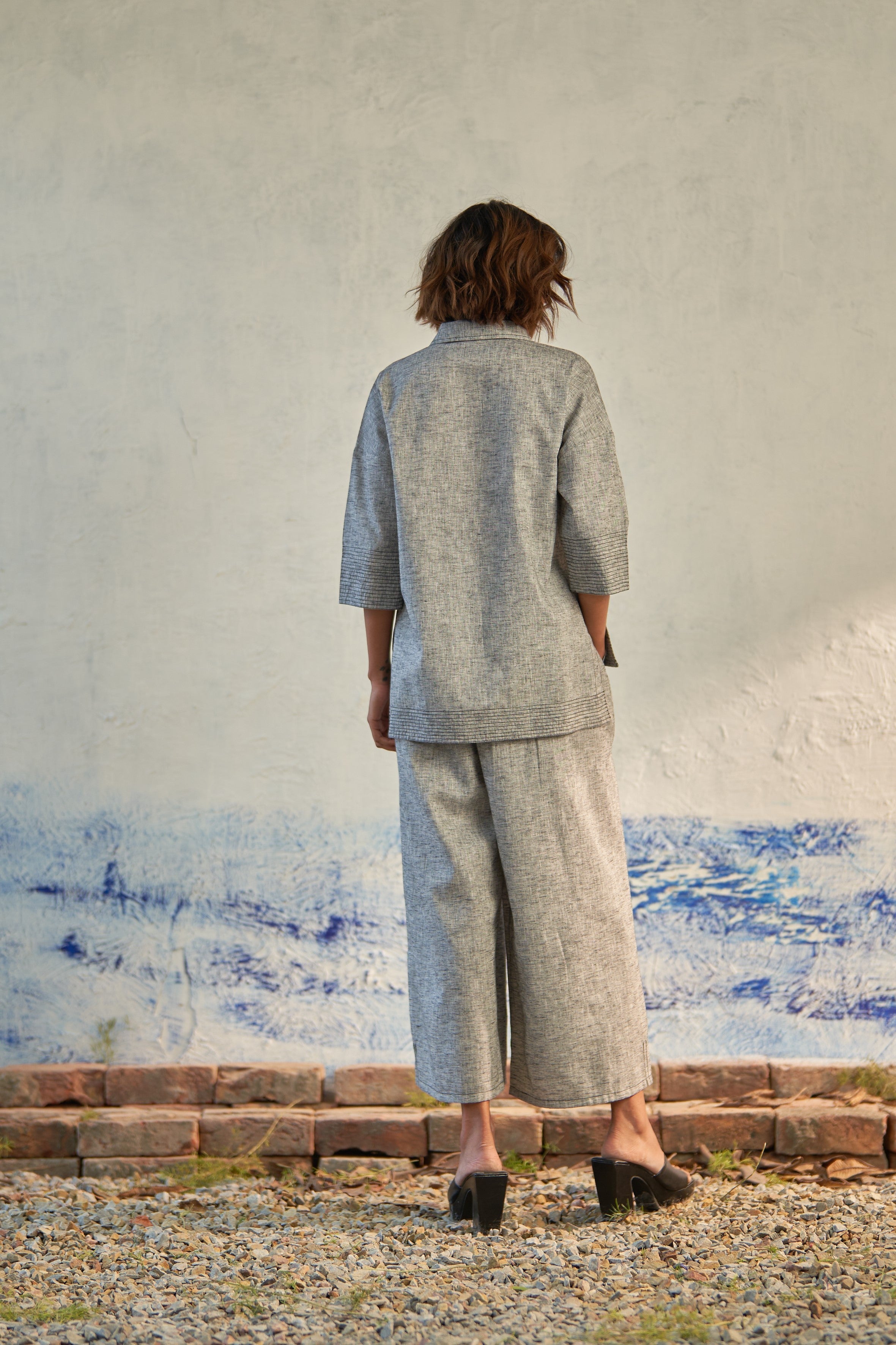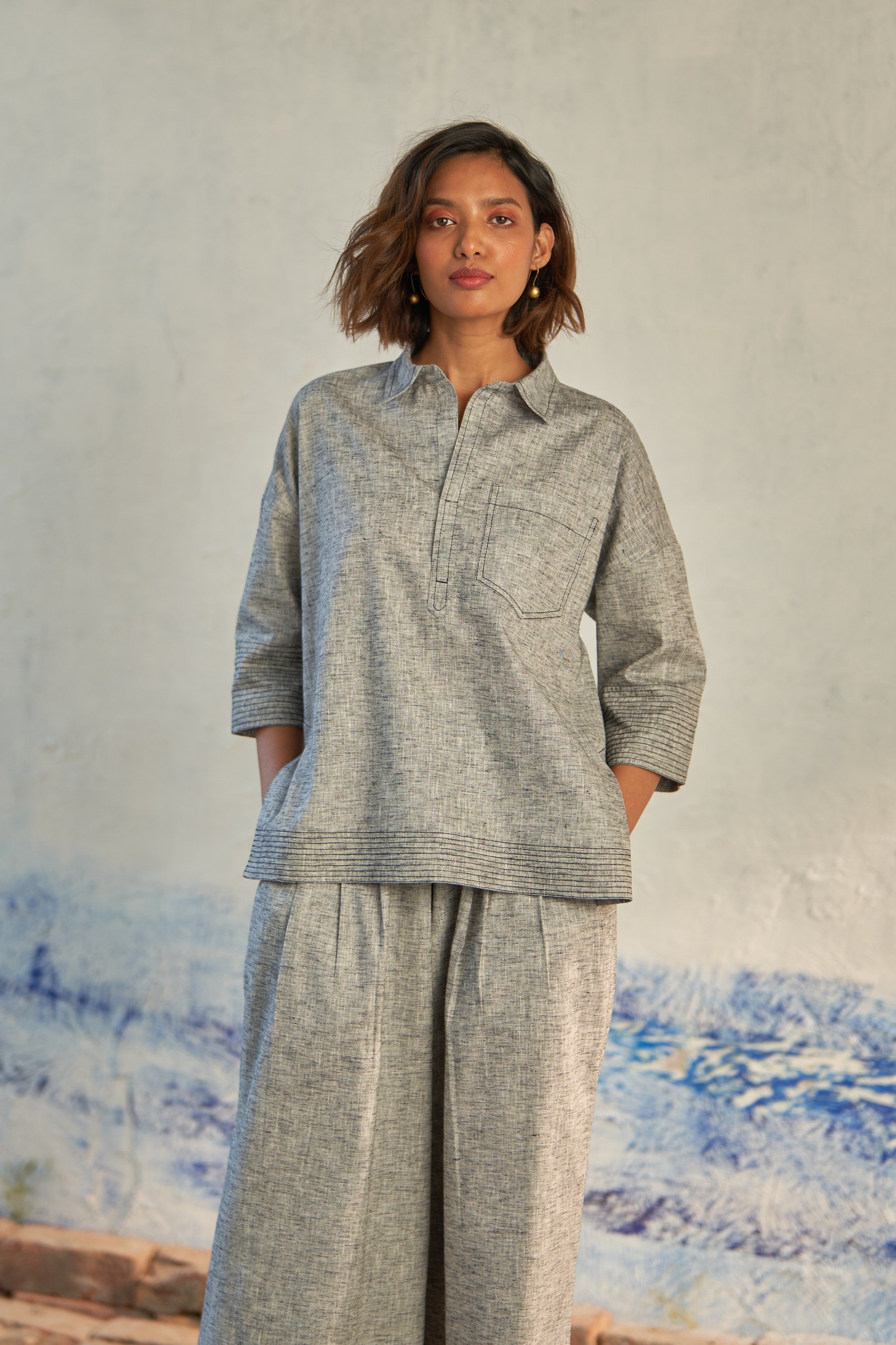 Crafted from textured cotton, the 'Pebbled Duo' exudes casual sophistication. The top boasts a collared neckline with a deep V-neck and a convenient chest pocket adorned with intricate stitching details. Complementing this, the elasticated box pleat lowers feature a half elasticated waist with a button for comfort. The surface styling includes inverted box pleat detailing, adding an extra dimension to the ensemble.