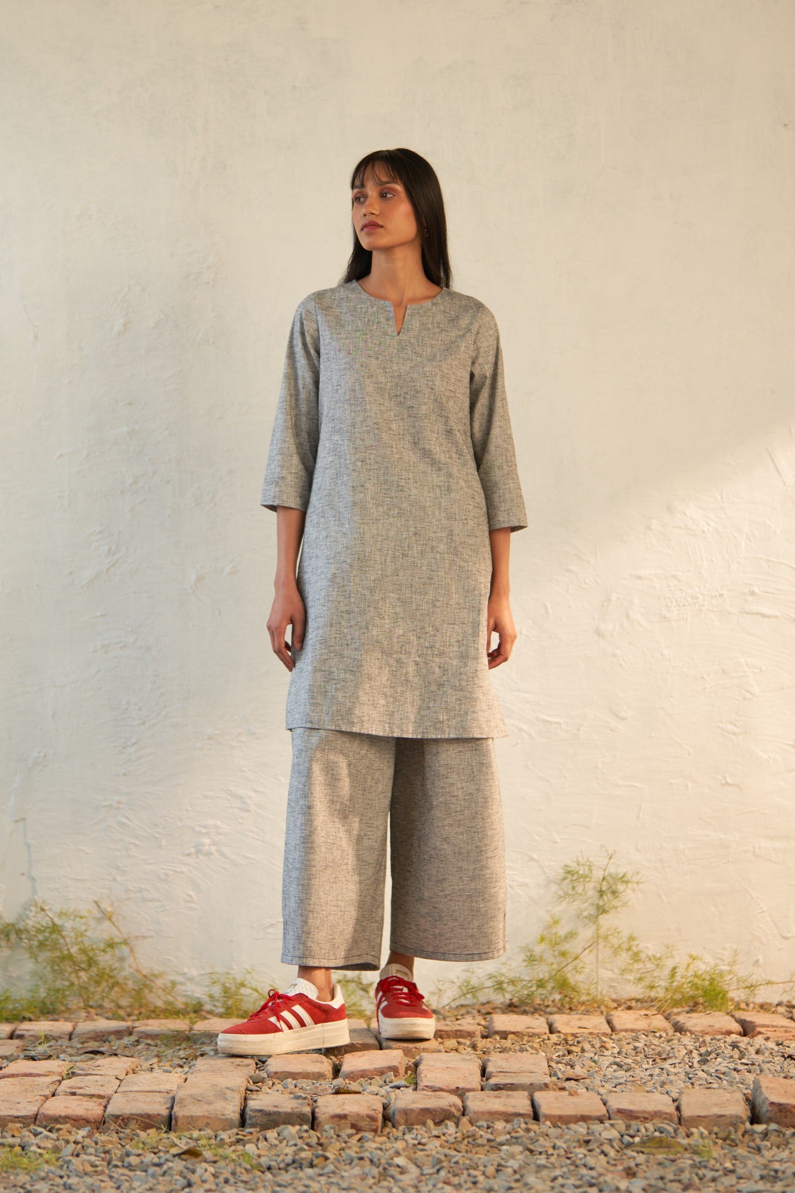 Take a leisurely stroll along the path and savor the gentle Sunday breeze in our pebbled co-ord set. This ensemble presents a contemporary twist on traditional style with its textured cotton fabric. The tunic, reminiscent of a short kurti, is seamless and boasts convenient side pockets, pairing elegantly with the ultra-flared palazzo pants. These palazzo pants feature an elasticated waistband, ensuring a perfect fusion of style and unparalleled comfort.