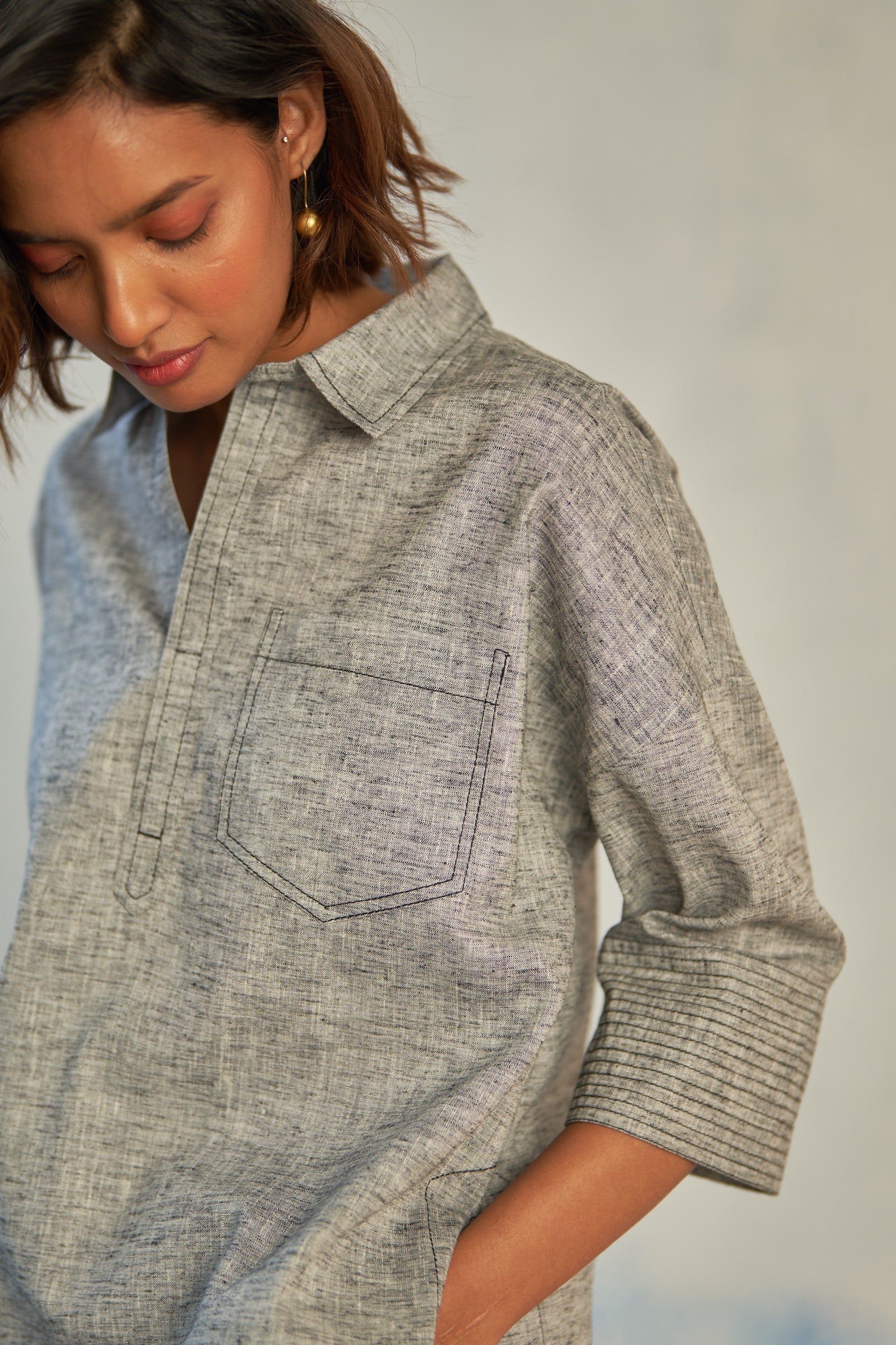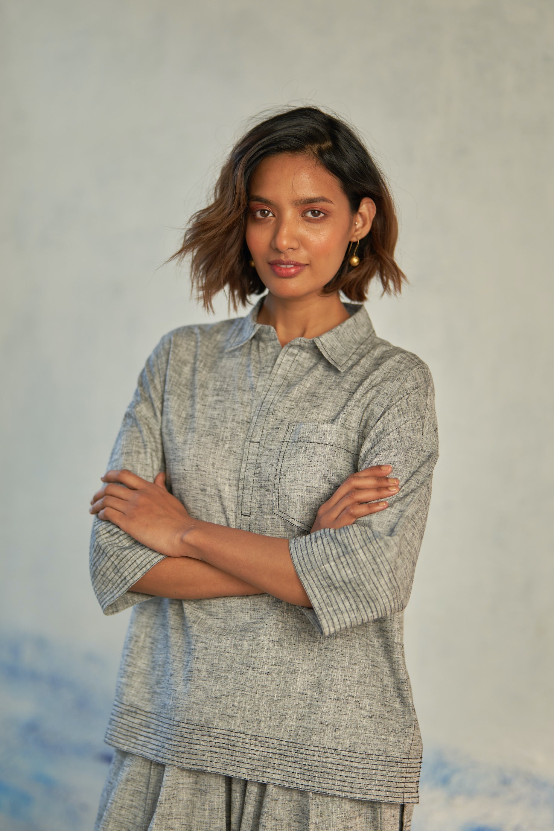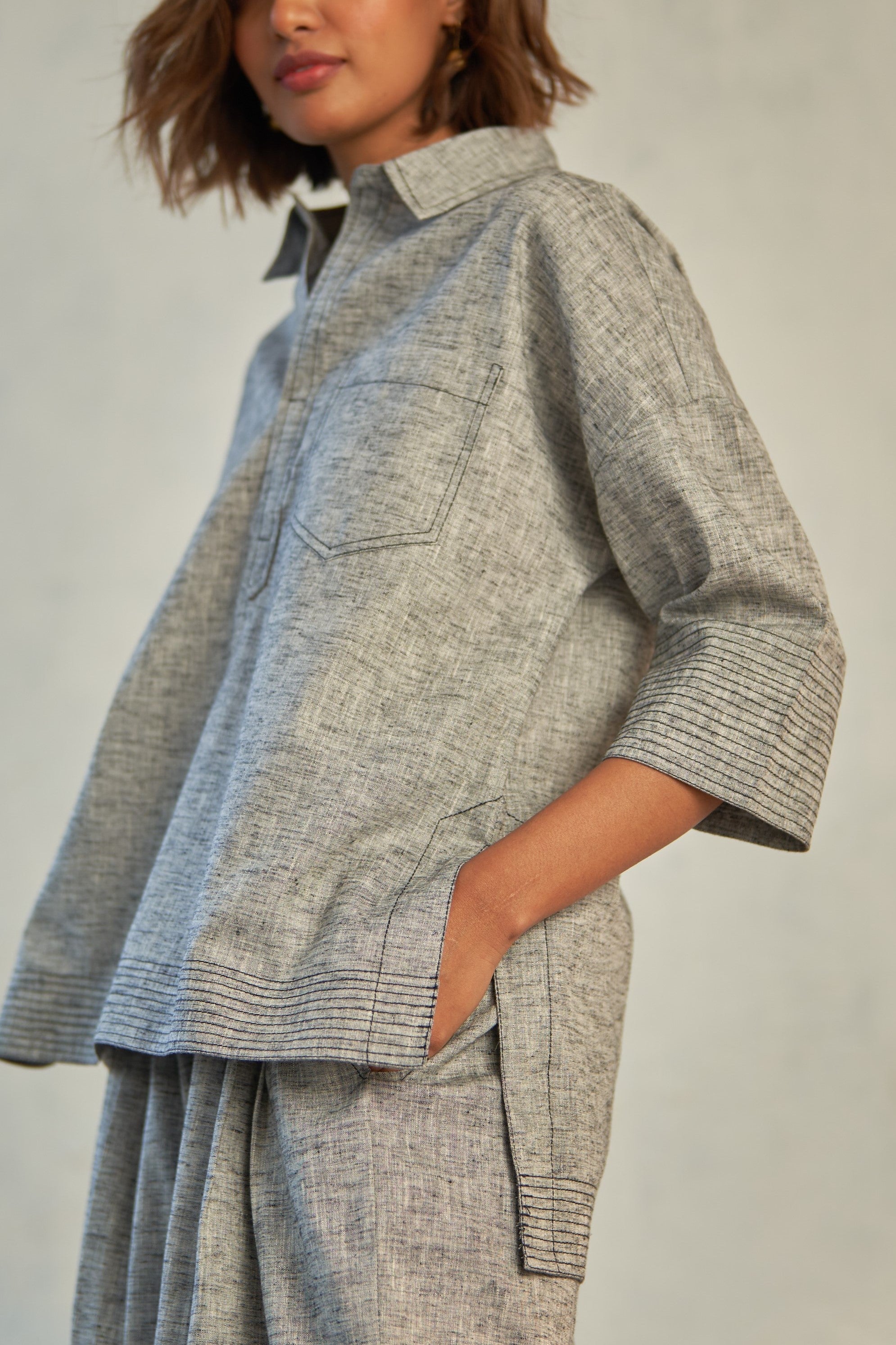 Crafted from premium textured cotton fabric, this leisurewear-inspired piece boasts an effortlessly relaxed shape with elbow-length sleeves. Its design features a collared neckline with a deep V-neck and a convenient patch pocket at the chest. Enhanced by intricate topstitching detail, it elevates the overall look. Versatile enough to pair with any bottoms, this top shines when styled with our wide-legged grey lounge pants, perfecting the loungewear aesthetic.
