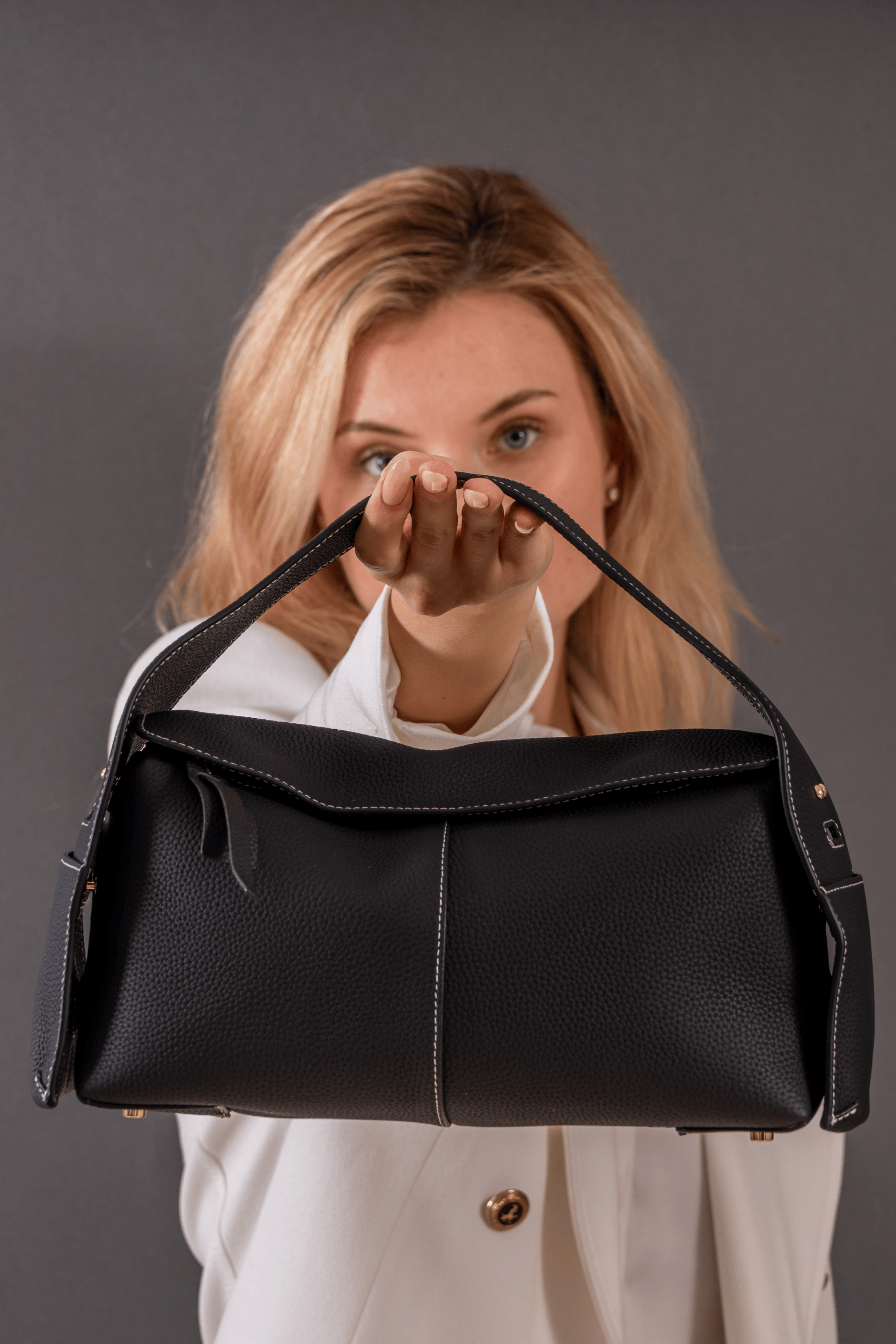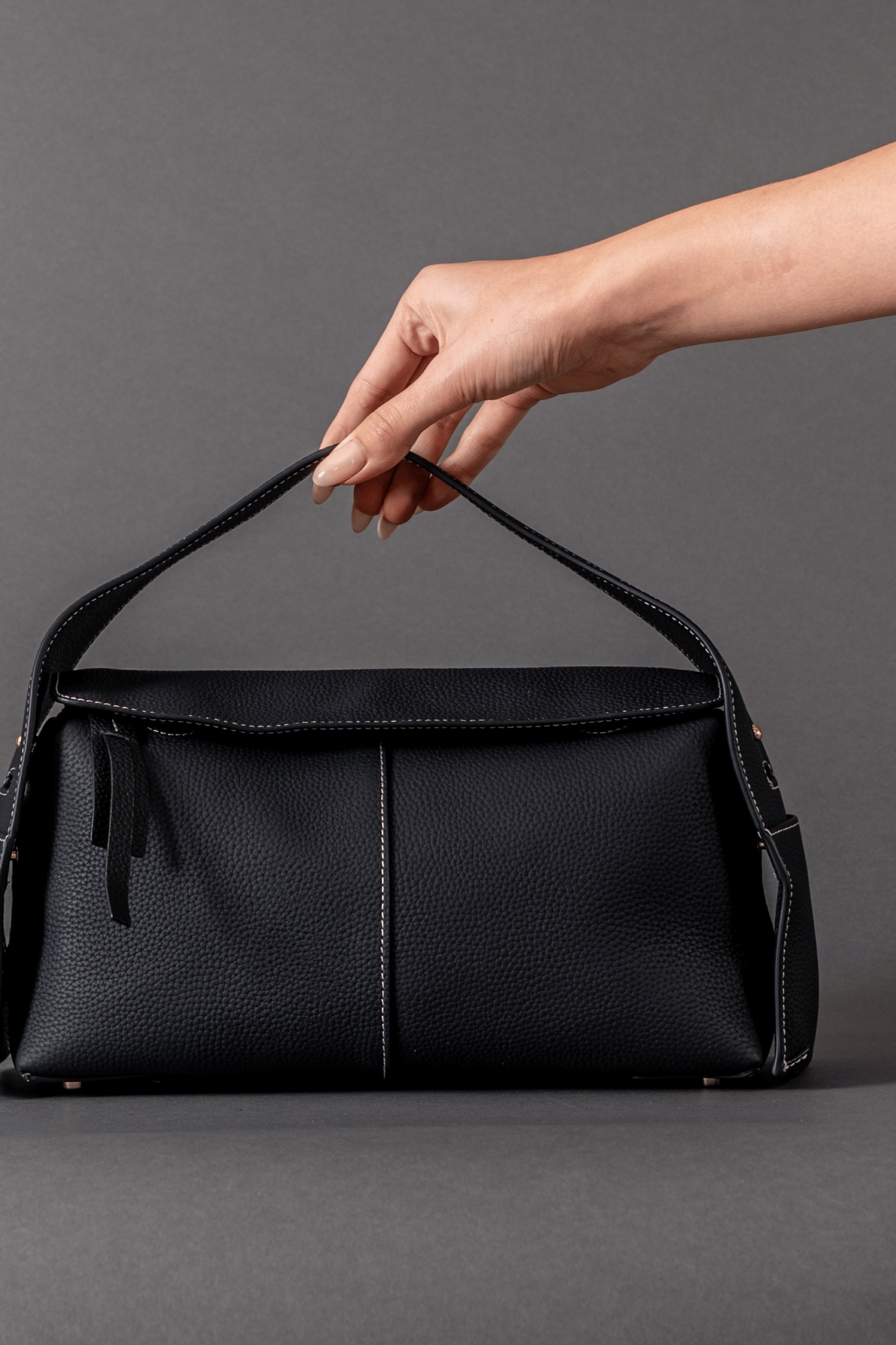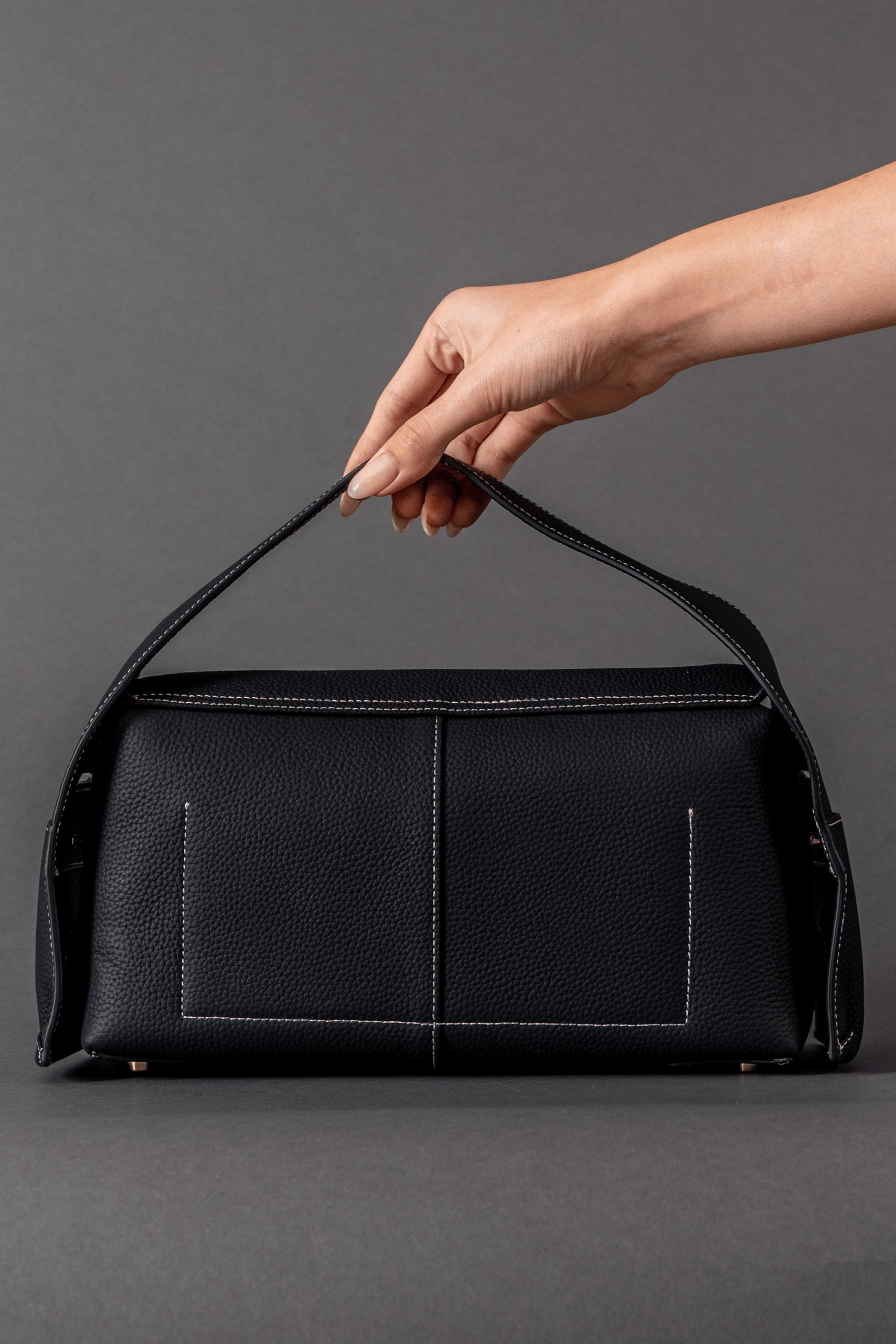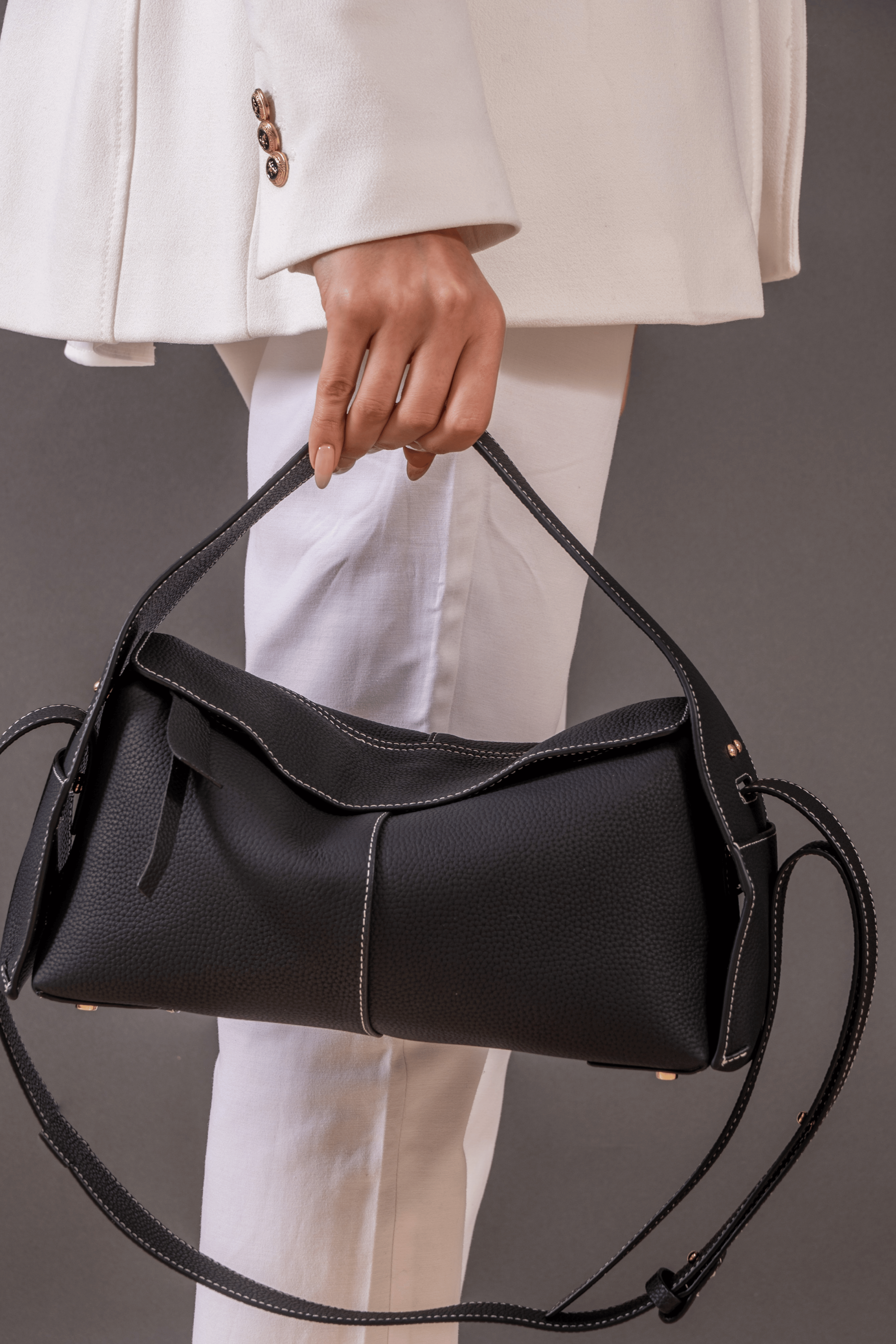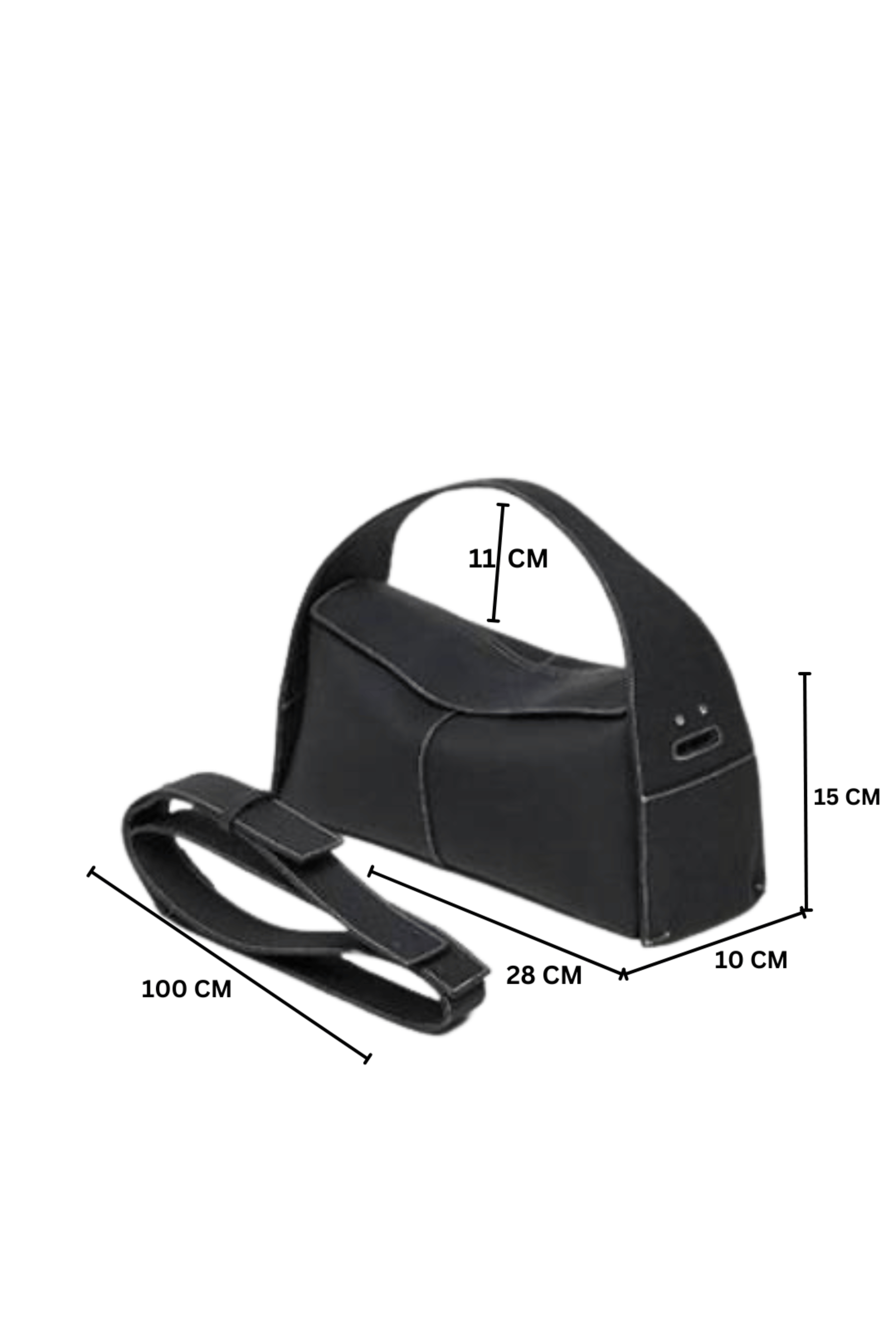 Step out in style with our Baguette Bag, Pelle, a masterpiece of craftsmanship and design combining timeless appeal with modern functionality. 1. Genuine Leather: Crafted from the finest leather, known for its durability, pebble grain texture, and luxurious feel. 2. Distinctive Contrast Stitching: Features artful contrast stitching that enhances the design with a touch of sophistication. 3. Refined Bonded Suede Interiors: The bonded suede lining adds a soft, luxurious feel while ensuring durability and structure. 4. Chic Hanging Ear Pockets: Functional and stylish hanging ear pockets on the sides, perfect for quick access to your keys, phone, or other small items. 5. Versatile Shoulder Strap: Includes a detachable and adjustable shoulder strap, allowing for multiple carrying styles—handheld, crossbody, or over the shoulder. 6. Durable Metal Feet: Metal feet at the base protect the leather while adding a refined, polished detail. 7. Protective Dust Bag: Comes with a cotton dust bag to preserve the handbag’s quality and elegance when not in use