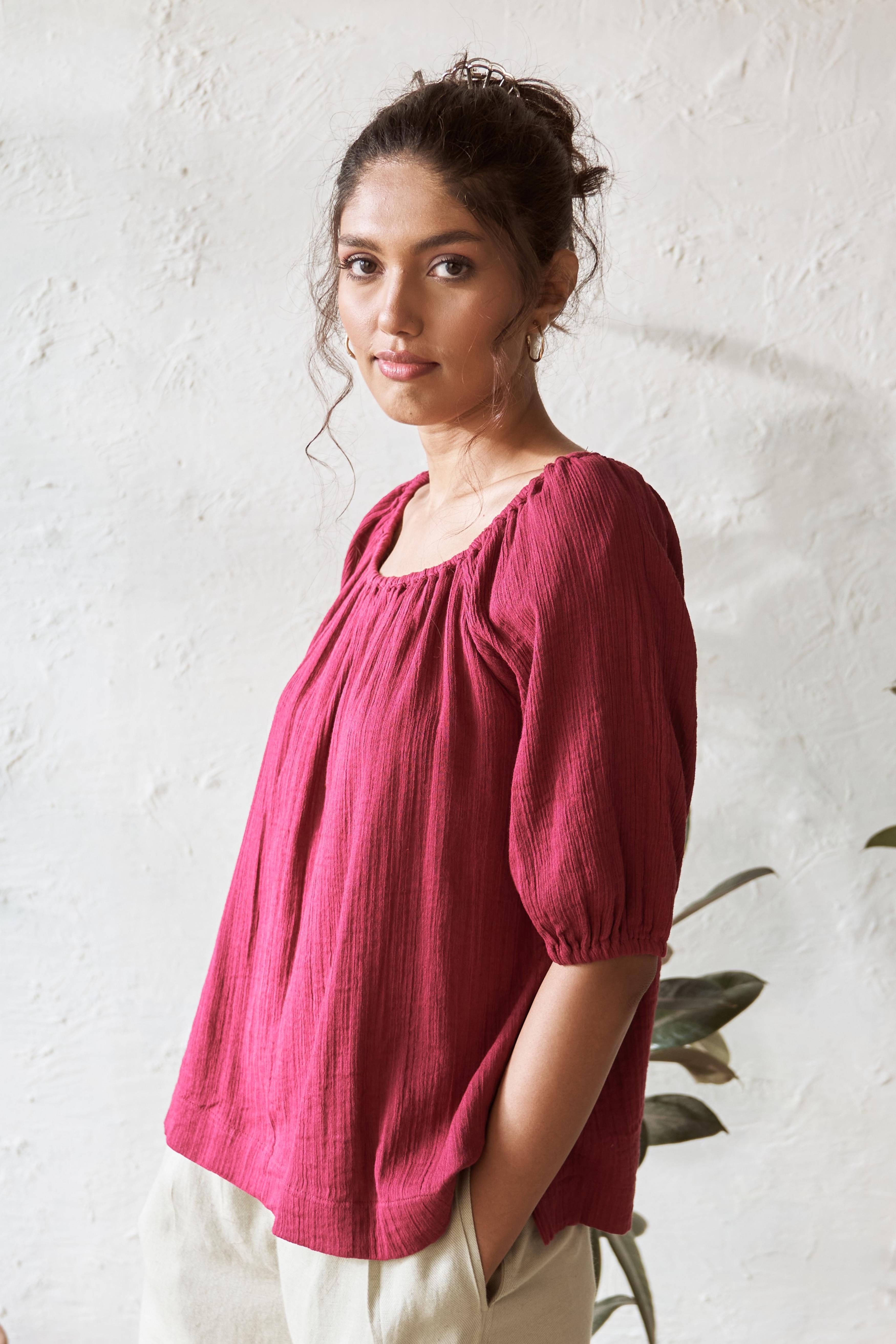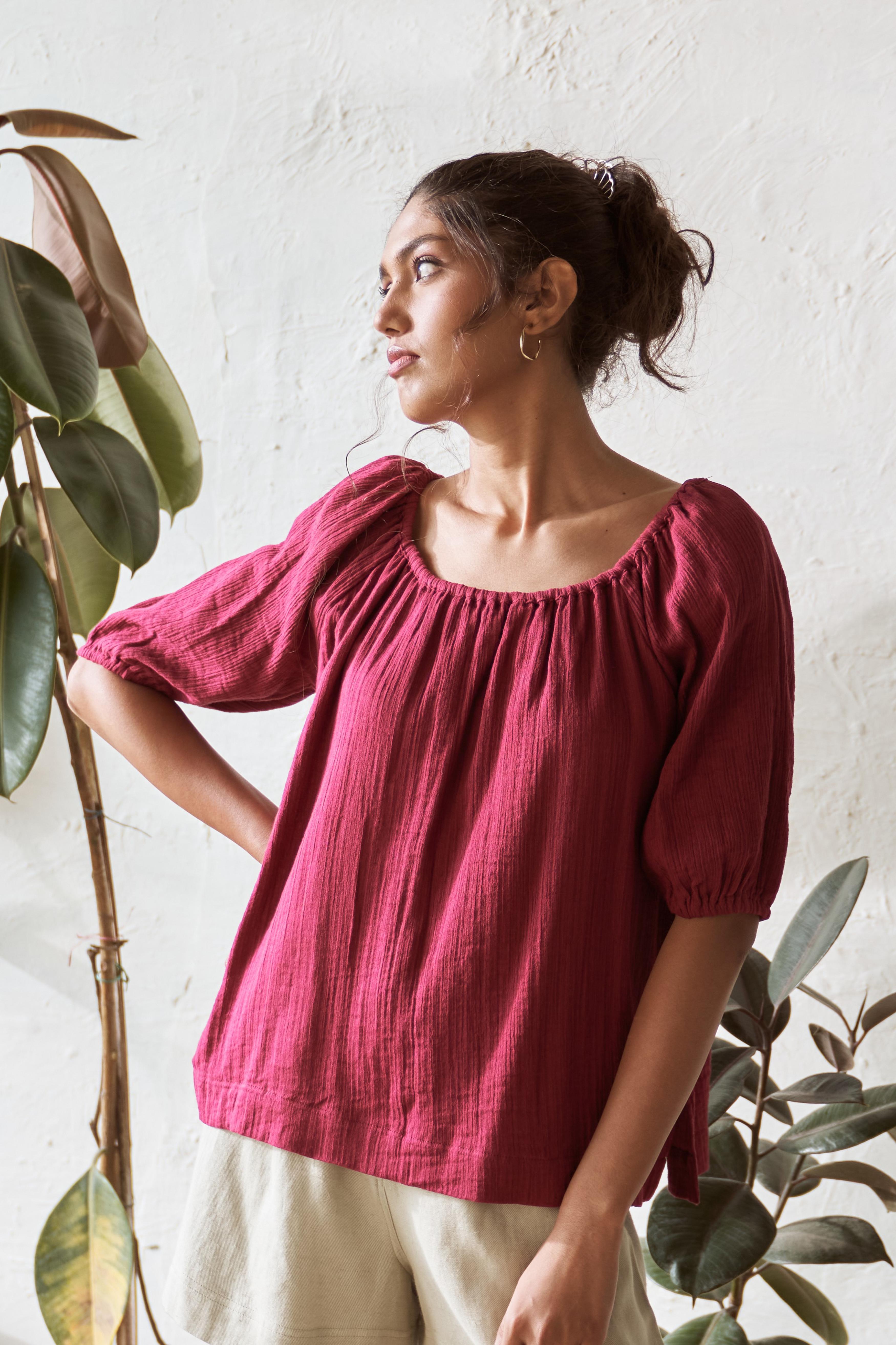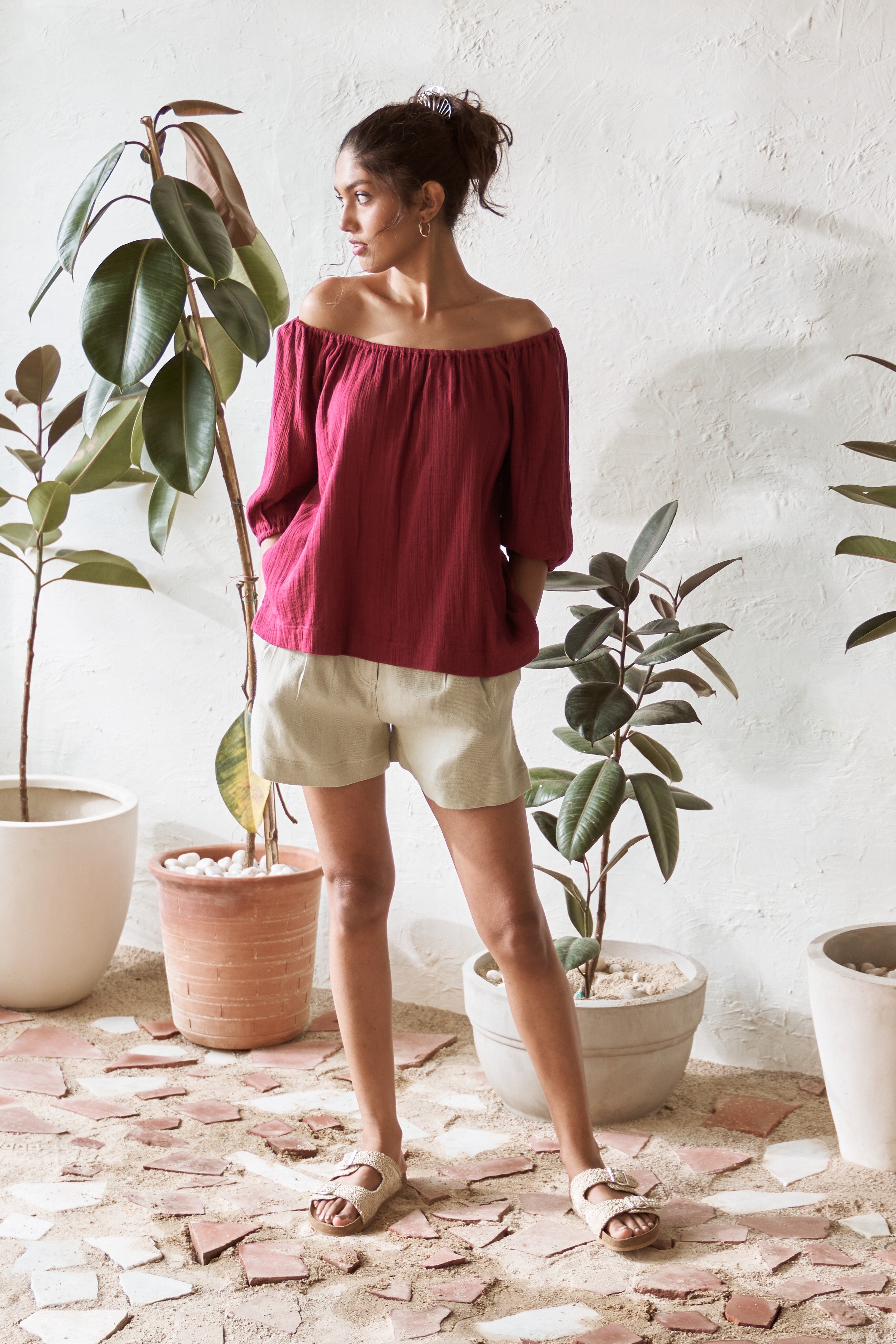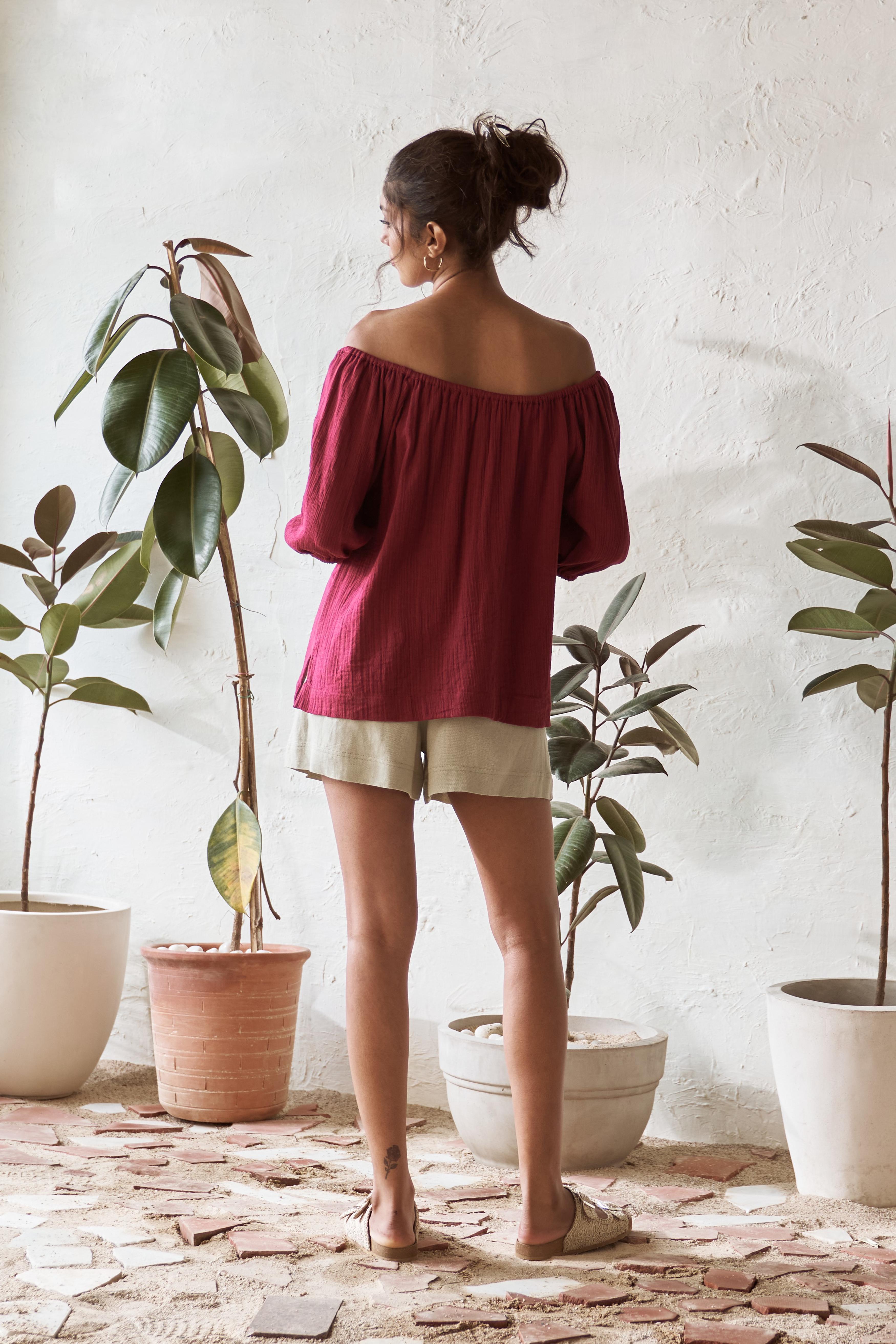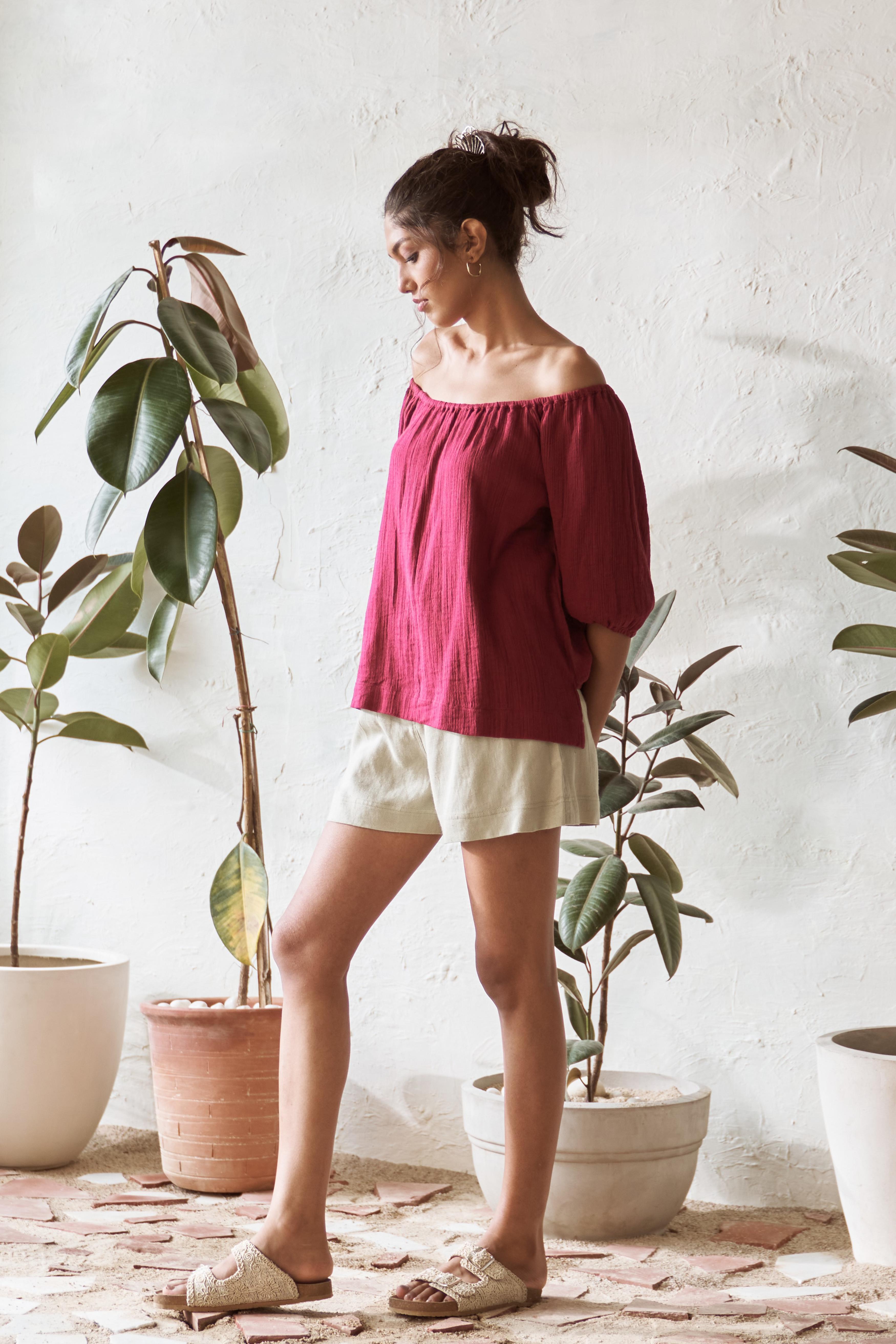Elevate your casual style with this ensemble set, combining a relaxed-fit Crimson coloured top with a smart A-line shorts in light Pistachio colour. The top is designed with a stretchy neckline that can also be worn off-shoulder. The A-line shorts has zip closure. Together, they create a chic and versatile ensemble perfect for any occasion. Whether you’re dressing up for a day out or keeping it simple for a casual outing, this co-ord set is a must-have addition to your wardrobe.