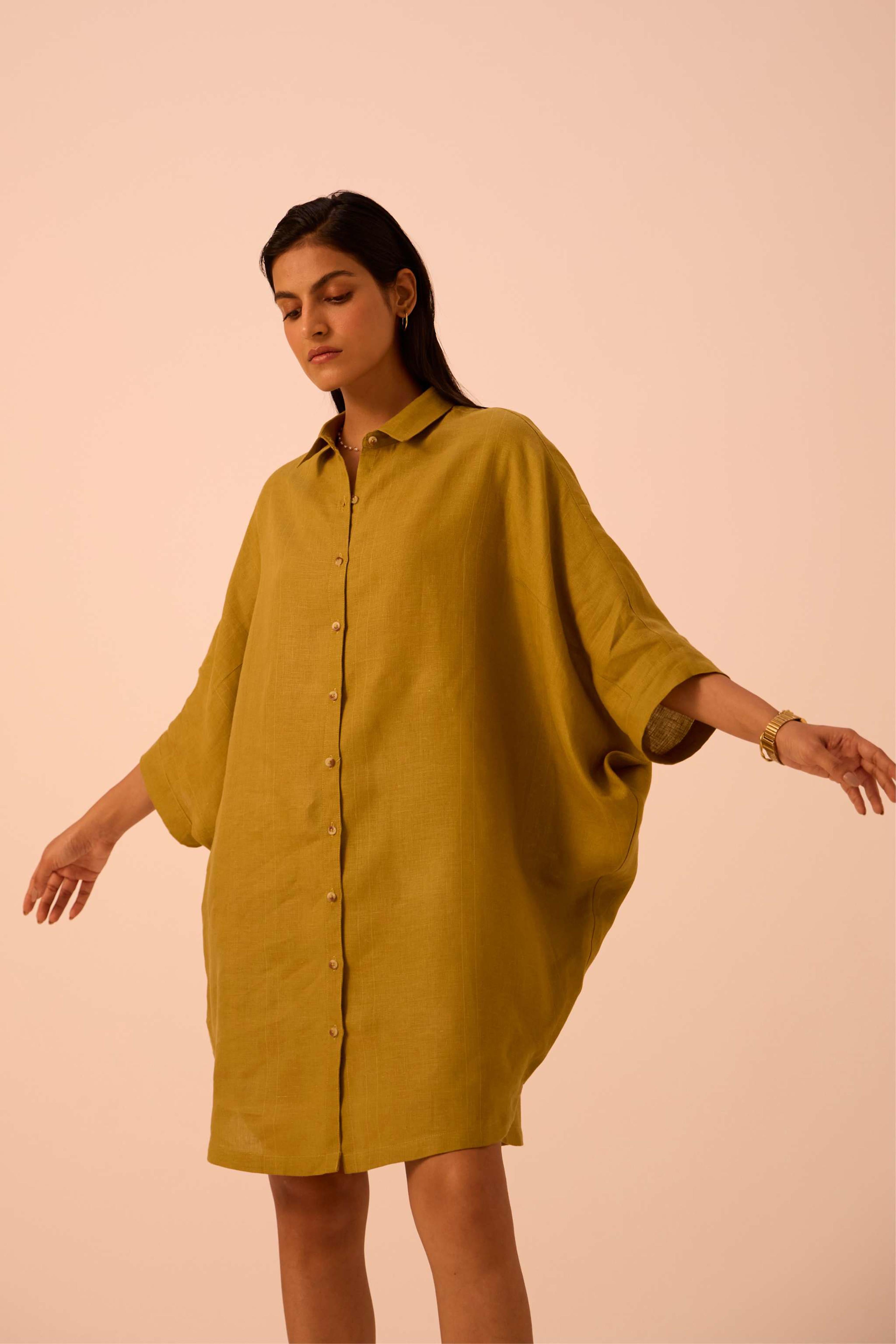 This *cocoon shirt* has a *relaxed fit* and features a *slim collar*. It's designed with *drop shoulders* and *elbow-length sleeves*. The model, Chhavi, is 5'6" and is wearing a size XS.