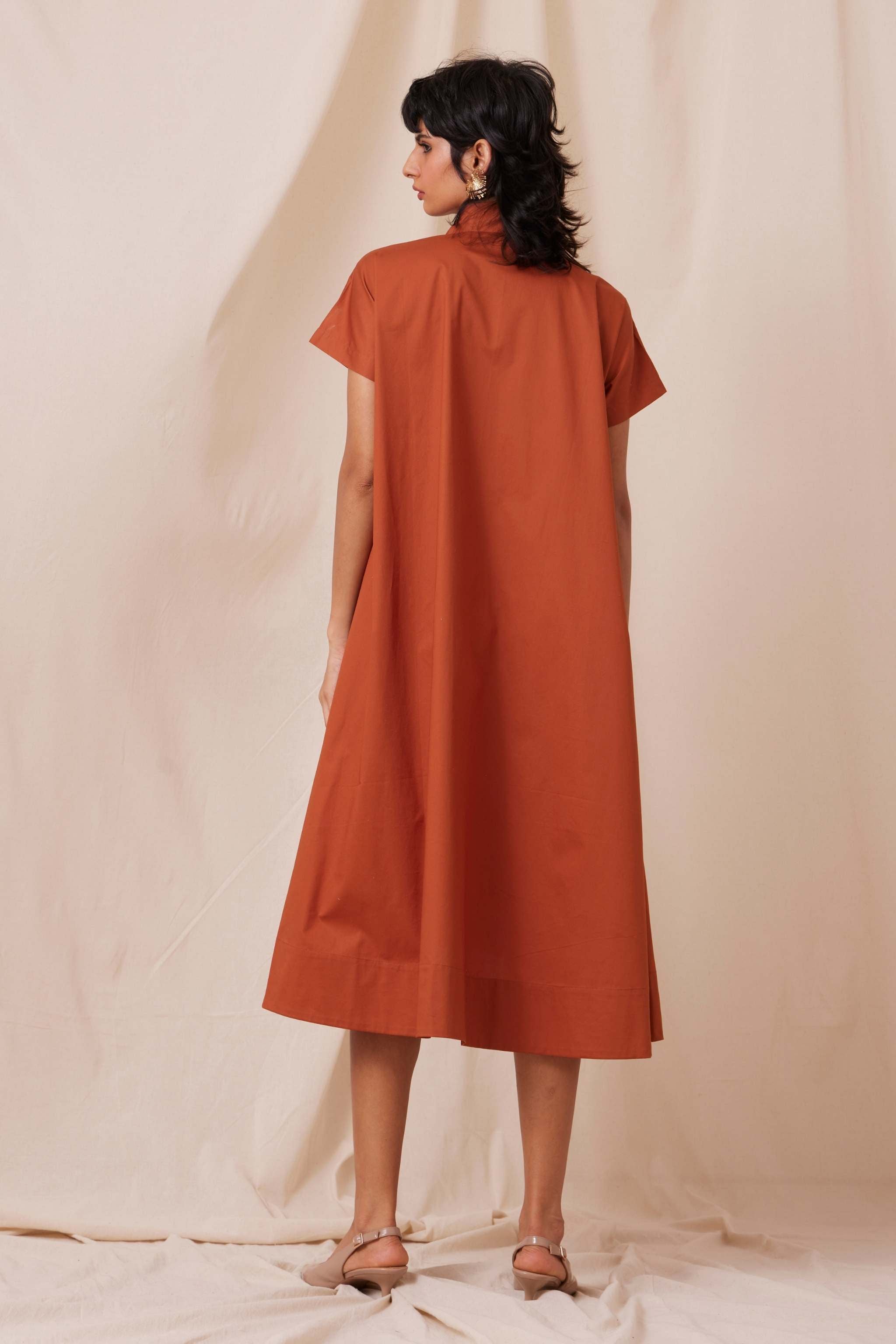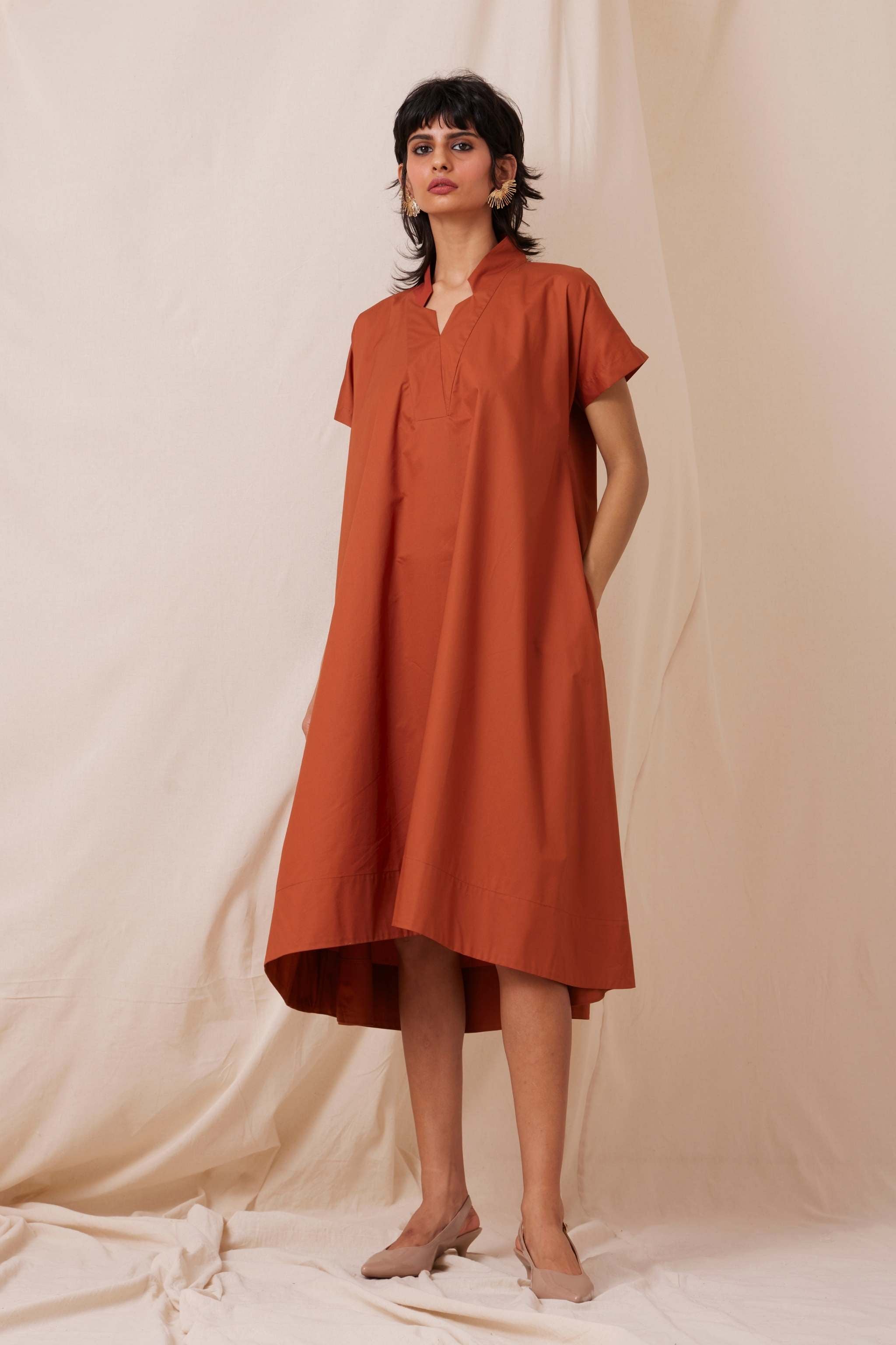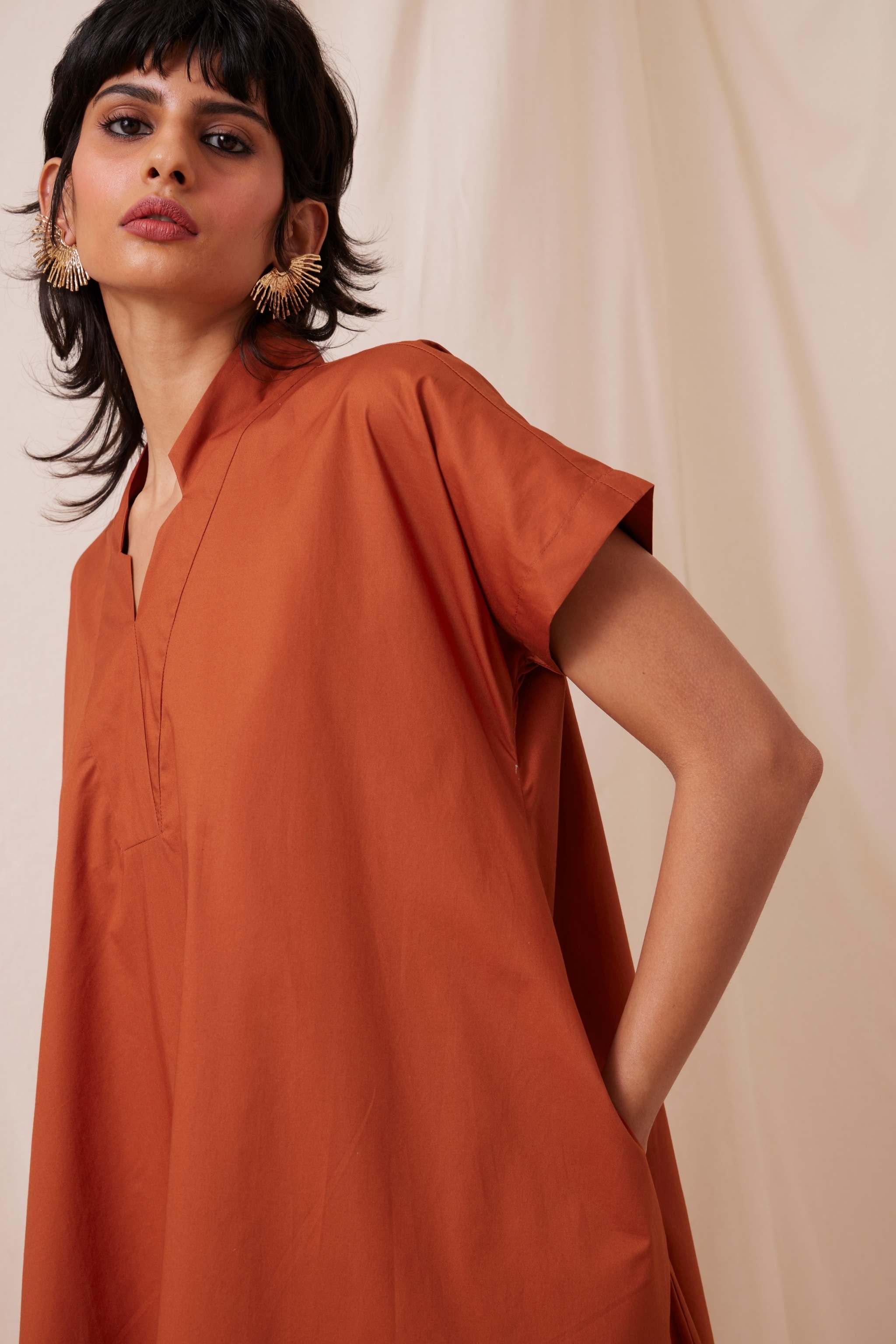 Versatile tent dress. Statement flat collar with V neckline. Dropped shoulders. Slight high low hem. Side pockets.