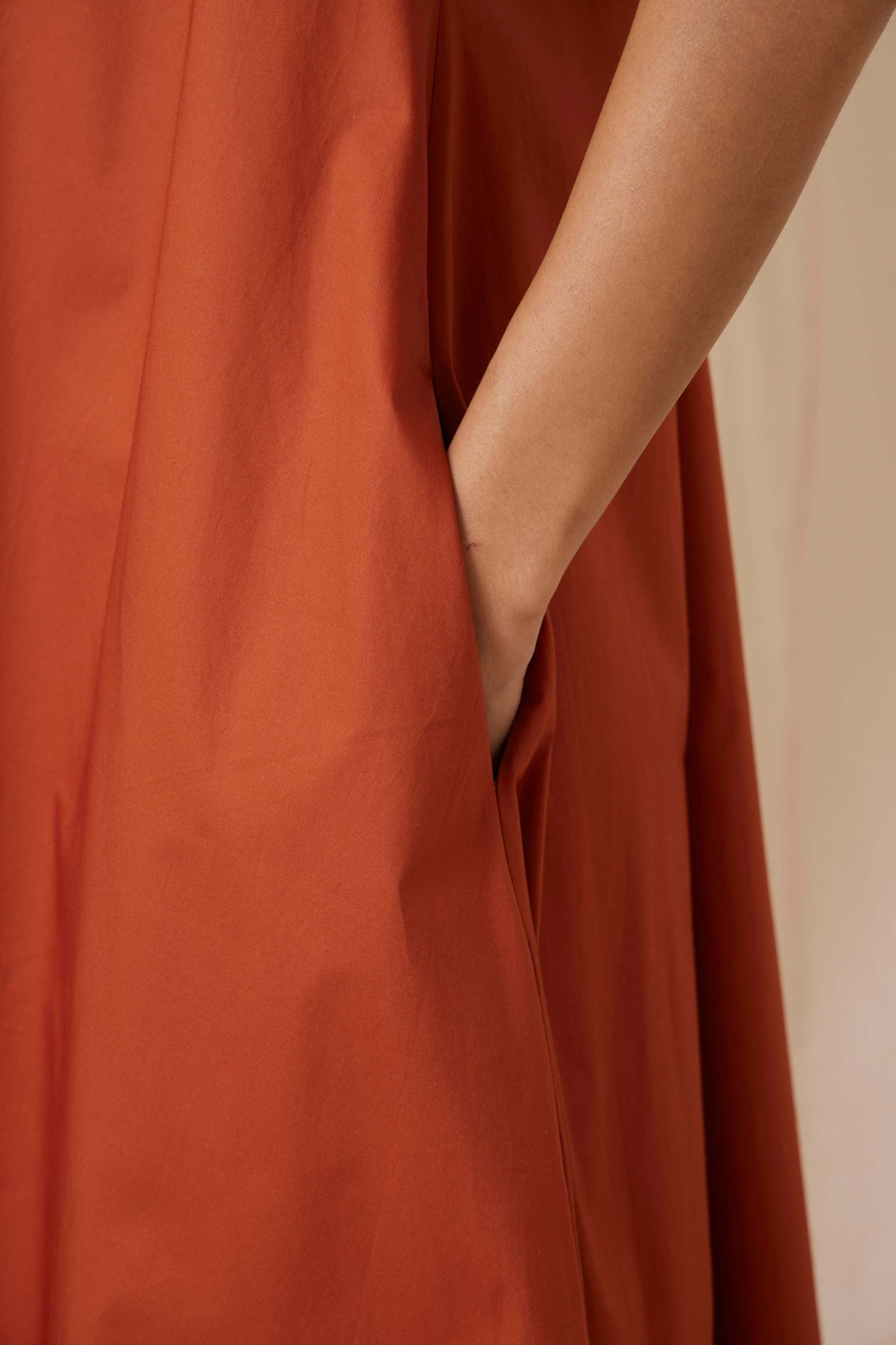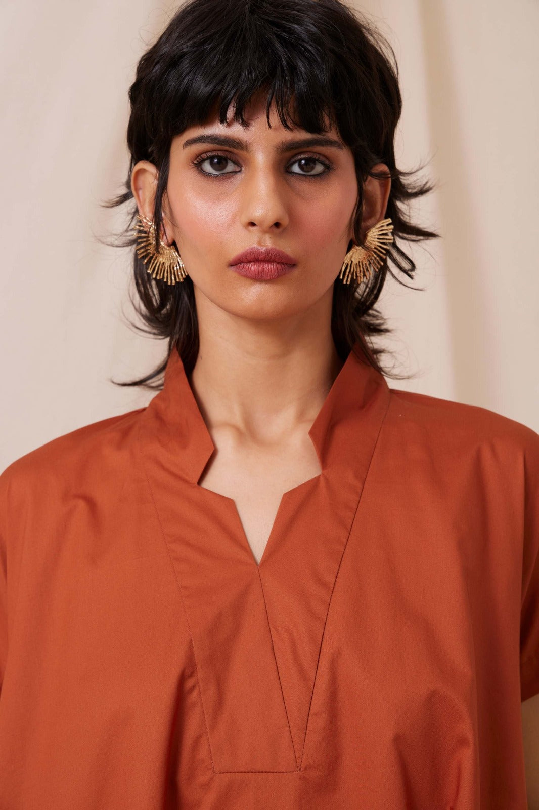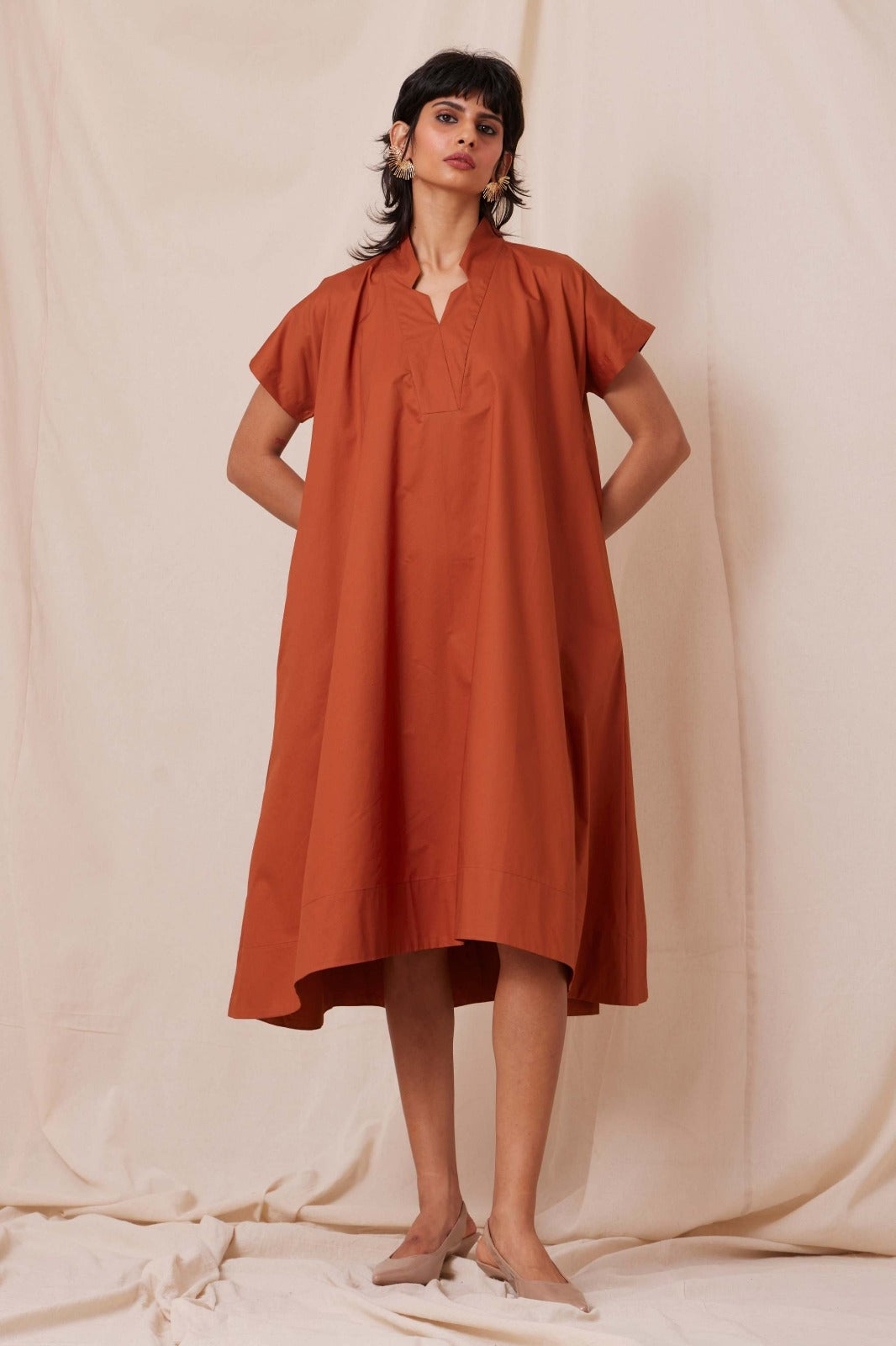 Versatile tent dress. Statement flat collar with V neckline. Dropped shoulders. Slight high low hem. Side pockets.
