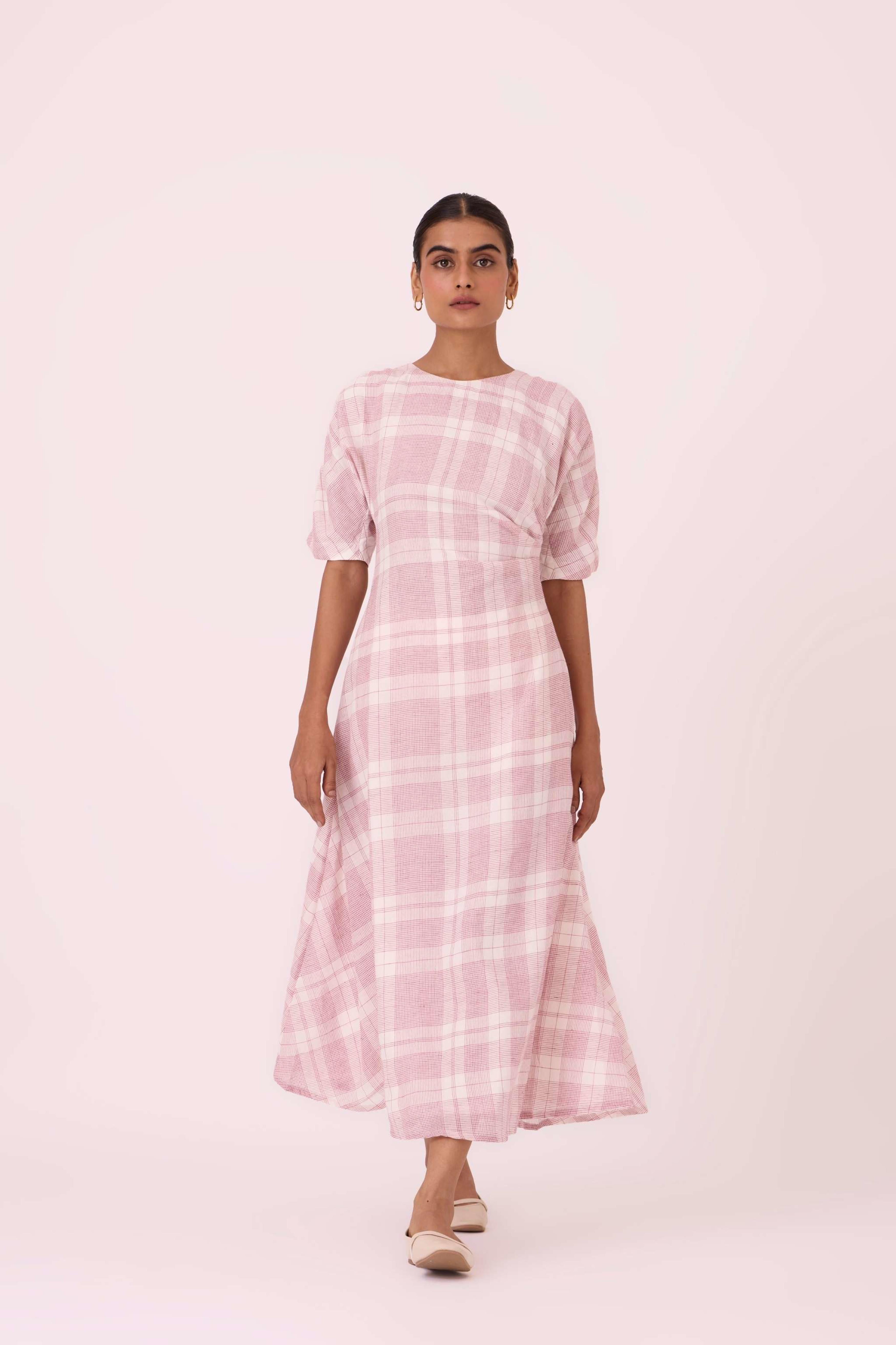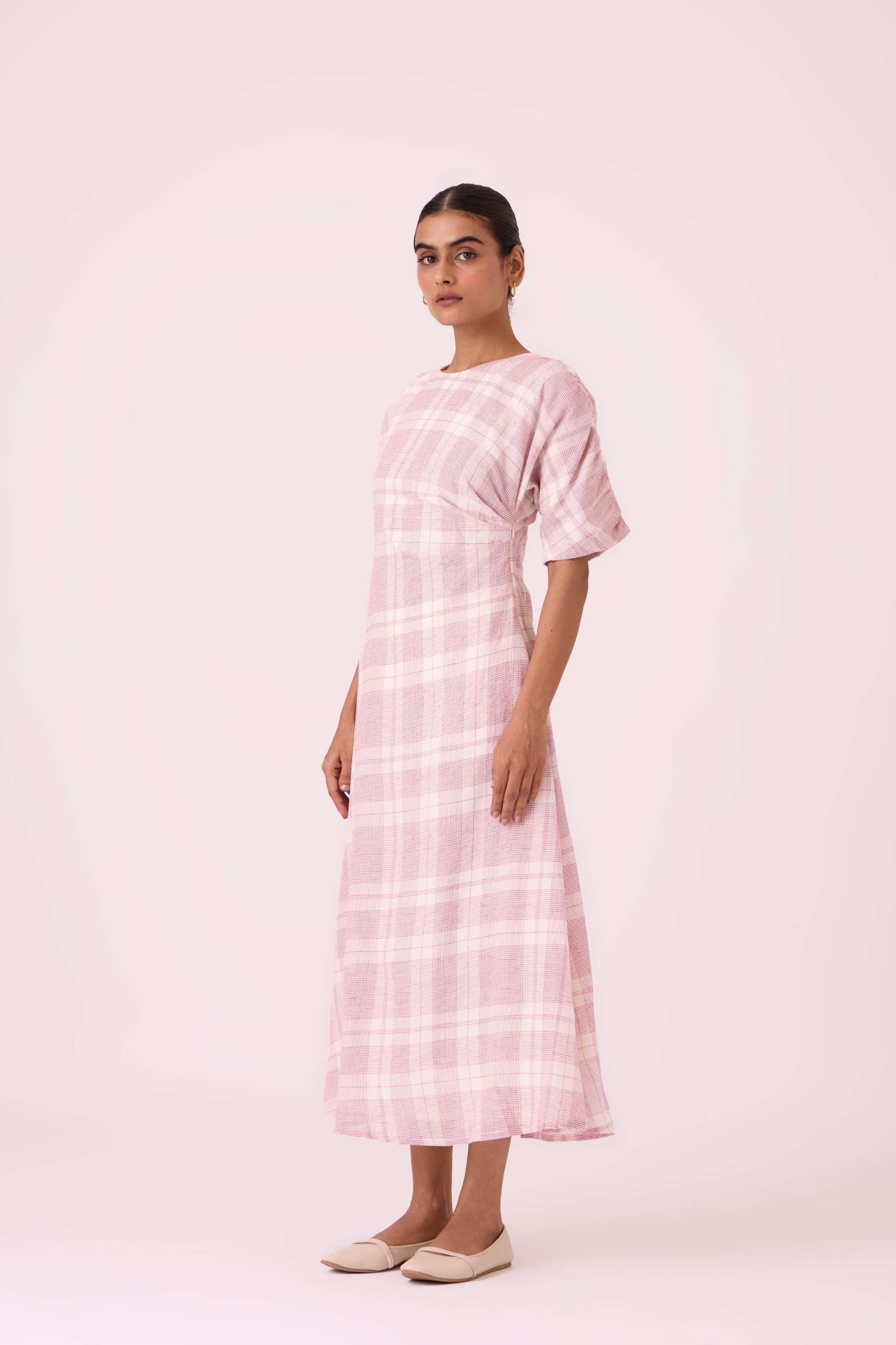 This elegant, *maxi-length dress* features a *slim fit* with a smartly *cinched waist*. It has a stylish *round neckline* and *elbow-length sleeves* with *ruchings* for added detail. The dress is easy to put on with a *side zip* and a *rouleau button fastening* at the back. For a smooth and comfortable fit, the dress is *fully lined*. The fabric is a unique design developed in-house and *handwoven by artisans in Bengal*. The model, Chhavi, is 5'6" and is wearing a size XS.