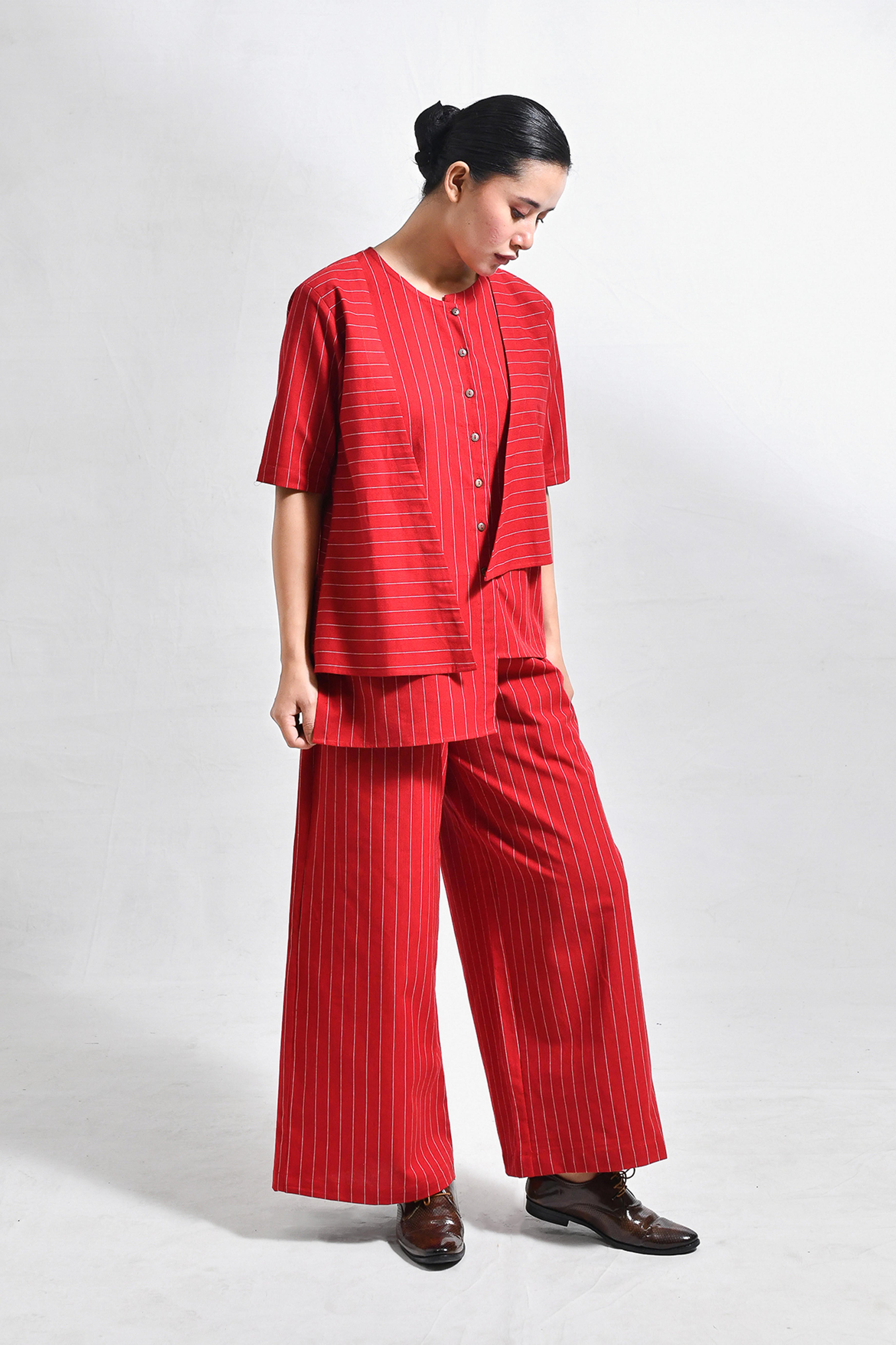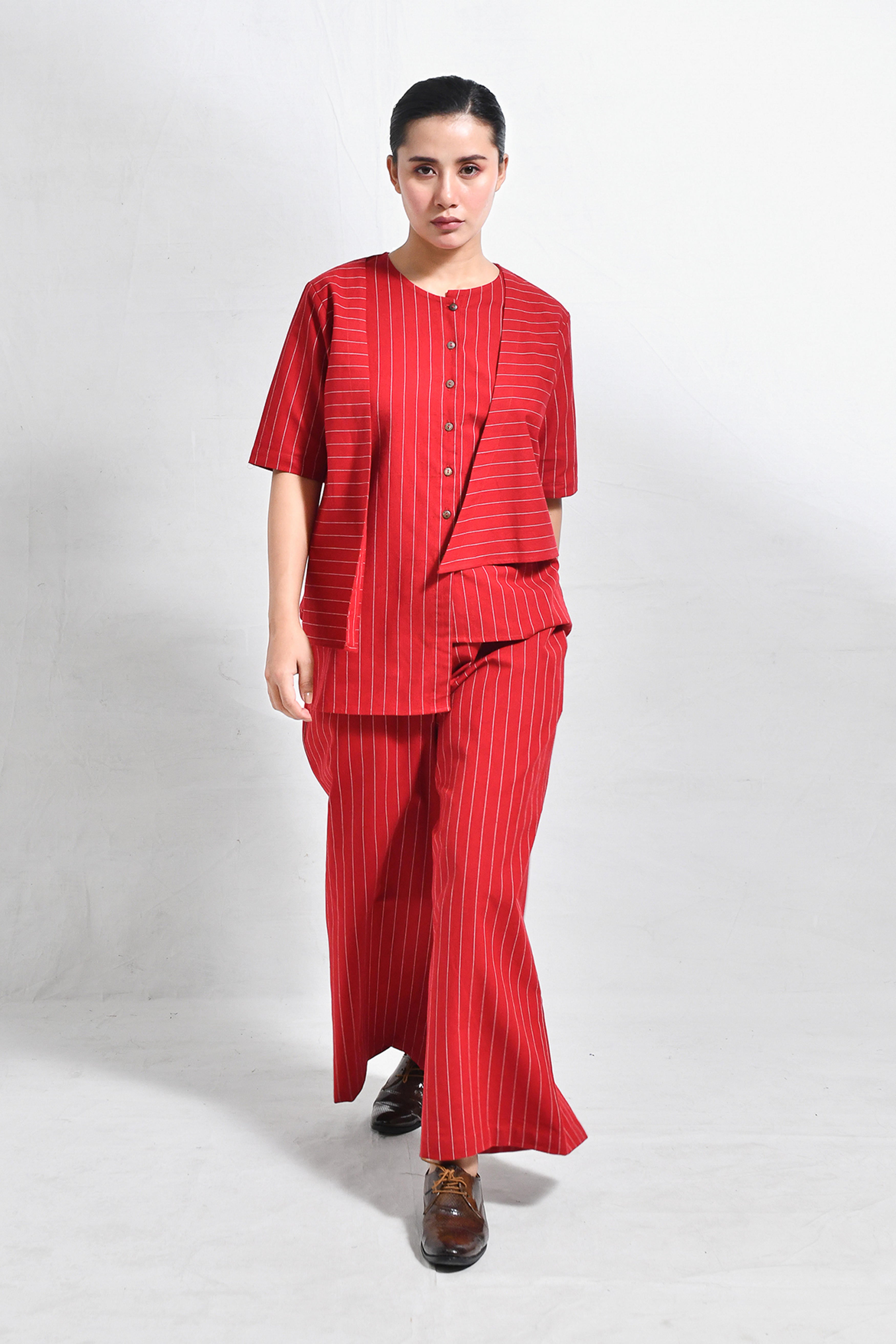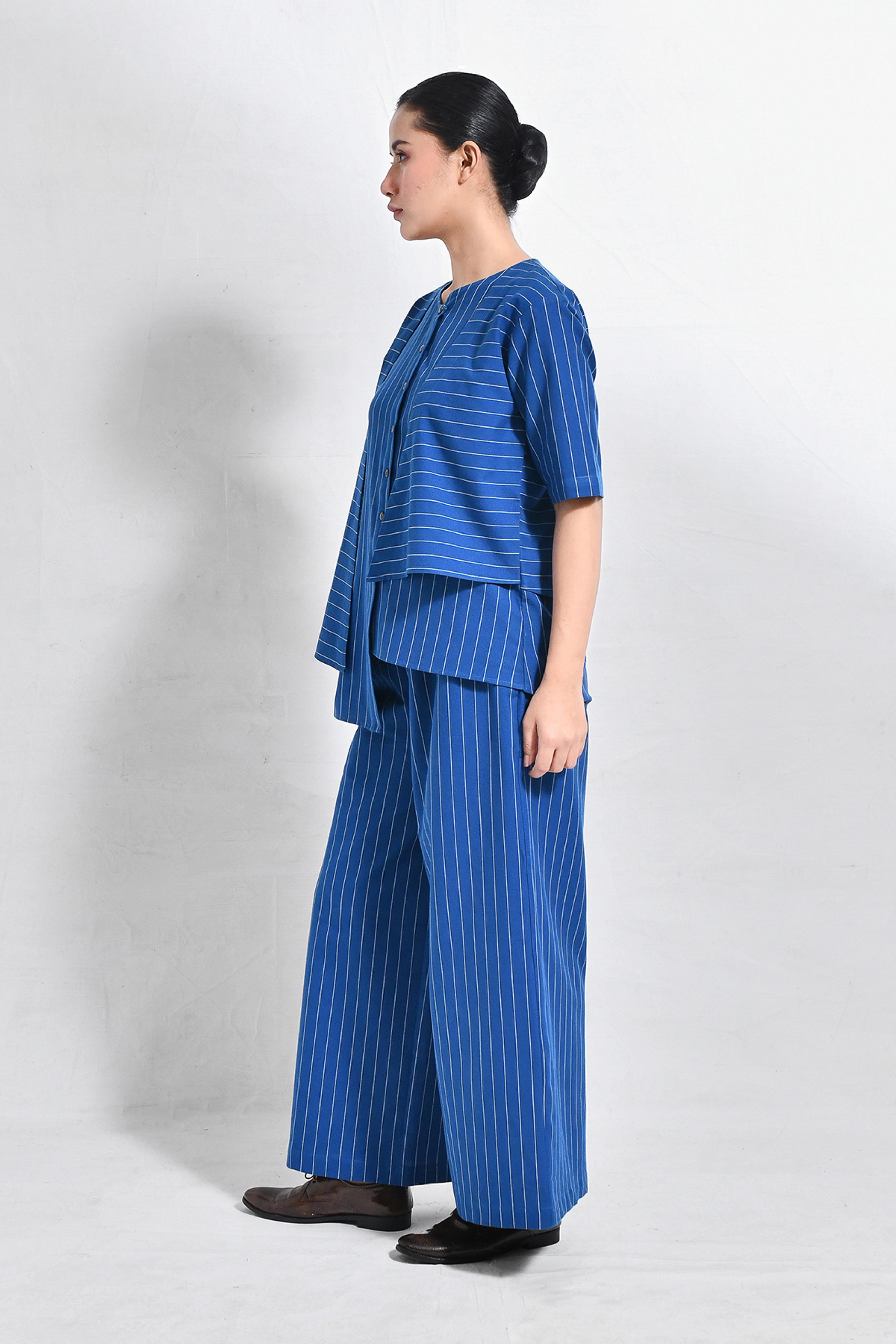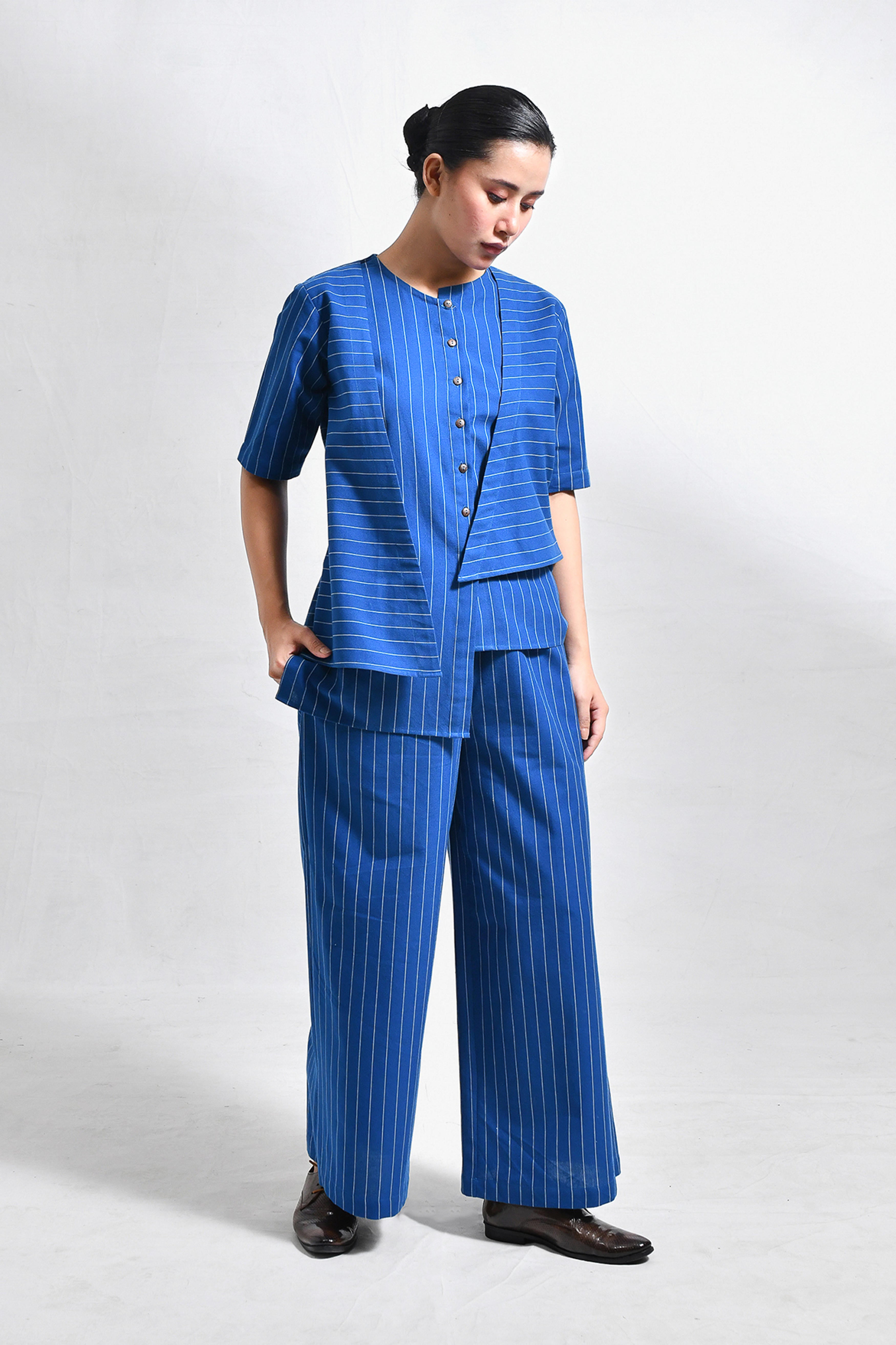 Crafted from handloom cotton, this contemporary co-ord set features finely woven pinstripes in rich blue hues. The structured top is enhanced with asymmetrical layers at the front and back, and a front button placket that adds a modern edge. Paired with wide-leg trousers featuring an elasticated waistband for fitting convenience and pockets. Model is 5'5, wearing a Size S.