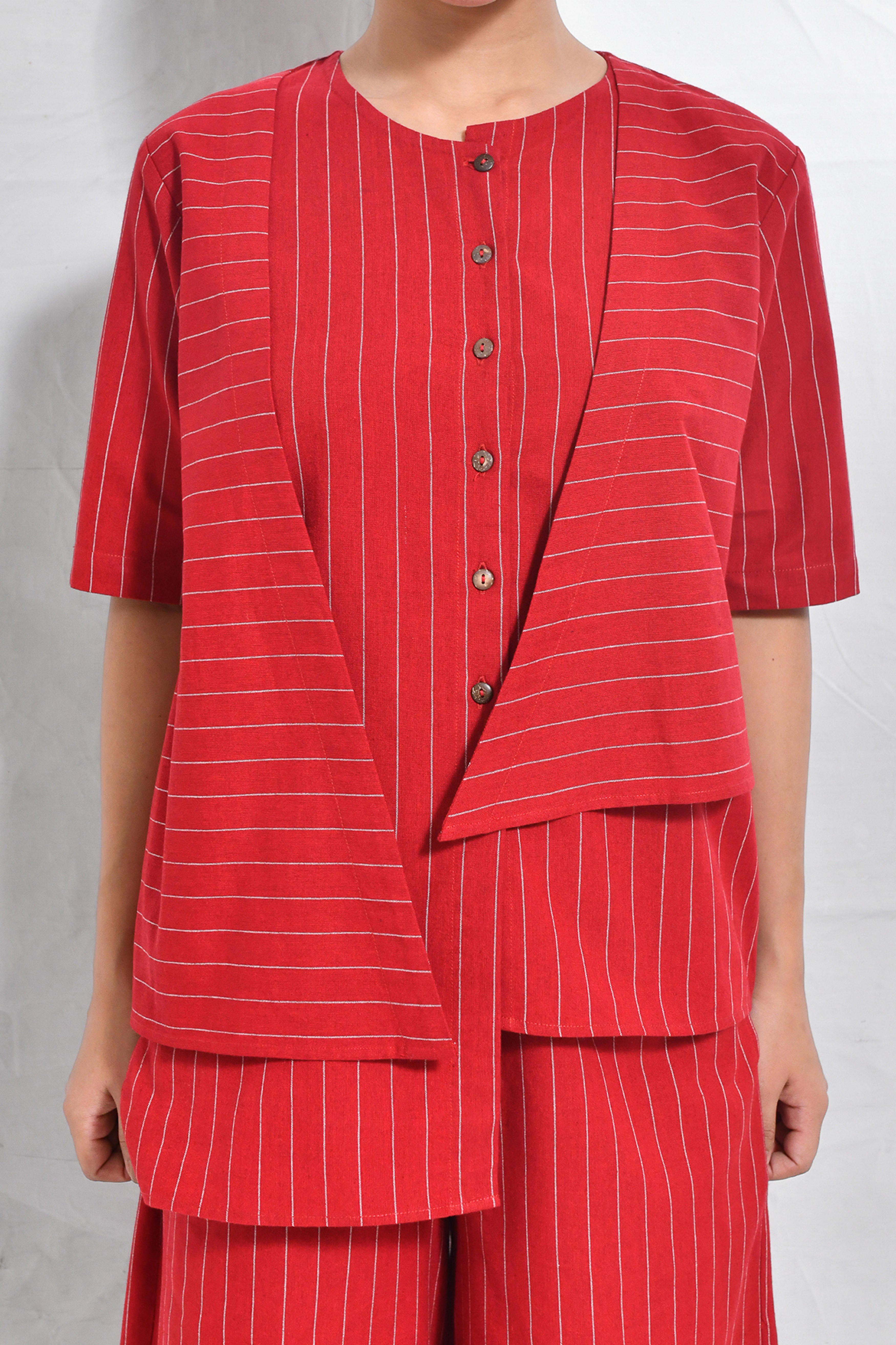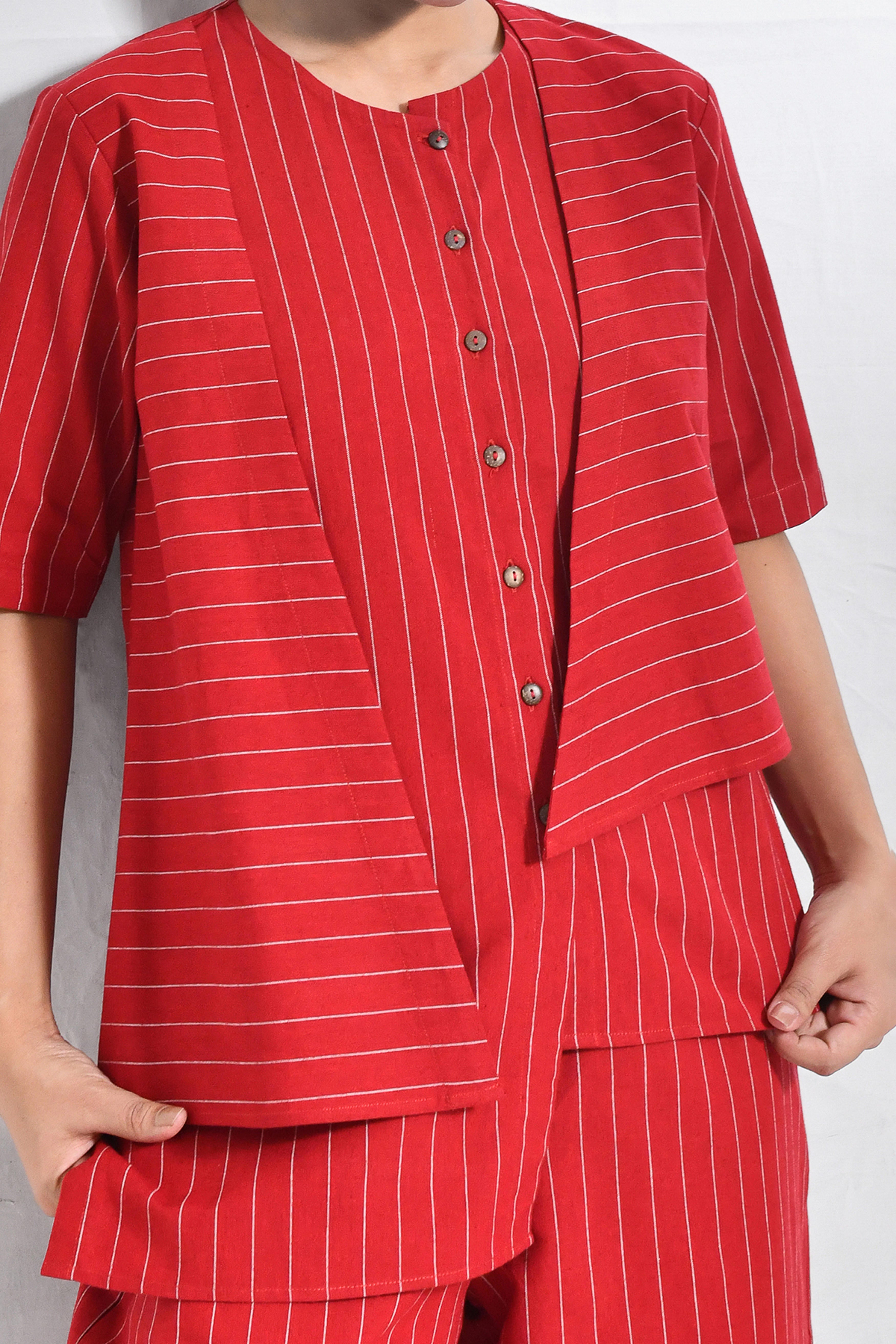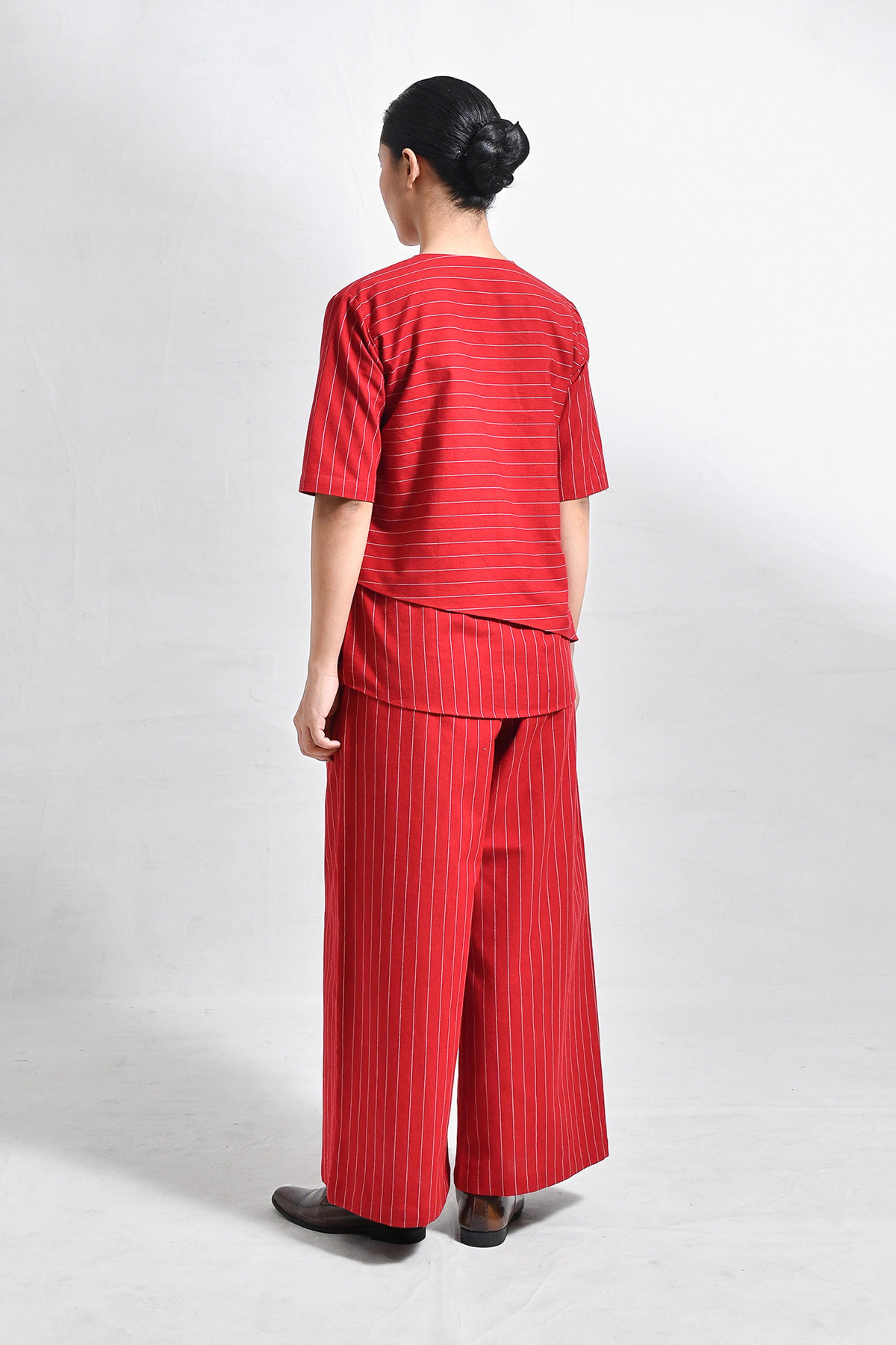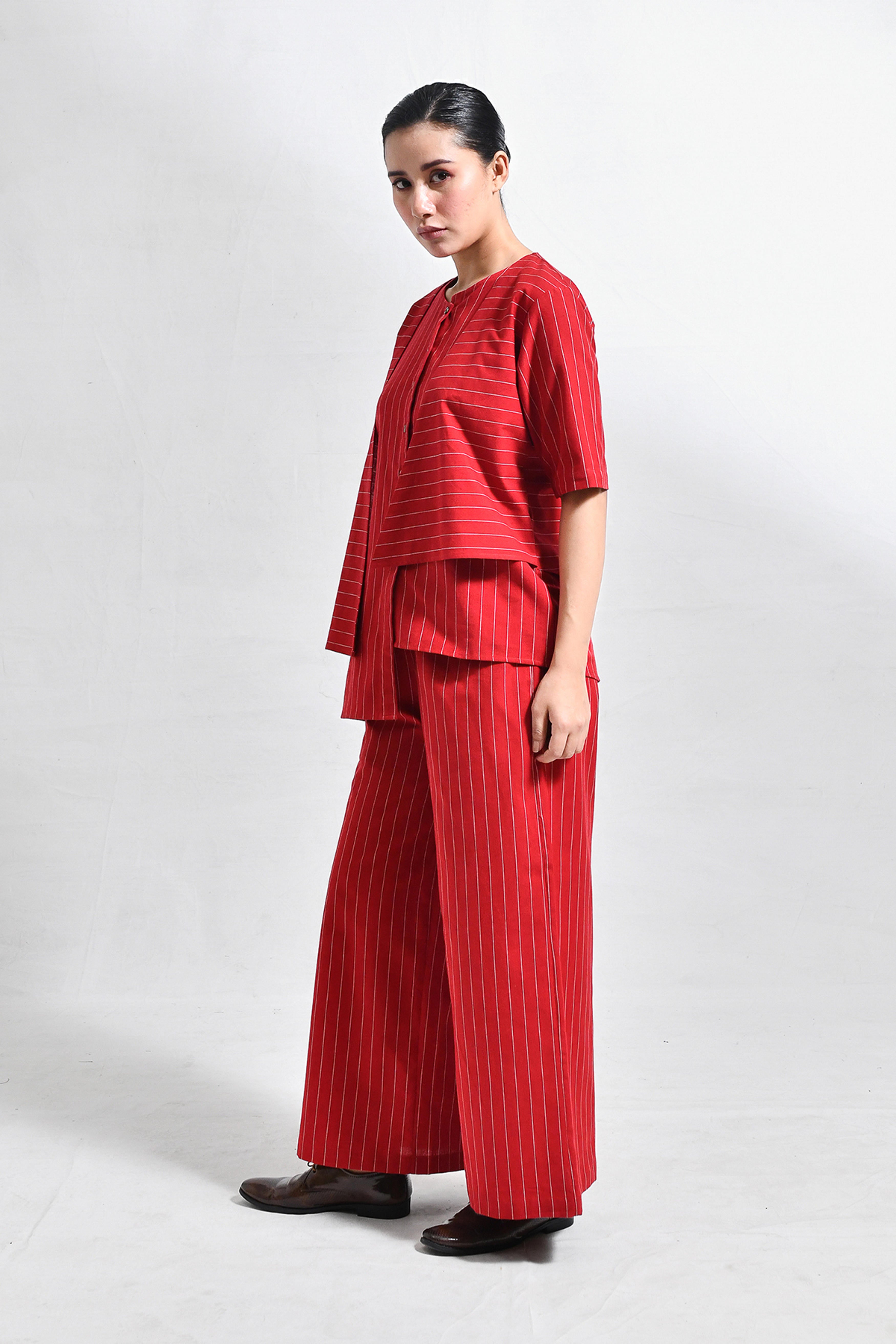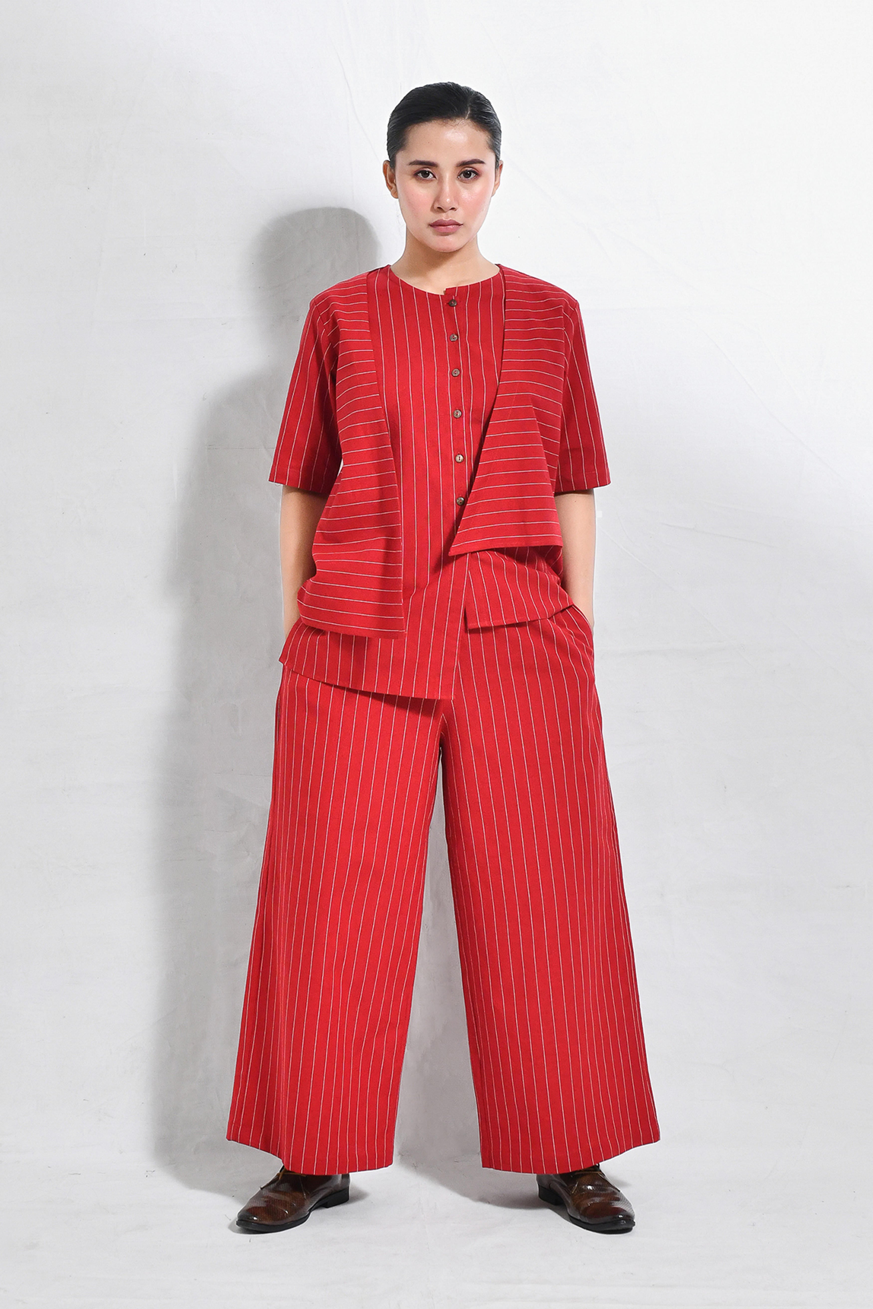 Crafted from handloom cotton, this contemporary co-ord set features finely woven pinstripes in rich blue hues. The structured top is enhanced with asymmetrical layers at the front and back, and a front button placket that adds a modern edge. Paired with wide-leg trousers featuring an elasticated waistband for fitting convenience and pockets. Model is 5'5, wearing a Size S.