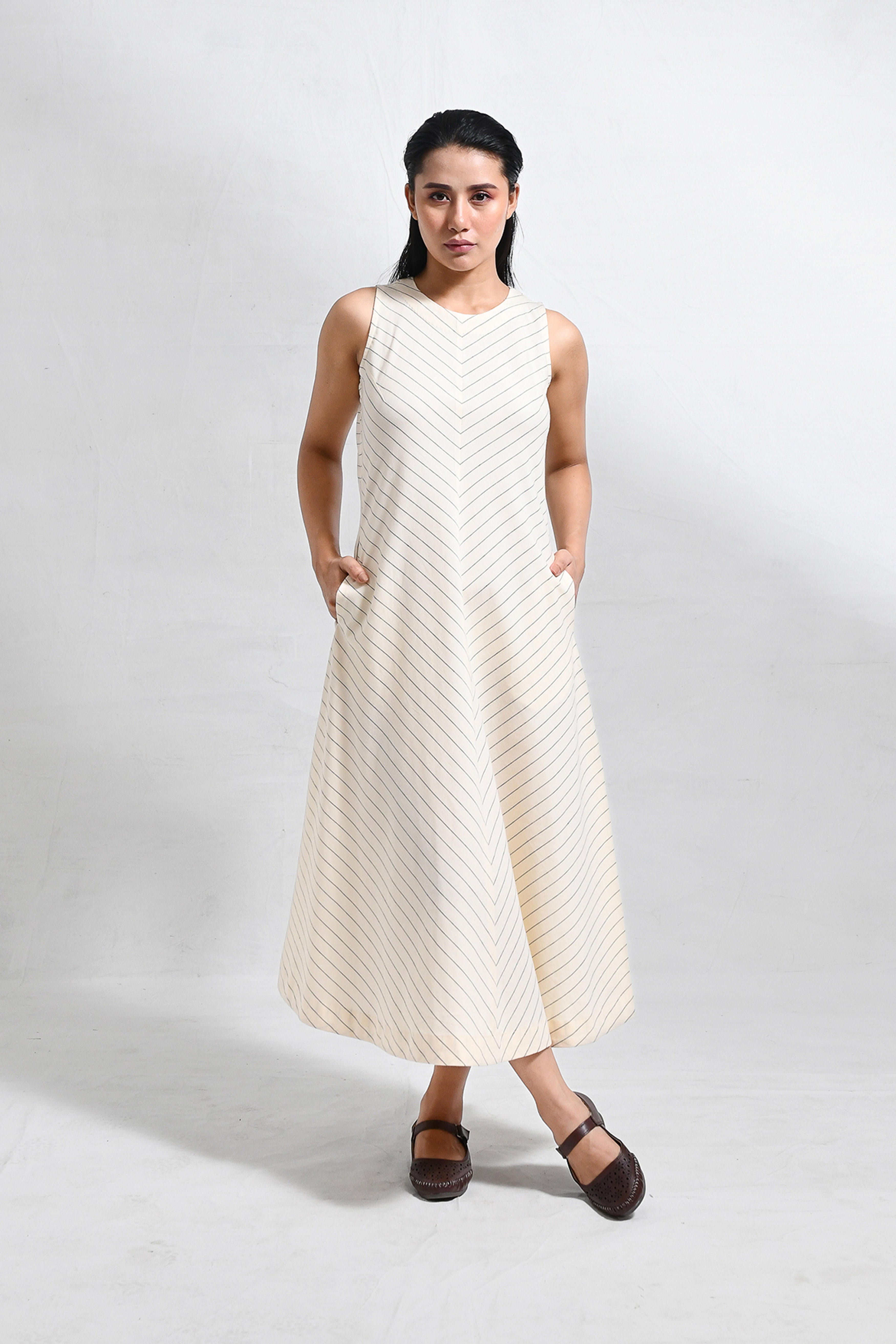 Crafted from handloom cotton, this sleeveless dress features finely woven pinstripes, thoughtfully mitered and patched at the back yoke. This A-line silhouette adds a soft, flowing touch and comes with pockets. This is a timeless formal silhouette for effortless elegance. Model is 5'5, wearing a Size S.
